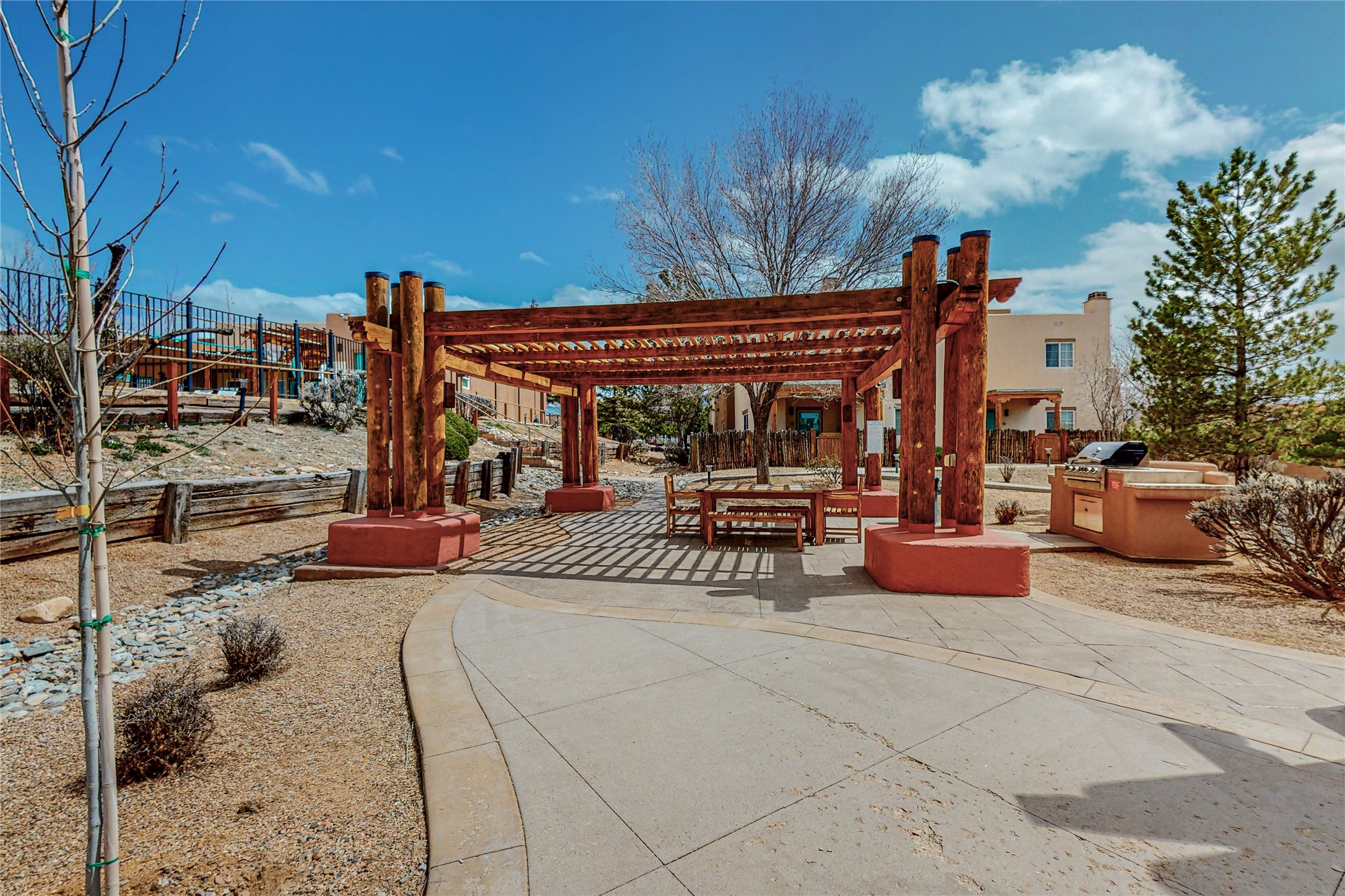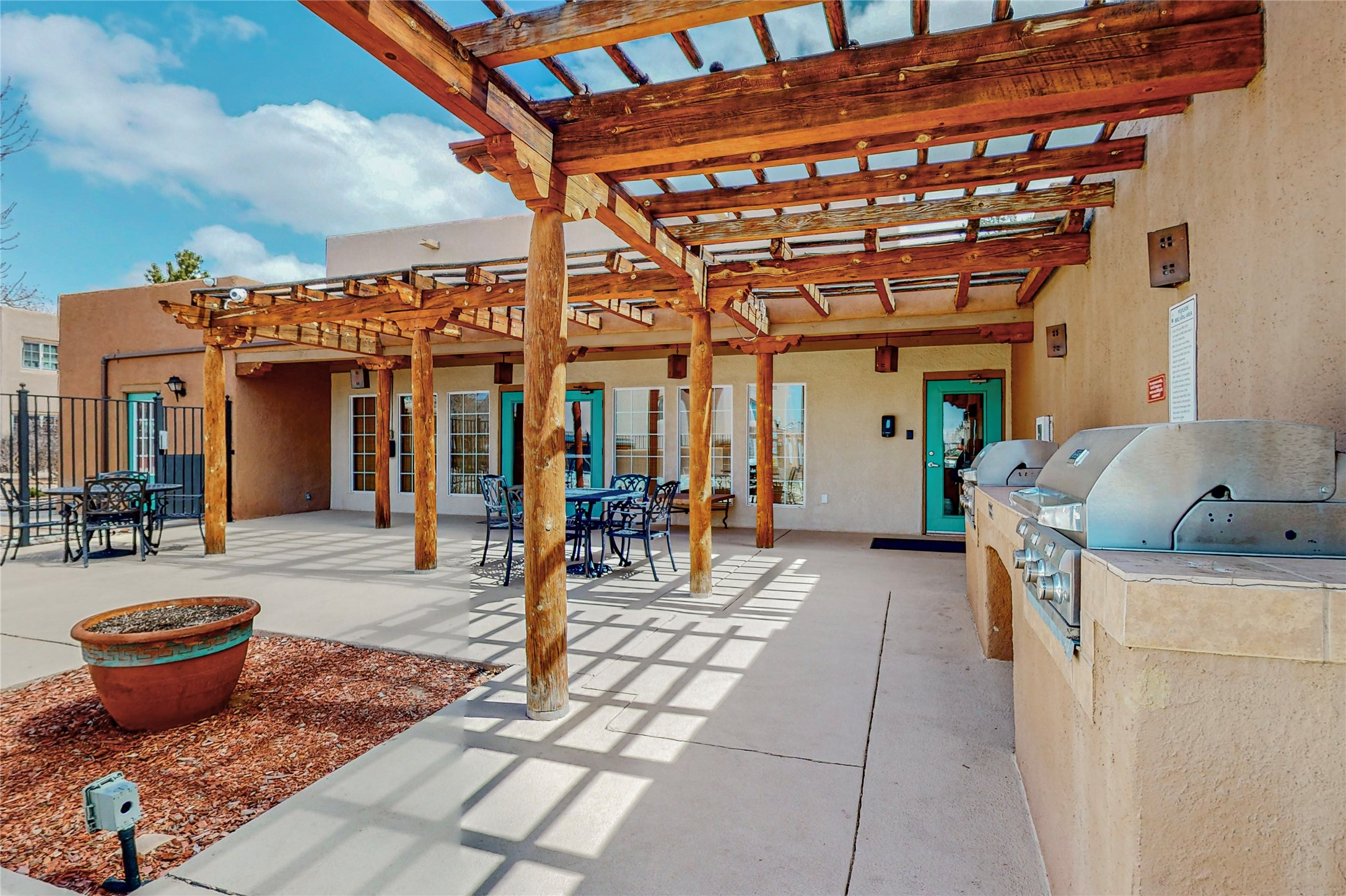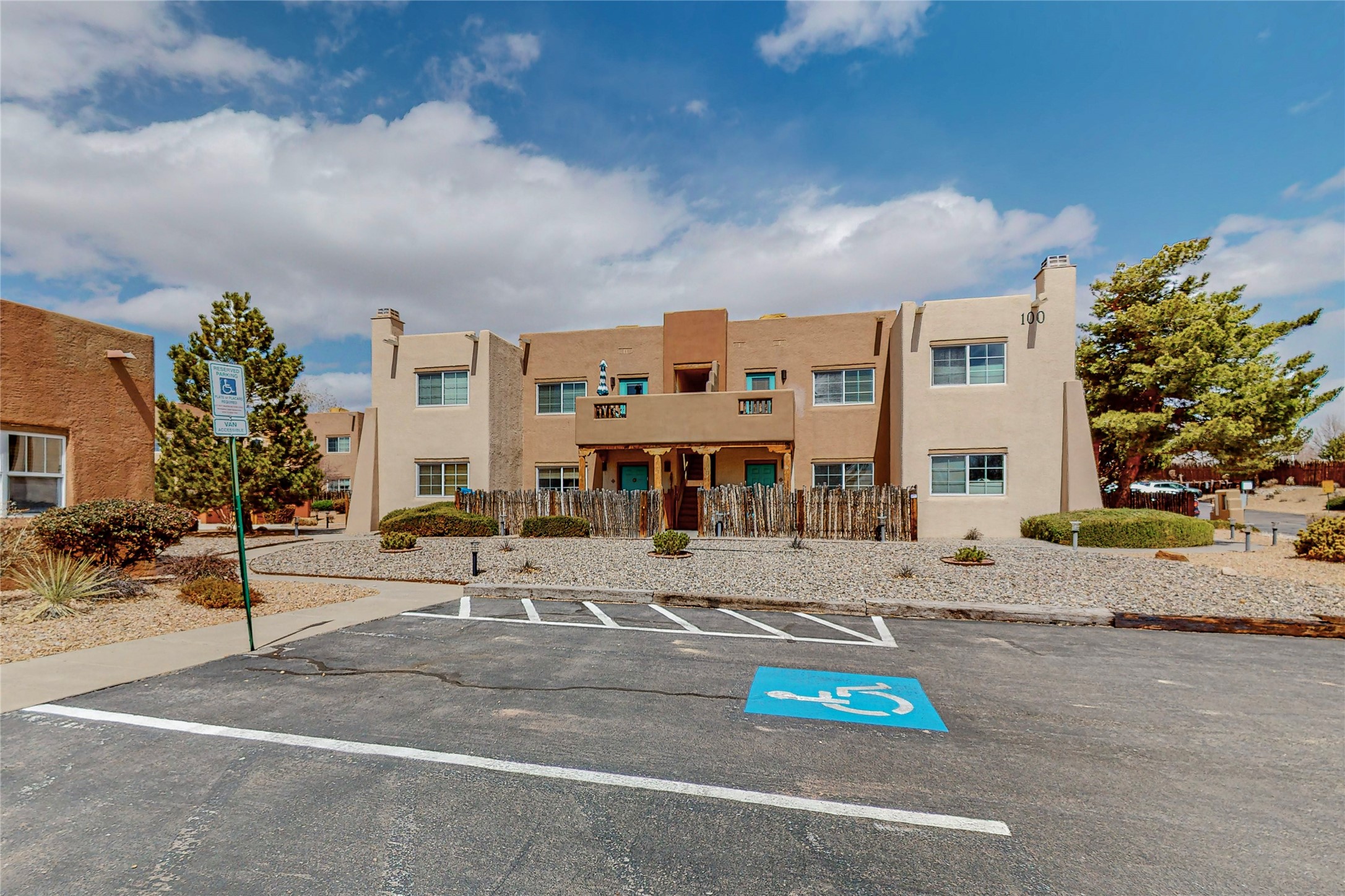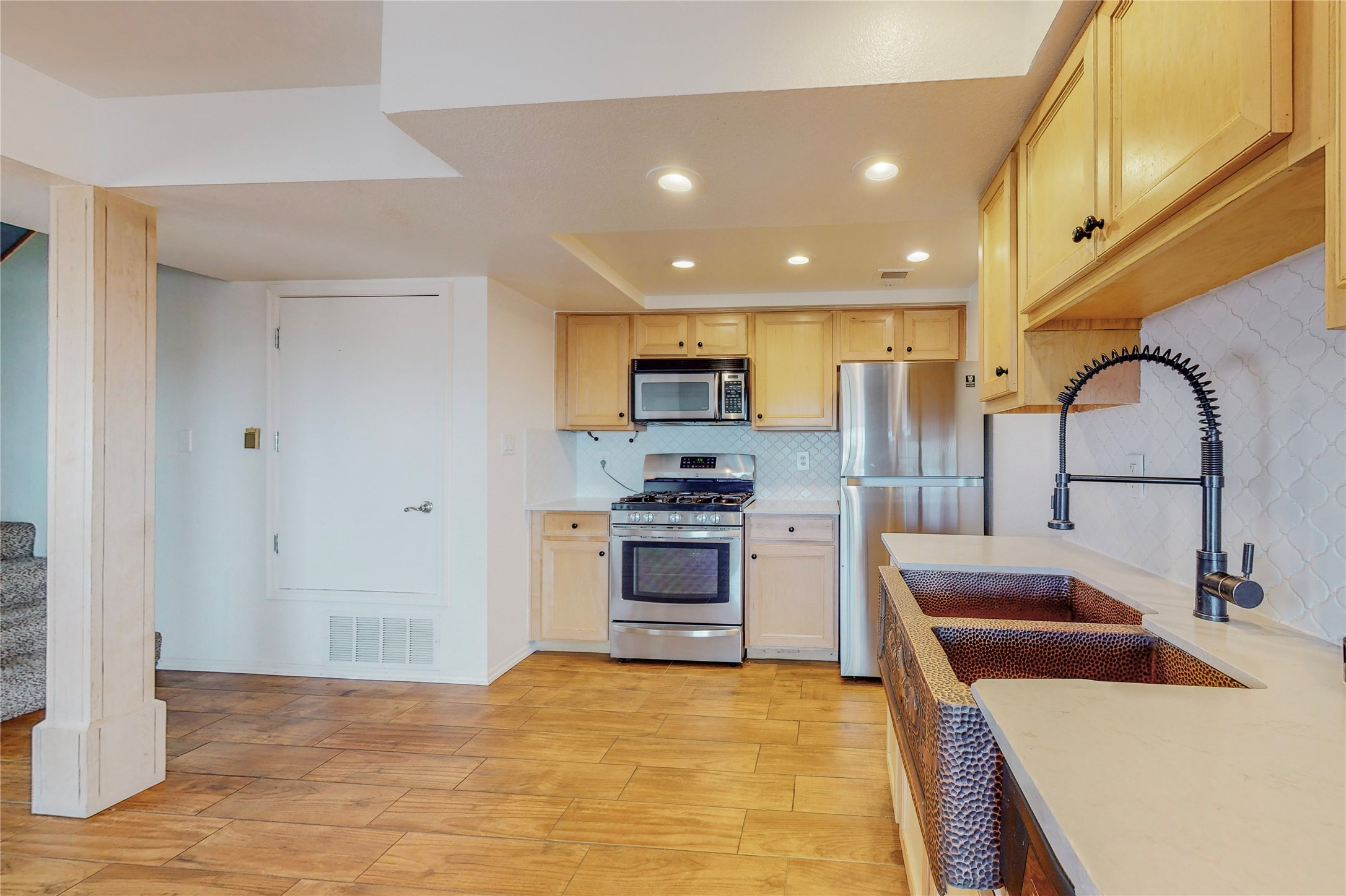 Welcome to 2210 Miguel Chaves! A stunning Santa Fe condo in a premium location, in the gated community of Dos Santos, aptly named for the fantastic central location at the intersection of Saint Francis & Saint Michael's. Enjoy all the community's amenities which includes outdoor grilling, a dog park, a salt water swimming pool, spa and a fitness center! This home is south facing enabling a wide open view! Enter the home to an open, light and bright floor plan laid out with natural wood looking porcelain tile, FULLY UPDATED! All new stainless steel appliances including new WHIRLPOOL stacked washer and dryer. Enjoy a completely redesigned kitchen with a custom farmhouse-style/apron sink made from 99% pure-mined copper with a hammered finish, set on sleek quartz countertops, recessed lighting, glossy white mosaic backsplash and LIVING ART on the wall in the form of a built in fireplace! Find new light fixtures and natural wood doors throughout the home. Each bedroom has a huge walk in closet with set storage space fixed to the walls. Enjoy a fully custom master bathroom equipped with natural stone from the walk in shower to the backsplash. Well maintained, fully updated! This is a MUST SEE!!! Schedule your showing today!