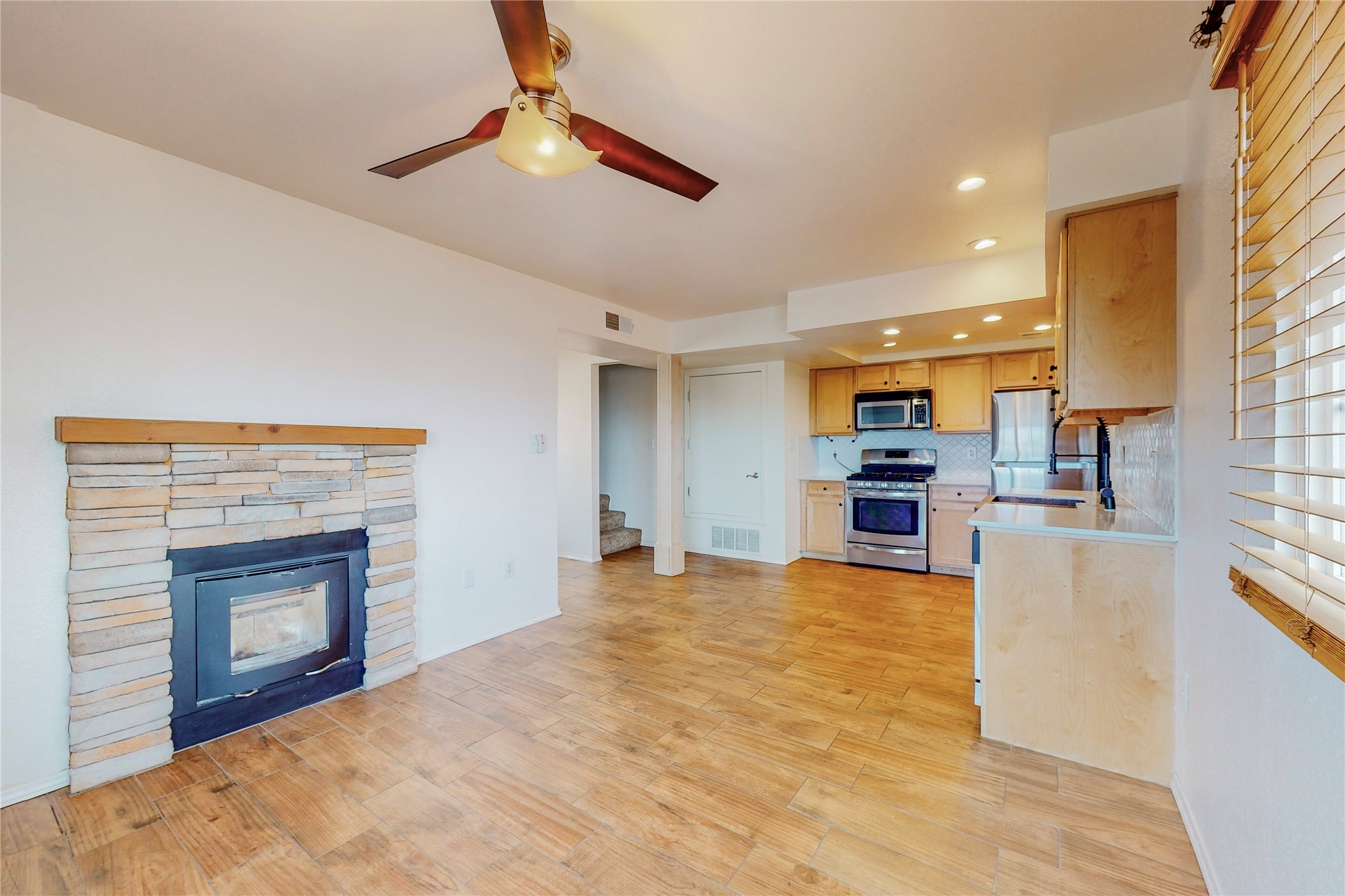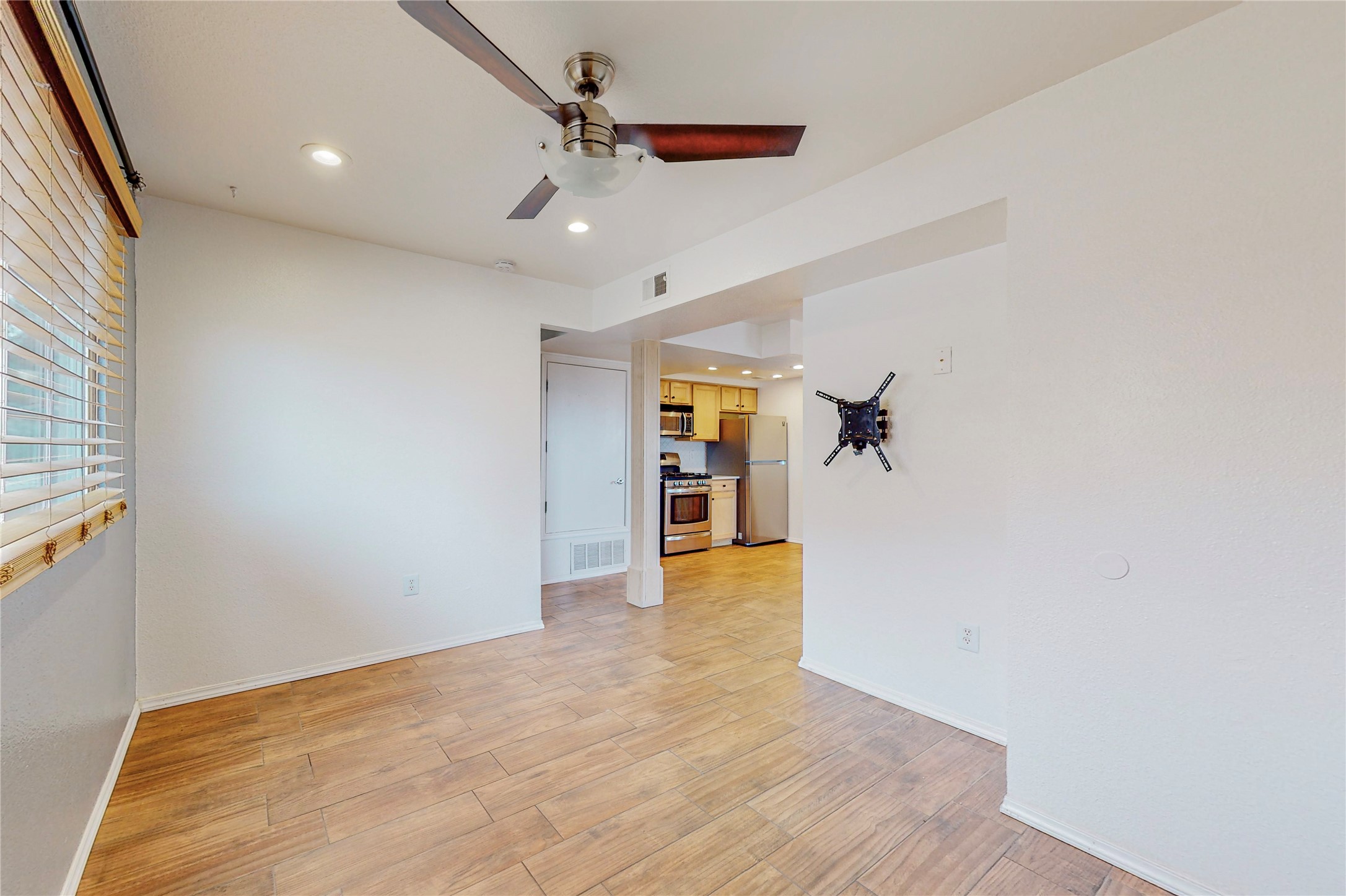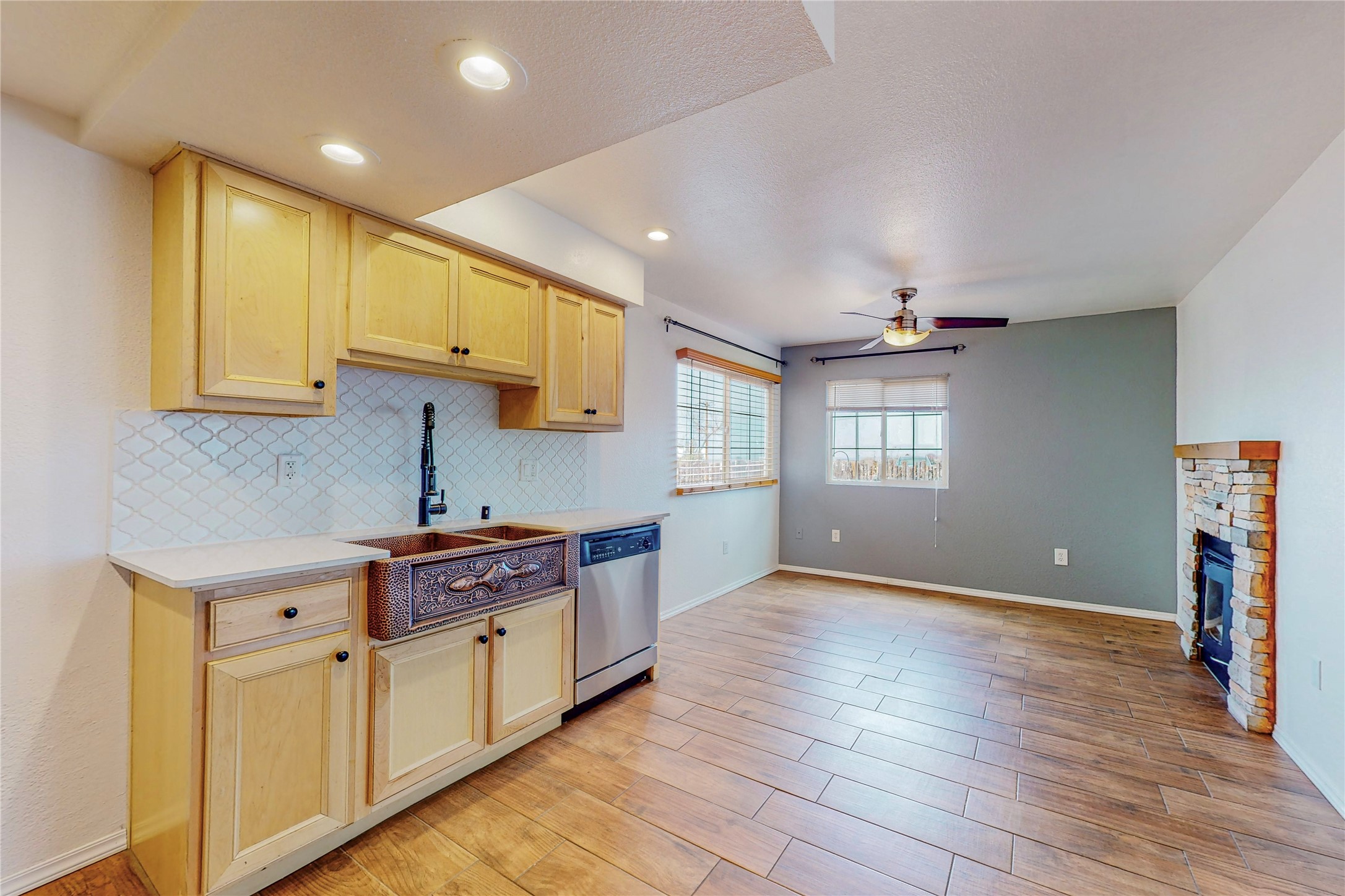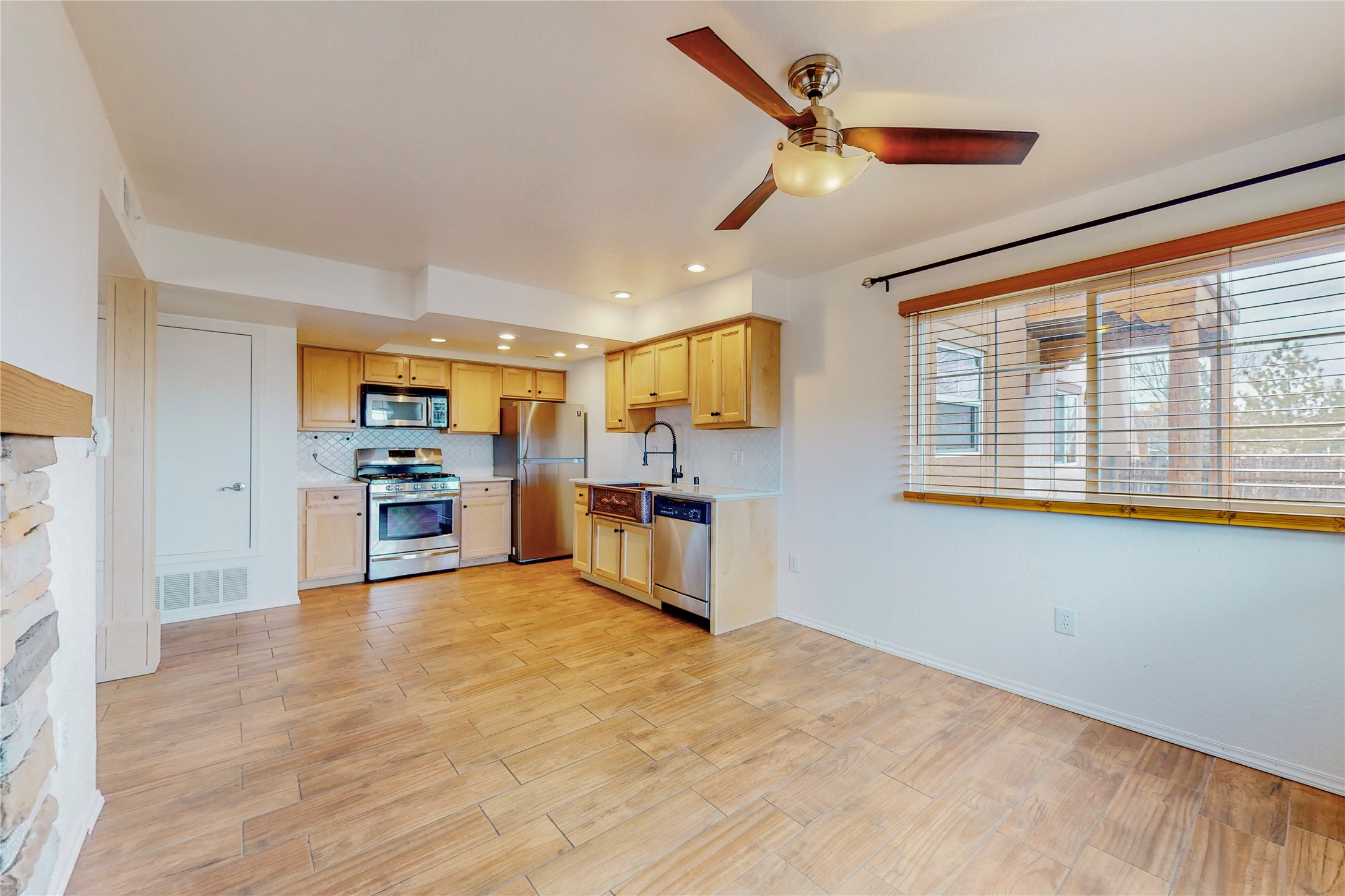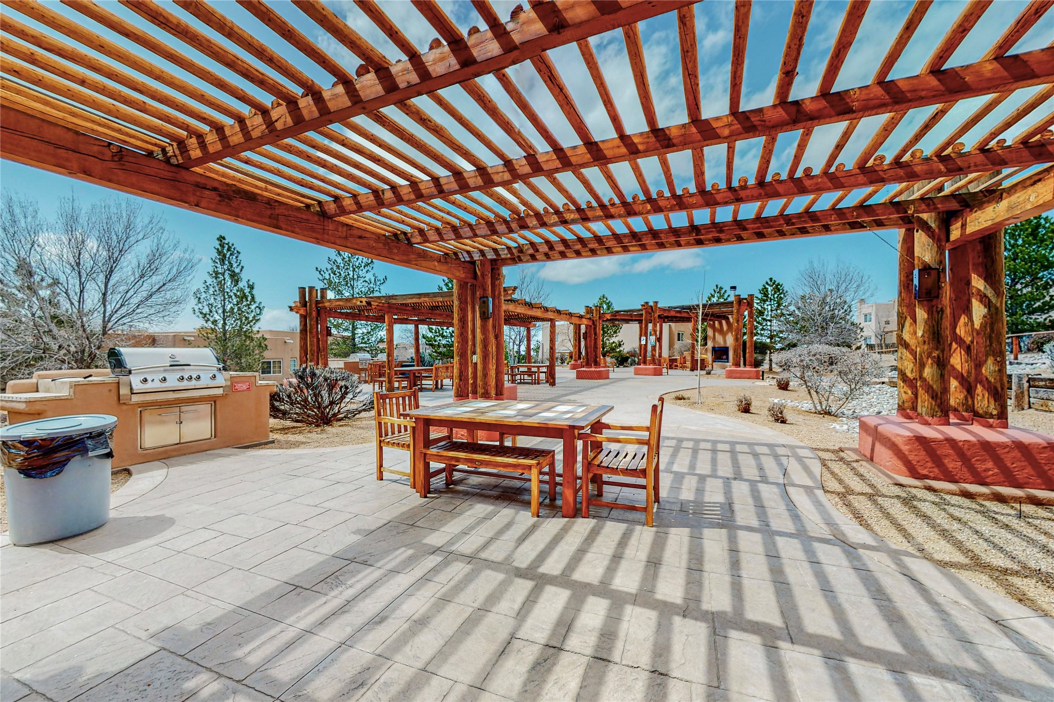Welcome to 2210 Miguel Chaves! A stunning Santa Fe condo in a premium location, in the gated community of Dos Santos, aptly named for the fantastic central location at the intersection of Saint Francis & Saint Michael's. Enjoy all the community's amenities which includes outdoor grilling, a dog park, a salt water swimming pool, spa and a fitness center! This home is south facing enabling a wide open view! Enter the home to an open, light and bright floor plan laid out with natural wood looking porcelain tile, FULLY UPDATED! All new stainless steel appliances including new WHIRLPOOL stacked washer and dryer. Enjoy a completely redesigned kitchen with a custom farmhouse-style/apron sink made from 99% pure-mined copper with a hammered finish, set on sleek quartz countertops, recessed lighting, glossy white mosaic backsplash and LIVING ART on the wall in the form of a built in fireplace! Find new light fixtures and natural wood doors throughout the home. Each bedroom has a huge walk in closet with set storage space fixed to the walls. Enjoy a fully custom master bathroom equipped with natural stone from the walk in shower to the backsplash. Well maintained, fully updated! This is a MUST SEE!!! Schedule your showing today!