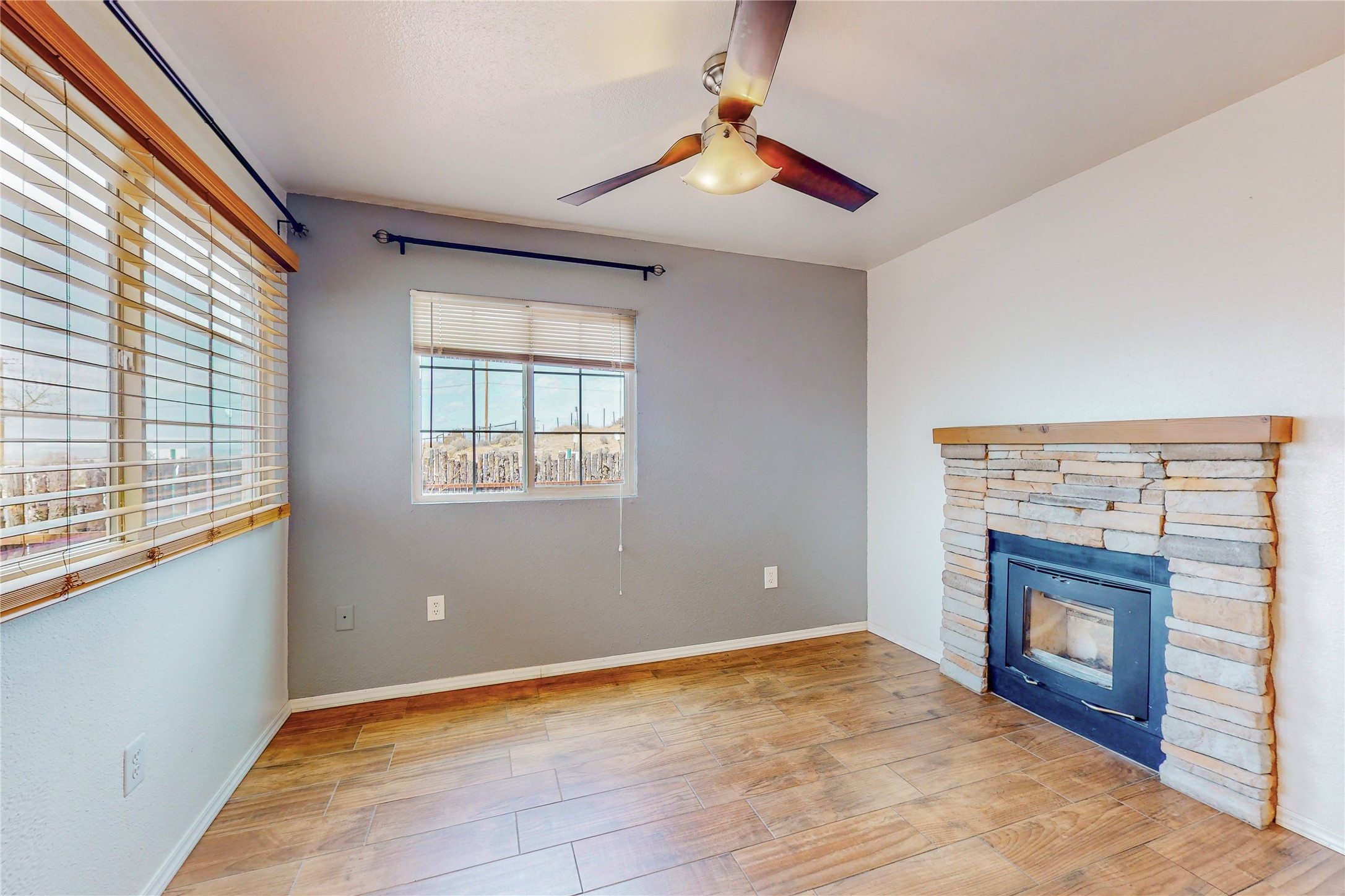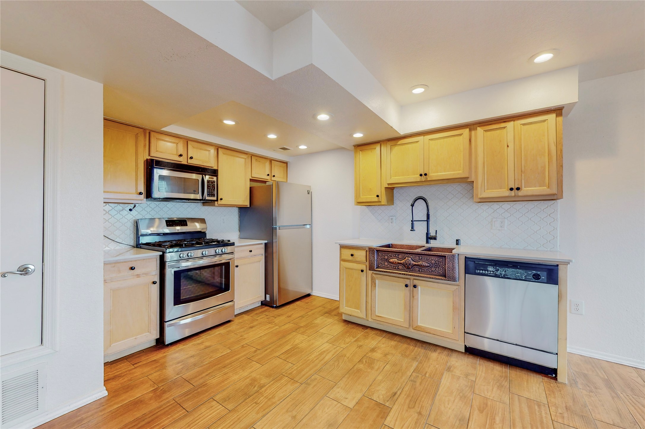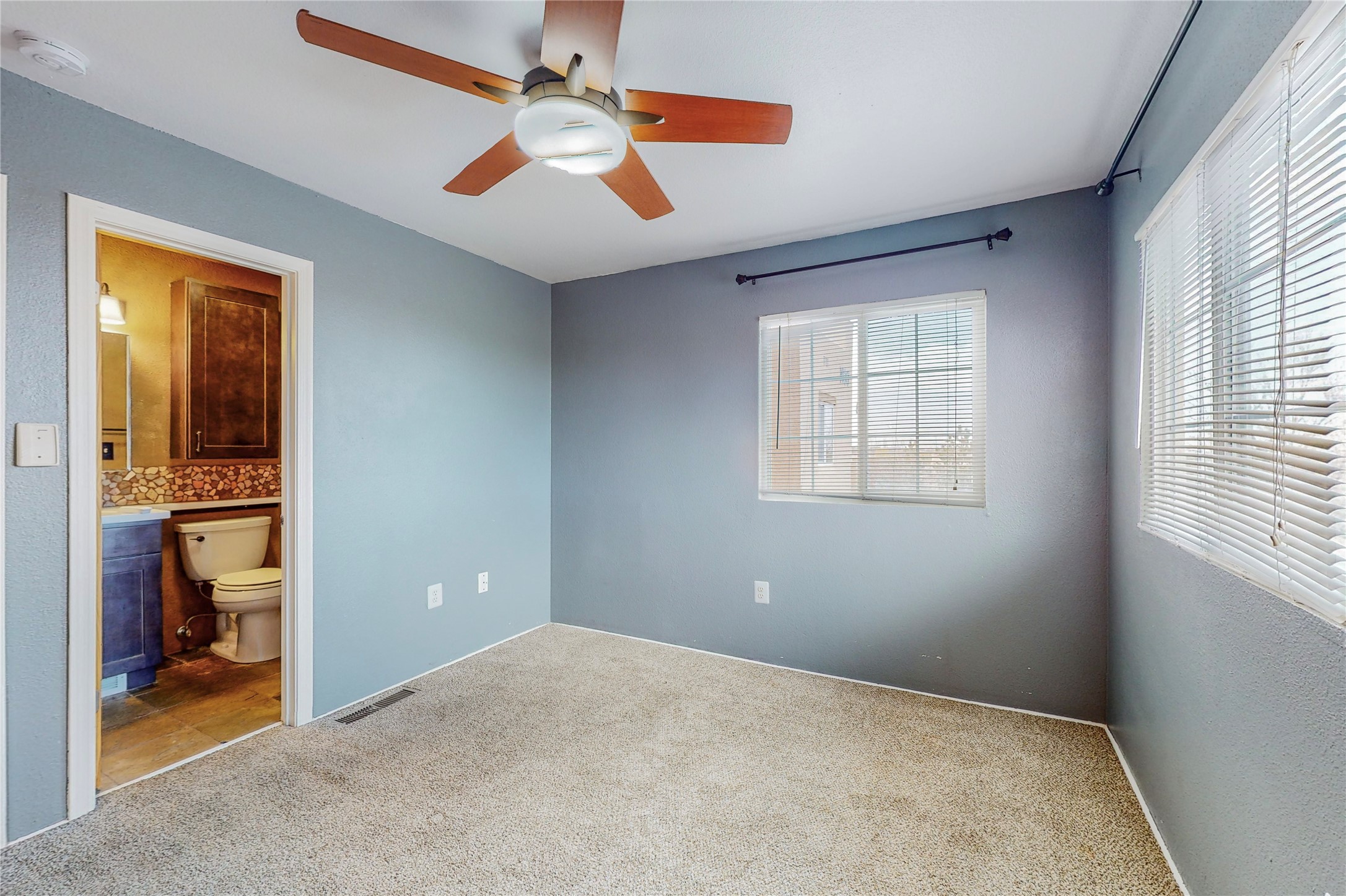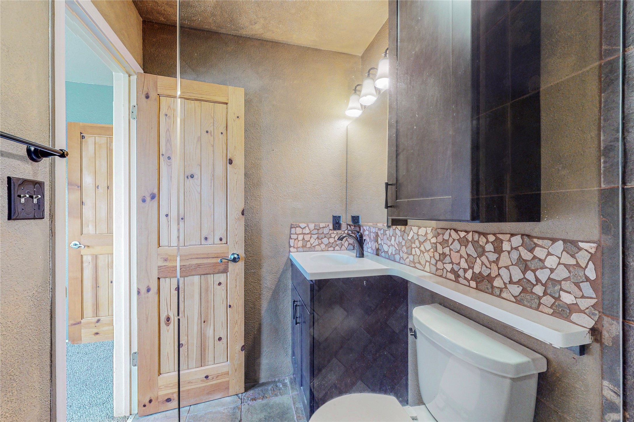 Welcome to 2210 Miguel Chaves! A stunning Santa Fe condo in a premium location, in the gated community of Dos Santos, aptly named for the fantastic central location at the intersection of Saint Francis & Saint Michael's. Enjoy all the community's amenities which includes outdoor grilling, a dog park, a salt water swimming pool, spa and a fitness center! This home is south facing enabling a wide open view! Enter the home to an open, light and bright floor plan laid out with natural wood looking porcelain tile, FULLY UPDATED! All new stainless steel appliances including new WHIRLPOOL stacked washer and dryer. Enjoy a completely redesigned kitchen with a custom farmhouse-style/apron sink made from 99% pure-mined copper with a hammered finish, set on sleek quartz countertops, recessed lighting, glossy white mosaic backsplash and LIVING ART on the wall in the form of a built in fireplace! Find new light fixtures and natural wood doors throughout the home. Each bedroom has a huge walk in closet with set storage space fixed to the walls. Enjoy a fully custom master bathroom equipped with natural stone from the walk in shower to the backsplash. Well maintained, fully updated! This is a MUST SEE!!! Schedule your showing today!