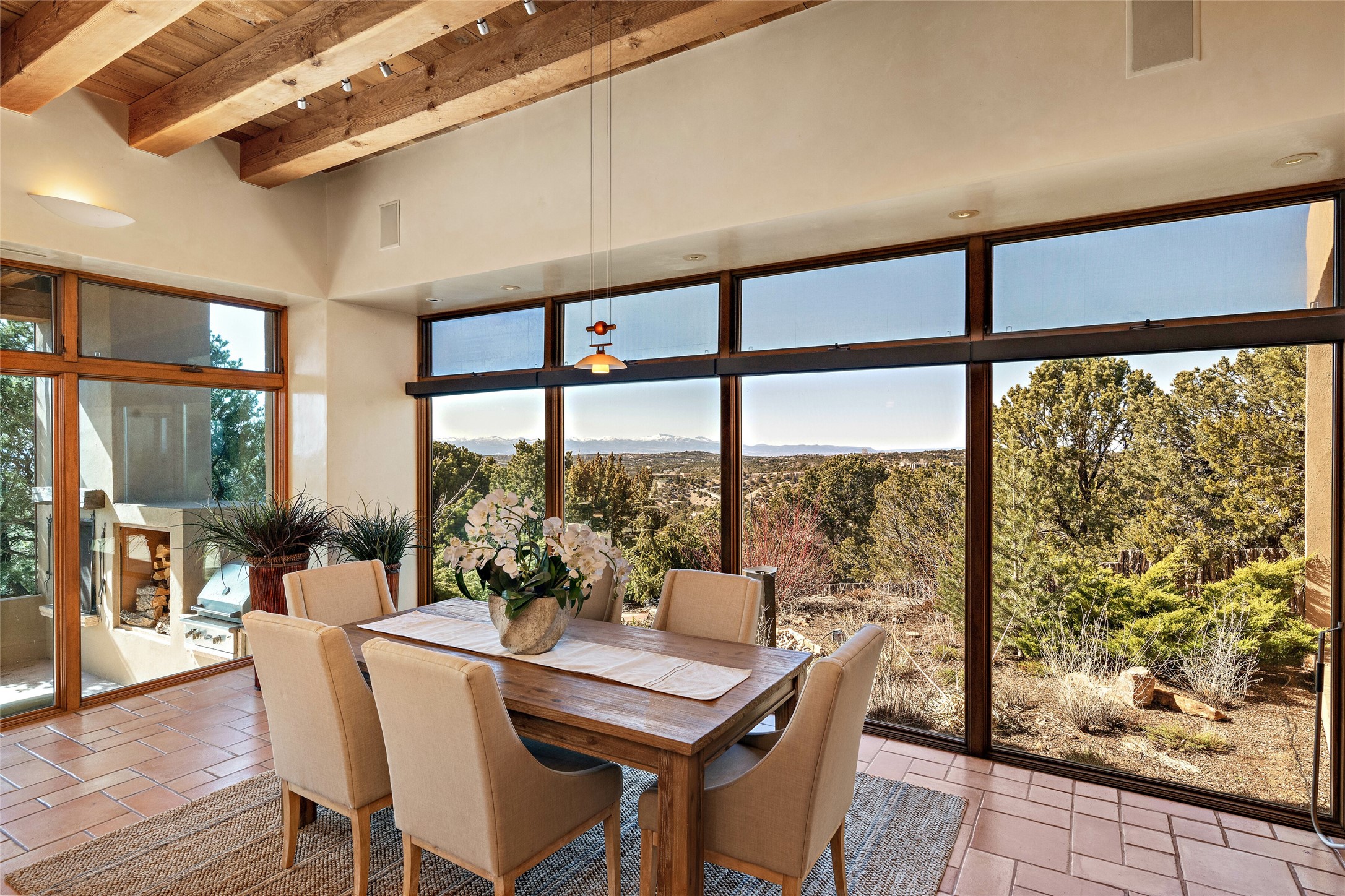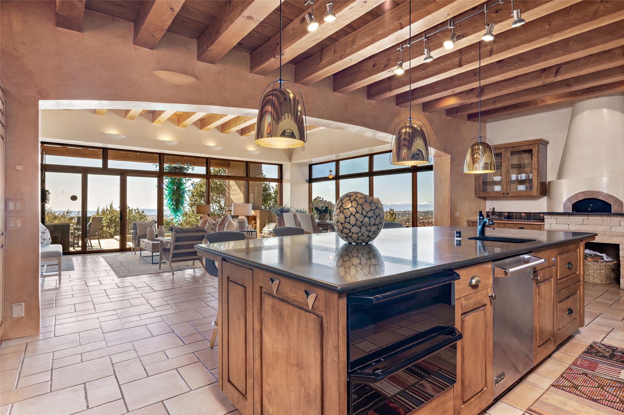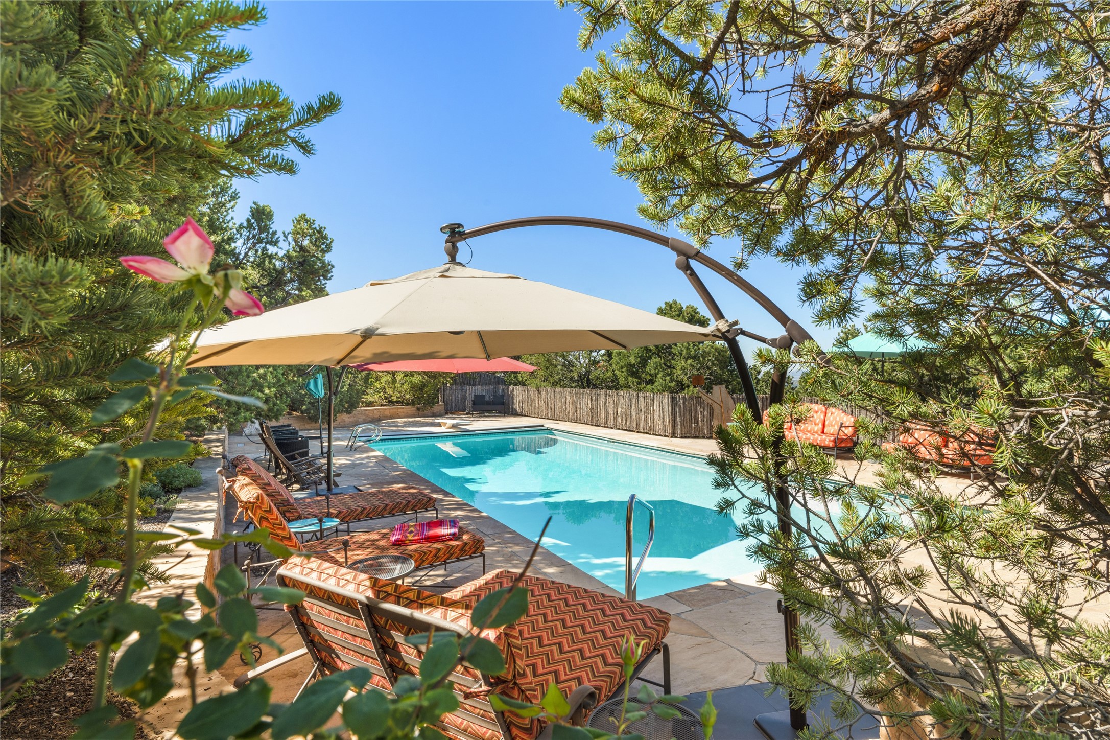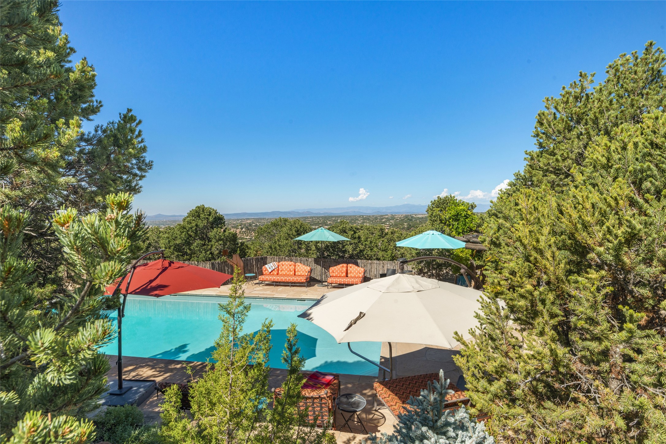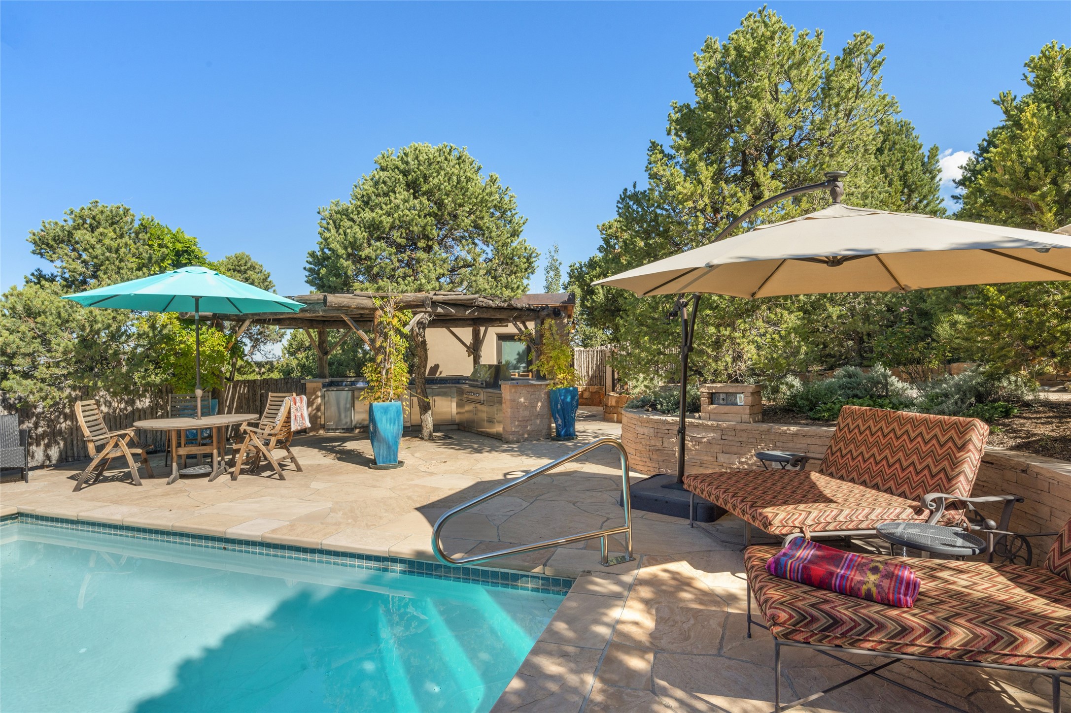 Spectacular top of Sierra del Norte gem with stunning views, contemporary architecture, premier builders (Prull & Boniface), and graceful living spaces. The open floor plan concept flows from the kitchen through to the living room and dining room, out through the over-sized portal, and off to the mountain range views in the distance. Enjoy true picturesque sunsets from this private estate, replete with generous pool and new cabana area, anchored by a private owner's suite (with work out room), two guest bedrooms with en suite baths, separate guest quarters with wet bar & stacked stone fireplace, state-of-the art home theatre, double attached garage, and mature landscaping. The cook's kitchen features warming trays, six-burner Viking range, wood-burning pizza oven, built in refrigerator, separate high temperature wok burner, and massive center island - which is great for food prep and casual kitchen entertaining. The in ground heated pool and cabana area are separated from the main house, and create a private escape from the world - all with expansive views of the Jemez Mountain range, yet loaded with on-site entertaining and with stainless steel outdoor kitchen and barbecue area - with outdoor shower and bath/shower area. The over-sized rear portal area flows off of the living room/dining room, and invites guests to enjoy the impressive outdoor spaces. The entire property is extensively landscaped for year around enjoyment.