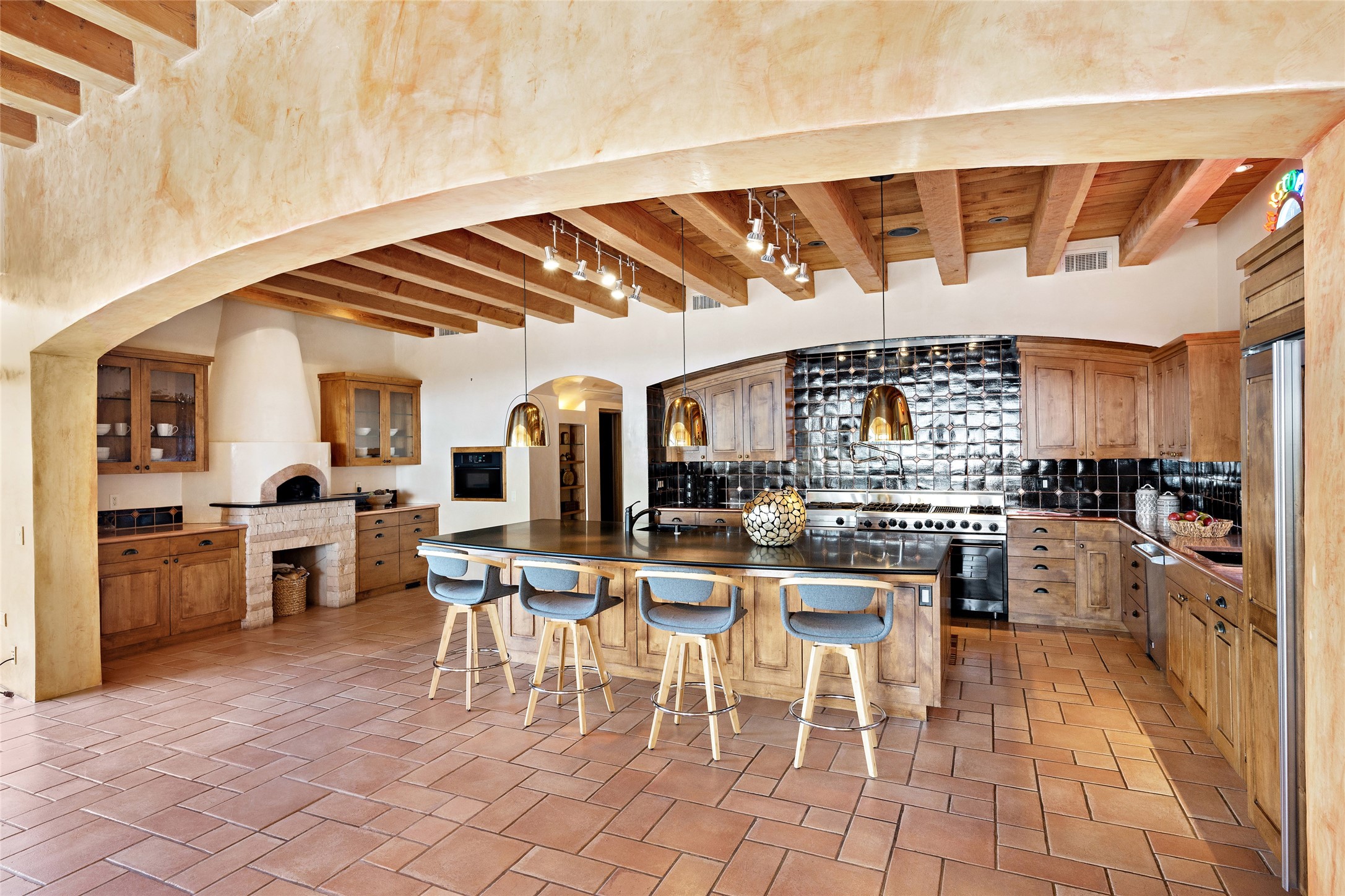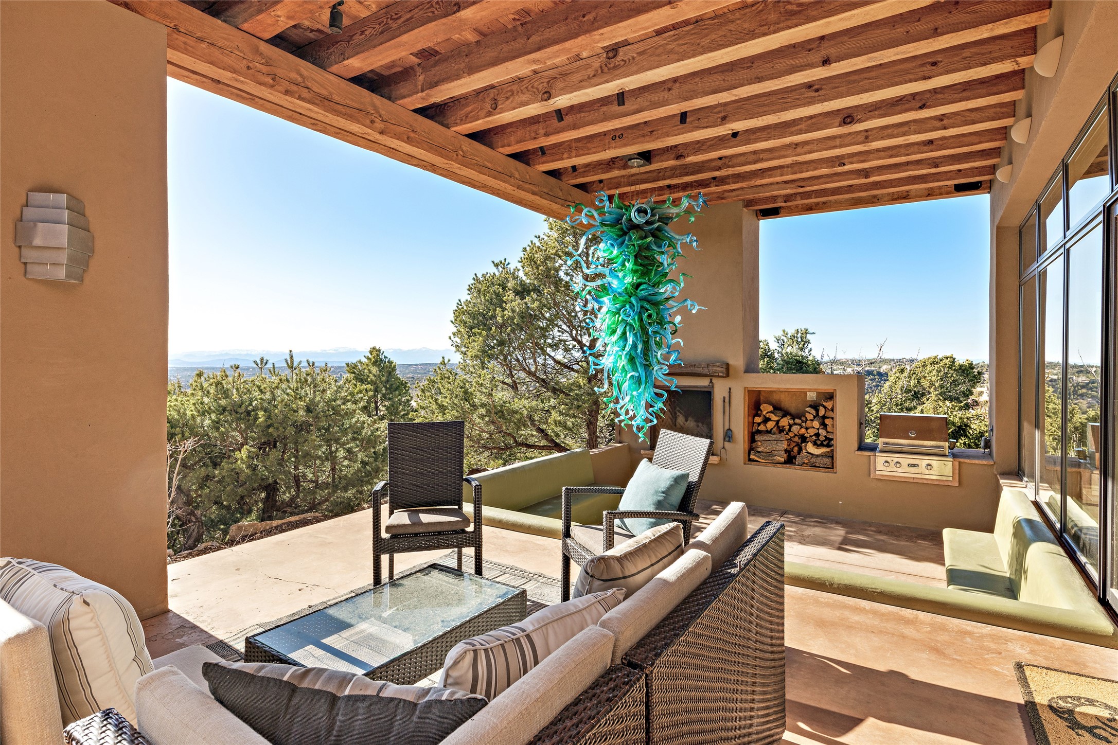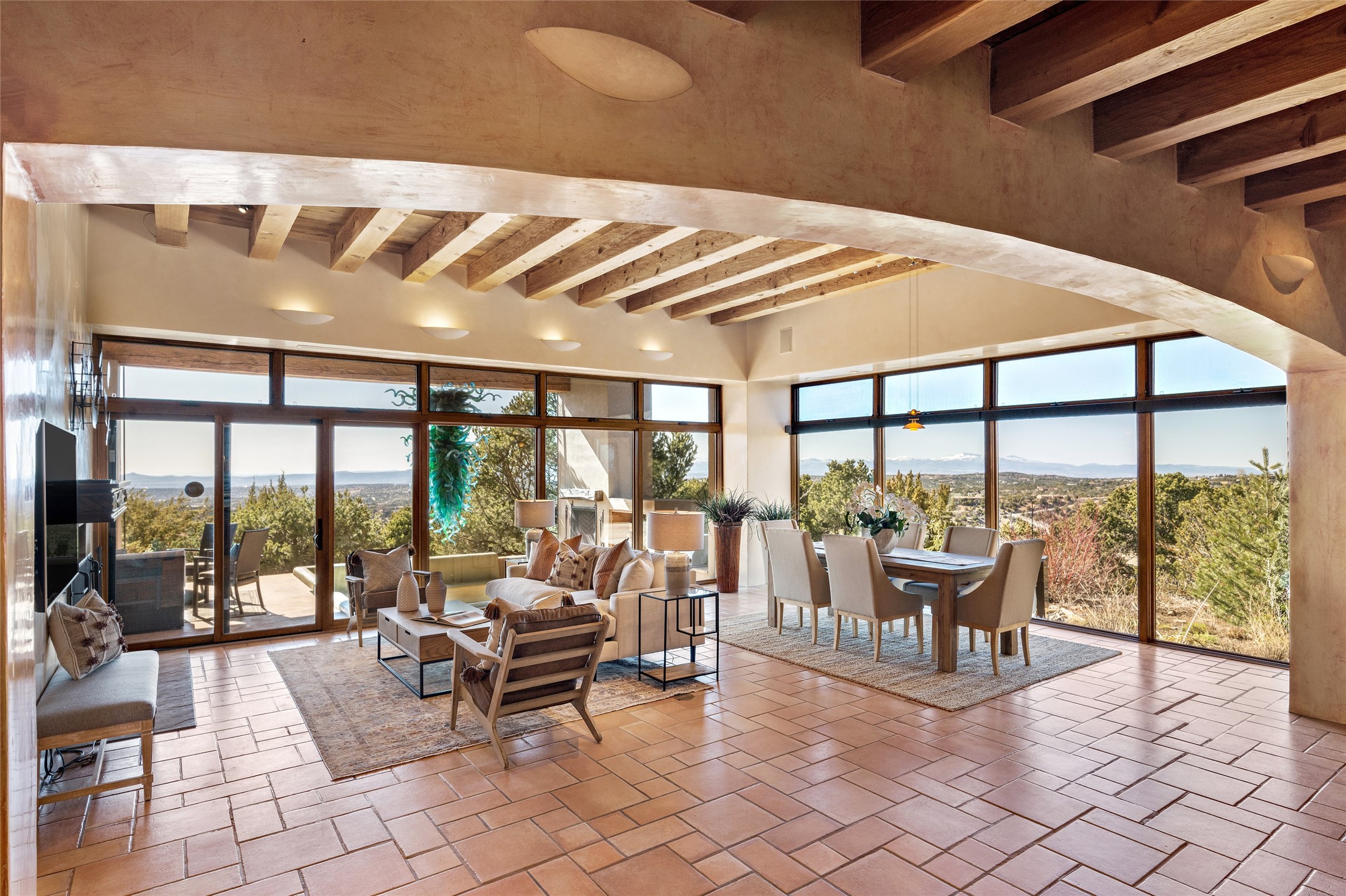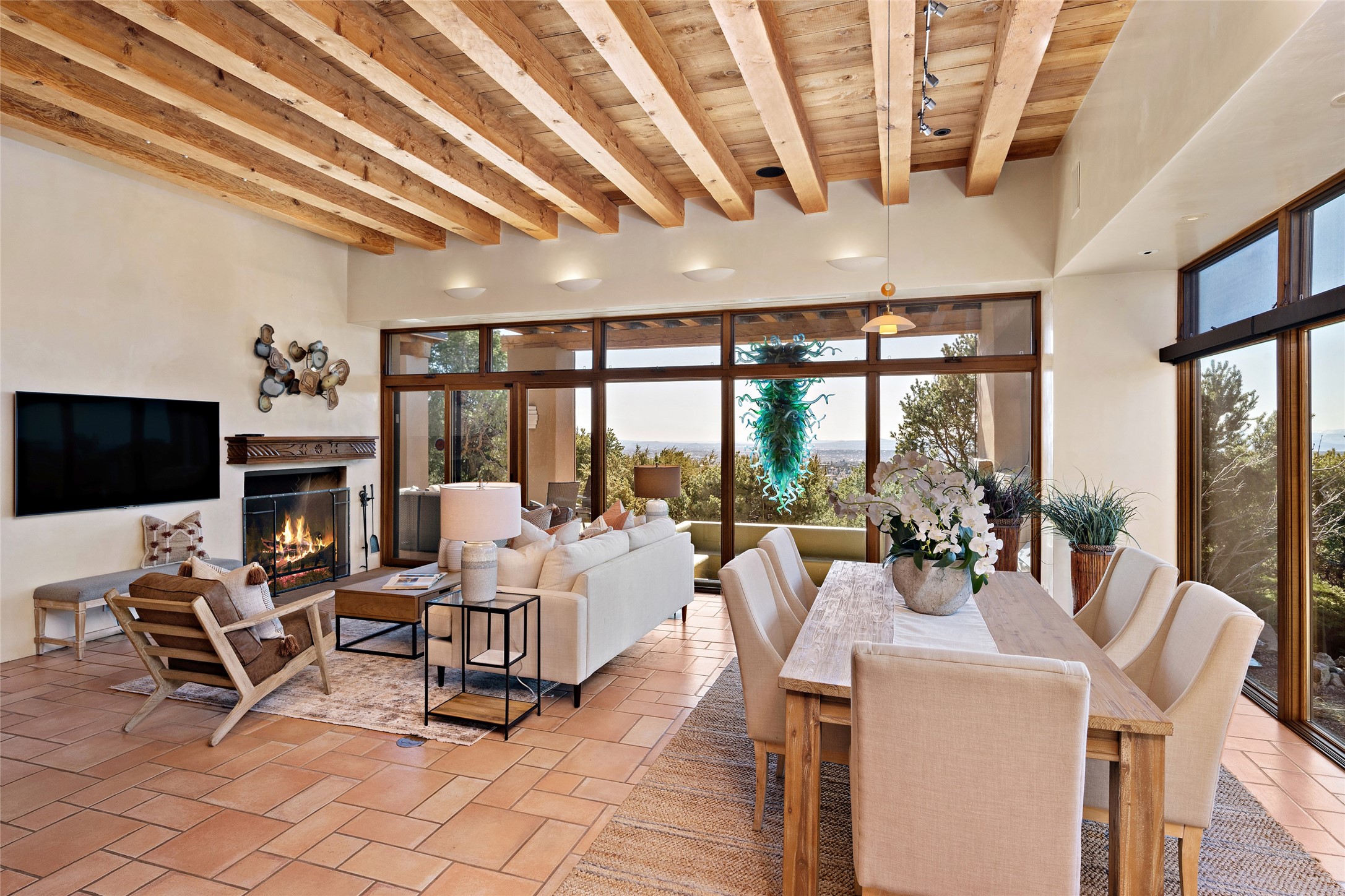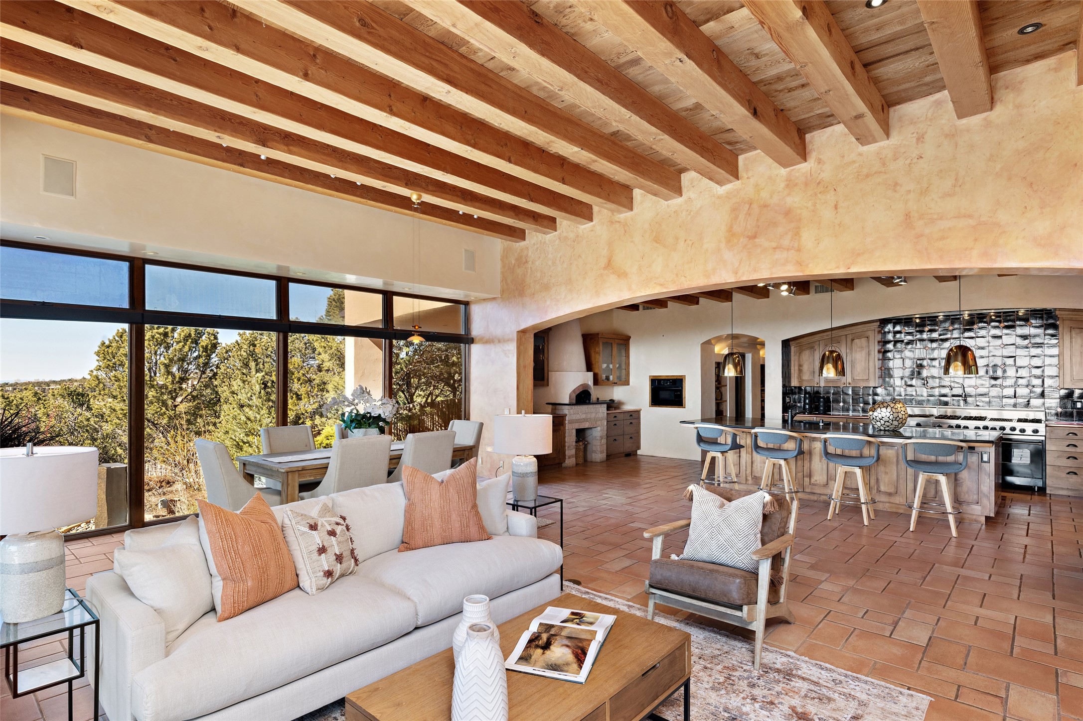 Spectacular top of Sierra del Norte gem with stunning views, contemporary architecture, premier builders (Prull & Boniface), and graceful living spaces. The open floor plan concept flows from the kitchen through to the living room and dining room, out through the over-sized portal, and off to the mountain range views in the distance. Enjoy true picturesque sunsets from this private estate, replete with generous pool and new cabana area, anchored by a private owner's suite (with work out room), two guest bedrooms with en suite baths, separate guest quarters with wet bar & stacked stone fireplace, state-of-the art home theatre, double attached garage, and mature landscaping. The cook's kitchen features warming trays, six-burner Viking range, wood-burning pizza oven, built in refrigerator, separate high temperature wok burner, and massive center island - which is great for food prep and casual kitchen entertaining. The in ground heated pool and cabana area are separated from the main house, and create a private escape from the world - all with expansive views of the Jemez Mountain range, yet loaded with on-site entertaining and with stainless steel outdoor kitchen and barbecue area - with outdoor shower and bath/shower area. The over-sized rear portal area flows off of the living room/dining room, and invites guests to enjoy the impressive outdoor spaces. The entire property is extensively landscaped for year around enjoyment.