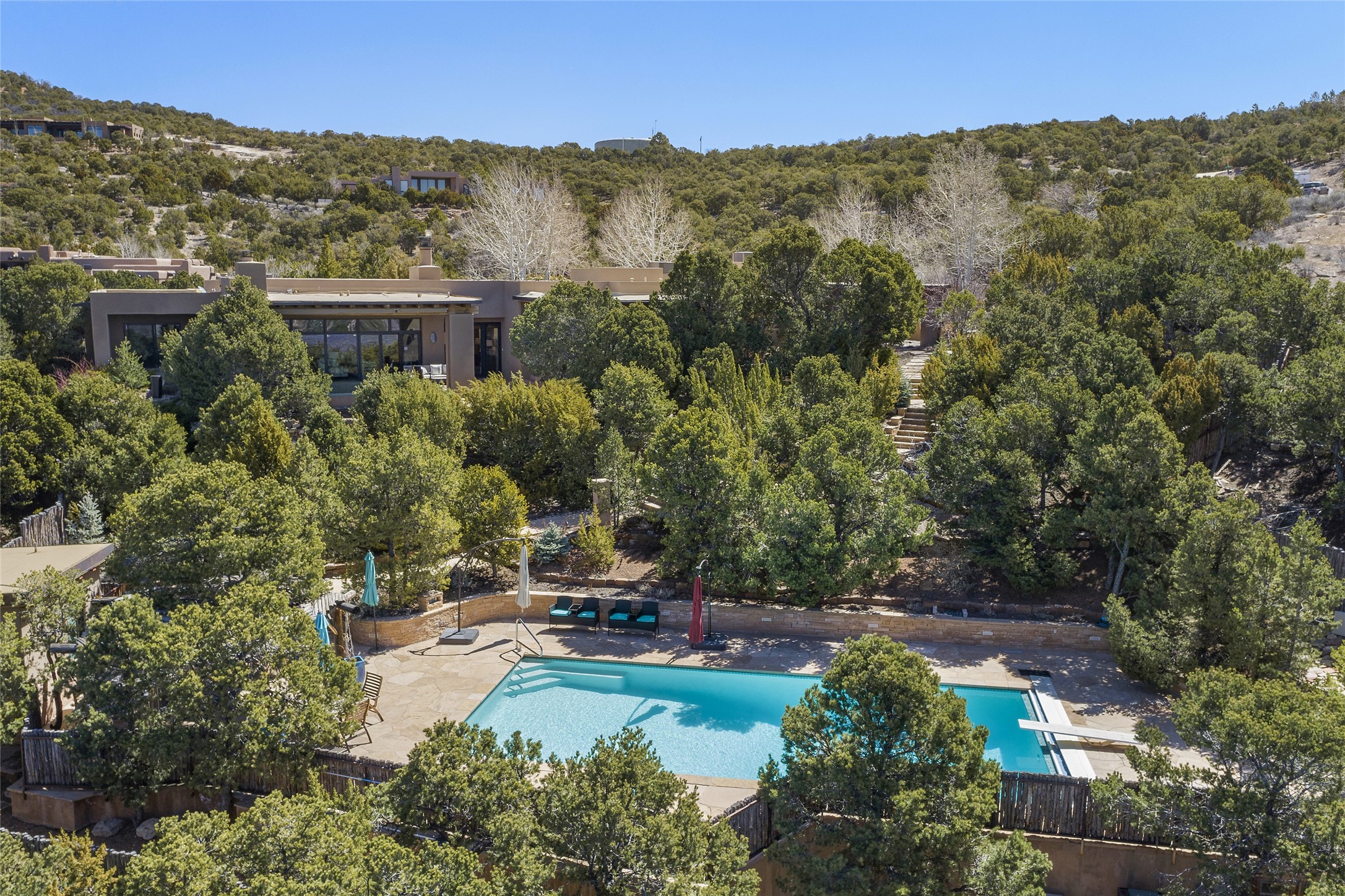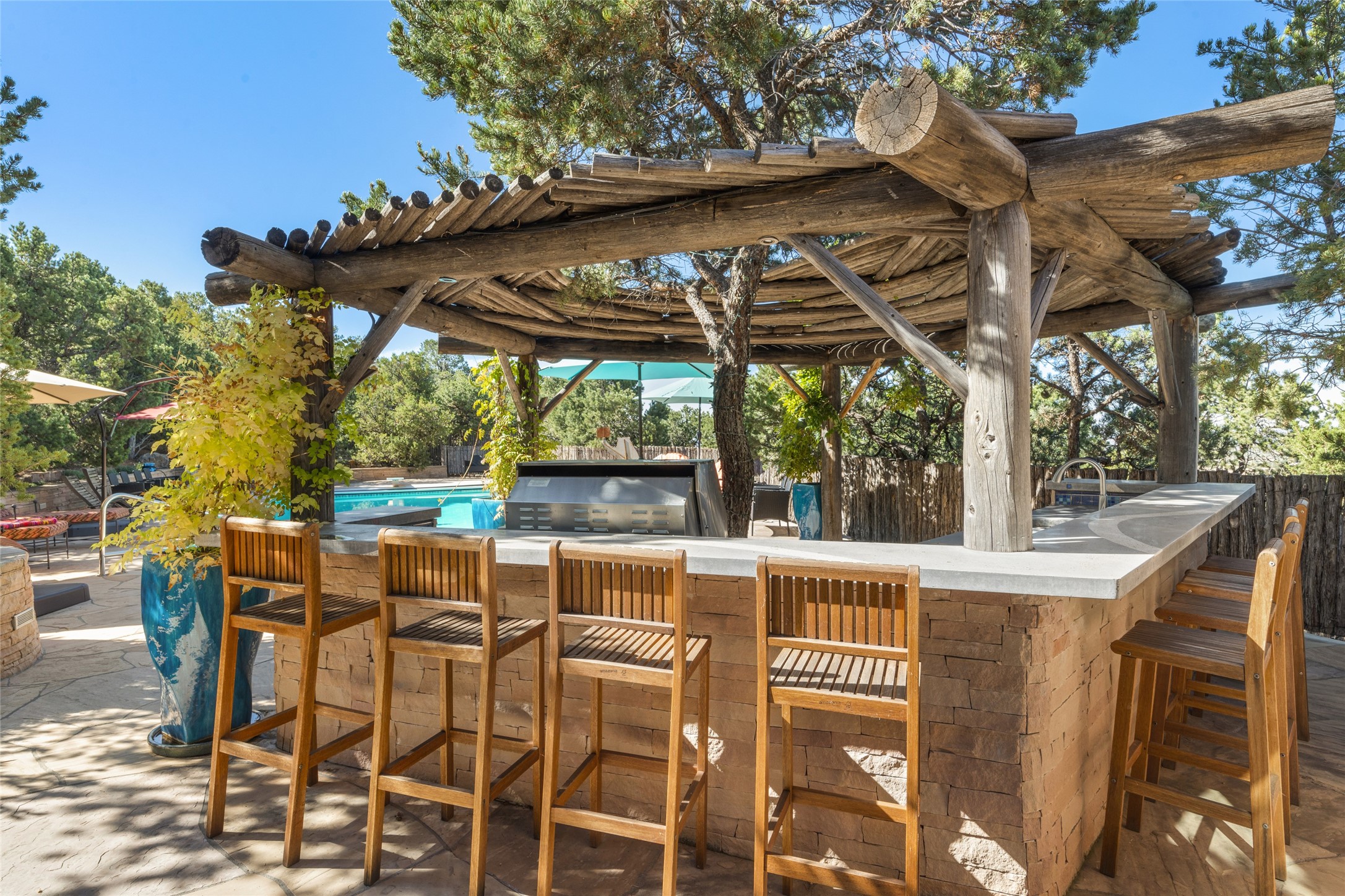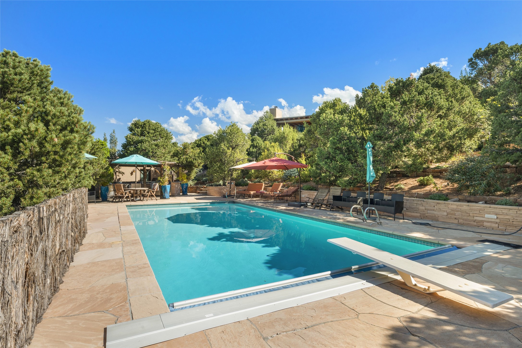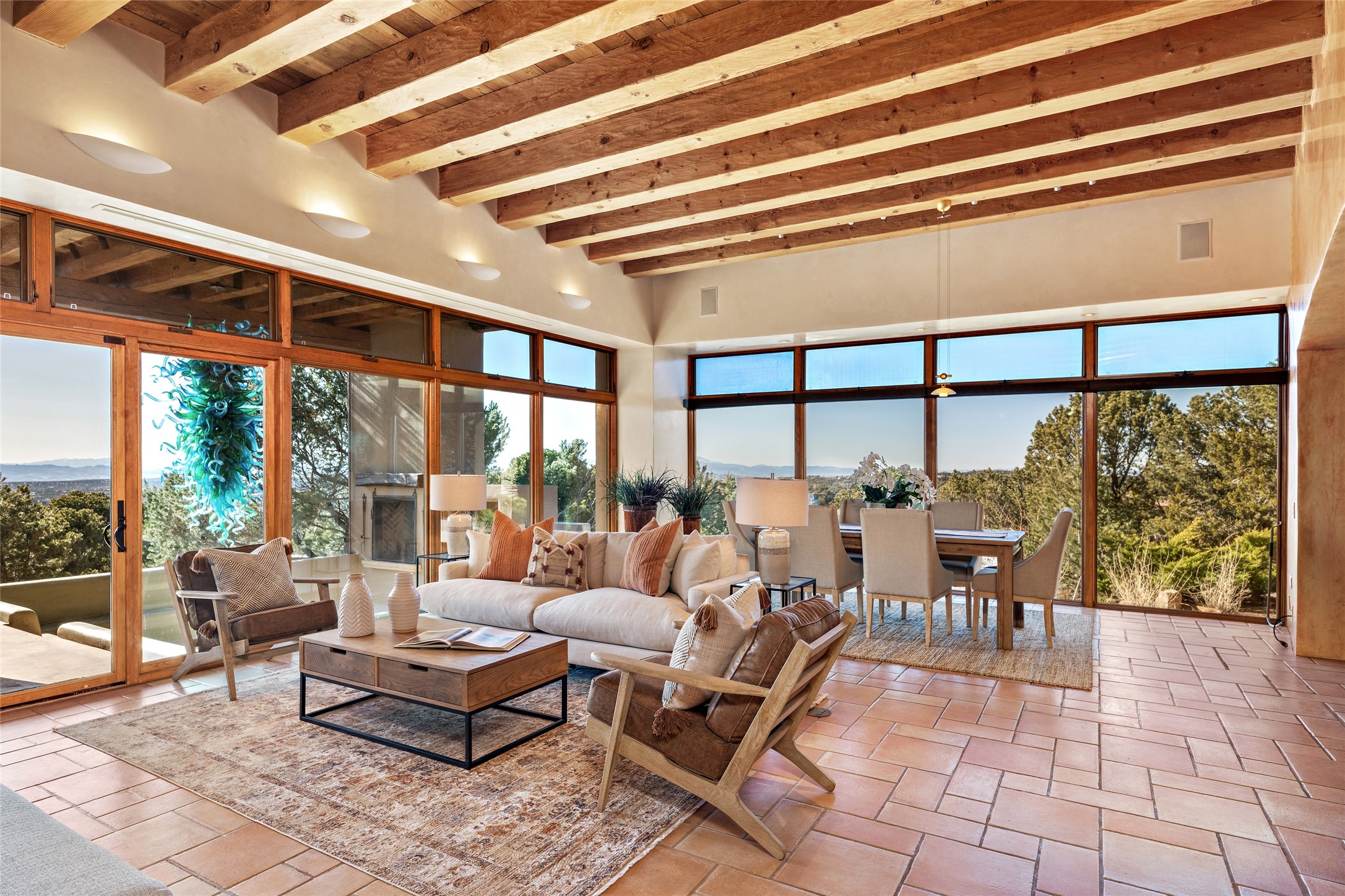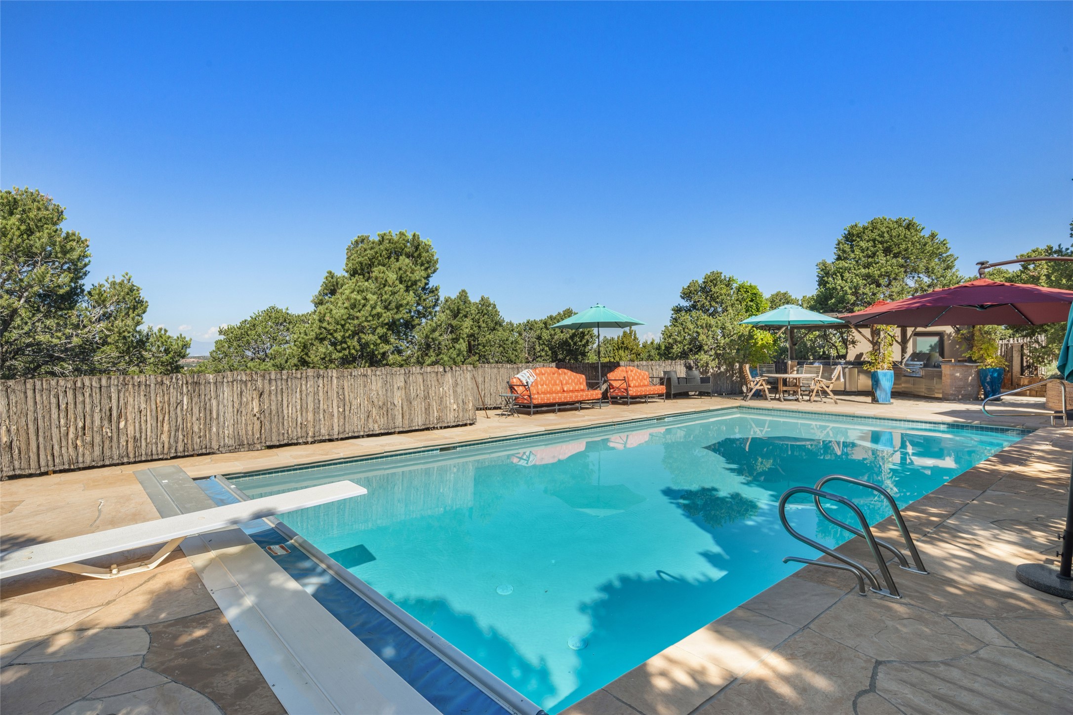 Spectacular top of Sierra del Norte gem with stunning views, contemporary architecture, premier builders (Prull & Boniface), and graceful living spaces. The open floor plan concept flows from the kitchen through to the living room and dining room, out through the over-sized portal, and off to the mountain range views in the distance. Enjoy true picturesque sunsets from this private estate, replete with generous pool and new cabana area, anchored by a private owner's suite (with work out room), two guest bedrooms with en suite baths, separate guest quarters with wet bar & stacked stone fireplace, state-of-the art home theatre, double attached garage, and mature landscaping. The cook's kitchen features warming trays, six-burner Viking range, wood-burning pizza oven, built in refrigerator, separate high temperature wok burner, and massive center island - which is great for food prep and casual kitchen entertaining. The in ground heated pool and cabana area are separated from the main house, and create a private escape from the world - all with expansive views of the Jemez Mountain range, yet loaded with on-site entertaining and with stainless steel outdoor kitchen and barbecue area - with outdoor shower and bath/shower area. The over-sized rear portal area flows off of the living room/dining room, and invites guests to enjoy the impressive outdoor spaces. The entire property is extensively landscaped for year around enjoyment.
