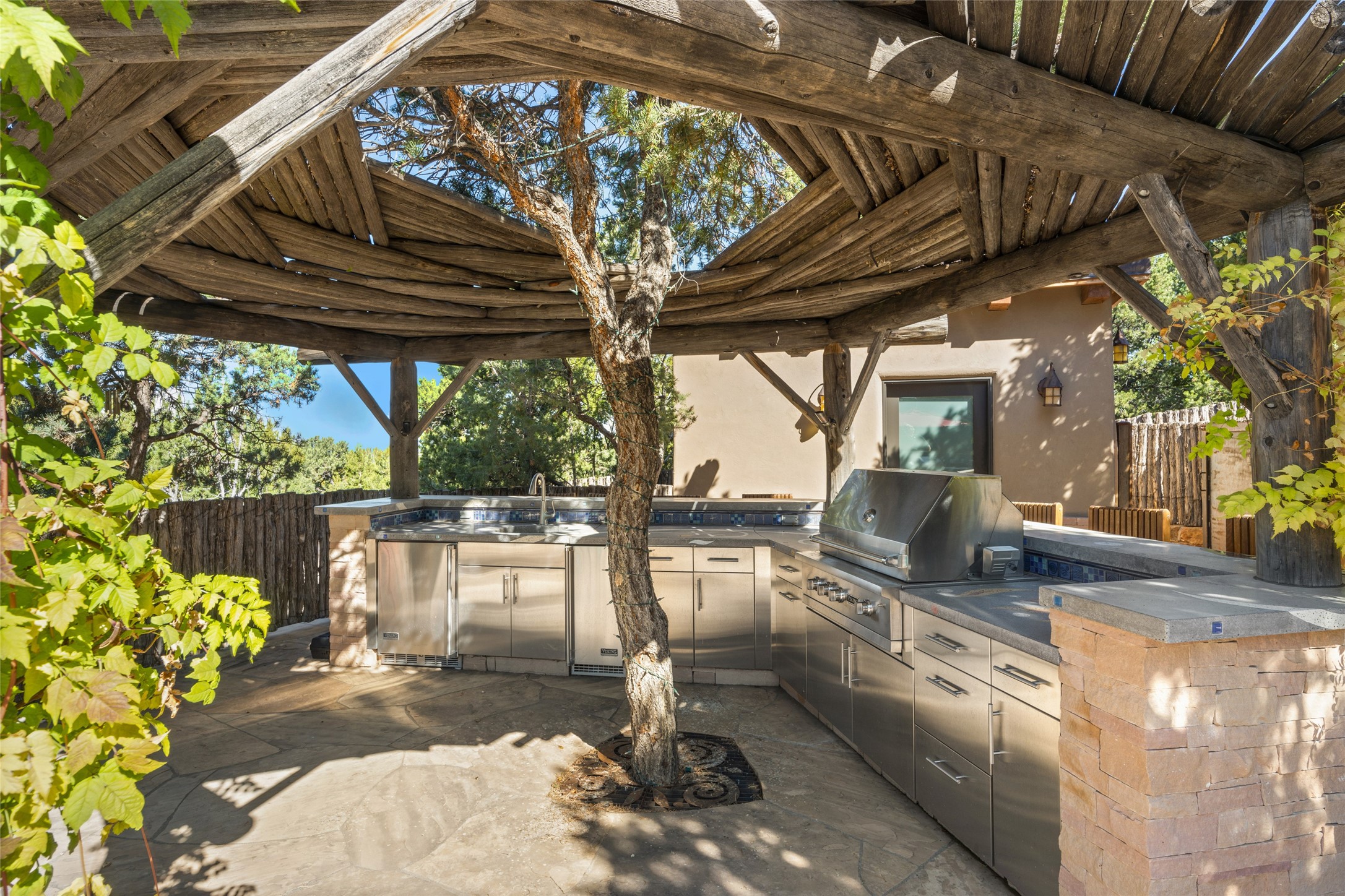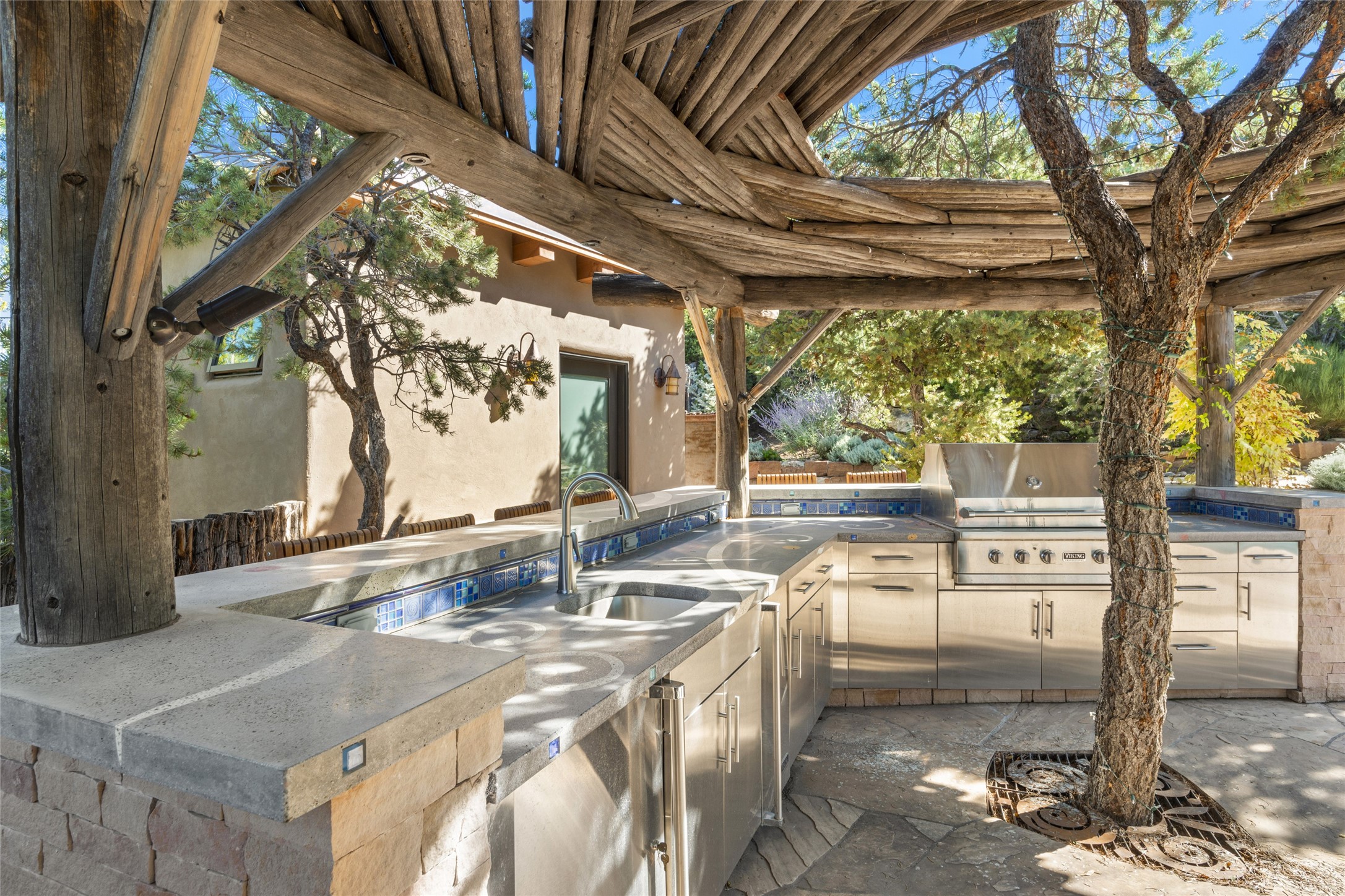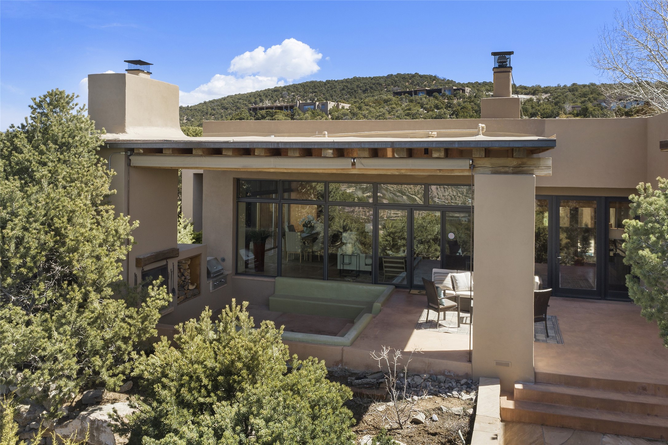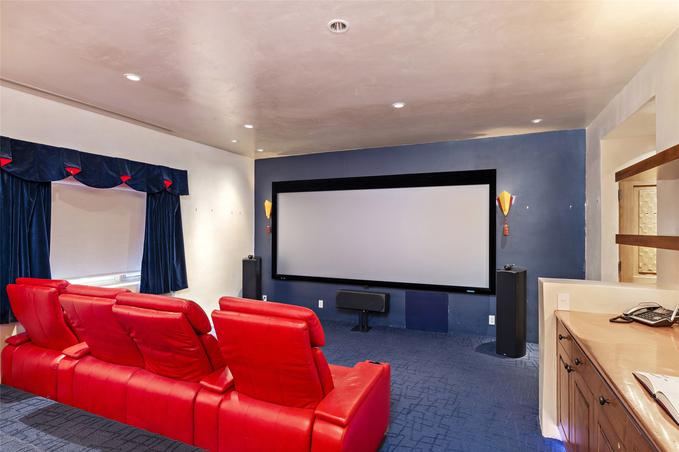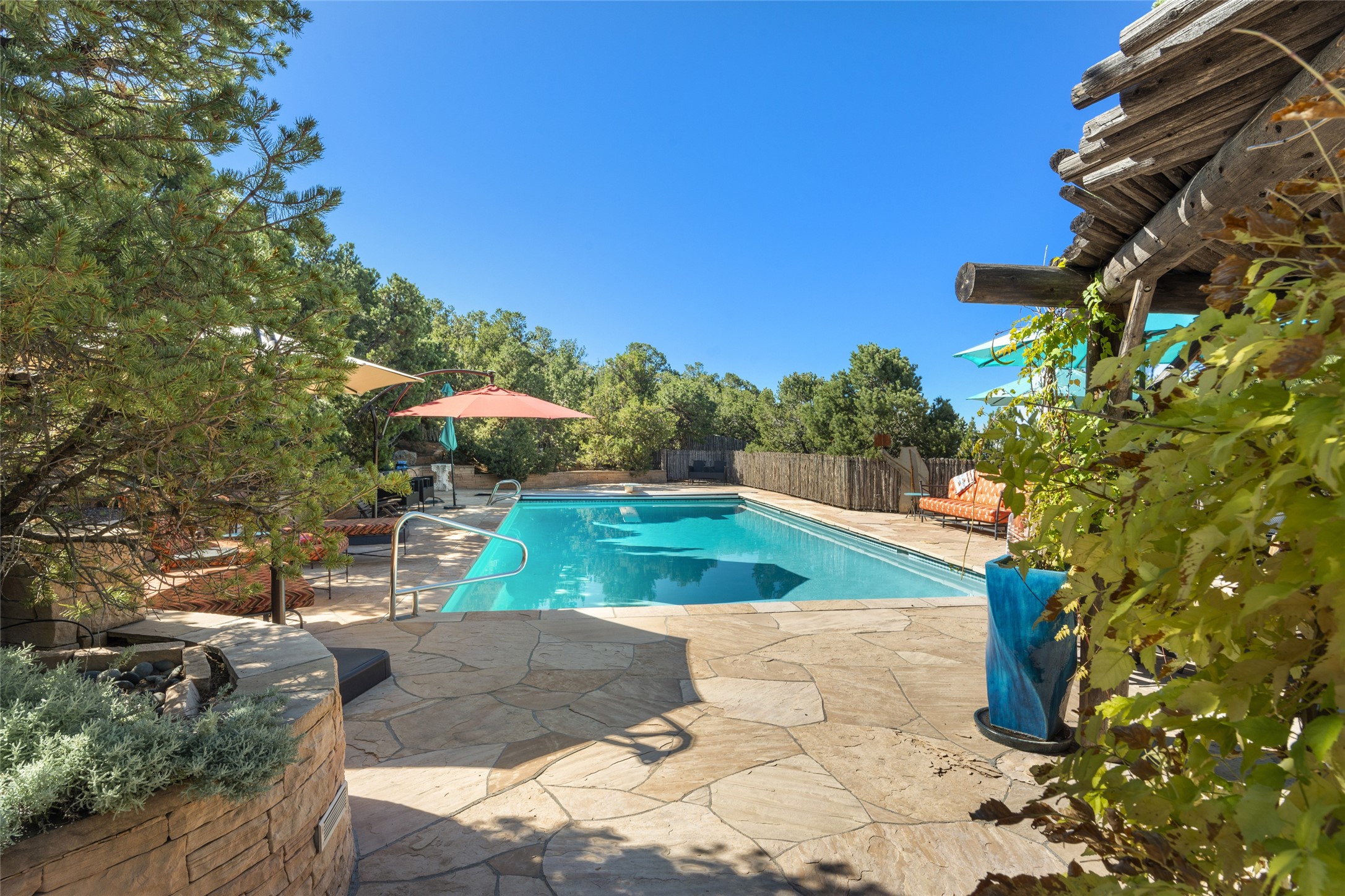 Spectacular top of Sierra del Norte gem with stunning views, contemporary architecture, premier builders (Prull & Boniface), and graceful living spaces. The open floor plan concept flows from the kitchen through to the living room and dining room, out through the over-sized portal, and off to the mountain range views in the distance. Enjoy true picturesque sunsets from this private estate, replete with generous pool and new cabana area, anchored by a private owner's suite (with work out room), two guest bedrooms with en suite baths, separate guest quarters with wet bar & stacked stone fireplace, state-of-the art home theatre, double attached garage, and mature landscaping. The cook's kitchen features warming trays, six-burner Viking range, wood-burning pizza oven, built in refrigerator, separate high temperature wok burner, and massive center island - which is great for food prep and casual kitchen entertaining. The in ground heated pool and cabana area are separated from the main house, and create a private escape from the world - all with expansive views of the Jemez Mountain range, yet loaded with on-site entertaining and with stainless steel outdoor kitchen and barbecue area - with outdoor shower and bath/shower area. The over-sized rear portal area flows off of the living room/dining room, and invites guests to enjoy the impressive outdoor spaces. The entire property is extensively landscaped for year around enjoyment.