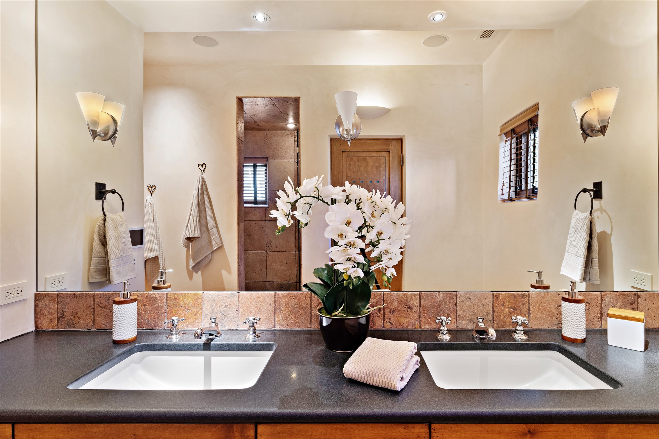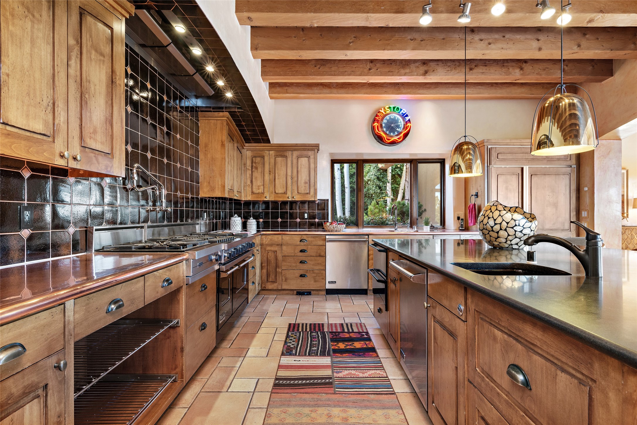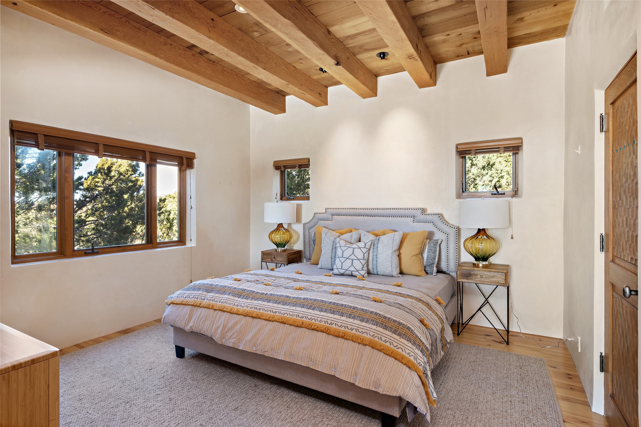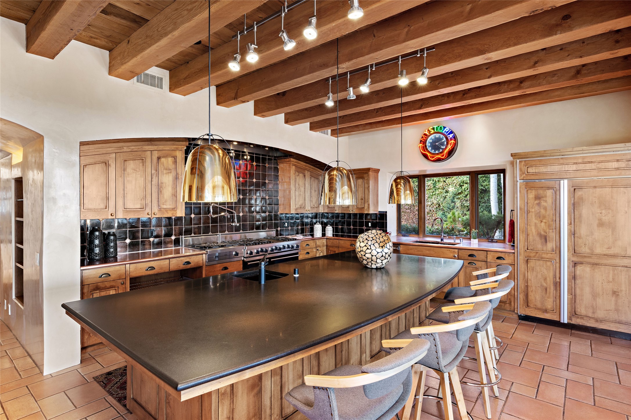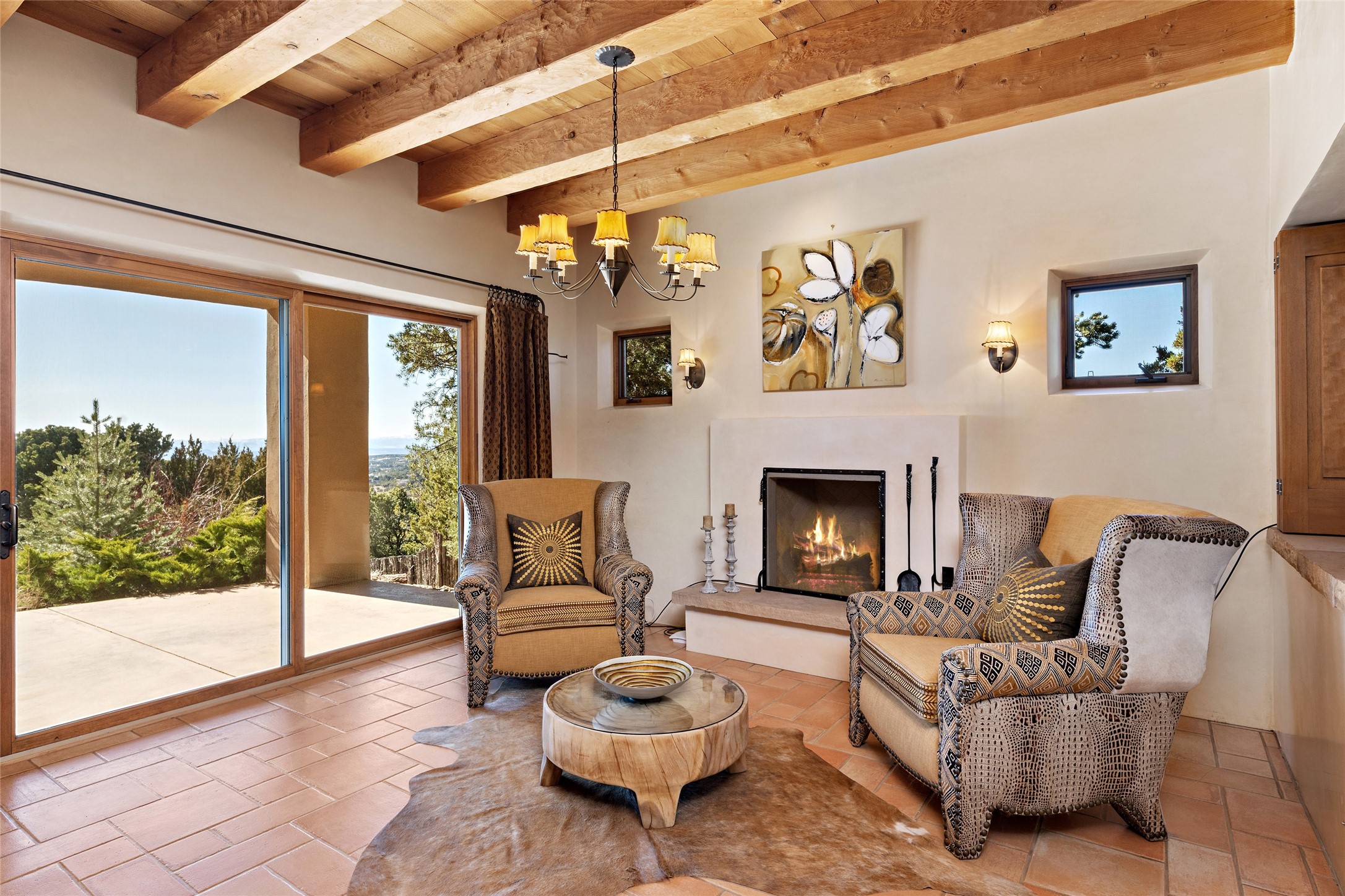 Spectacular top of Sierra del Norte gem with stunning views, contemporary architecture, premier builders (Prull & Boniface), and graceful living spaces. The open floor plan concept flows from the kitchen through to the living room and dining room, out through the over-sized portal, and off to the mountain range views in the distance. Enjoy true picturesque sunsets from this private estate, replete with generous pool and new cabana area, anchored by a private owner's suite (with work out room), two guest bedrooms with en suite baths, separate guest quarters with wet bar & stacked stone fireplace, state-of-the art home theatre, double attached garage, and mature landscaping. The cook's kitchen features warming trays, six-burner Viking range, wood-burning pizza oven, built in refrigerator, separate high temperature wok burner, and massive center island - which is great for food prep and casual kitchen entertaining. The in ground heated pool and cabana area are separated from the main house, and create a private escape from the world - all with expansive views of the Jemez Mountain range, yet loaded with on-site entertaining and with stainless steel outdoor kitchen and barbecue area - with outdoor shower and bath/shower area. The over-sized rear portal area flows off of the living room/dining room, and invites guests to enjoy the impressive outdoor spaces. The entire property is extensively landscaped for year around enjoyment.