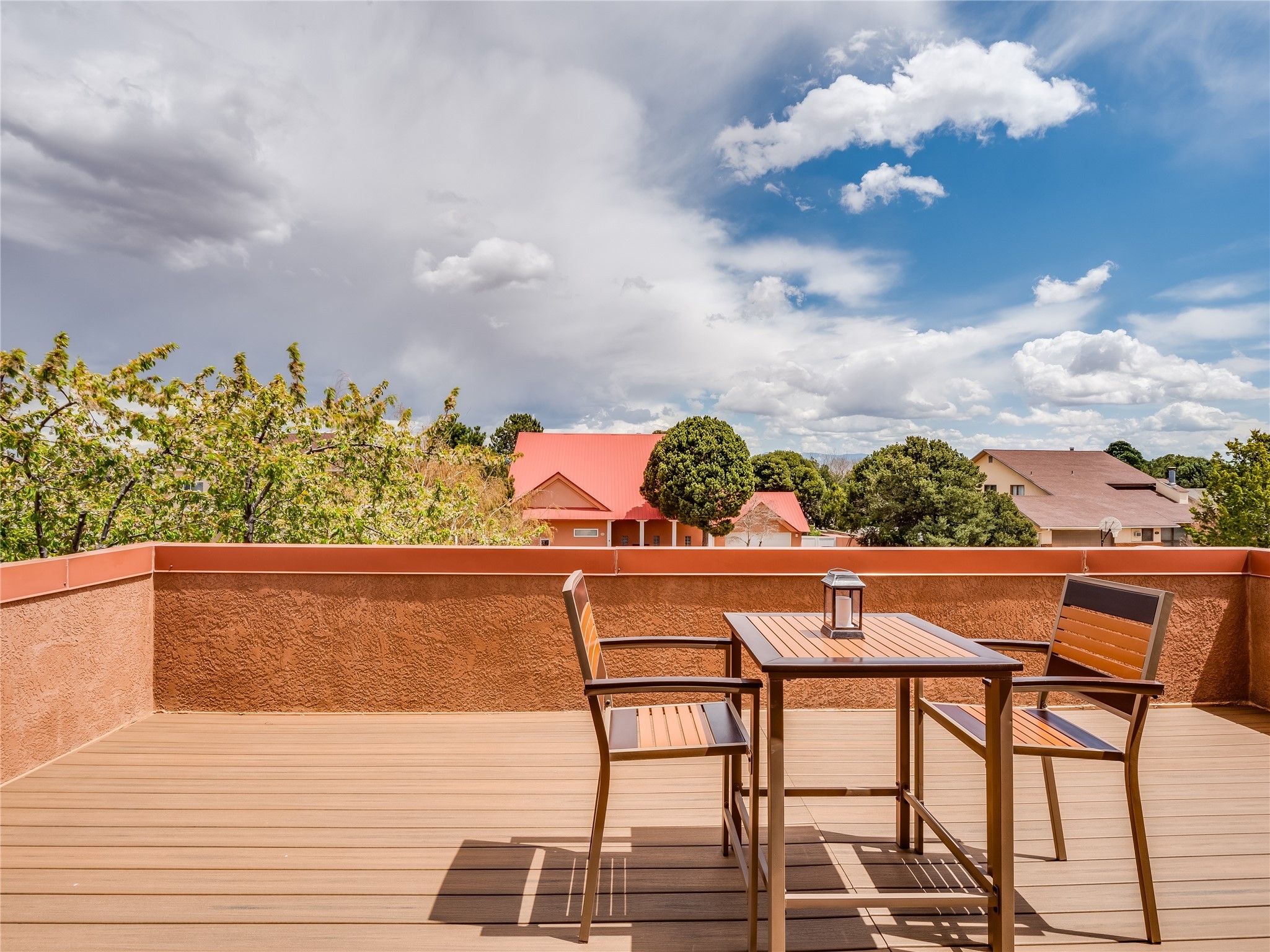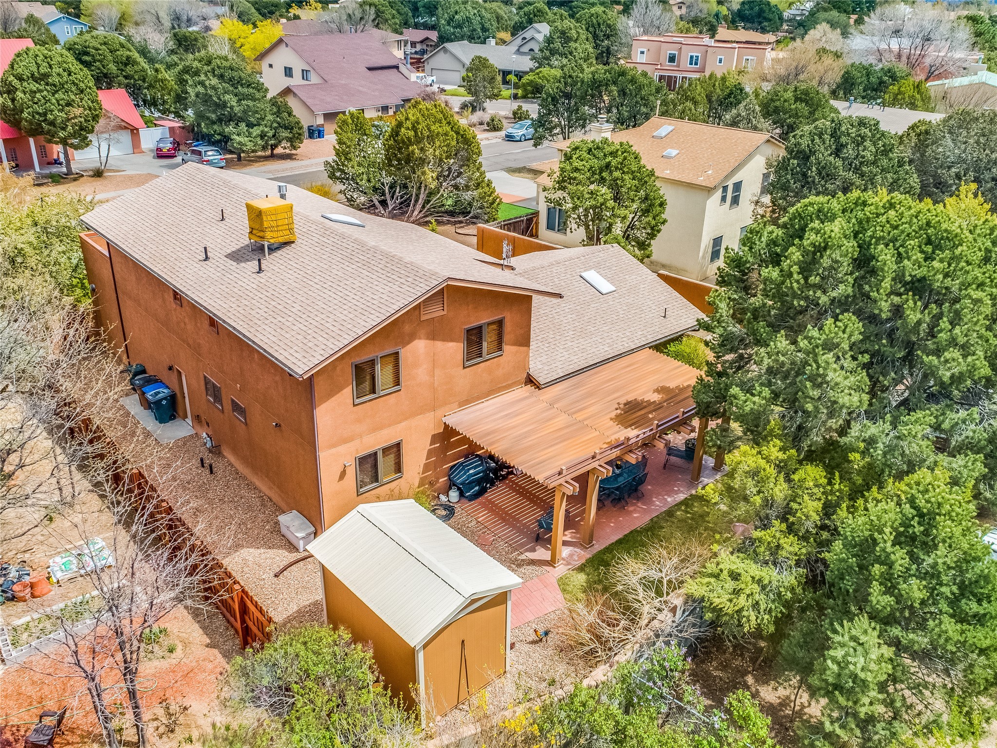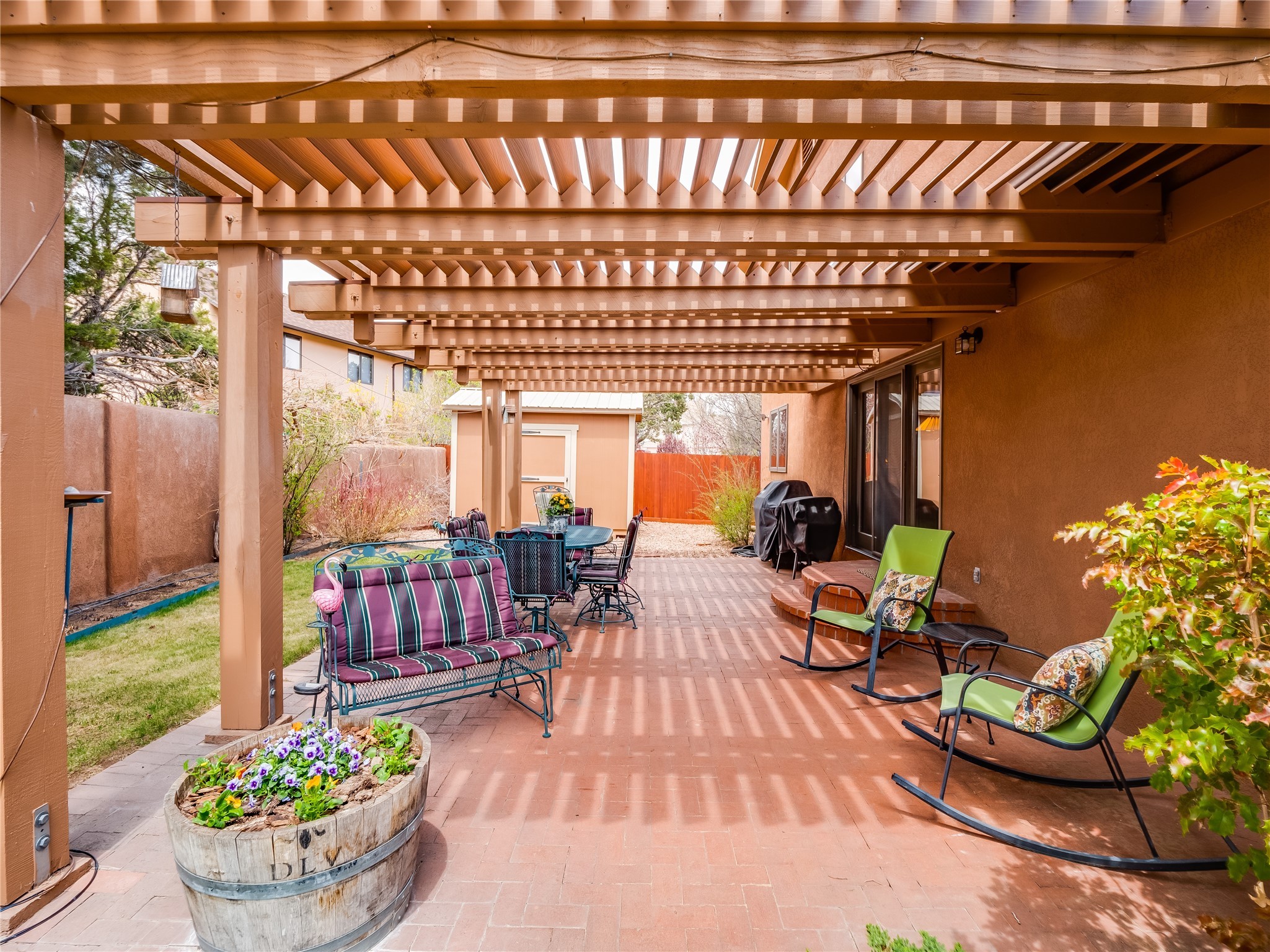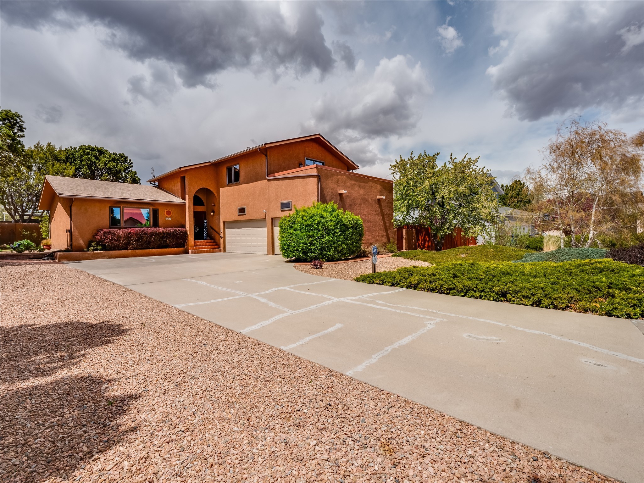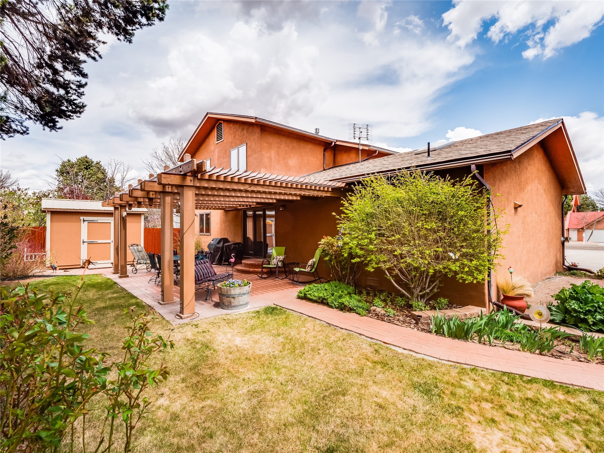 This Gorgeous two story home is located in a lovely White Rock neighborhood. Beautiful and easy maintenance with tons of curb appeal with mature trees and landscaping continues into the backyard with flower beds, grass, included Shed, and a large trellised covered brick patio that's ideal for outdoor entertaining and just staying cool in the summer time. A grand entrance with tile flooring, vaulted ceilings with chandelier and a curved staircase brings your eye up to the second floor. To your left is a bright Living Room with carpet, a large window and a gas fireplace with stone surround. The heart of the home is a huge Great Room consisting of Kitchen/Dining/Family Room which has wood floors and access to the backyard. The Kitchen has wood cabinets with granite counters, stone backsplash, and stainless steel appliances. Also on this floor is a Guest Bedroom, a Guest Bath with walk-in tiled shower, a Laundry Room and access to the oversized three car garage. Upstairs there's an open landing with wood floors and skylight. Two large bedrooms with carpet and a Full Bath with a double sink vanity. An enormous Primary En-suite with wood floors, his and hers walk-in closets, vaulted ceilings, a large private composite wood deck is the perfect retreat to start your day with a coffee or end your day with a nice glass of wine. The Bath has a double sink vanity with granite counter and a separate toilet bath/shower room with tile. Don't miss out on this beauty, book your tour today!