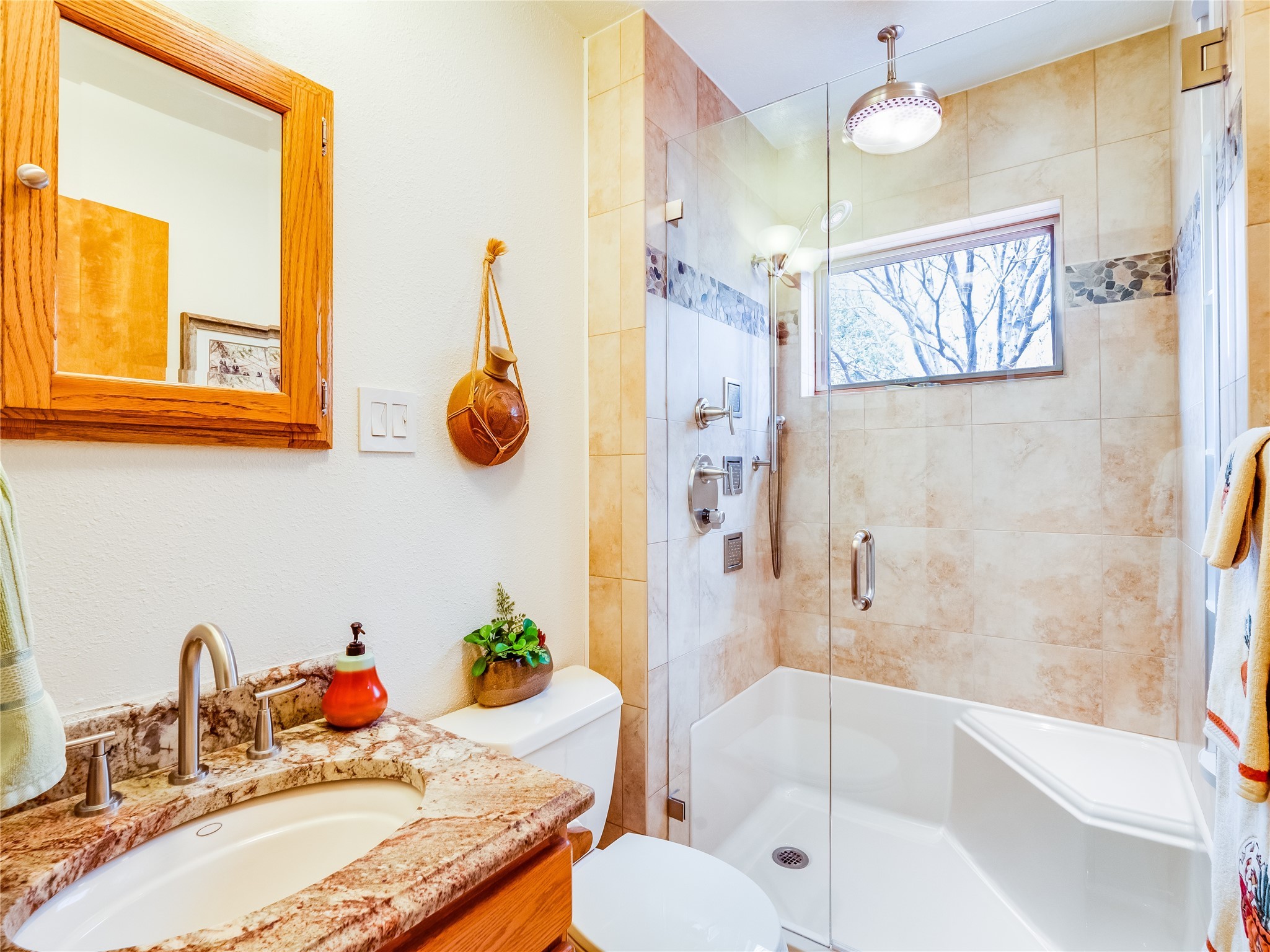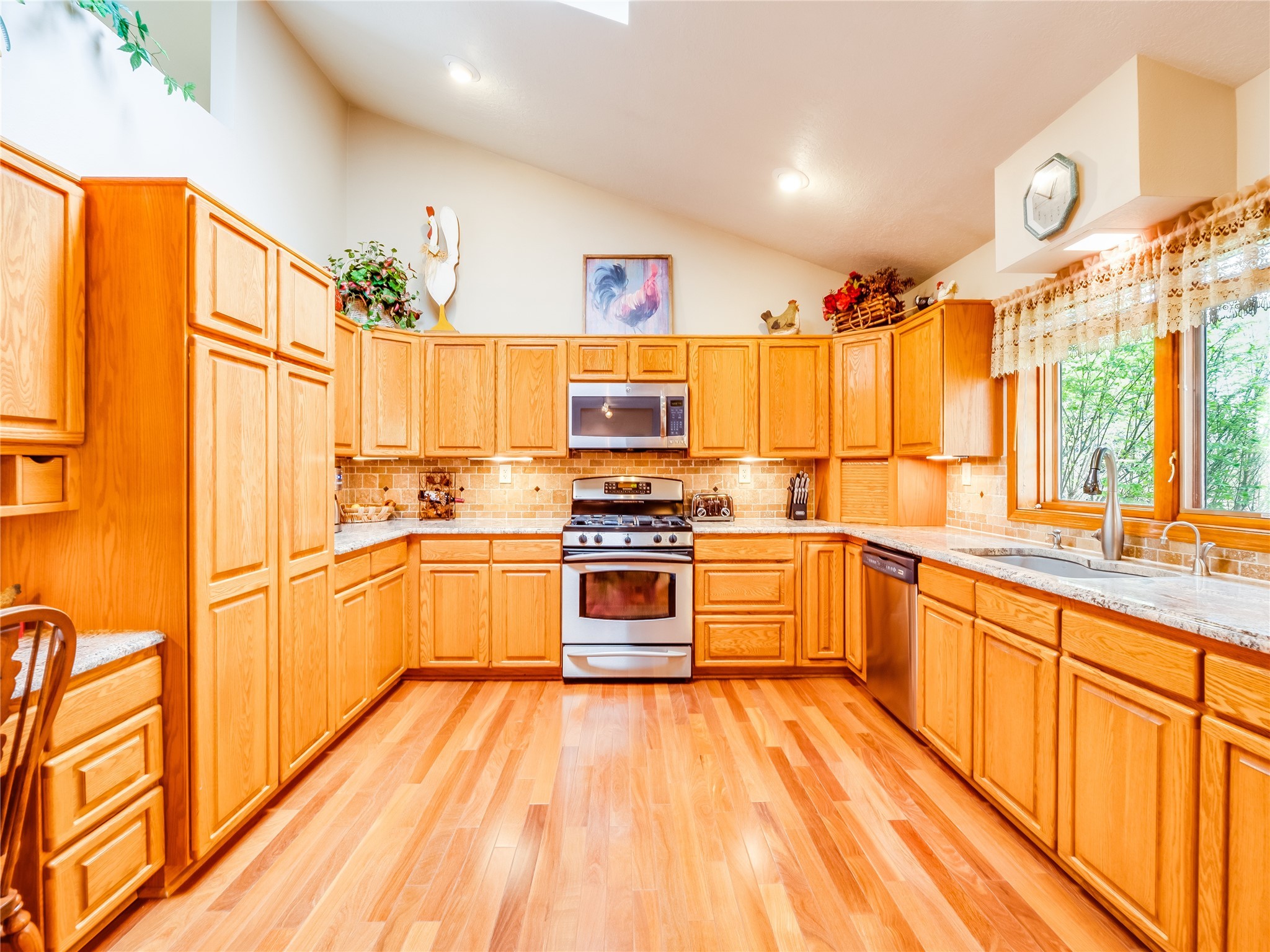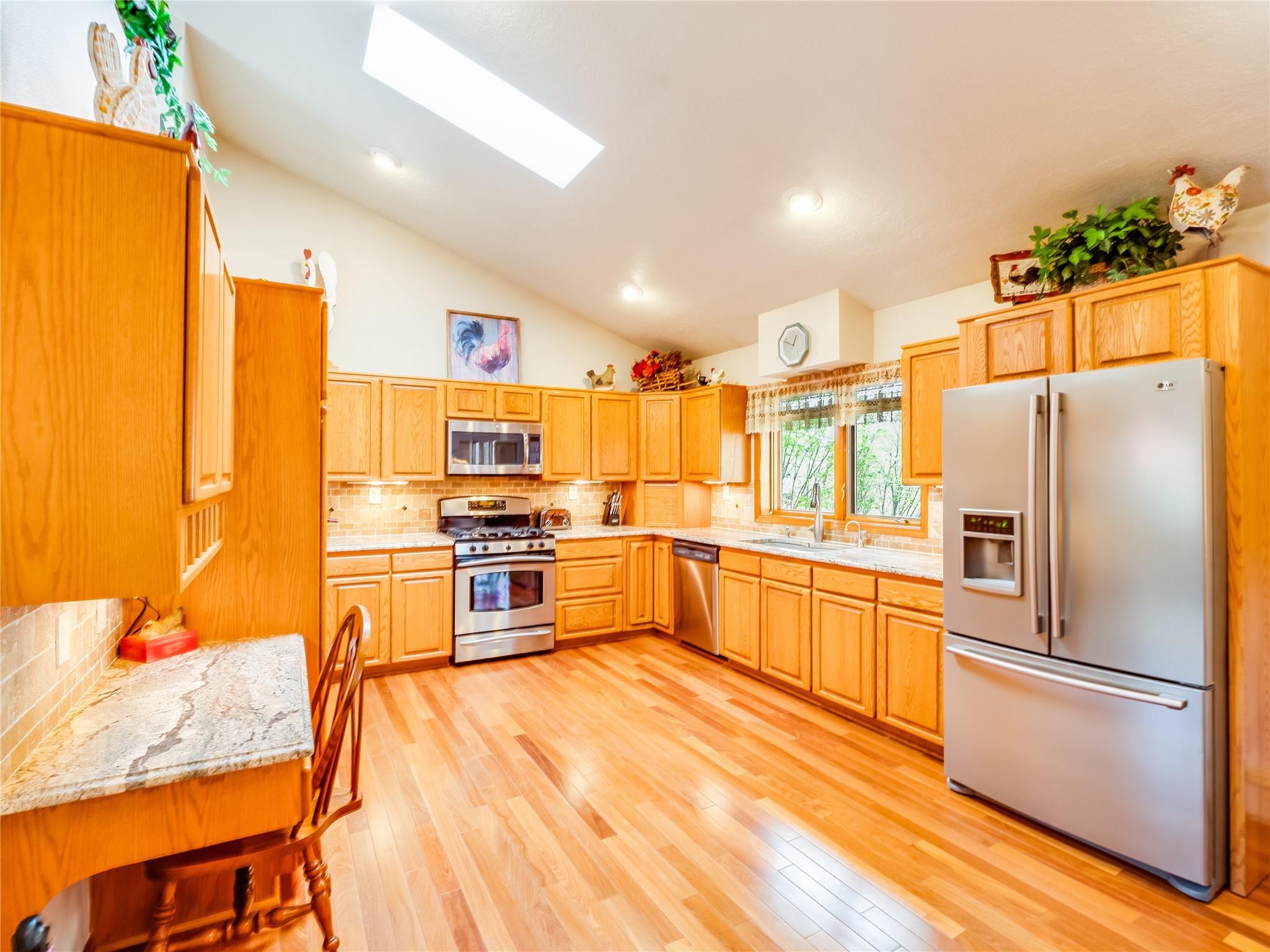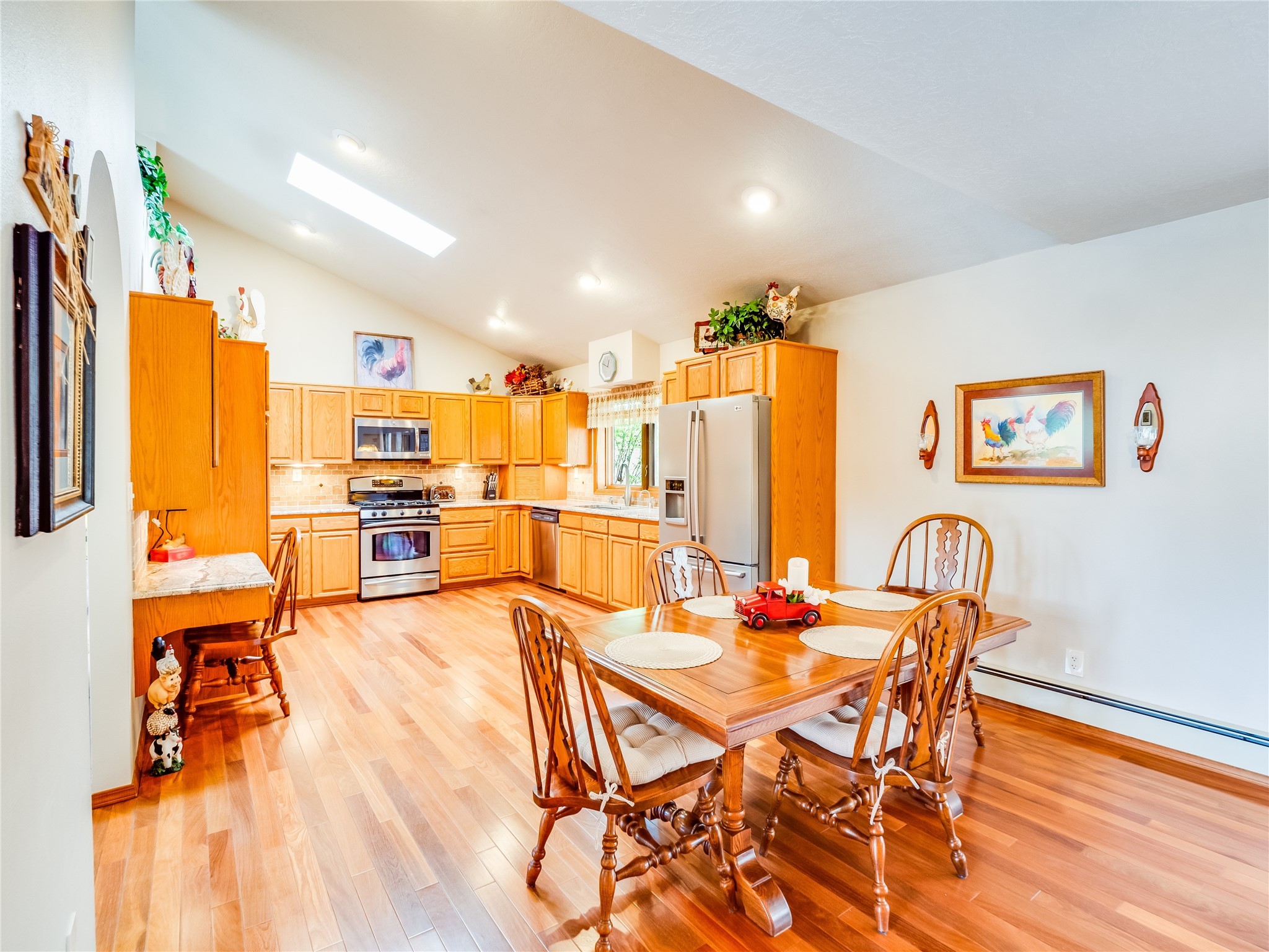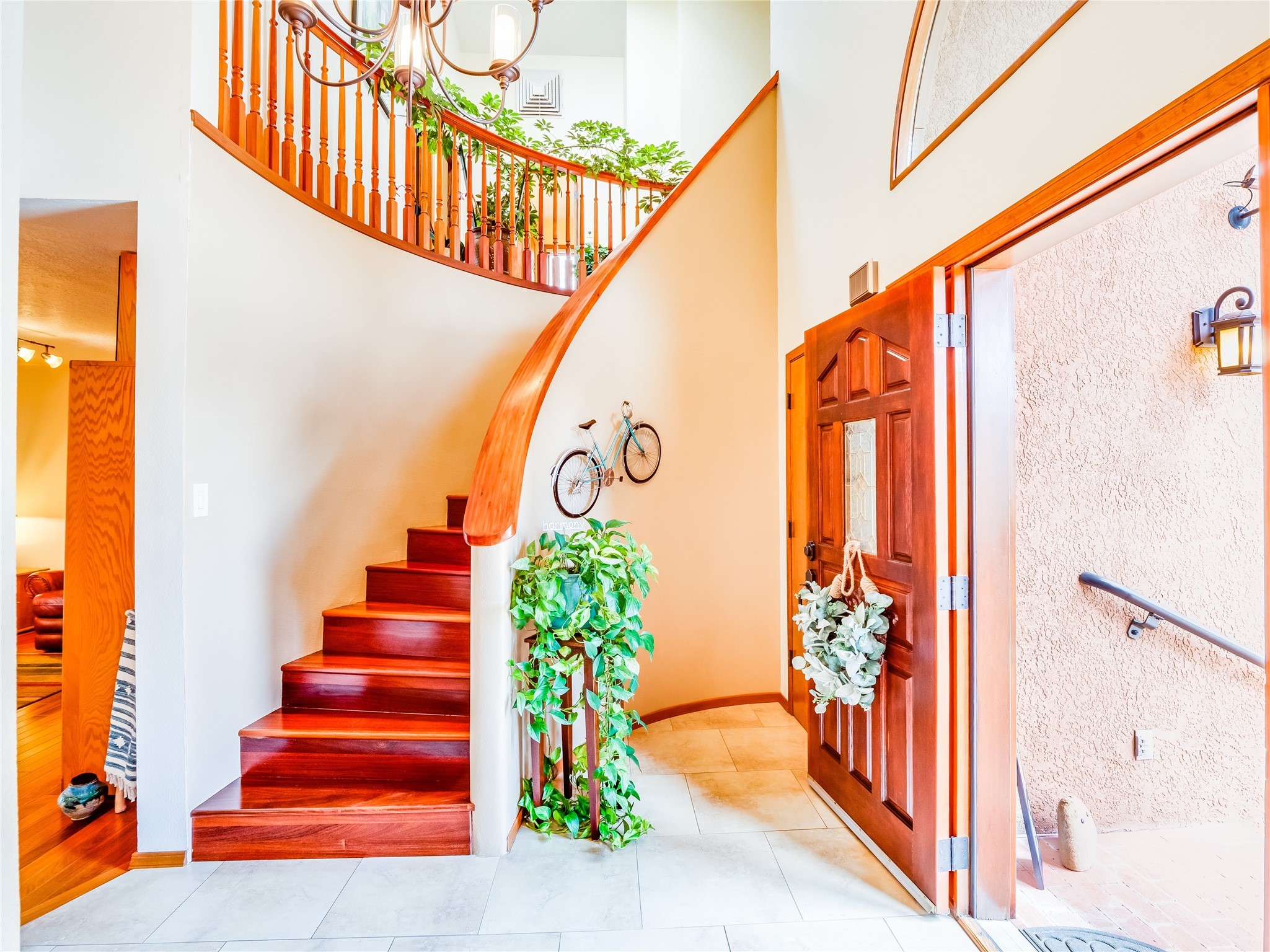 This Gorgeous two story home is located in a lovely White Rock neighborhood. Beautiful and easy maintenance with tons of curb appeal with mature trees and landscaping continues into the backyard with flower beds, grass, included Shed, and a large trellised covered brick patio that's ideal for outdoor entertaining and just staying cool in the summer time. A grand entrance with tile flooring, vaulted ceilings with chandelier and a curved staircase brings your eye up to the second floor. To your left is a bright Living Room with carpet, a large window and a gas fireplace with stone surround. The heart of the home is a huge Great Room consisting of Kitchen/Dining/Family Room which has wood floors and access to the backyard. The Kitchen has wood cabinets with granite counters, stone backsplash, and stainless steel appliances. Also on this floor is a Guest Bedroom, a Guest Bath with walk-in tiled shower, a Laundry Room and access to the oversized three car garage. Upstairs there's an open landing with wood floors and skylight. Two large bedrooms with carpet and a Full Bath with a double sink vanity. An enormous Primary En-suite with wood floors, his and hers walk-in closets, vaulted ceilings, a large private composite wood deck is the perfect retreat to start your day with a coffee or end your day with a nice glass of wine. The Bath has a double sink vanity with granite counter and a separate toilet bath/shower room with tile. Don't miss out on this beauty, book your tour today!