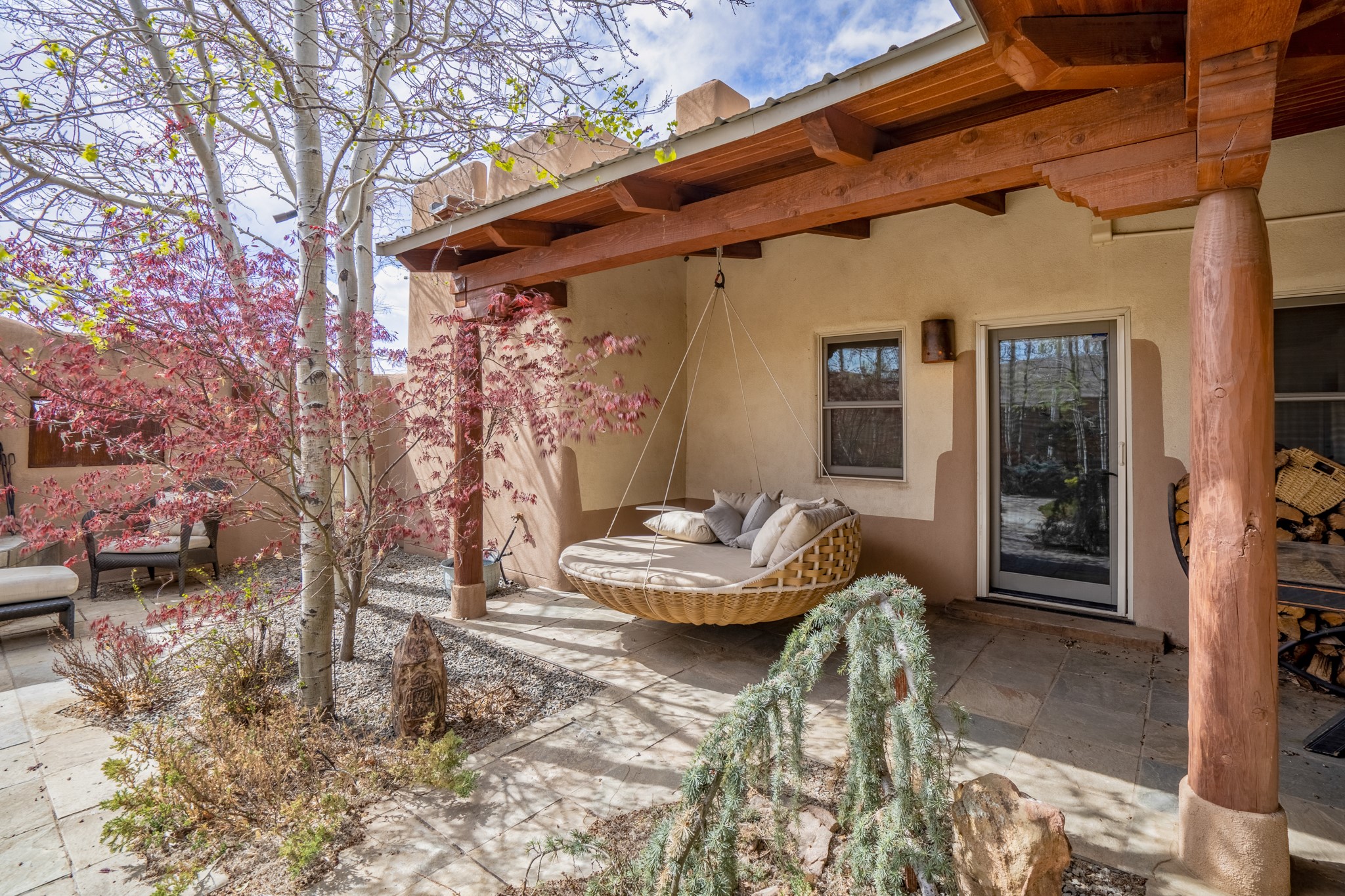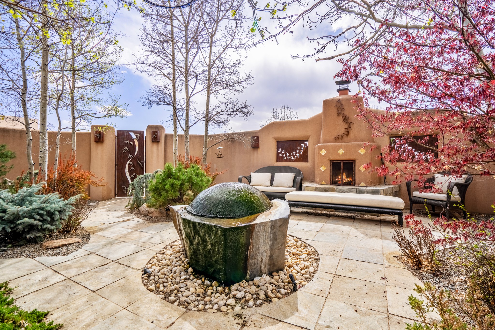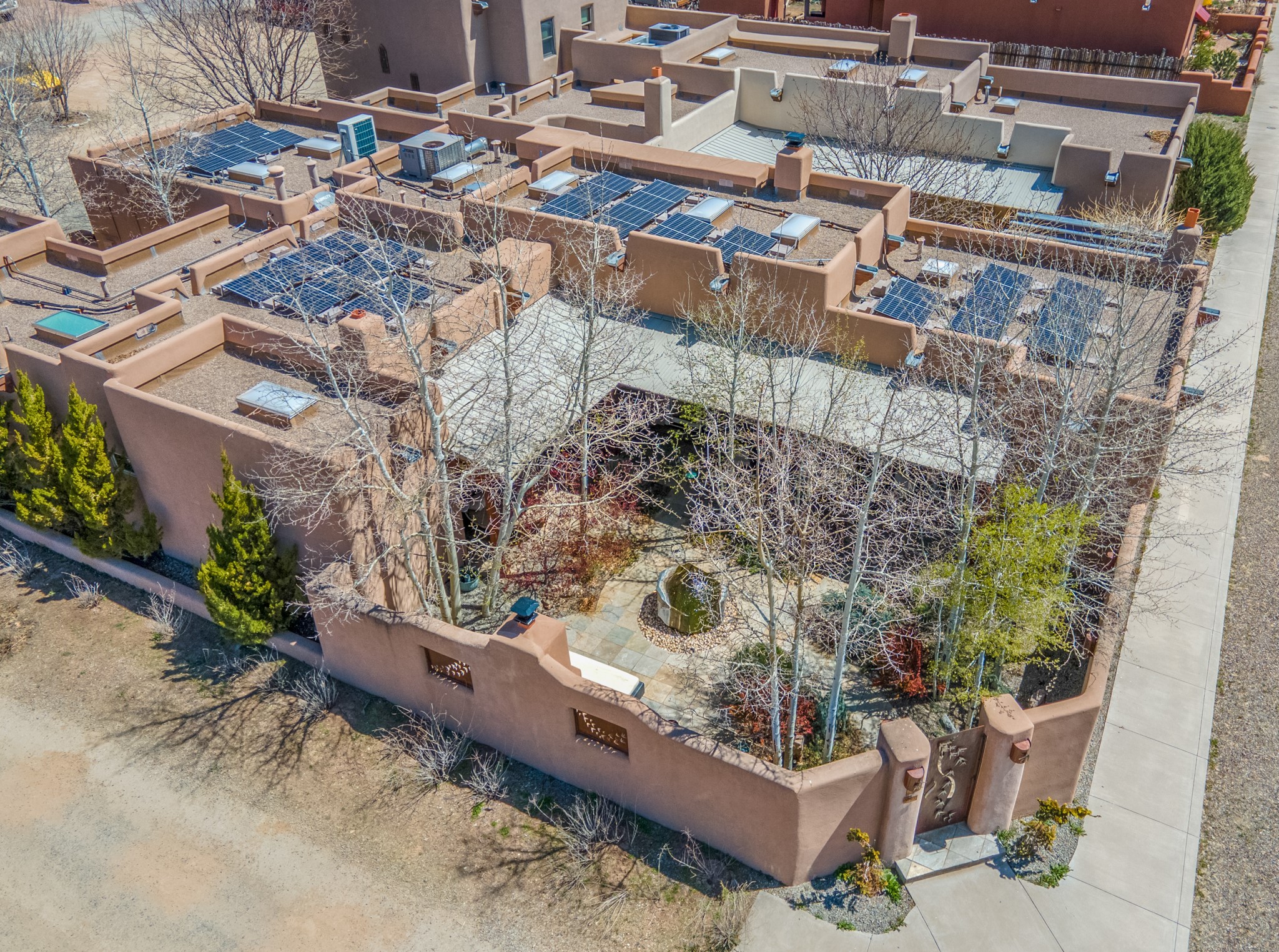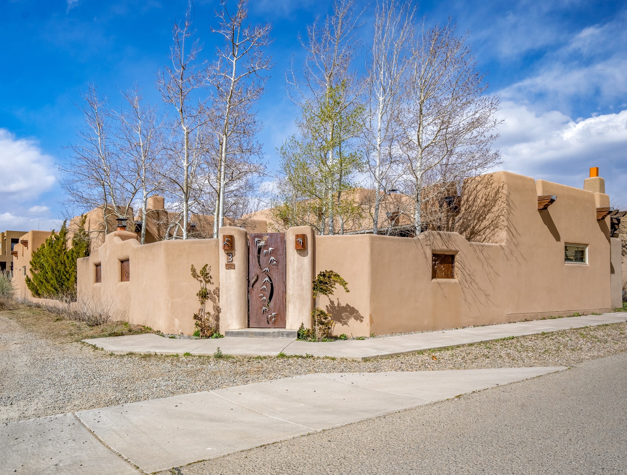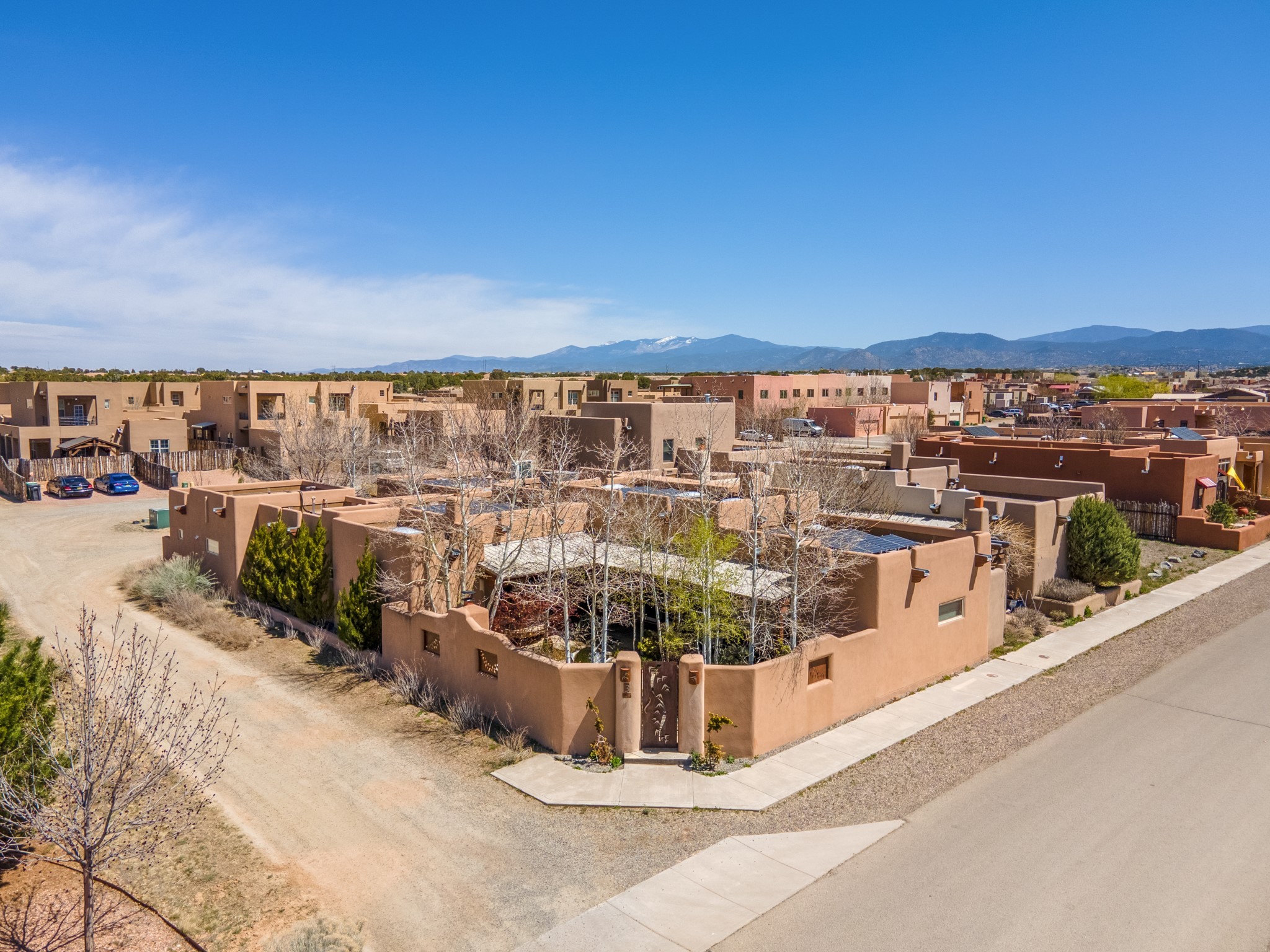 Designed by Joe Varnado this meticulously maintained (and significantly improved) home is a gem in the coveted Oshara Village. Abundant in light and comfort this home features over 2300 sqft of value with the main house's 2 bd 2 bath plus an attached studio/guesthouse with its own separate entrance. When you walk in you will notice the high ceilings bejeweled by skylights and its large traditional southwestern Vigas. Classic hacienda kitchen with abundant cabinetry, plenty storage and an ideal size pantry for the avid cook. Open concept living and dining with gallery quality lighting plus wood burning fireplace create an invitation to gather with loved ones. Hand chiseled solid wood doors, top of the line window shades, stone tile are found throughout this dream home. Enjoy the privacy of room separation from guests with the second bedroom having its own entrance via the courtyard. At the end of the day relax in your Jason Hydrotherapy tub in a spa-like master bathroom with a Japanese smart heated toilet. The walk-in closet is simply grand. The MiniSplit cooling and heating, tankless water heater, a $50K newly installed Solar Panel system, and 2 car garage newly refinished are just a few of the improvements here. Pristine landscaping with hand picked mature trees, 2 gorgeous water features, and outdoor fireplace create your own oasis in the desert. Did we mention the custom designed swallows iron gate? Two minutes and you are at Pantry Dos Restaurant, right on Oshara's main plaza (check out the fabulous Sunsets), and a few minutes drive to the Community College, Genoveva Chavez Center, stores, grocery stores, cafes, restaurants and much more. These photos are just the beginning! Schedule your private viewing of this pristine property, and fall in love with your new home.