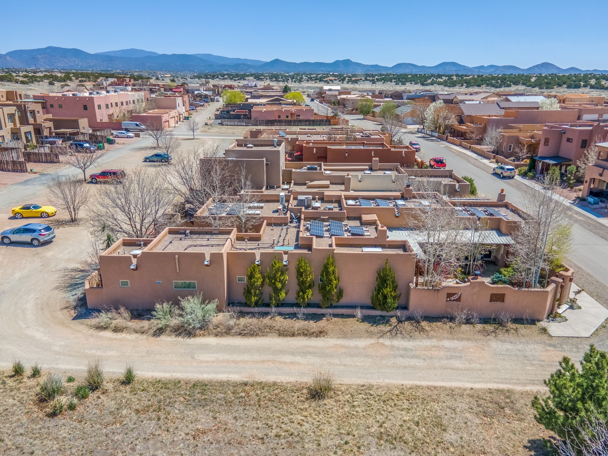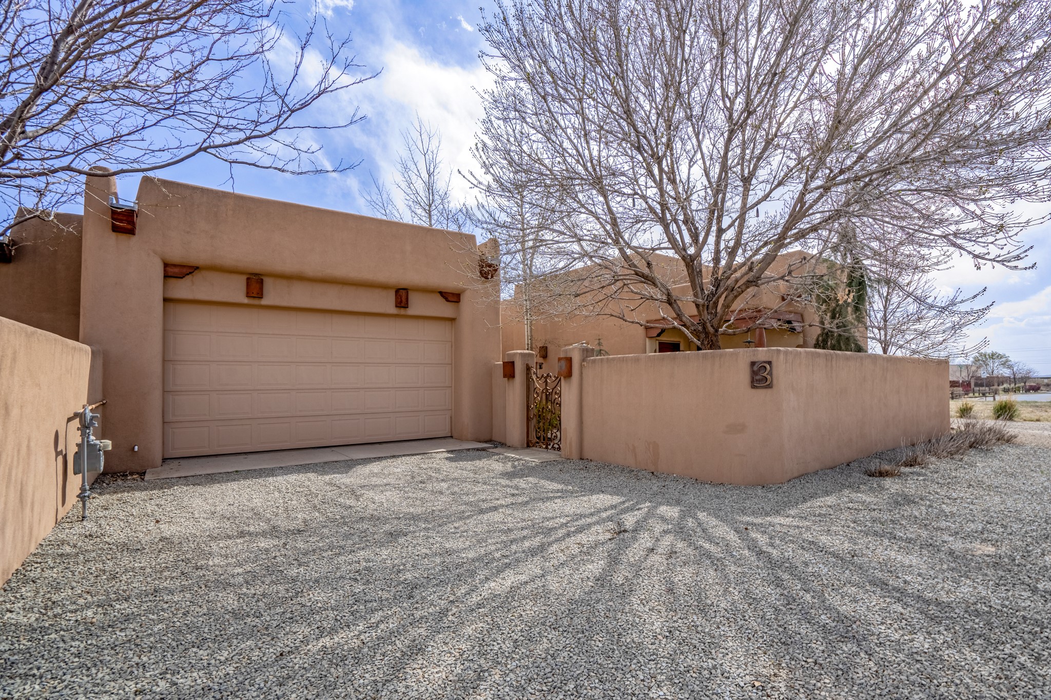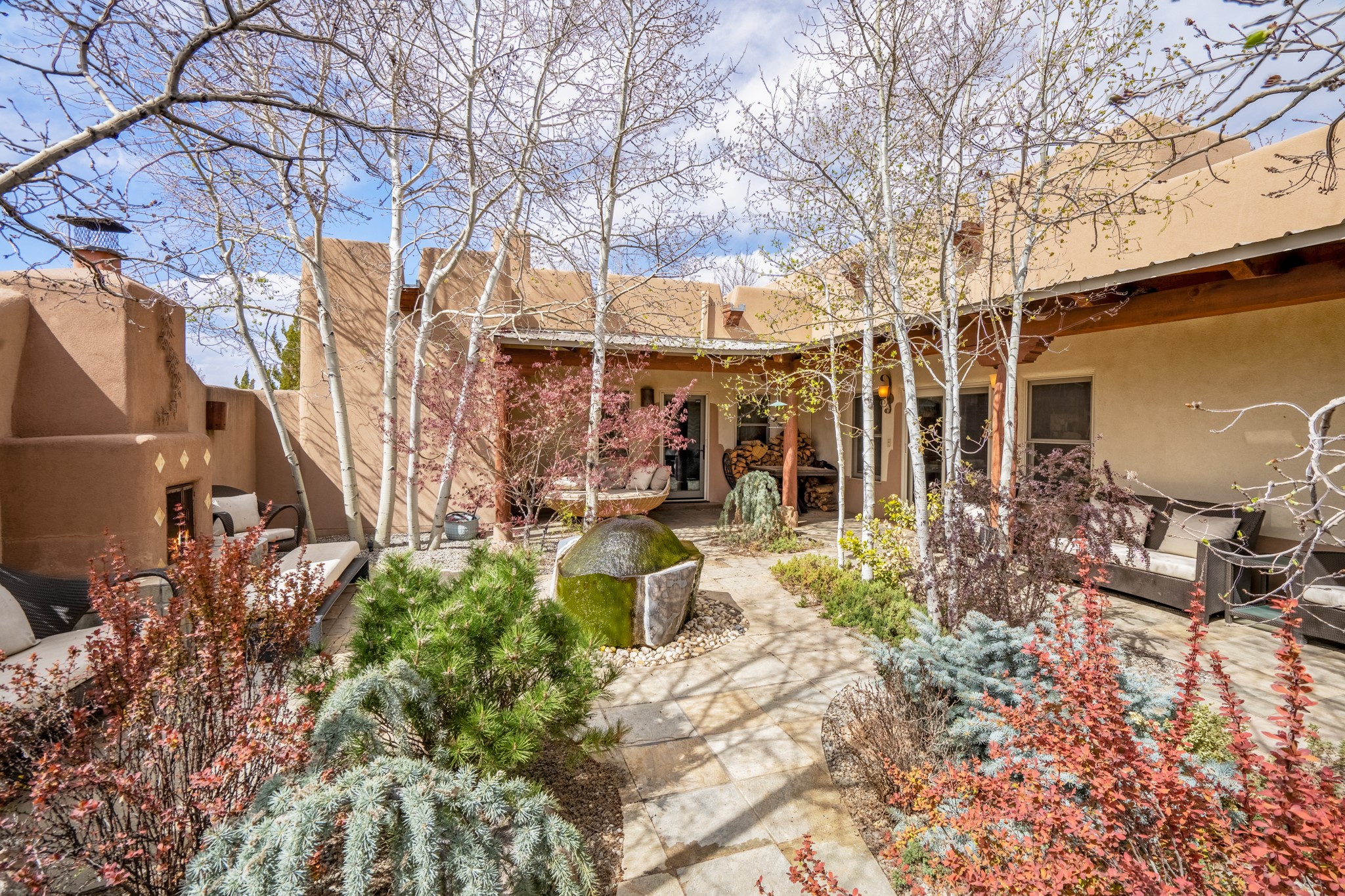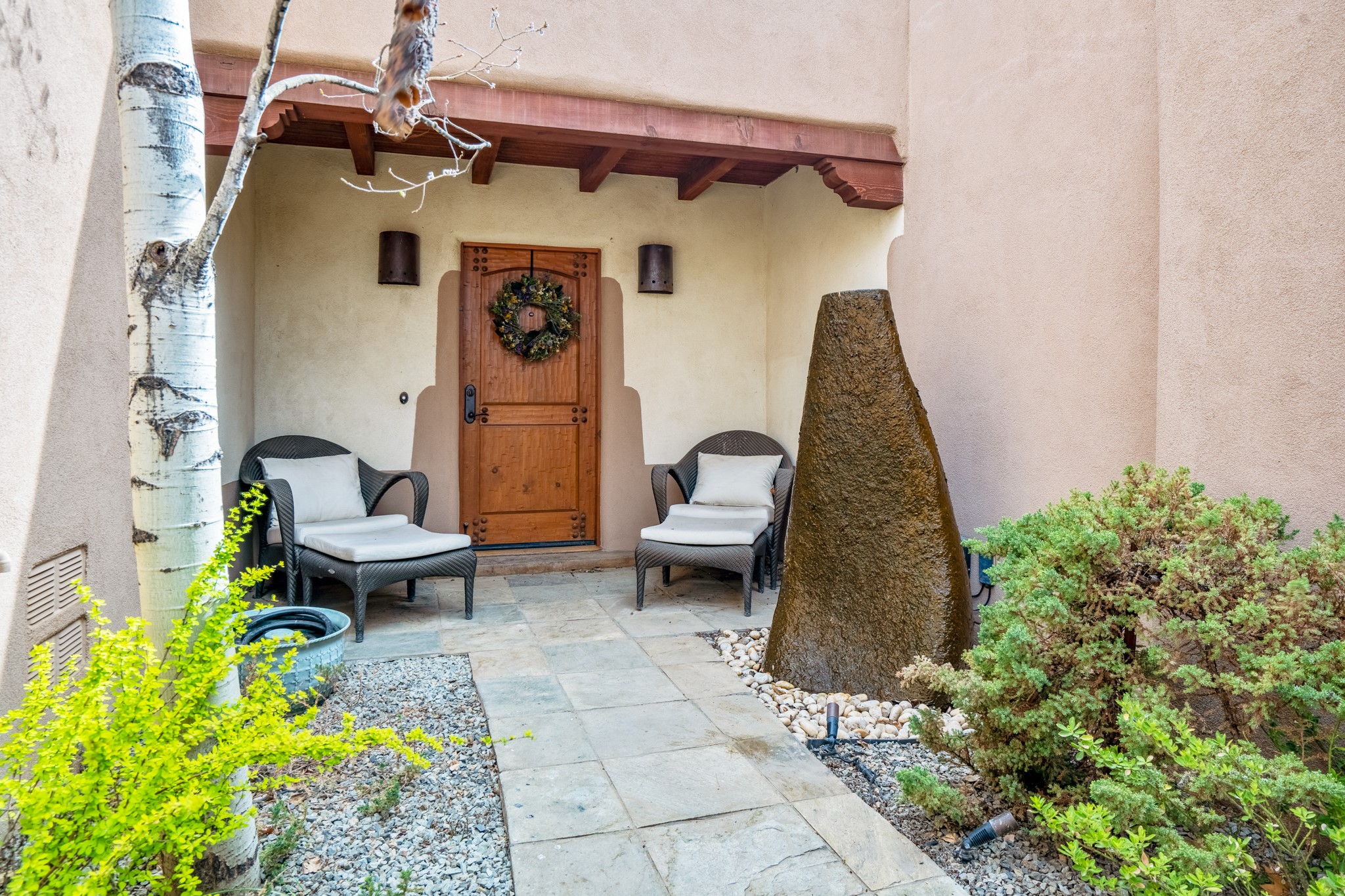 Designed by Joe Varnado this meticulously maintained (and significantly improved) home is a gem in the coveted Oshara Village. Abundant in light and comfort this home features over 2300 sqft of value with the main house's 2 bd 2 bath plus an attached studio/guesthouse with its own separate entrance. When you walk in you will notice the high ceilings bejeweled by skylights and its large traditional southwestern Vigas. Classic hacienda kitchen with abundant cabinetry, plenty storage and an ideal size pantry for the avid cook. Open concept living and dining with gallery quality lighting plus wood burning fireplace create an invitation to gather with loved ones. Hand chiseled solid wood doors, top of the line window shades, stone tile are found throughout this dream home. Enjoy the privacy of room separation from guests with the second bedroom having its own entrance via the courtyard. At the end of the day relax in your Jason Hydrotherapy tub in a spa-like master bathroom with a Japanese smart heated toilet. The walk-in closet is simply grand. The MiniSplit cooling and heating, tankless water heater, a $50K newly installed Solar Panel system, and 2 car garage newly refinished are just a few of the improvements here. Pristine landscaping with hand picked mature trees, 2 gorgeous water features, and outdoor fireplace create your own oasis in the desert. Did we mention the custom designed swallows iron gate? Two minutes and you are at Pantry Dos Restaurant, right on Oshara's main plaza (check out the fabulous Sunsets), and a few minutes drive to the Community College, Genoveva Chavez Center, stores, grocery stores, cafes, restaurants and much more. These photos are just the beginning! Schedule your private viewing of this pristine property, and fall in love with your new home.