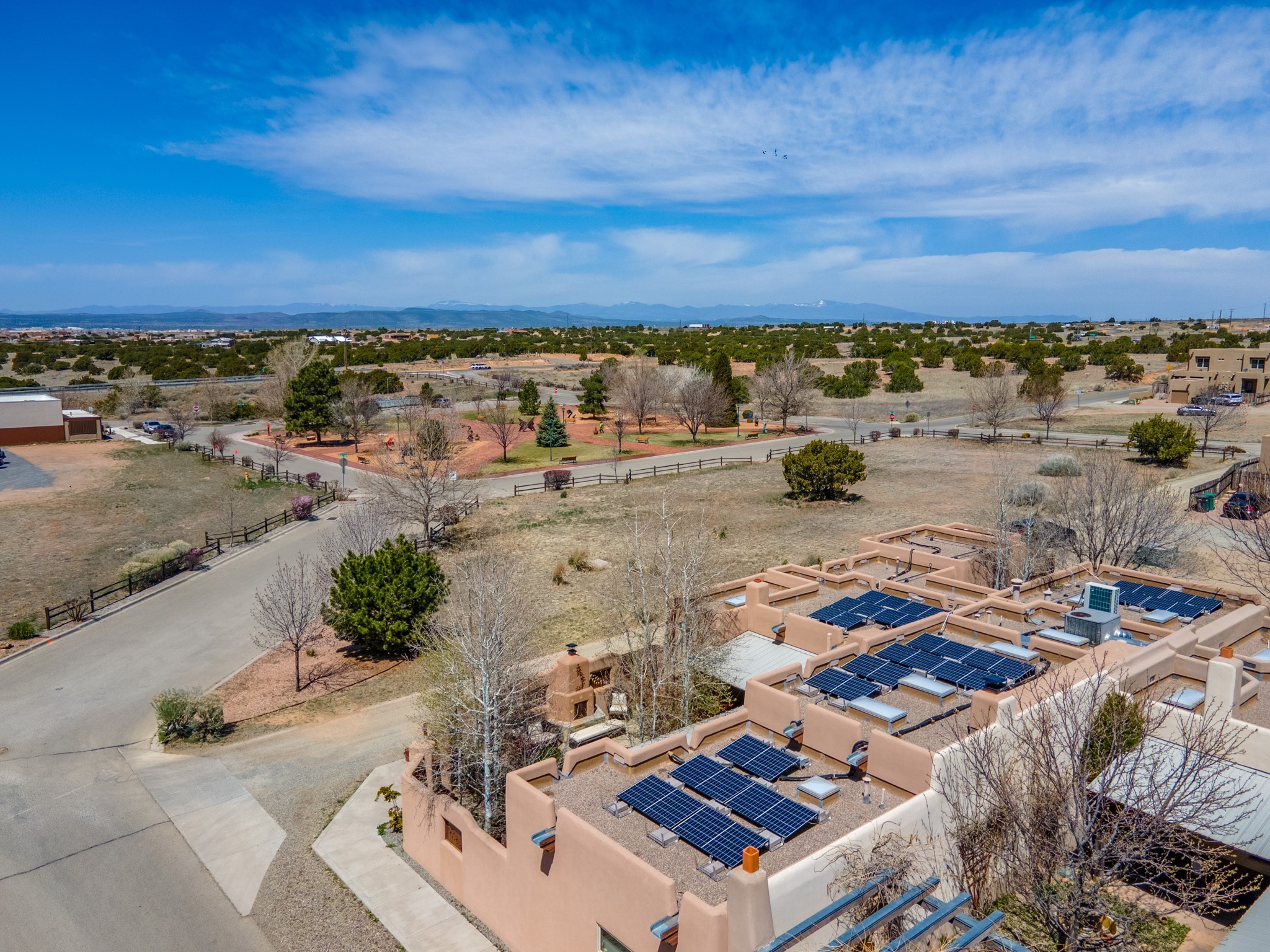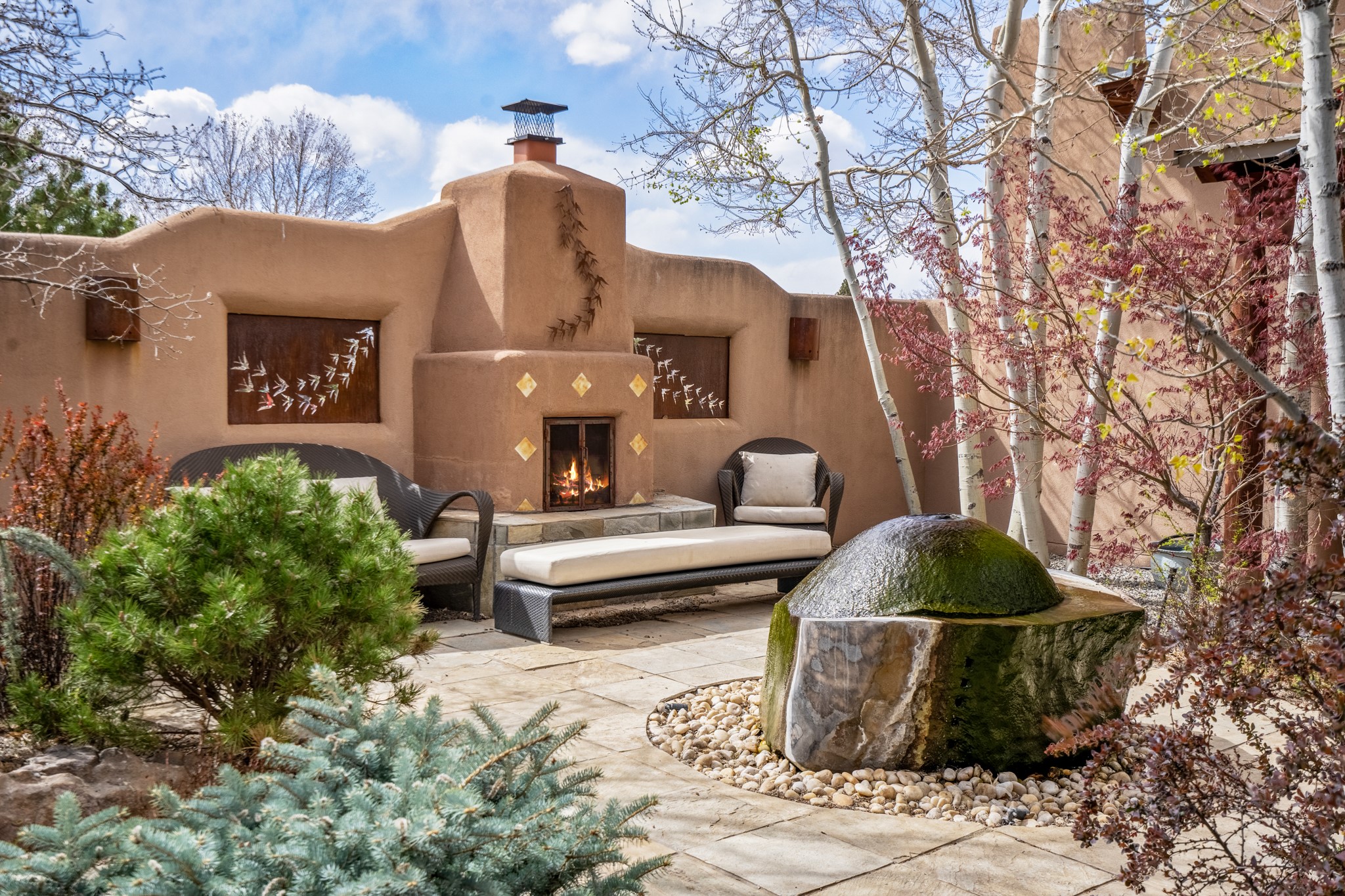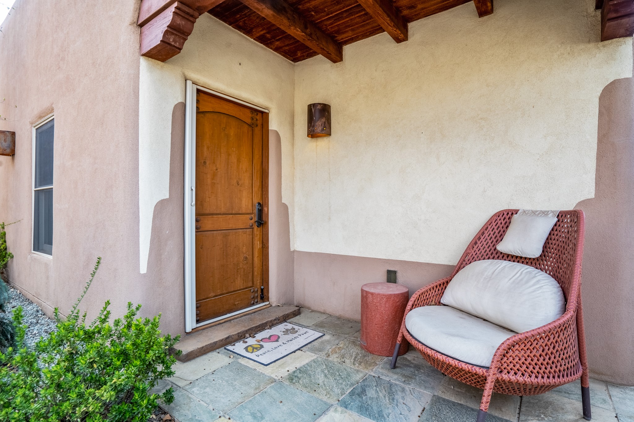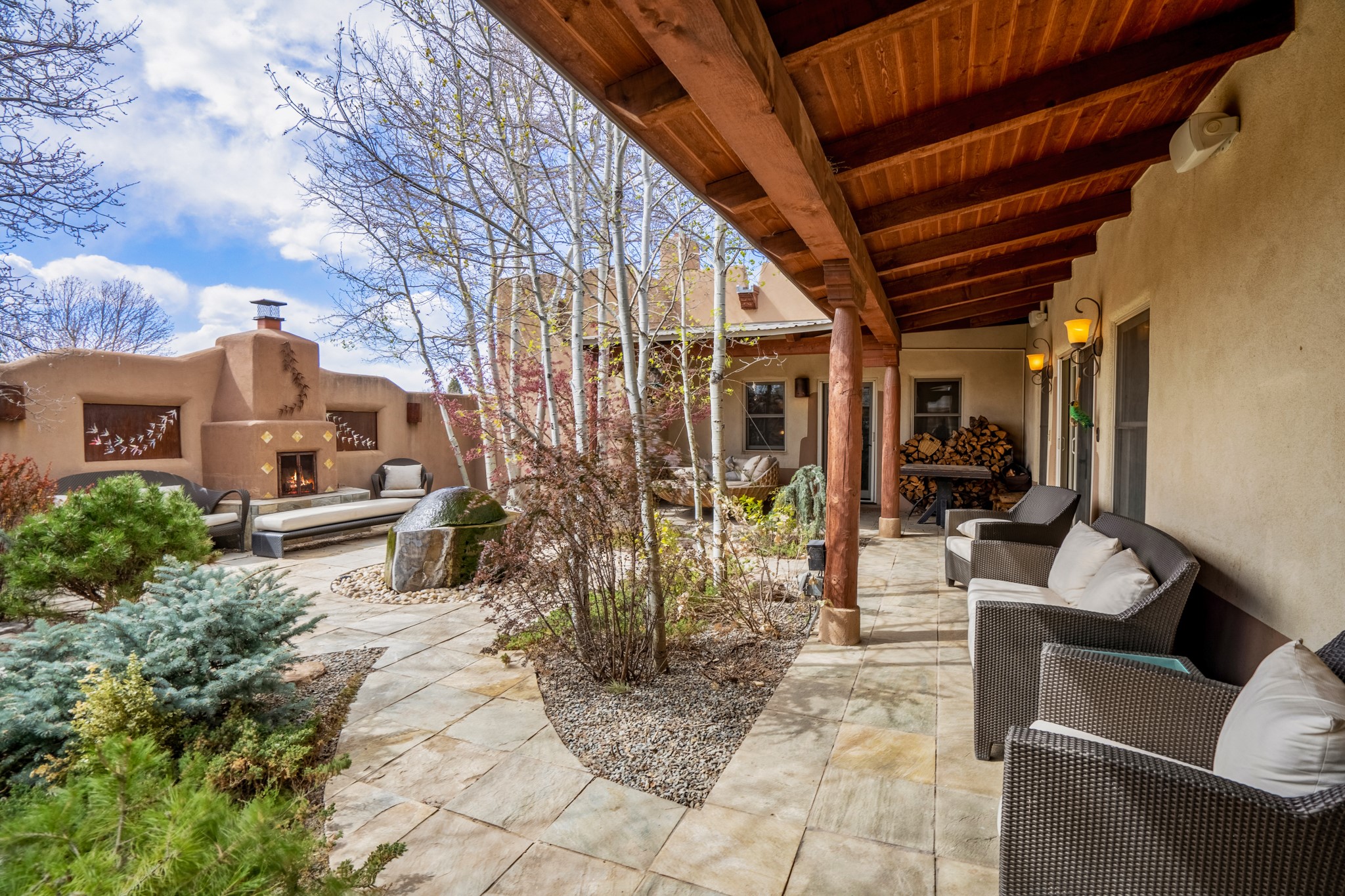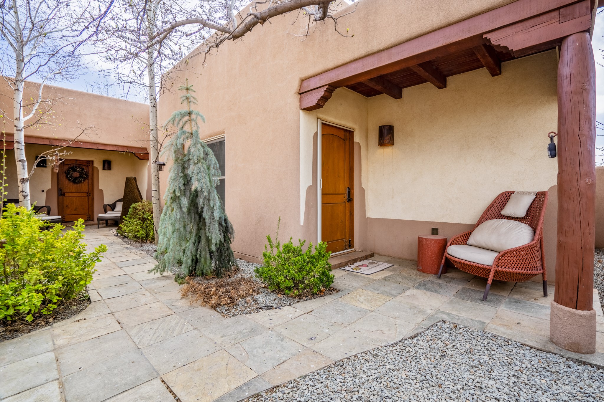 Designed by Joe Varnado this meticulously maintained (and significantly improved) home is a gem in the coveted Oshara Village. Abundant in light and comfort this home features over 2300 sqft of value with the main house's 2 bd 2 bath plus an attached studio/guesthouse with its own separate entrance. When you walk in you will notice the high ceilings bejeweled by skylights and its large traditional southwestern Vigas. Classic hacienda kitchen with abundant cabinetry, plenty storage and an ideal size pantry for the avid cook. Open concept living and dining with gallery quality lighting plus wood burning fireplace create an invitation to gather with loved ones. Hand chiseled solid wood doors, top of the line window shades, stone tile are found throughout this dream home. Enjoy the privacy of room separation from guests with the second bedroom having its own entrance via the courtyard. At the end of the day relax in your Jason Hydrotherapy tub in a spa-like master bathroom with a Japanese smart heated toilet. The walk-in closet is simply grand. The MiniSplit cooling and heating, tankless water heater, a $50K newly installed Solar Panel system, and 2 car garage newly refinished are just a few of the improvements here. Pristine landscaping with hand picked mature trees, 2 gorgeous water features, and outdoor fireplace create your own oasis in the desert. Did we mention the custom designed swallows iron gate? Two minutes and you are at Pantry Dos Restaurant, right on Oshara's main plaza (check out the fabulous Sunsets), and a few minutes drive to the Community College, Genoveva Chavez Center, stores, grocery stores, cafes, restaurants and much more. These photos are just the beginning! Schedule your private viewing of this pristine property, and fall in love with your new home.