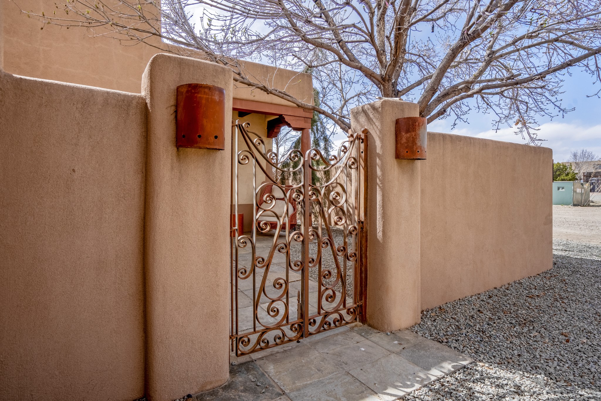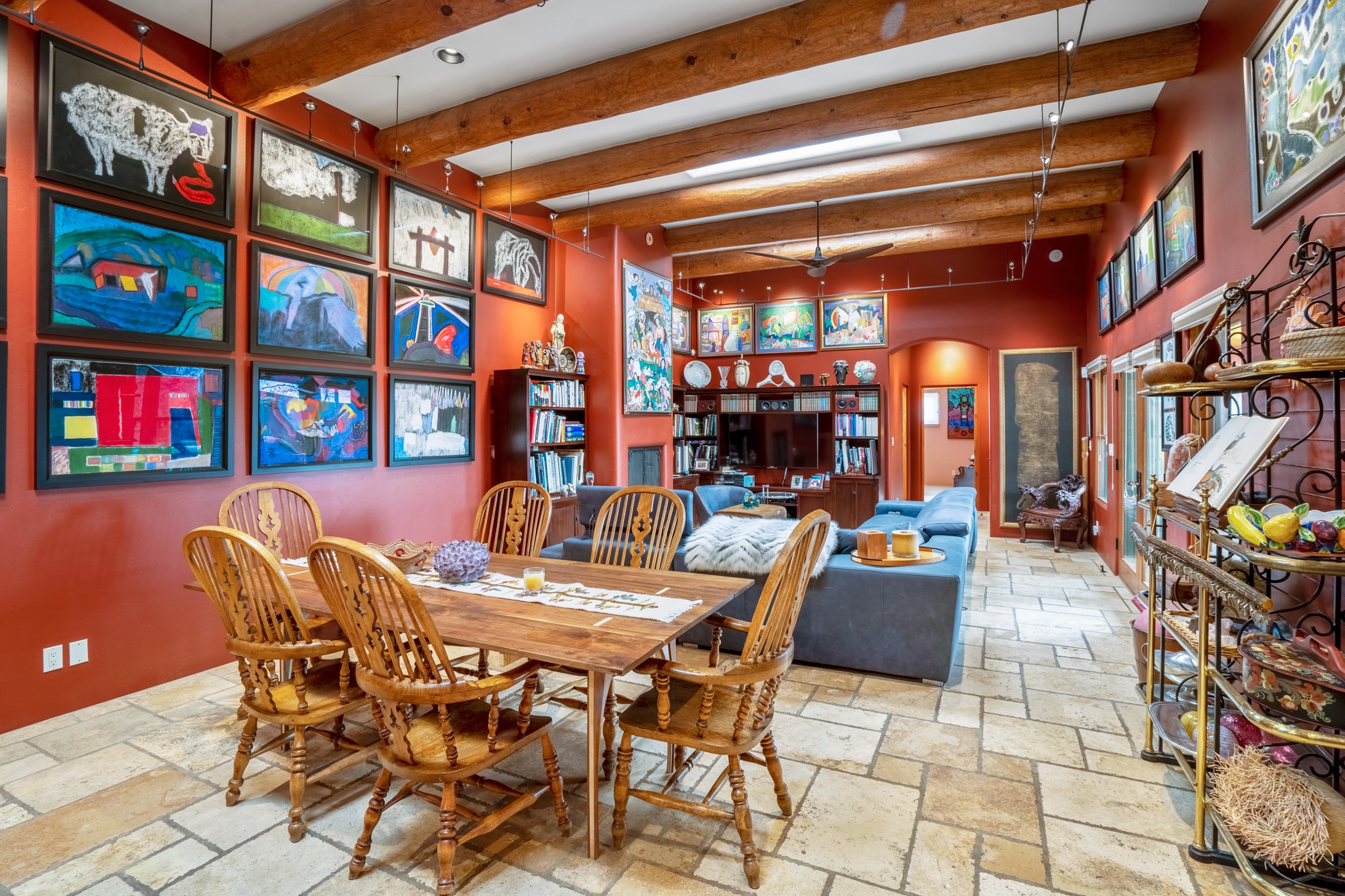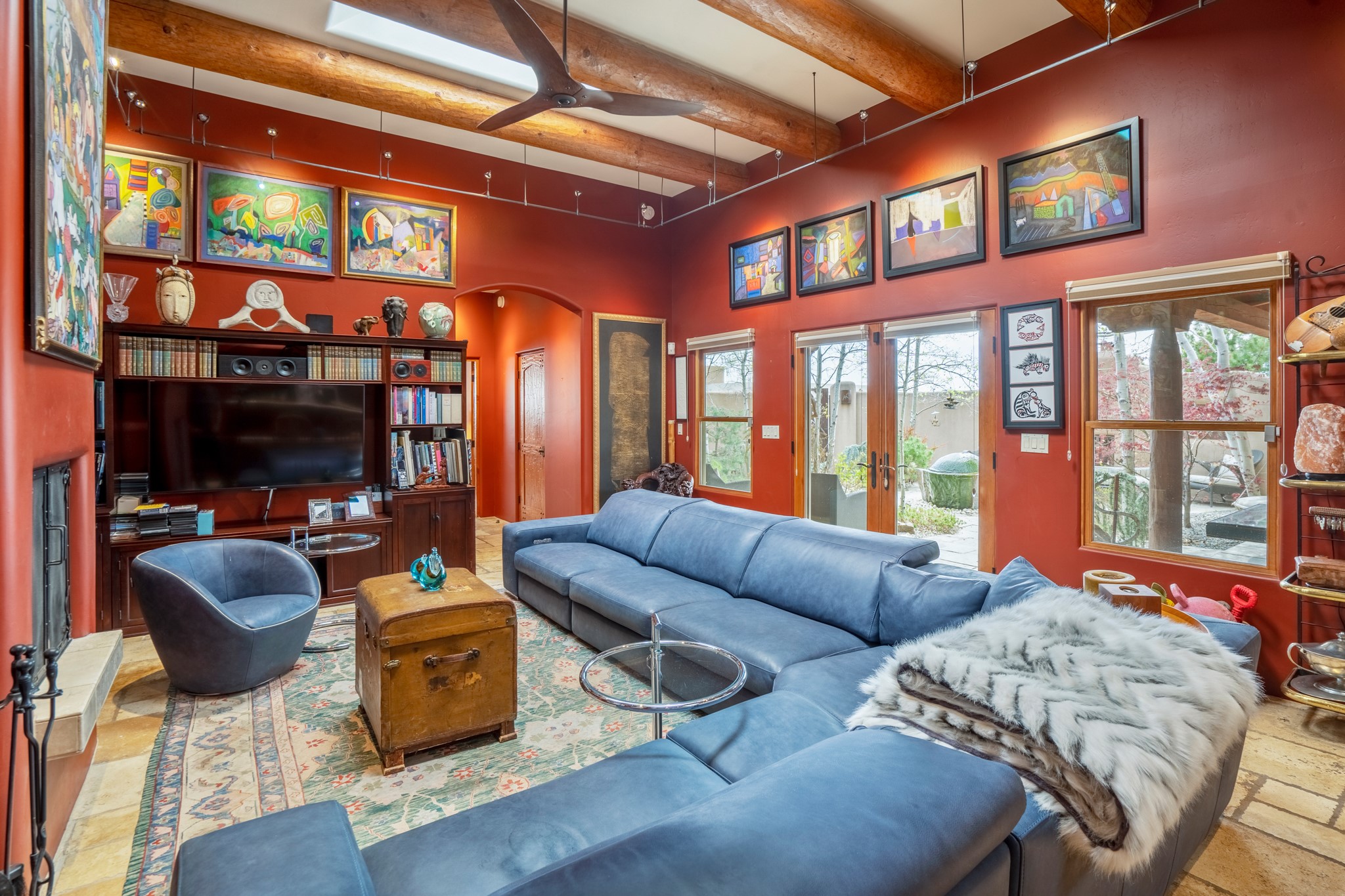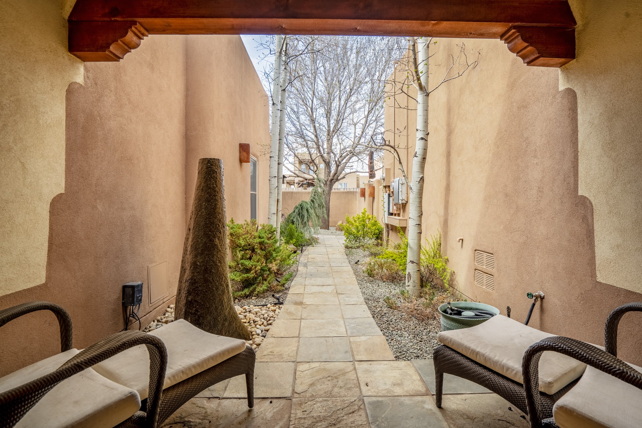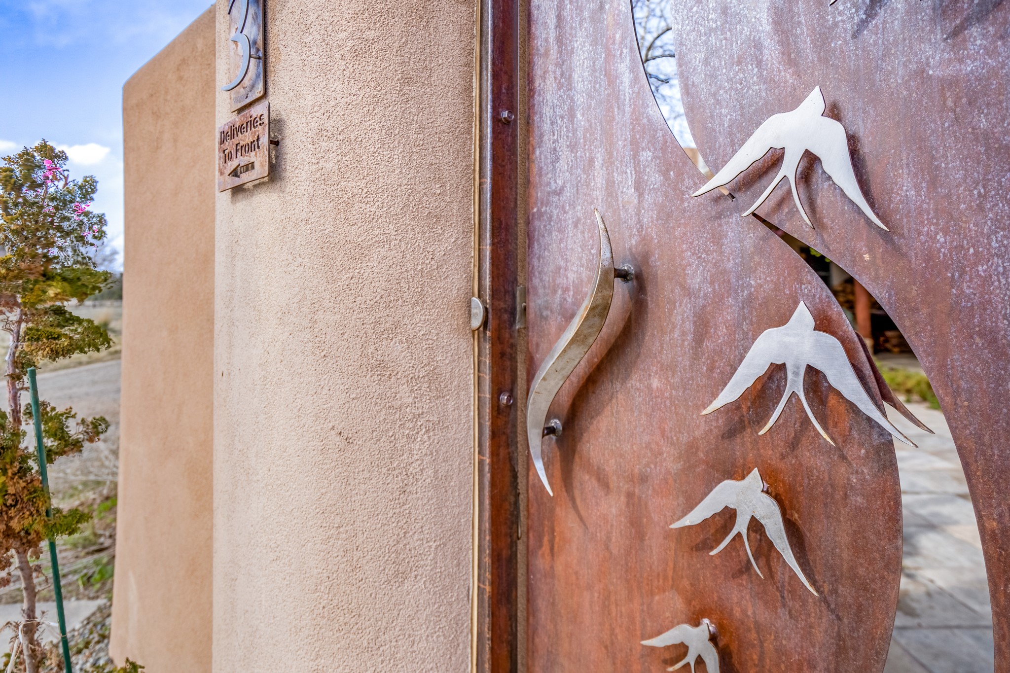 Designed by Joe Varnado this meticulously maintained (and significantly improved) home is a gem in the coveted Oshara Village. Abundant in light and comfort this home features over 2300 sqft of value with the main house's 2 bd 2 bath plus an attached studio/guesthouse with its own separate entrance. When you walk in you will notice the high ceilings bejeweled by skylights and its large traditional southwestern Vigas. Classic hacienda kitchen with abundant cabinetry, plenty storage and an ideal size pantry for the avid cook. Open concept living and dining with gallery quality lighting plus wood burning fireplace create an invitation to gather with loved ones. Hand chiseled solid wood doors, top of the line window shades, stone tile are found throughout this dream home. Enjoy the privacy of room separation from guests with the second bedroom having its own entrance via the courtyard. At the end of the day relax in your Jason Hydrotherapy tub in a spa-like master bathroom with a Japanese smart heated toilet. The walk-in closet is simply grand. The MiniSplit cooling and heating, tankless water heater, a $50K newly installed Solar Panel system, and 2 car garage newly refinished are just a few of the improvements here. Pristine landscaping with hand picked mature trees, 2 gorgeous water features, and outdoor fireplace create your own oasis in the desert. Did we mention the custom designed swallows iron gate? Two minutes and you are at Pantry Dos Restaurant, right on Oshara's main plaza (check out the fabulous Sunsets), and a few minutes drive to the Community College, Genoveva Chavez Center, stores, grocery stores, cafes, restaurants and much more. These photos are just the beginning! Schedule your private viewing of this pristine property, and fall in love with your new home.