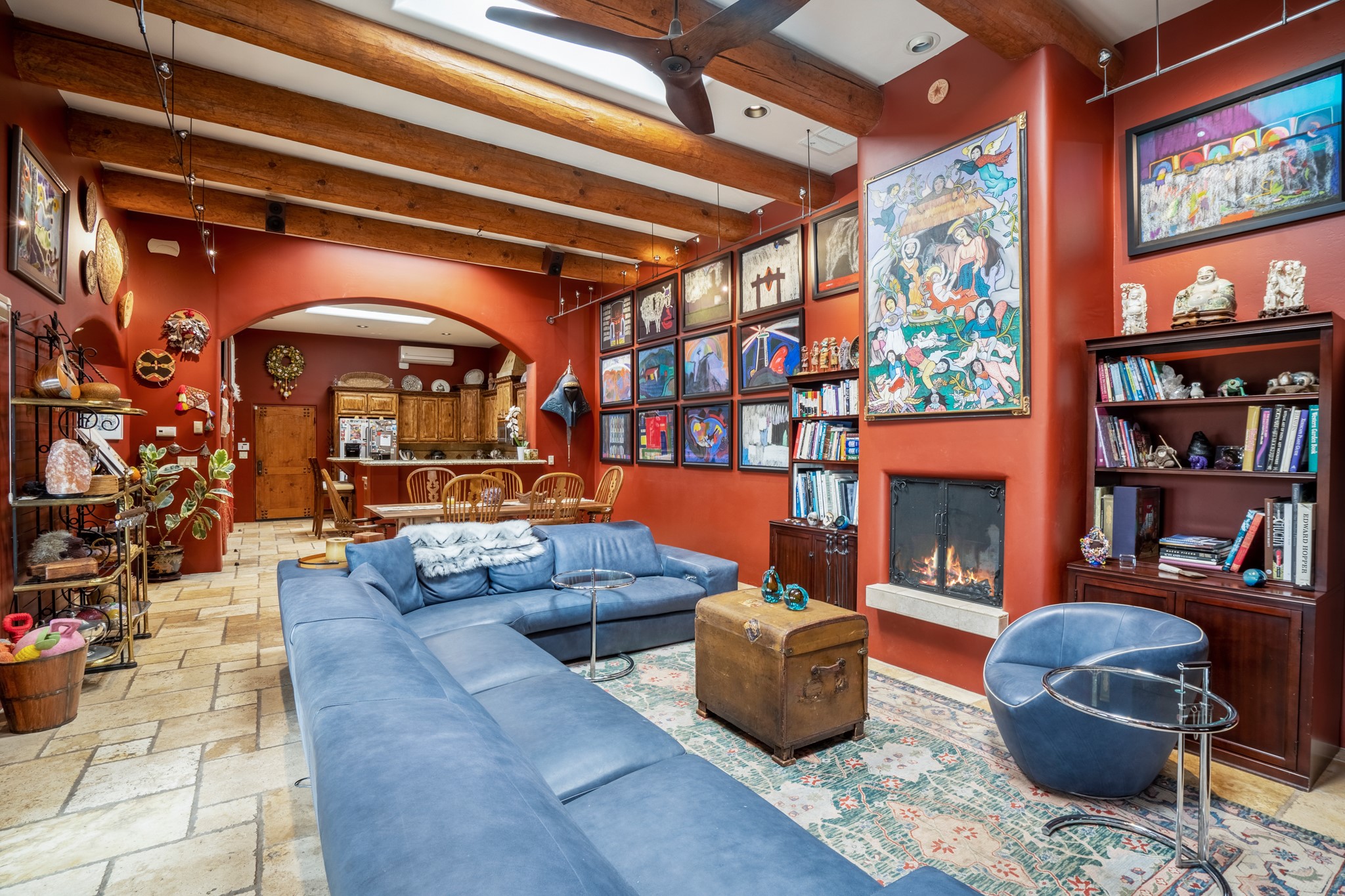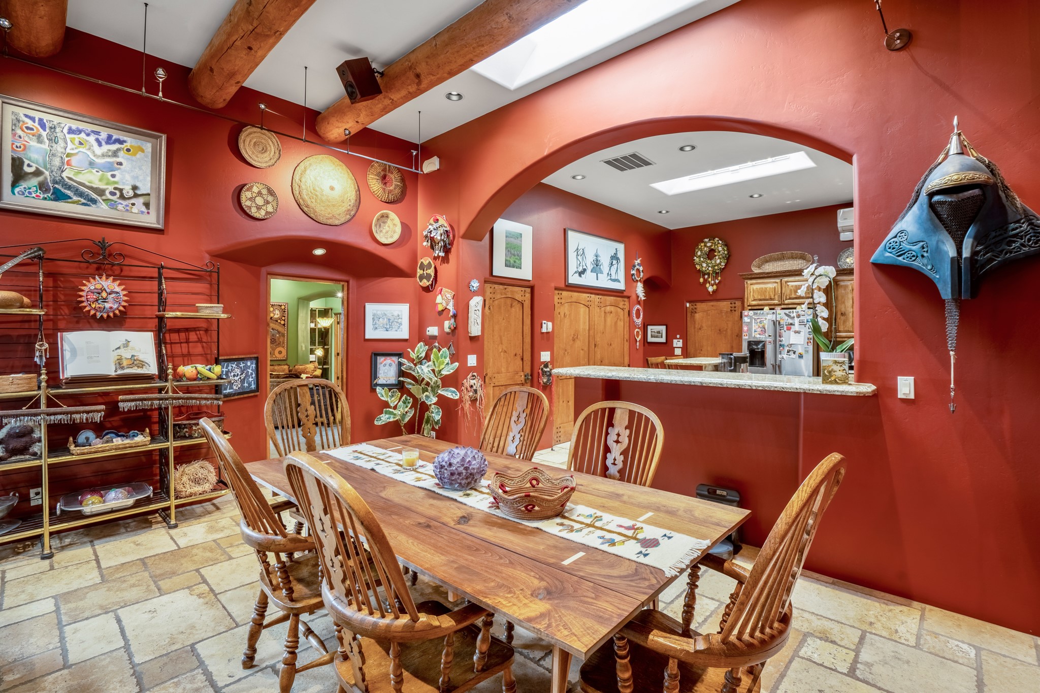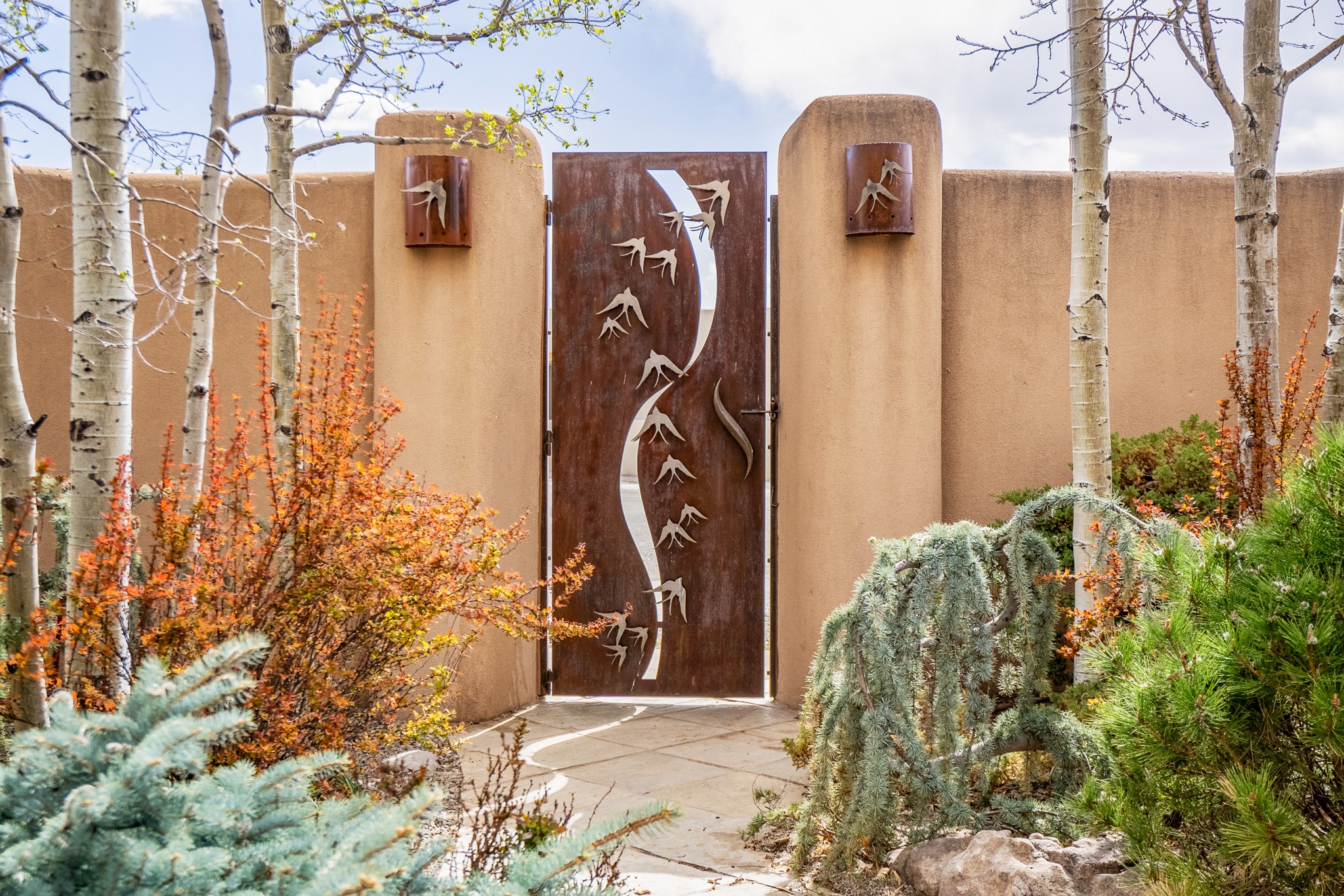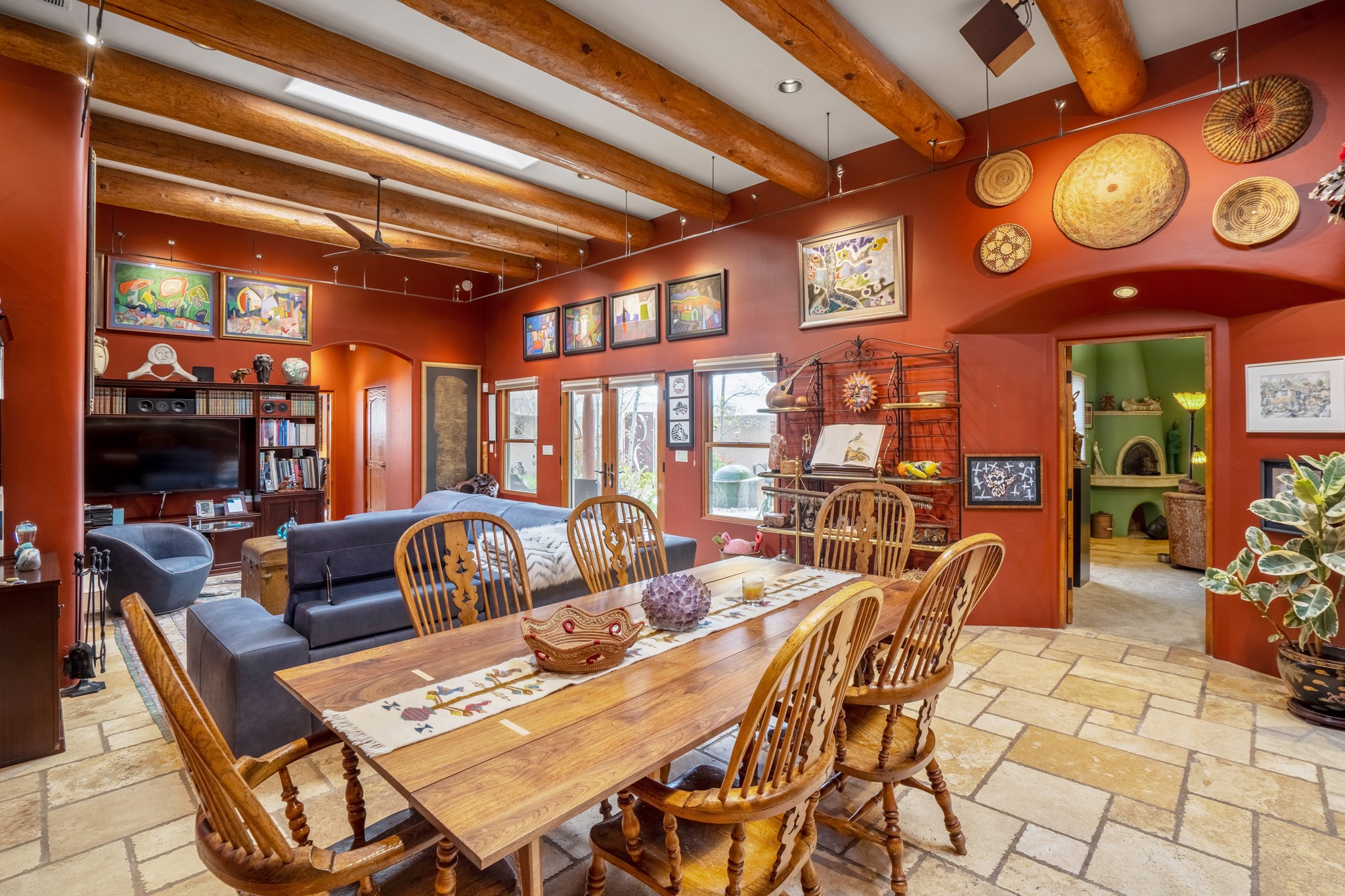 Designed by Joe Varnado this meticulously maintained (and significantly improved) home is a gem in the coveted Oshara Village. Abundant in light and comfort this home features over 2300 sqft of value with the main house's 2 bd 2 bath plus an attached studio/guesthouse with its own separate entrance. When you walk in you will notice the high ceilings bejeweled by skylights and its large traditional southwestern Vigas. Classic hacienda kitchen with abundant cabinetry, plenty storage and an ideal size pantry for the avid cook. Open concept living and dining with gallery quality lighting plus wood burning fireplace create an invitation to gather with loved ones. Hand chiseled solid wood doors, top of the line window shades, stone tile are found throughout this dream home. Enjoy the privacy of room separation from guests with the second bedroom having its own entrance via the courtyard. At the end of the day relax in your Jason Hydrotherapy tub in a spa-like master bathroom with a Japanese smart heated toilet. The walk-in closet is simply grand. The MiniSplit cooling and heating, tankless water heater, a $50K newly installed Solar Panel system, and 2 car garage newly refinished are just a few of the improvements here. Pristine landscaping with hand picked mature trees, 2 gorgeous water features, and outdoor fireplace create your own oasis in the desert. Did we mention the custom designed swallows iron gate? Two minutes and you are at Pantry Dos Restaurant, right on Oshara's main plaza (check out the fabulous Sunsets), and a few minutes drive to the Community College, Genoveva Chavez Center, stores, grocery stores, cafes, restaurants and much more. These photos are just the beginning! Schedule your private viewing of this pristine property, and fall in love with your new home.