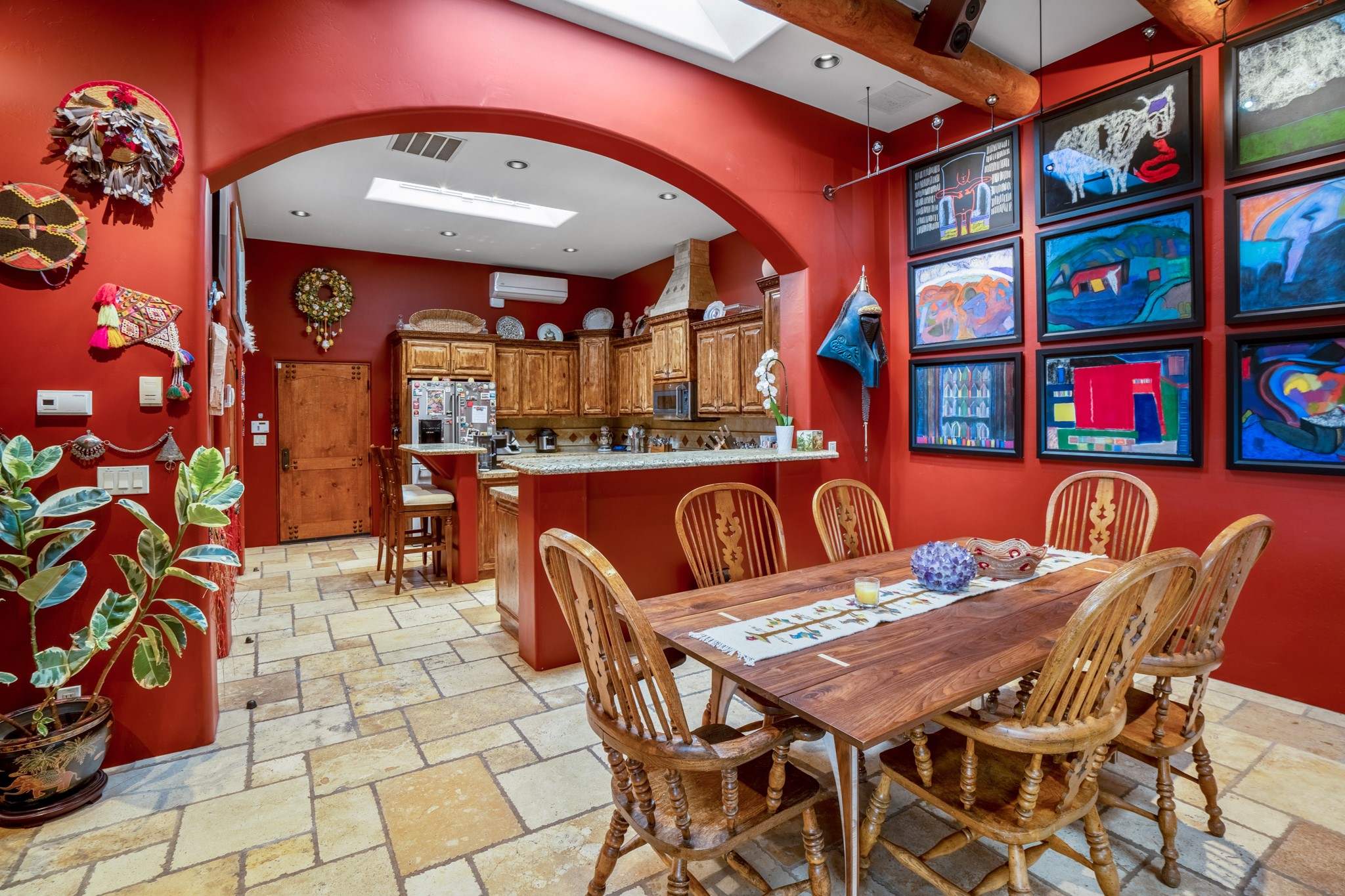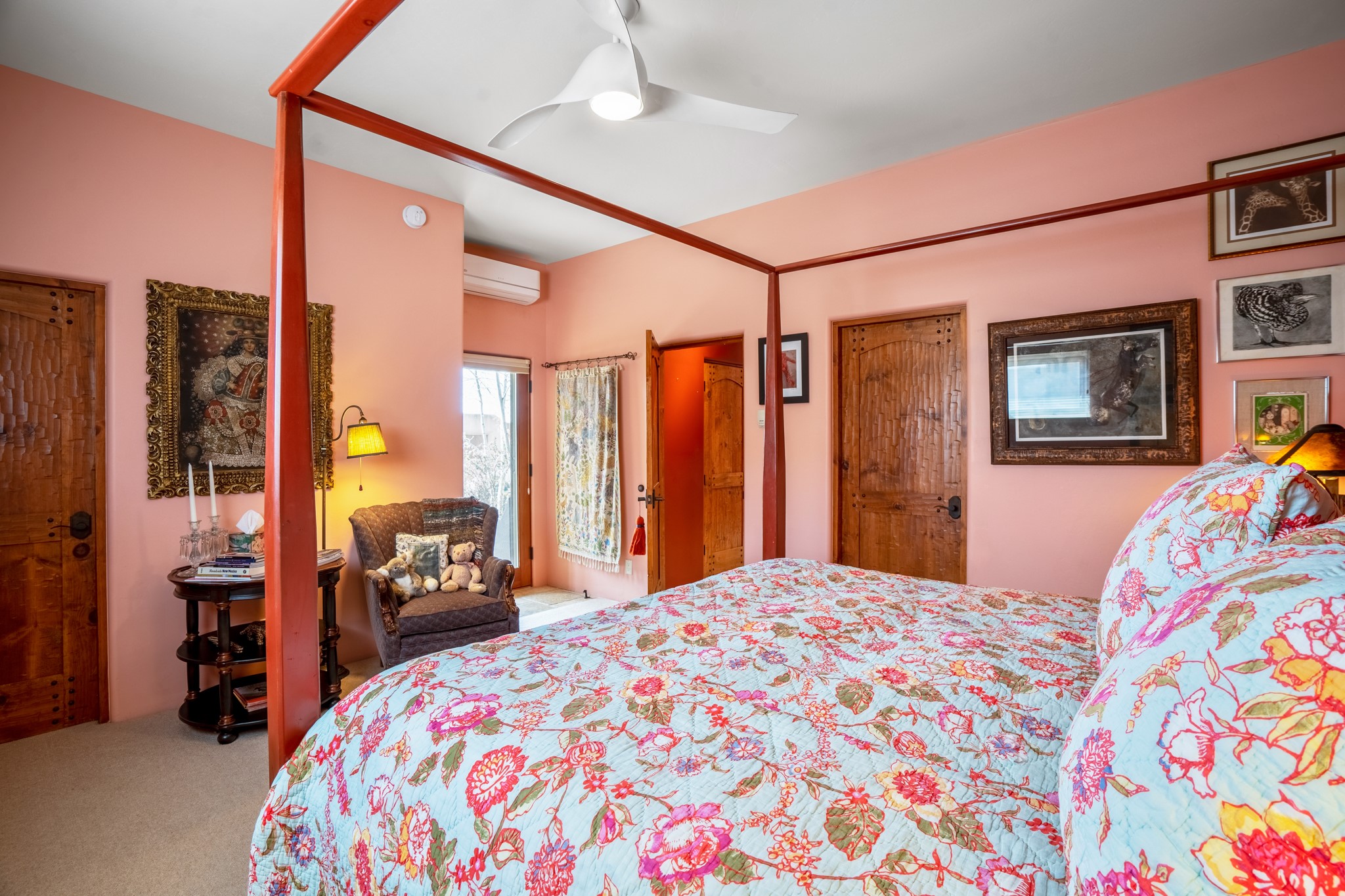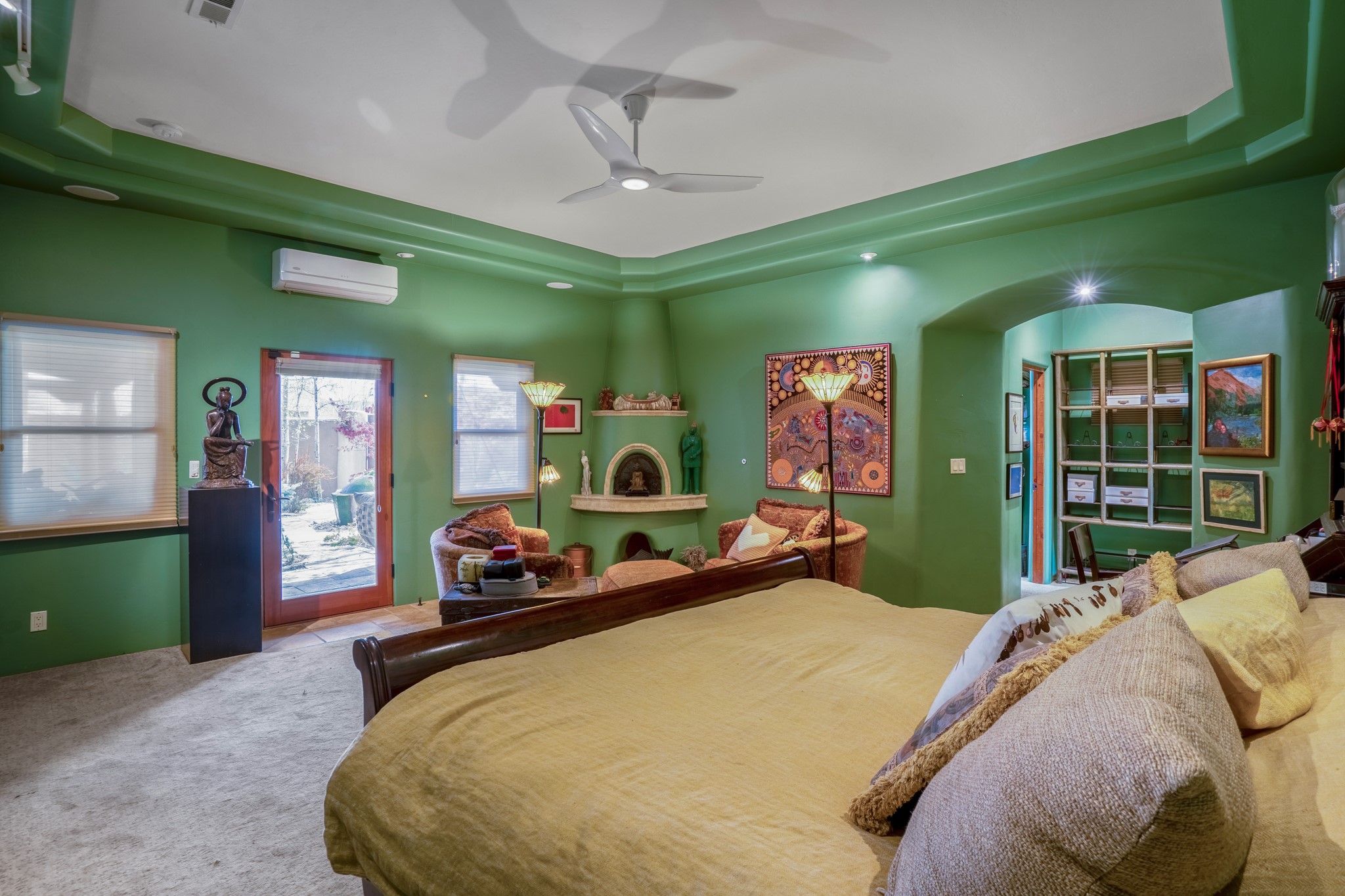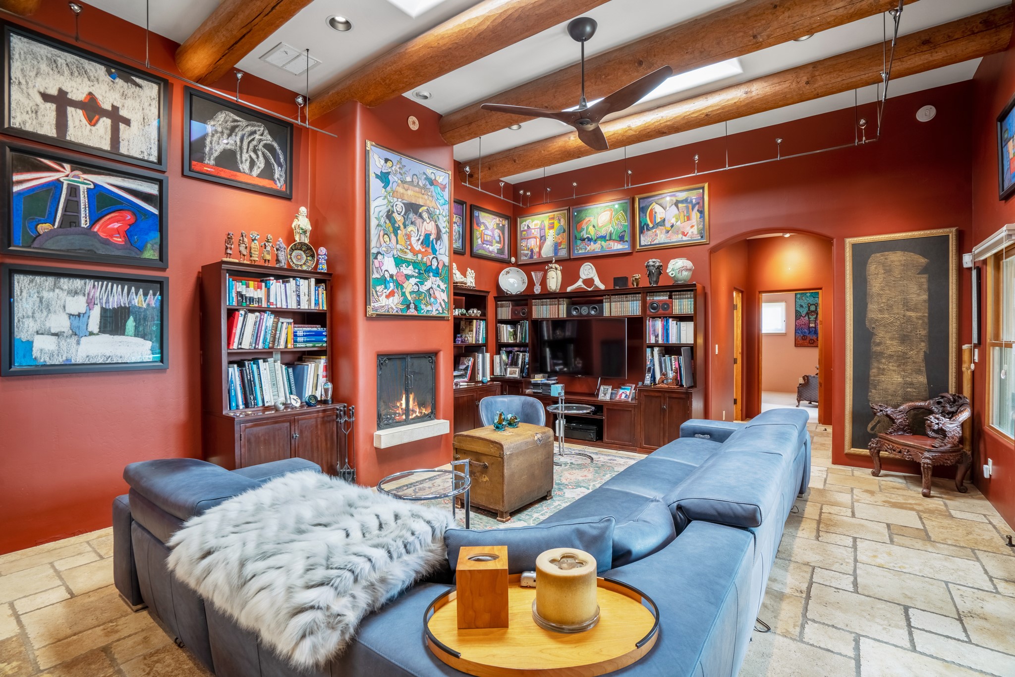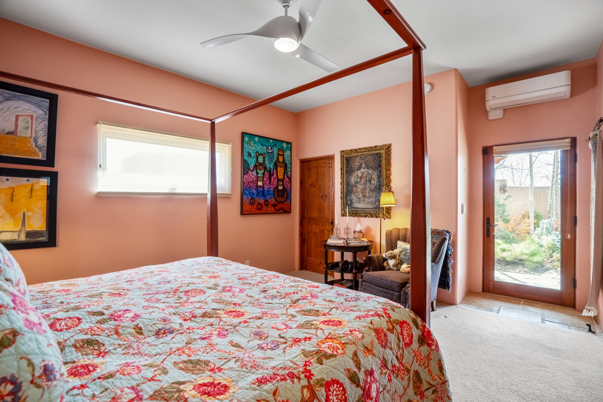 Designed by Joe Varnado this meticulously maintained (and significantly improved) home is a gem in the coveted Oshara Village. Abundant in light and comfort this home features over 2300 sqft of value with the main house's 2 bd 2 bath plus an attached studio/guesthouse with its own separate entrance. When you walk in you will notice the high ceilings bejeweled by skylights and its large traditional southwestern Vigas. Classic hacienda kitchen with abundant cabinetry, plenty storage and an ideal size pantry for the avid cook. Open concept living and dining with gallery quality lighting plus wood burning fireplace create an invitation to gather with loved ones. Hand chiseled solid wood doors, top of the line window shades, stone tile are found throughout this dream home. Enjoy the privacy of room separation from guests with the second bedroom having its own entrance via the courtyard. At the end of the day relax in your Jason Hydrotherapy tub in a spa-like master bathroom with a Japanese smart heated toilet. The walk-in closet is simply grand. The MiniSplit cooling and heating, tankless water heater, a $50K newly installed Solar Panel system, and 2 car garage newly refinished are just a few of the improvements here. Pristine landscaping with hand picked mature trees, 2 gorgeous water features, and outdoor fireplace create your own oasis in the desert. Did we mention the custom designed swallows iron gate? Two minutes and you are at Pantry Dos Restaurant, right on Oshara's main plaza (check out the fabulous Sunsets), and a few minutes drive to the Community College, Genoveva Chavez Center, stores, grocery stores, cafes, restaurants and much more. These photos are just the beginning! Schedule your private viewing of this pristine property, and fall in love with your new home.