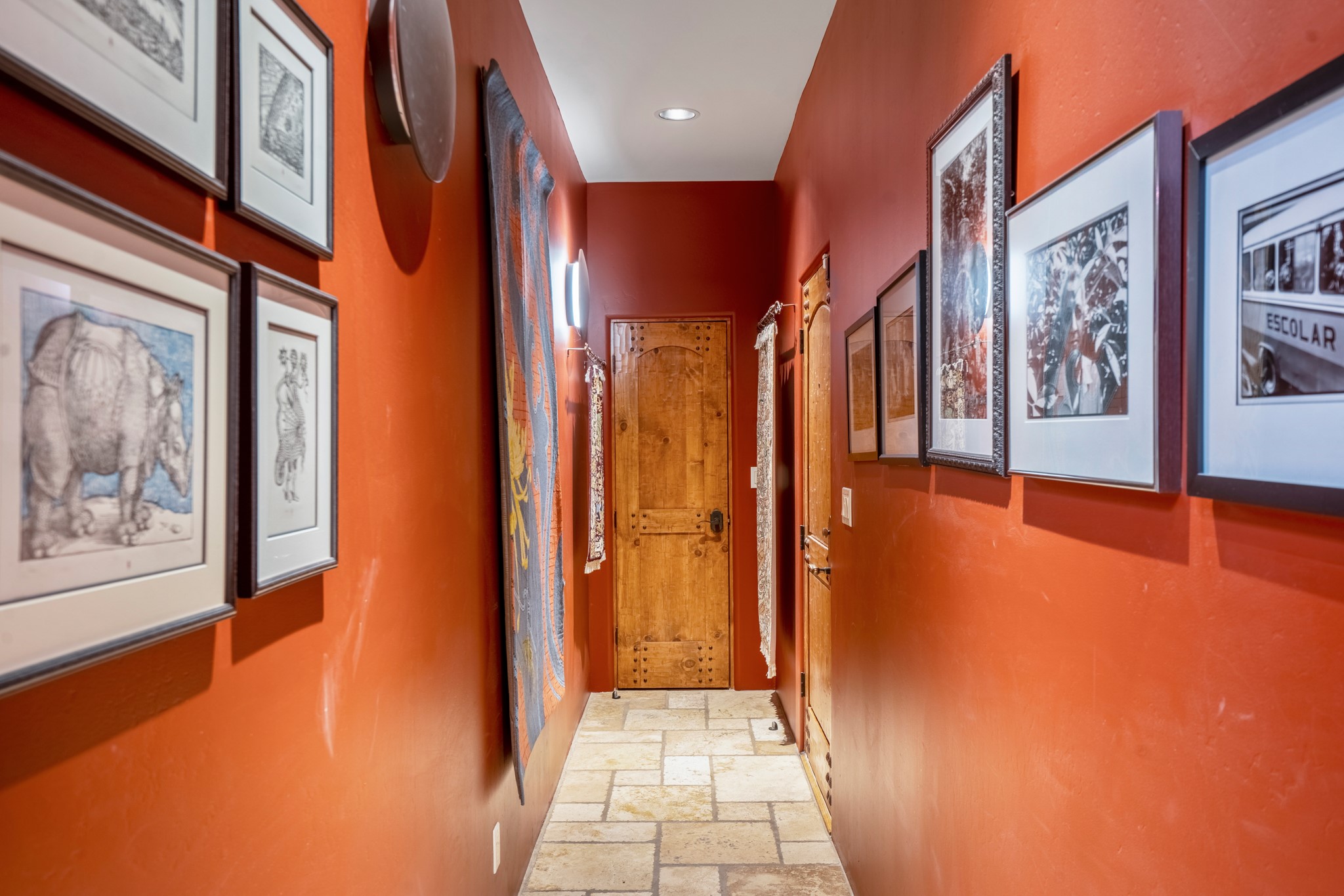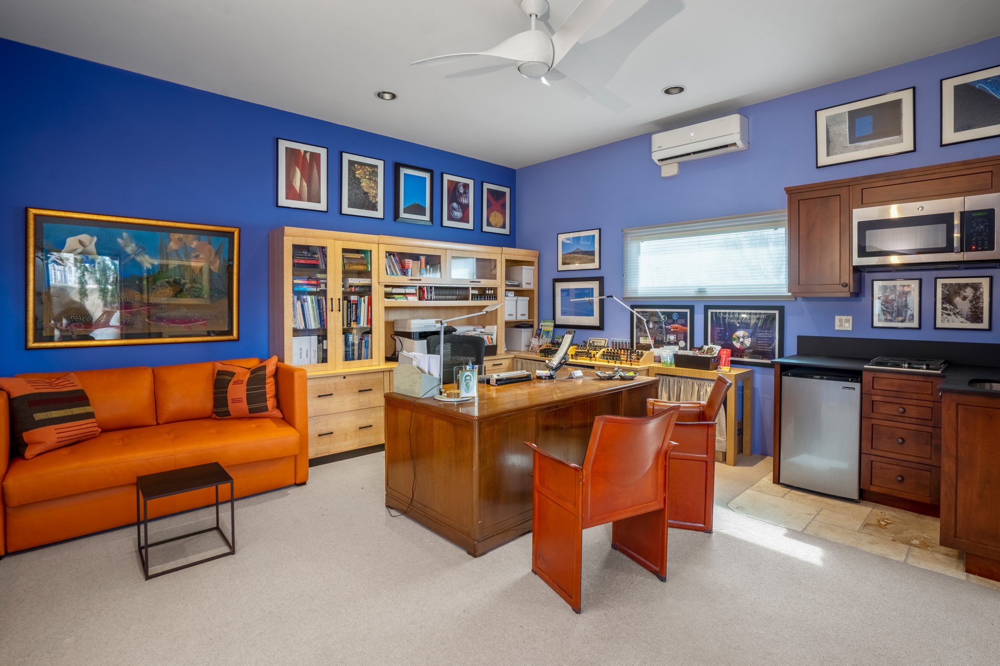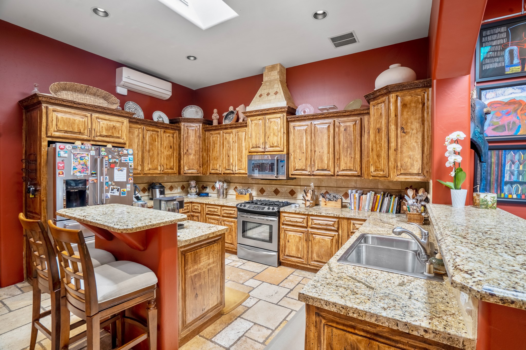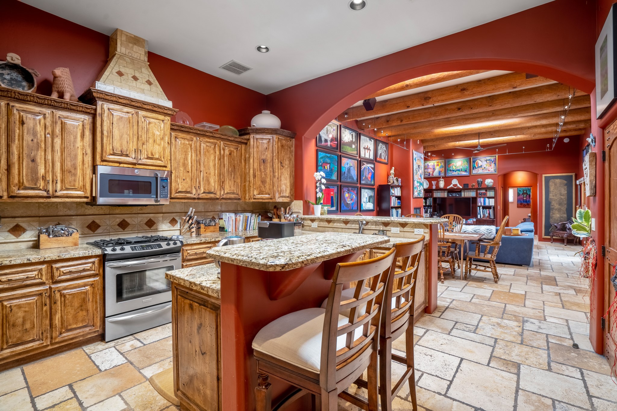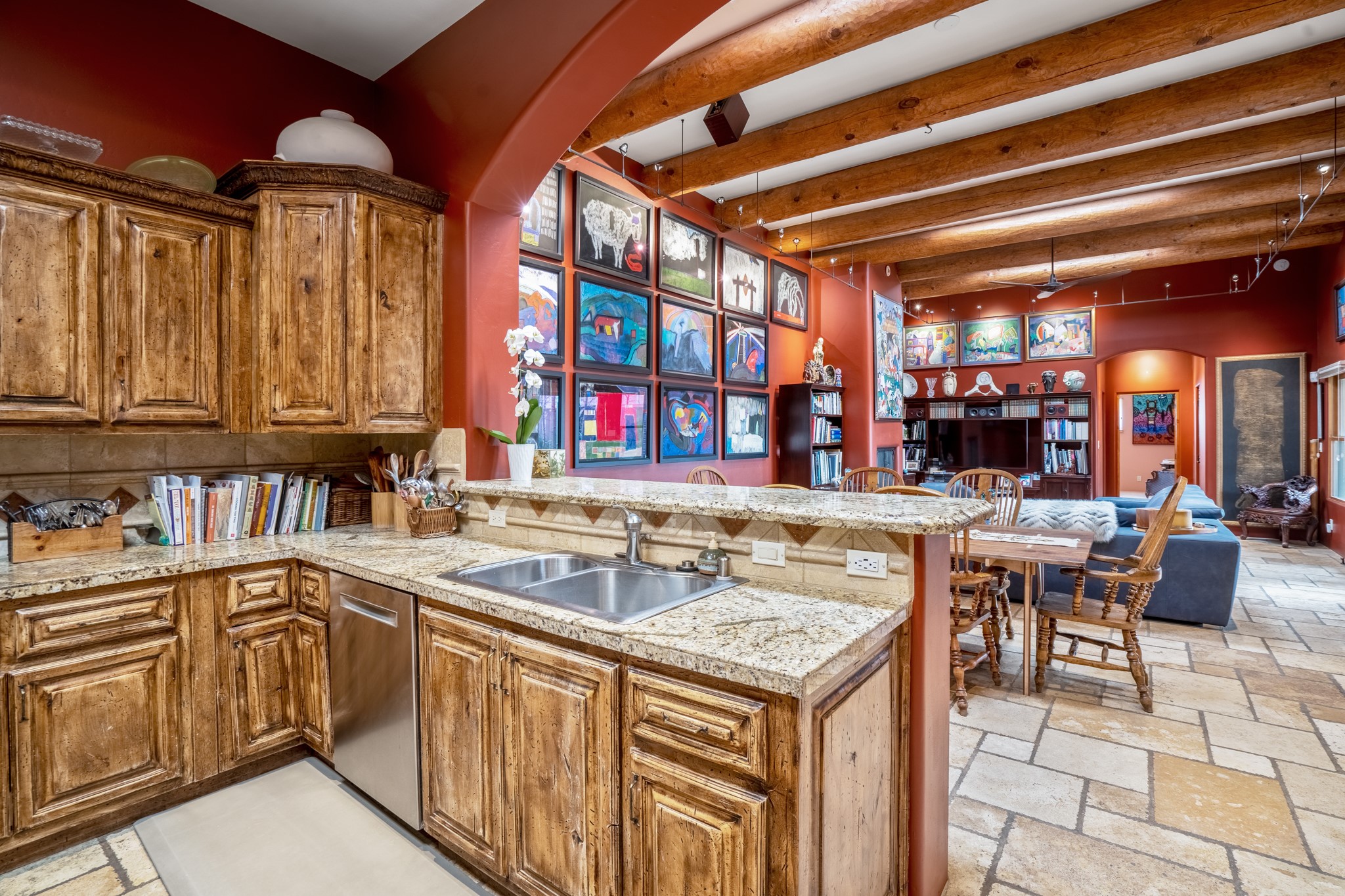 Designed by Joe Varnado this meticulously maintained (and significantly improved) home is a gem in the coveted Oshara Village. Abundant in light and comfort this home features over 2300 sqft of value with the main house's 2 bd 2 bath plus an attached studio/guesthouse with its own separate entrance. When you walk in you will notice the high ceilings bejeweled by skylights and its large traditional southwestern Vigas. Classic hacienda kitchen with abundant cabinetry, plenty storage and an ideal size pantry for the avid cook. Open concept living and dining with gallery quality lighting plus wood burning fireplace create an invitation to gather with loved ones. Hand chiseled solid wood doors, top of the line window shades, stone tile are found throughout this dream home. Enjoy the privacy of room separation from guests with the second bedroom having its own entrance via the courtyard. At the end of the day relax in your Jason Hydrotherapy tub in a spa-like master bathroom with a Japanese smart heated toilet. The walk-in closet is simply grand. The MiniSplit cooling and heating, tankless water heater, a $50K newly installed Solar Panel system, and 2 car garage newly refinished are just a few of the improvements here. Pristine landscaping with hand picked mature trees, 2 gorgeous water features, and outdoor fireplace create your own oasis in the desert. Did we mention the custom designed swallows iron gate? Two minutes and you are at Pantry Dos Restaurant, right on Oshara's main plaza (check out the fabulous Sunsets), and a few minutes drive to the Community College, Genoveva Chavez Center, stores, grocery stores, cafes, restaurants and much more. These photos are just the beginning! Schedule your private viewing of this pristine property, and fall in love with your new home.
