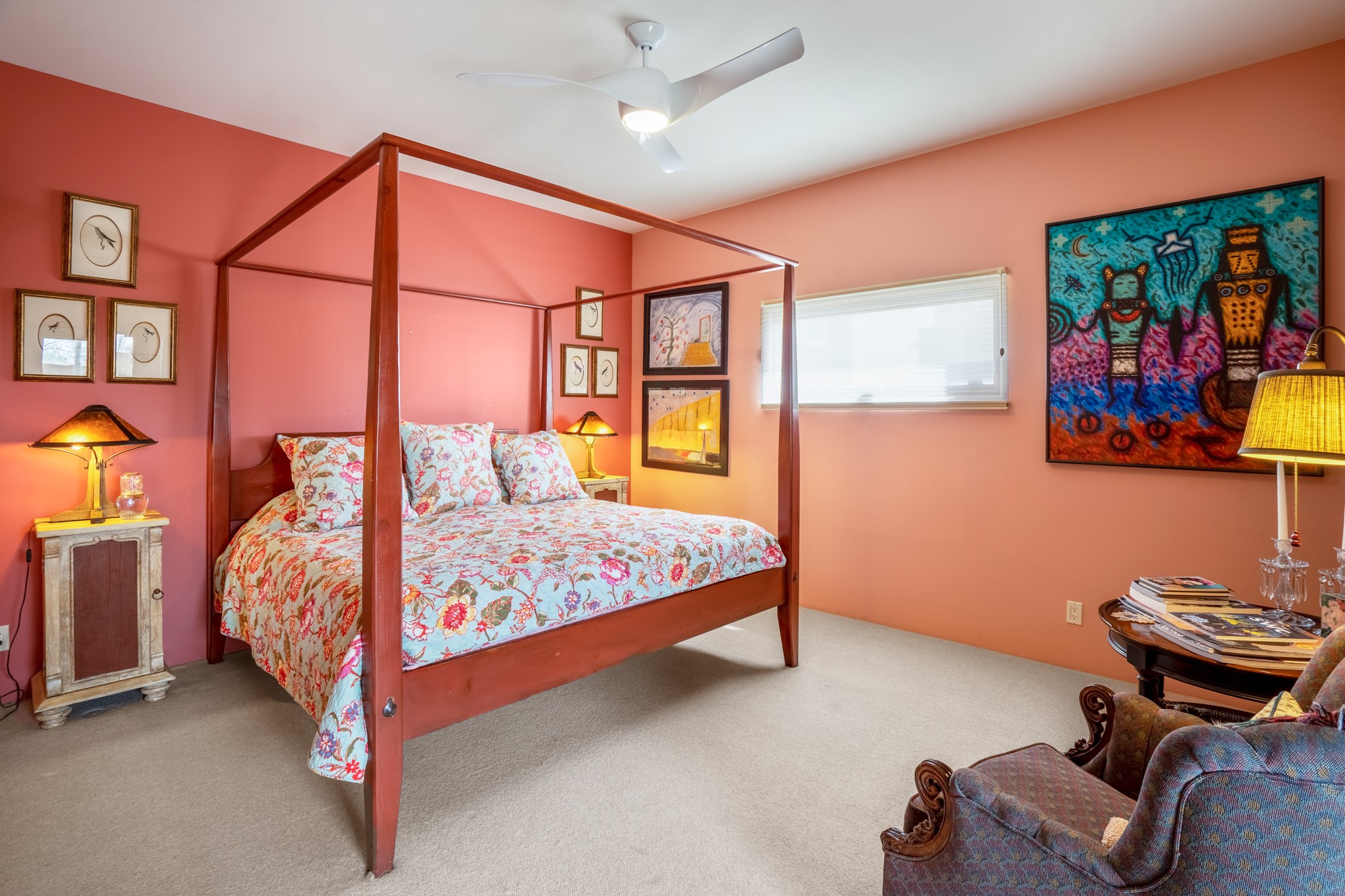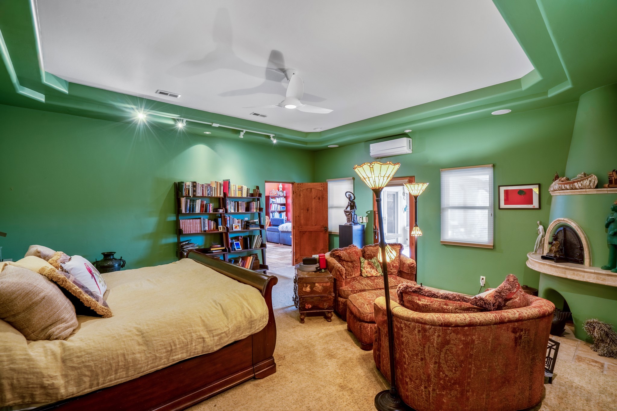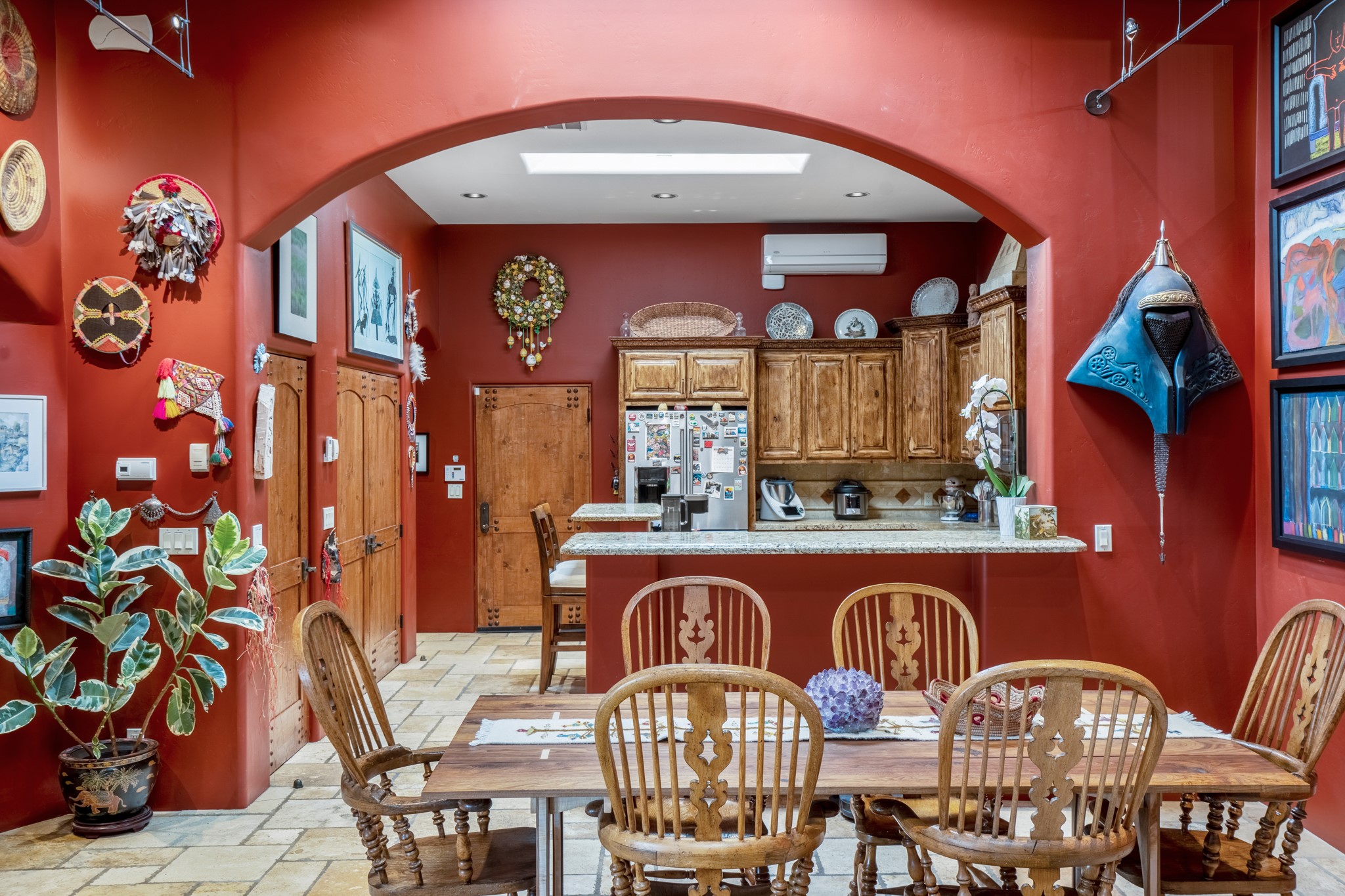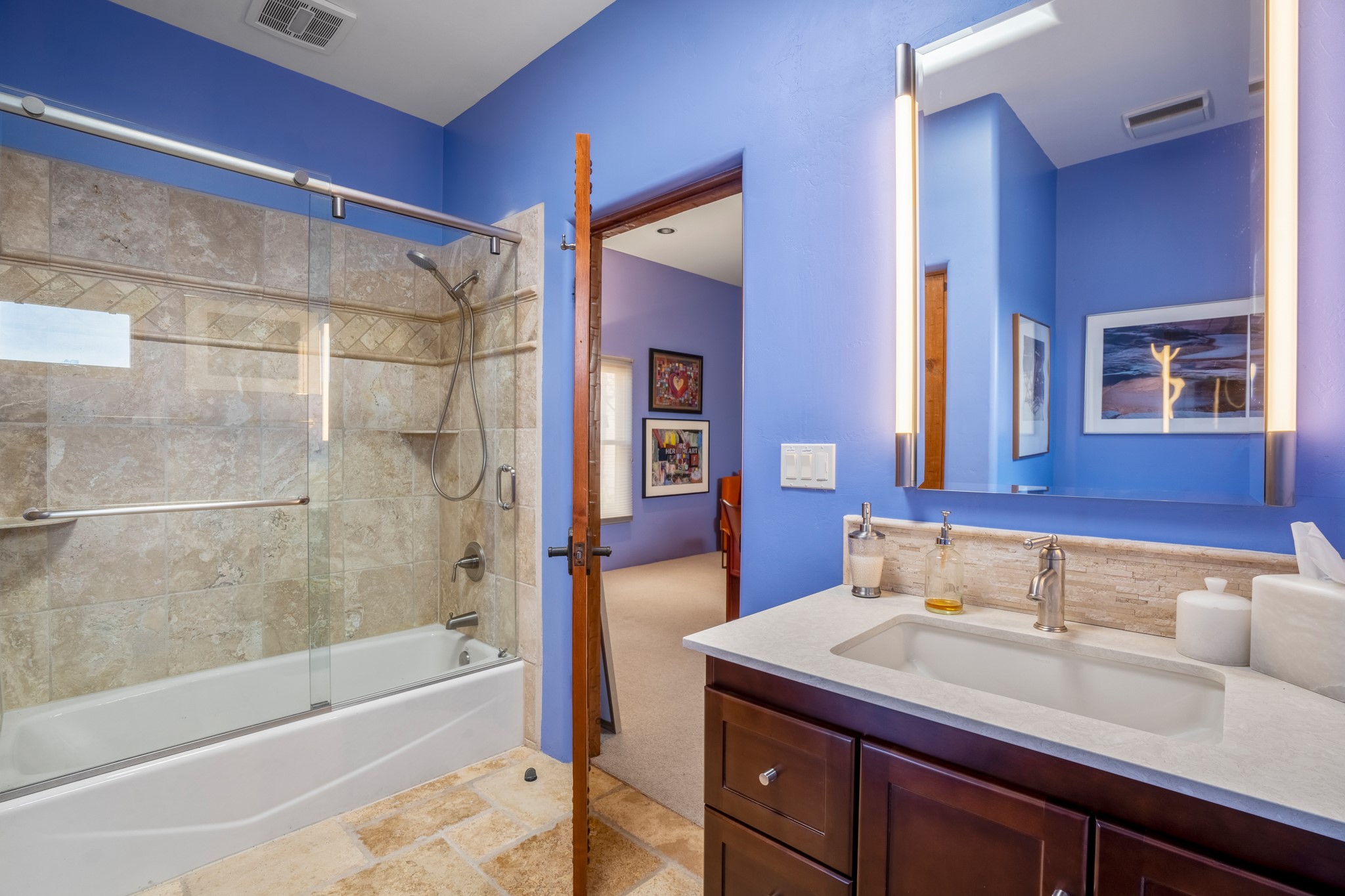 Designed by Joe Varnado this meticulously maintained (and significantly improved) home is a gem in the coveted Oshara Village. Abundant in light and comfort this home features over 2300 sqft of value with the main house's 2 bd 2 bath plus an attached studio/guesthouse with its own separate entrance. When you walk in you will notice the high ceilings bejeweled by skylights and its large traditional southwestern Vigas. Classic hacienda kitchen with abundant cabinetry, plenty storage and an ideal size pantry for the avid cook. Open concept living and dining with gallery quality lighting plus wood burning fireplace create an invitation to gather with loved ones. Hand chiseled solid wood doors, top of the line window shades, stone tile are found throughout this dream home. Enjoy the privacy of room separation from guests with the second bedroom having its own entrance via the courtyard. At the end of the day relax in your Jason Hydrotherapy tub in a spa-like master bathroom with a Japanese smart heated toilet. The walk-in closet is simply grand. The MiniSplit cooling and heating, tankless water heater, a $50K newly installed Solar Panel system, and 2 car garage newly refinished are just a few of the improvements here. Pristine landscaping with hand picked mature trees, 2 gorgeous water features, and outdoor fireplace create your own oasis in the desert. Did we mention the custom designed swallows iron gate? Two minutes and you are at Pantry Dos Restaurant, right on Oshara's main plaza (check out the fabulous Sunsets), and a few minutes drive to the Community College, Genoveva Chavez Center, stores, grocery stores, cafes, restaurants and much more. These photos are just the beginning! Schedule your private viewing of this pristine property, and fall in love with your new home.