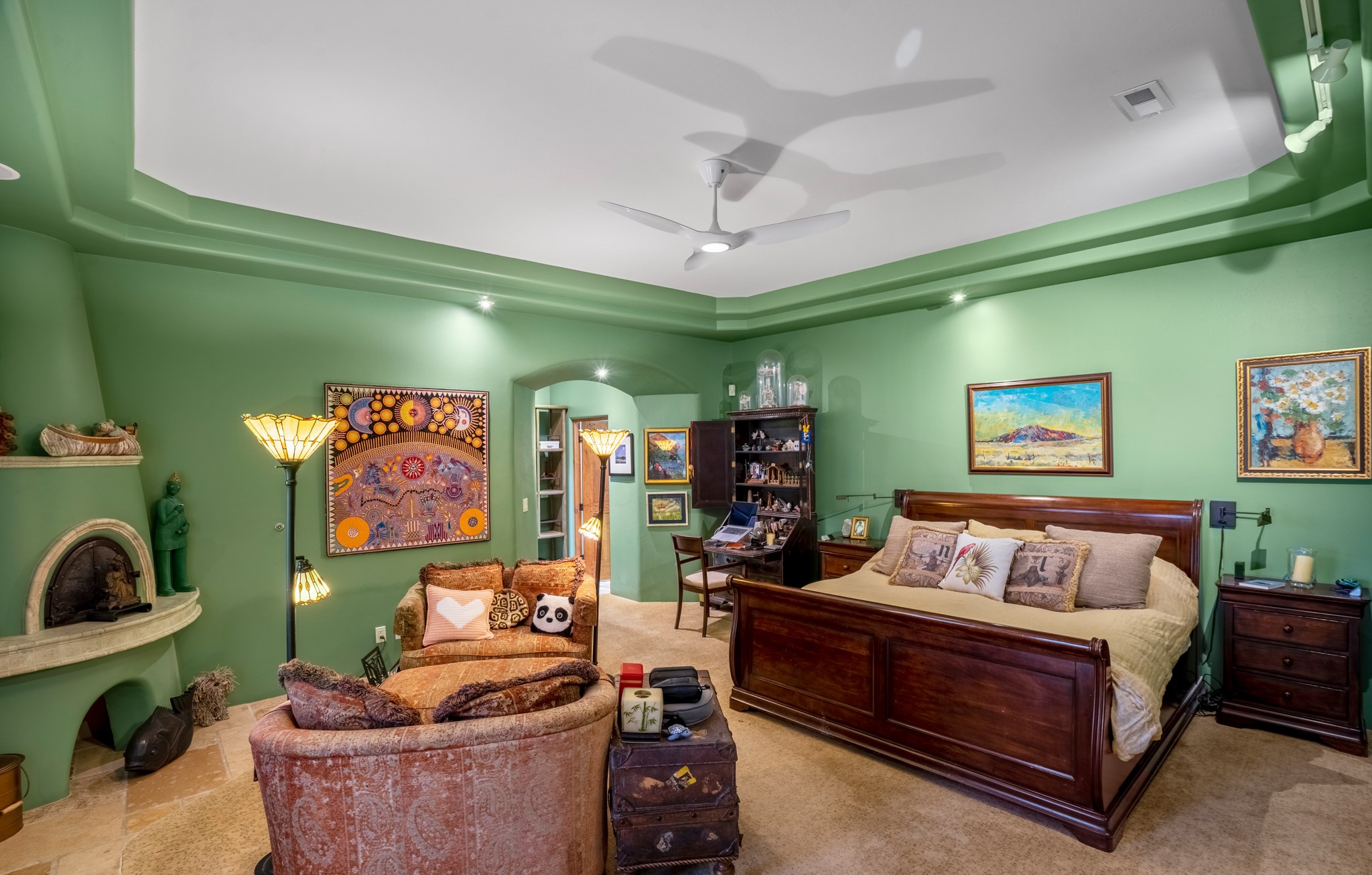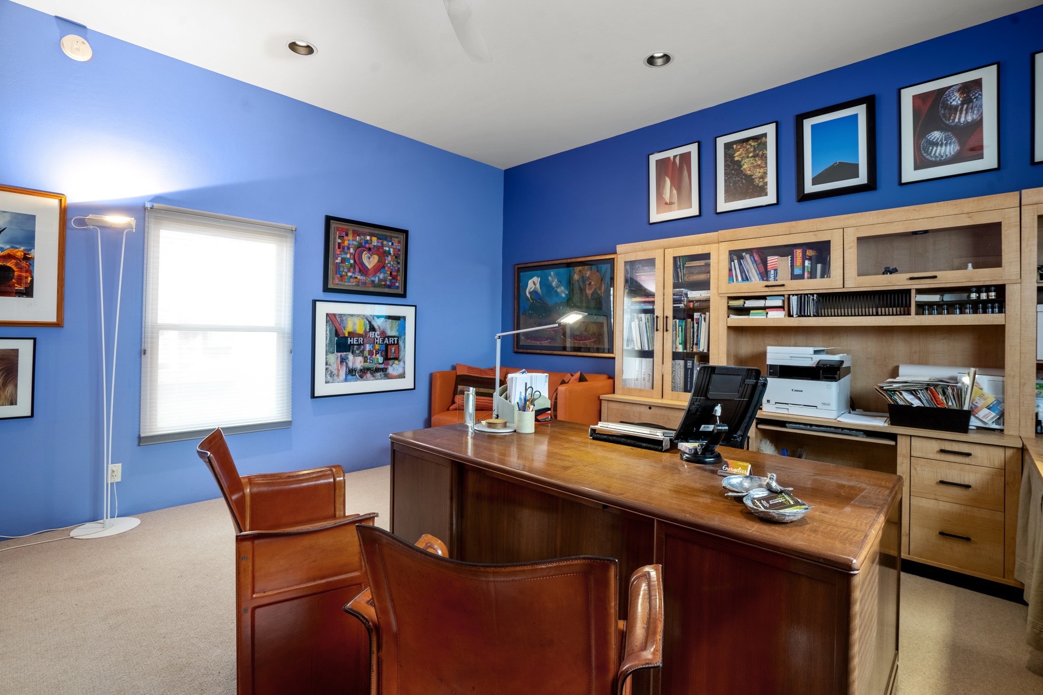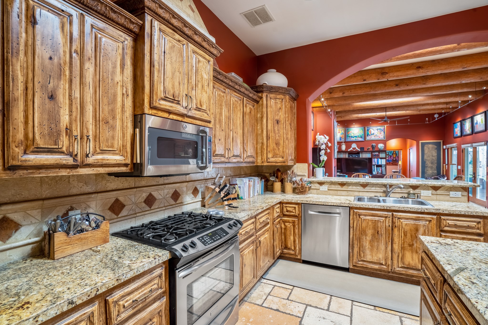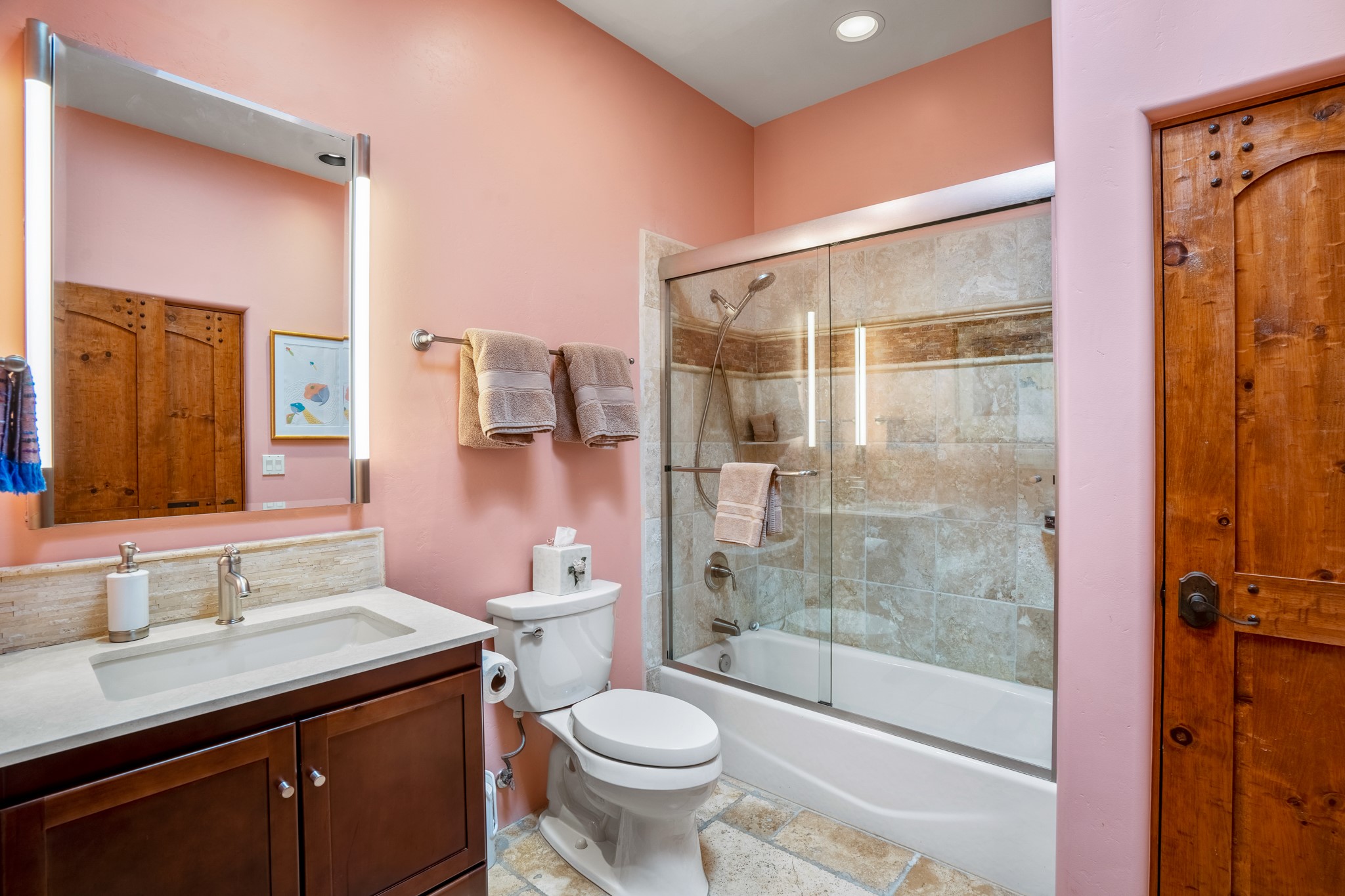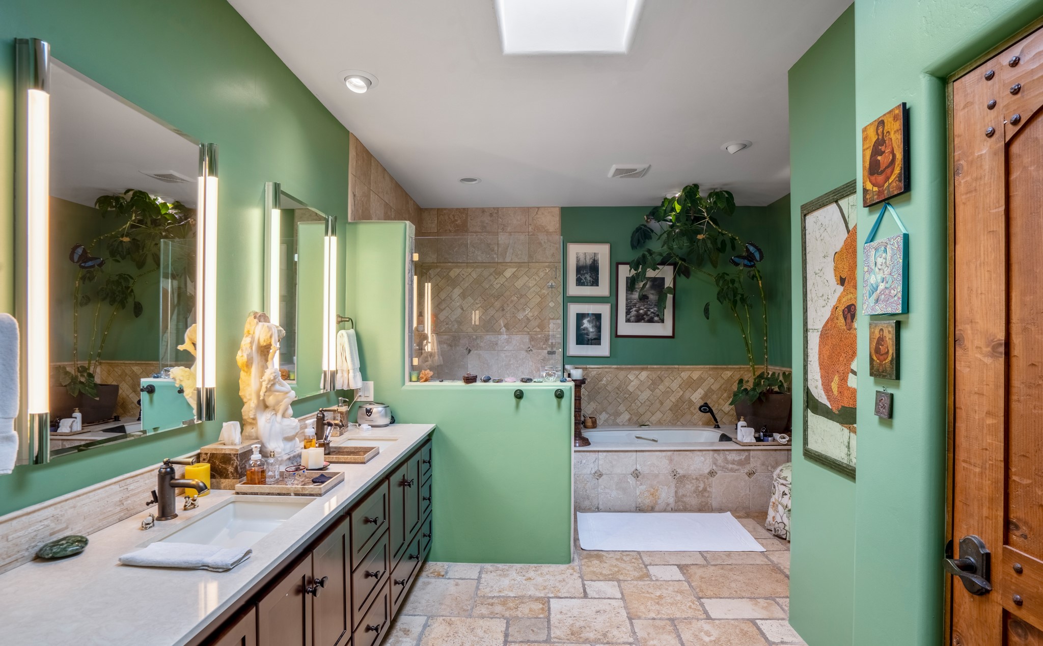 Designed by Joe Varnado this meticulously maintained (and significantly improved) home is a gem in the coveted Oshara Village. Abundant in light and comfort this home features over 2300 sqft of value with the main house's 2 bd 2 bath plus an attached studio/guesthouse with its own separate entrance. When you walk in you will notice the high ceilings bejeweled by skylights and its large traditional southwestern Vigas. Classic hacienda kitchen with abundant cabinetry, plenty storage and an ideal size pantry for the avid cook. Open concept living and dining with gallery quality lighting plus wood burning fireplace create an invitation to gather with loved ones. Hand chiseled solid wood doors, top of the line window shades, stone tile are found throughout this dream home. Enjoy the privacy of room separation from guests with the second bedroom having its own entrance via the courtyard. At the end of the day relax in your Jason Hydrotherapy tub in a spa-like master bathroom with a Japanese smart heated toilet. The walk-in closet is simply grand. The MiniSplit cooling and heating, tankless water heater, a $50K newly installed Solar Panel system, and 2 car garage newly refinished are just a few of the improvements here. Pristine landscaping with hand picked mature trees, 2 gorgeous water features, and outdoor fireplace create your own oasis in the desert. Did we mention the custom designed swallows iron gate? Two minutes and you are at Pantry Dos Restaurant, right on Oshara's main plaza (check out the fabulous Sunsets), and a few minutes drive to the Community College, Genoveva Chavez Center, stores, grocery stores, cafes, restaurants and much more. These photos are just the beginning! Schedule your private viewing of this pristine property, and fall in love with your new home.