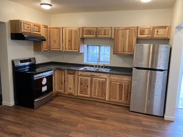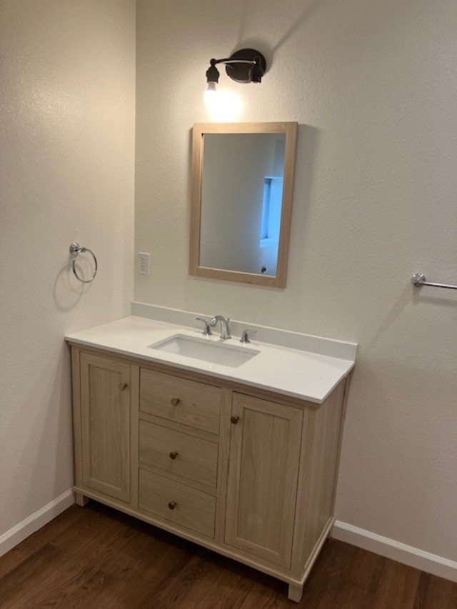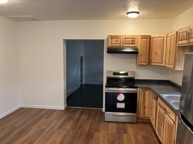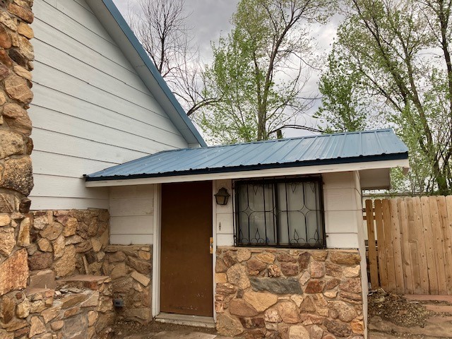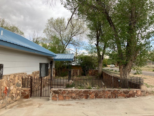 Nice-sized ranch-style home, complete remodel of interior just finished! So new paint, new flooring (carpet and laminate), new stainless steel appliances (refrigerator and electric stove), new cabinets in kitchens and bathrooms. It sits on the back of a completely fenced and walled lot with the outside living area in the front. There is an unheated room with separate entrance attached to the right side of the house - it has electricity and could be an office, studio, or storage - and a separate storage shed. Large trees shade the front yard.
