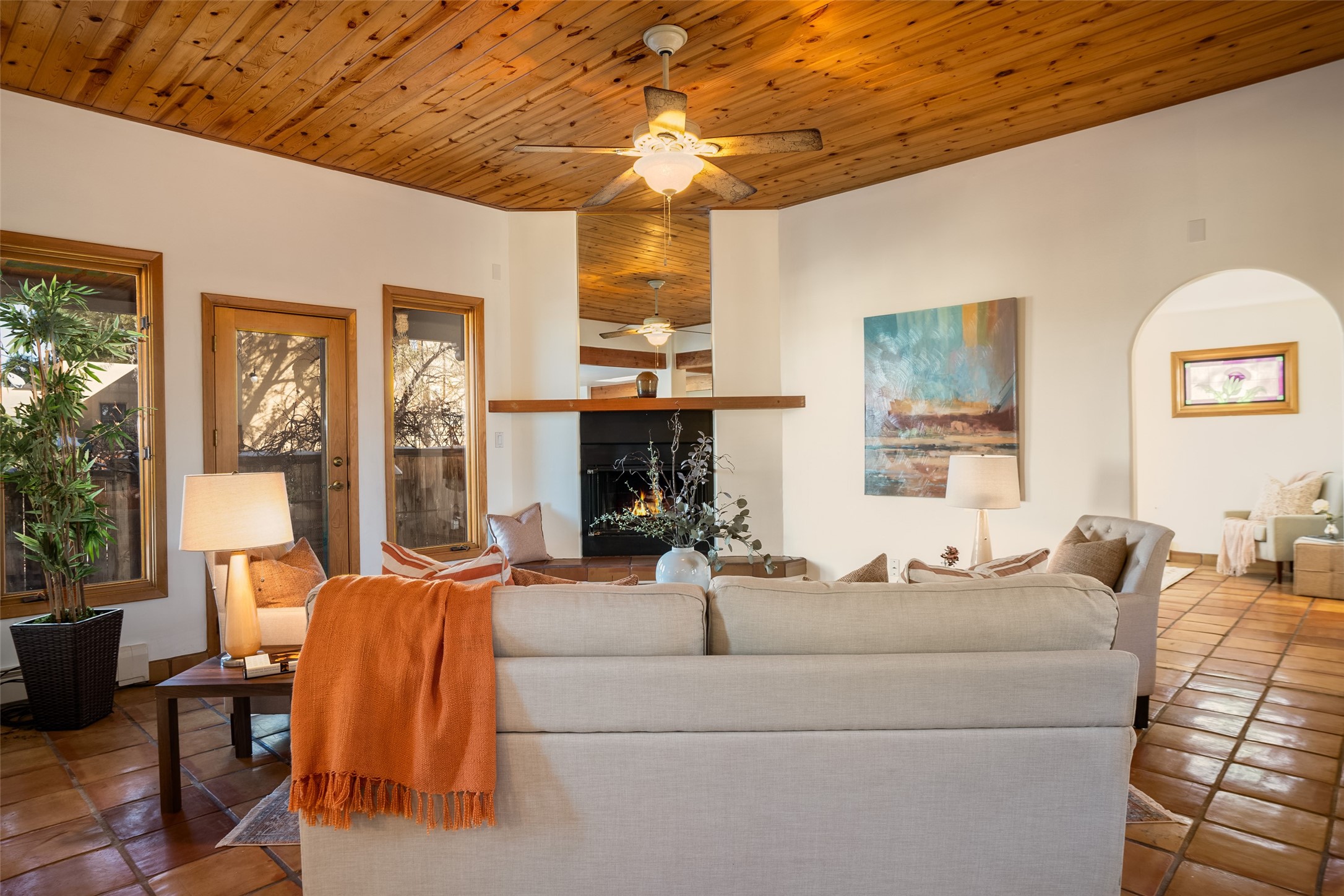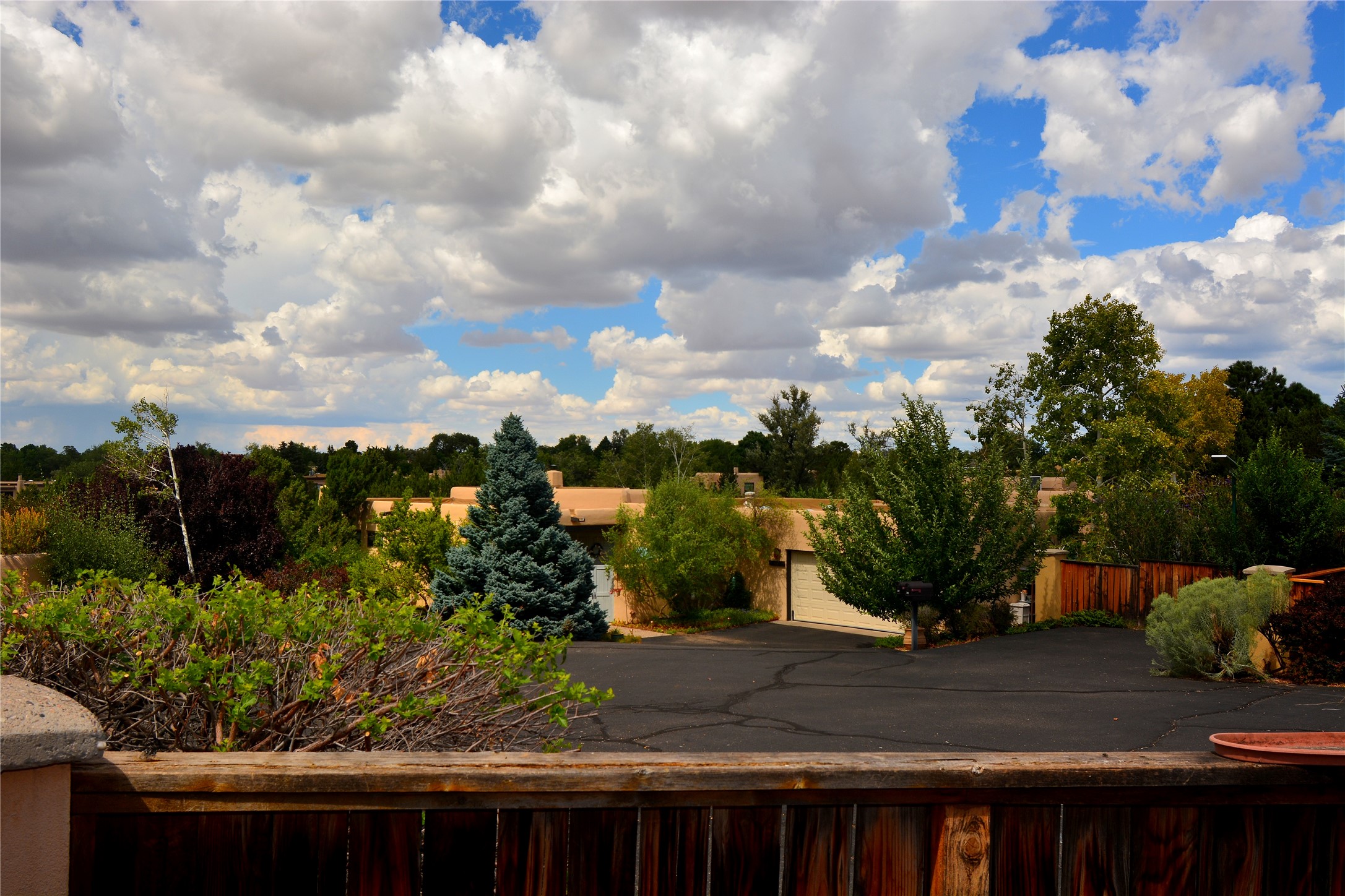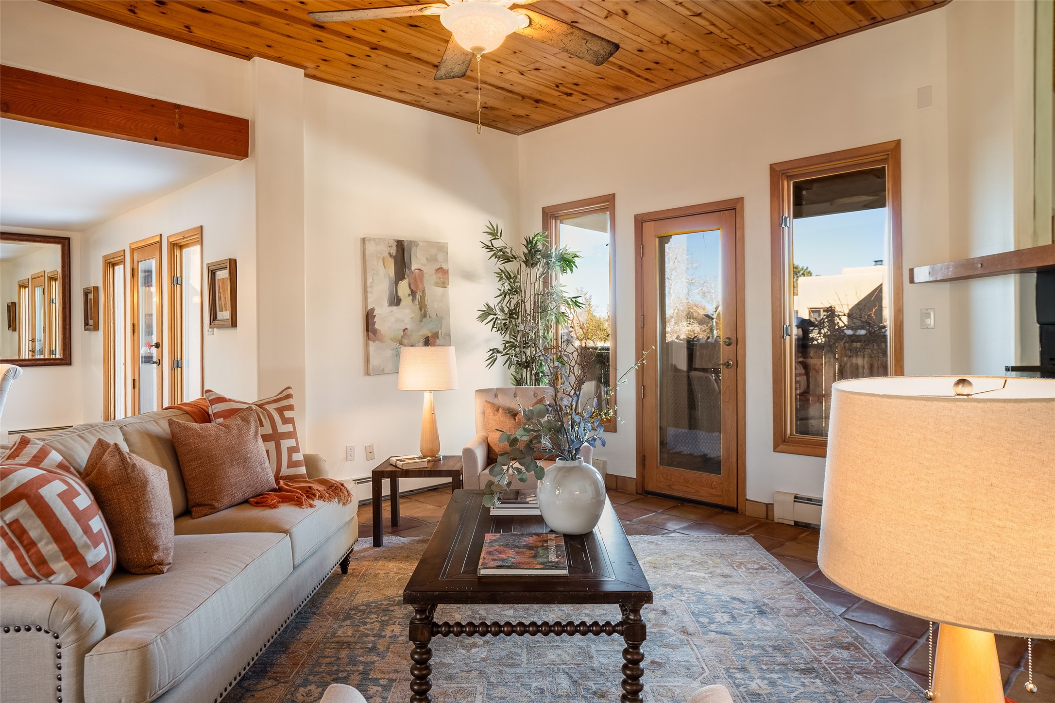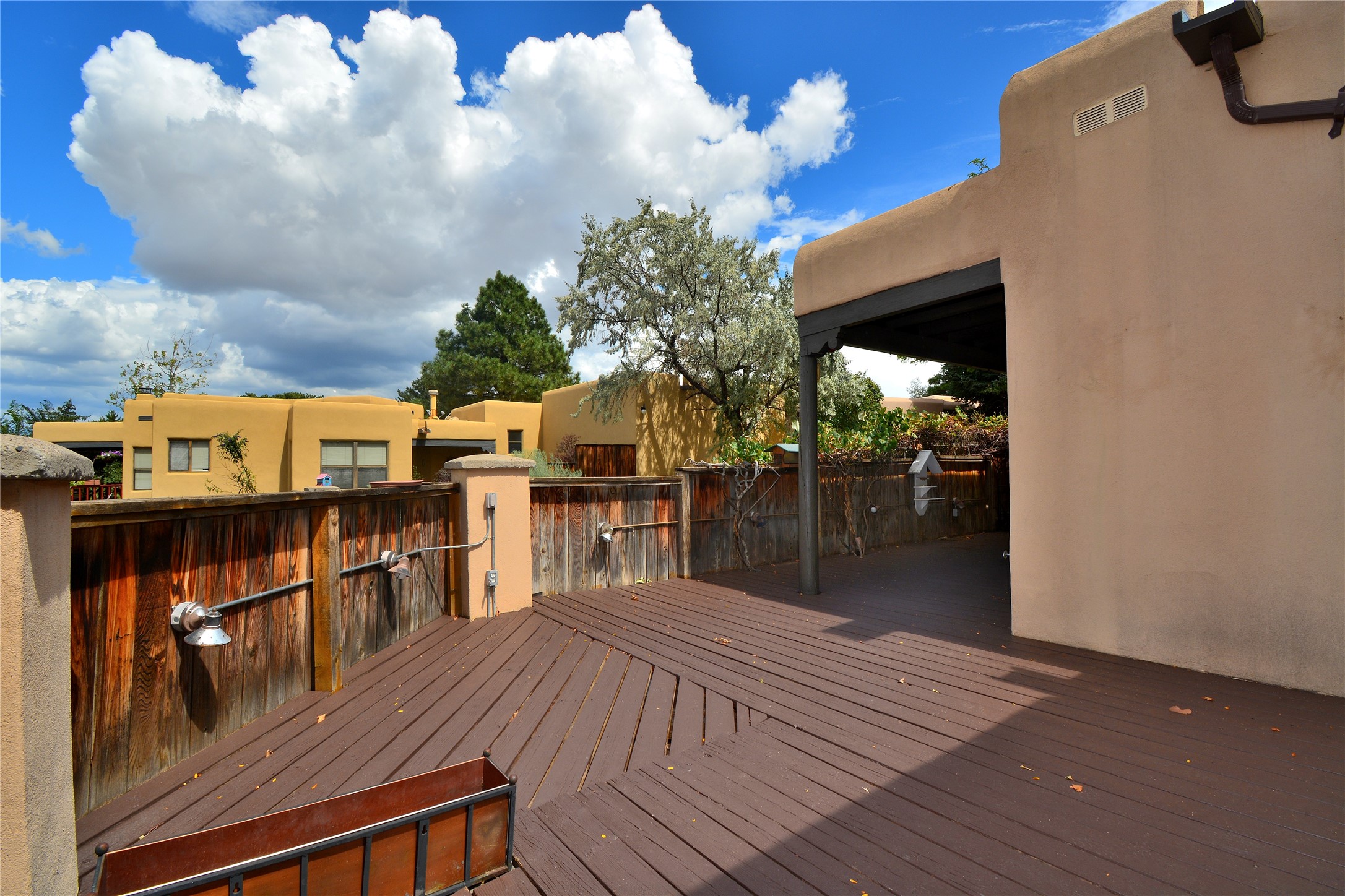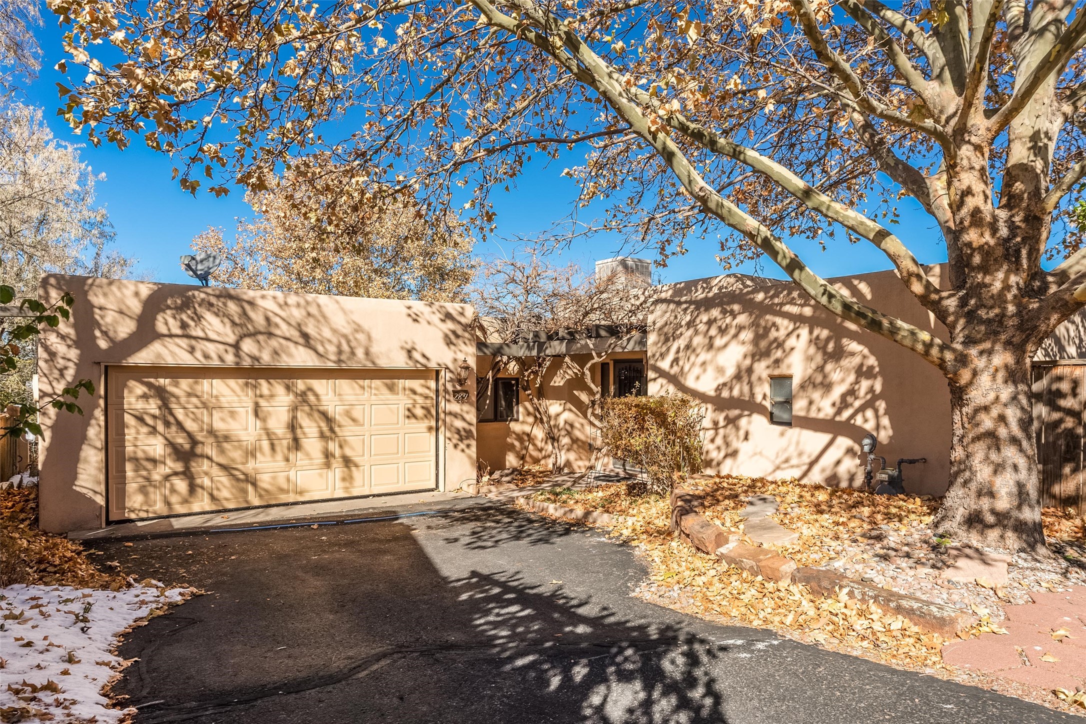 This stand alone home has a lovely floor plan with a bedroom on each side of the spacious Great Room, Dining Room and Kitchen There are only two stairs in the whole house and there is an oversized, attached, two car garage. The floors throughout are Saltillo tile. The Living Room has a tongue-in-groove wood ceiling with beams between the rooms and a corner fireplace for cozy winter evenings. The dining room has a French door leading to a large wrap-around and freshly painted deck, fenced for privacy and lined with abundant grapevines. The kitchen has a bar that separates it from the dining room but is open and could be perfect for entertaining. Sellers recently had the whole house painted.Park Plazas is a unique oasis, centrally located in Santa Fe. With miles of walking trails, an off-leash dog park, tennis and pickleball courts and a community garden this neighborhood is the perfect mix of city and country living. Don't miss this home!