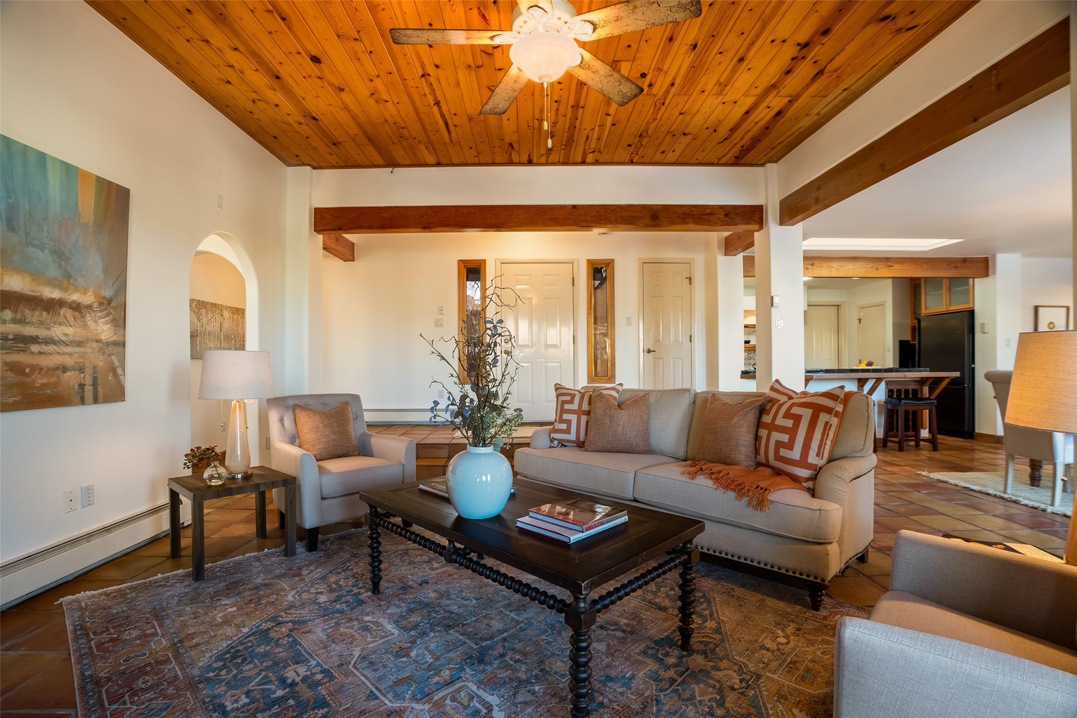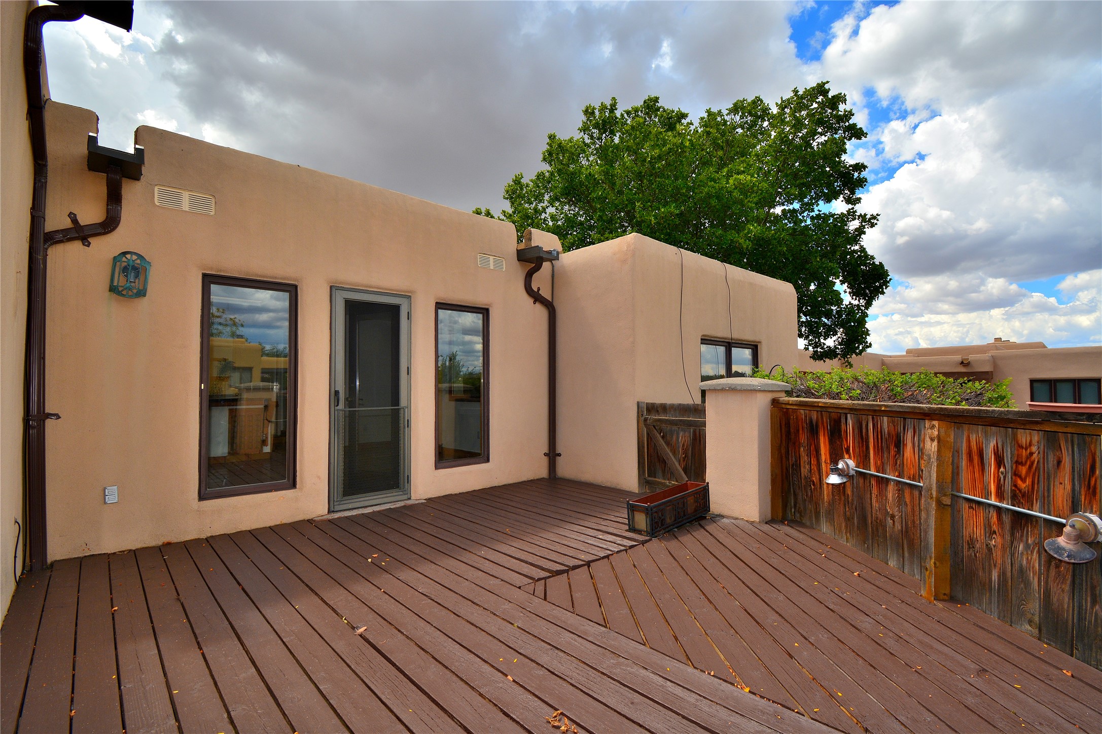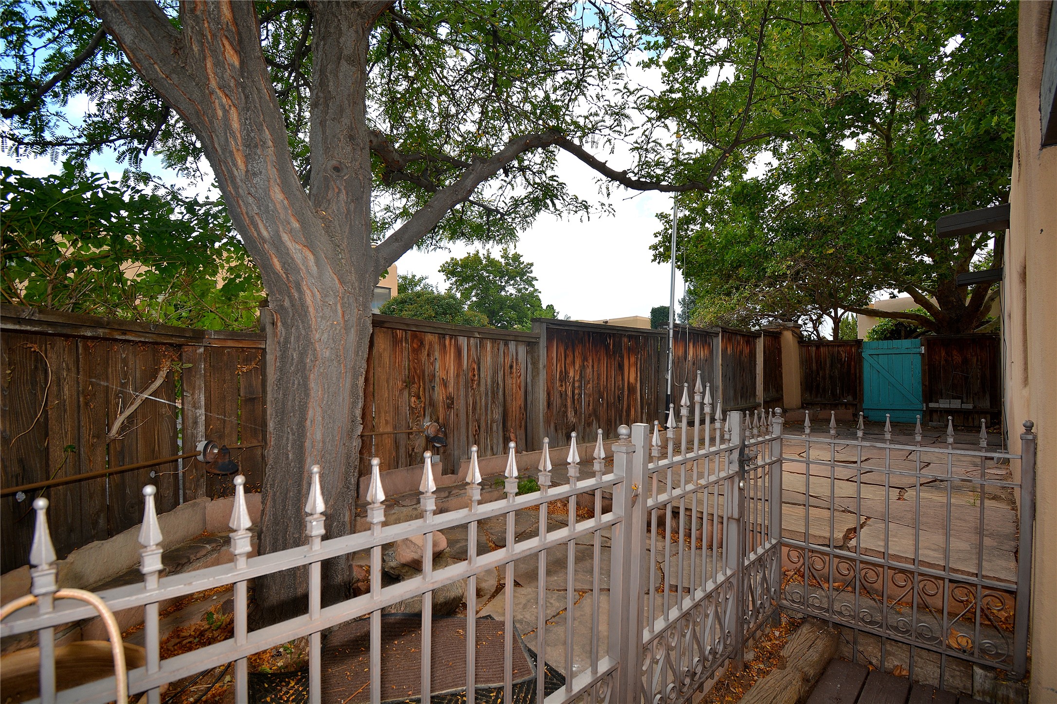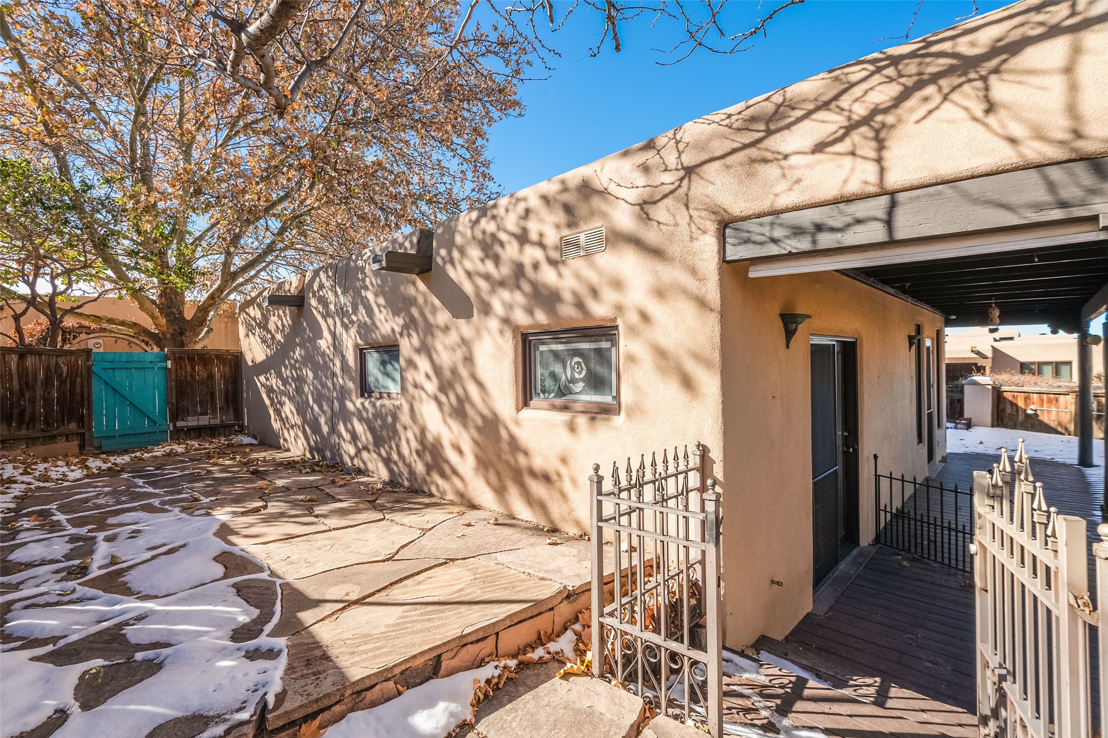 This stand alone home has a lovely floor plan with a bedroom on each side of the spacious Great Room, Dining Room and Kitchen There are only two stairs in the whole house and there is an oversized, attached, two car garage. The floors throughout are Saltillo tile. The Living Room has a tongue-in-groove wood ceiling with beams between the rooms and a corner fireplace for cozy winter evenings. The dining room has a French door leading to a large wrap-around and freshly painted deck, fenced for privacy and lined with abundant grapevines. The kitchen has a bar that separates it from the dining room but is open and could be perfect for entertaining. Sellers recently had the whole house painted.Park Plazas is a unique oasis, centrally located in Santa Fe. With miles of walking trails, an off-leash dog park, tennis and pickleball courts and a community garden this neighborhood is the perfect mix of city and country living. Don't miss this home!