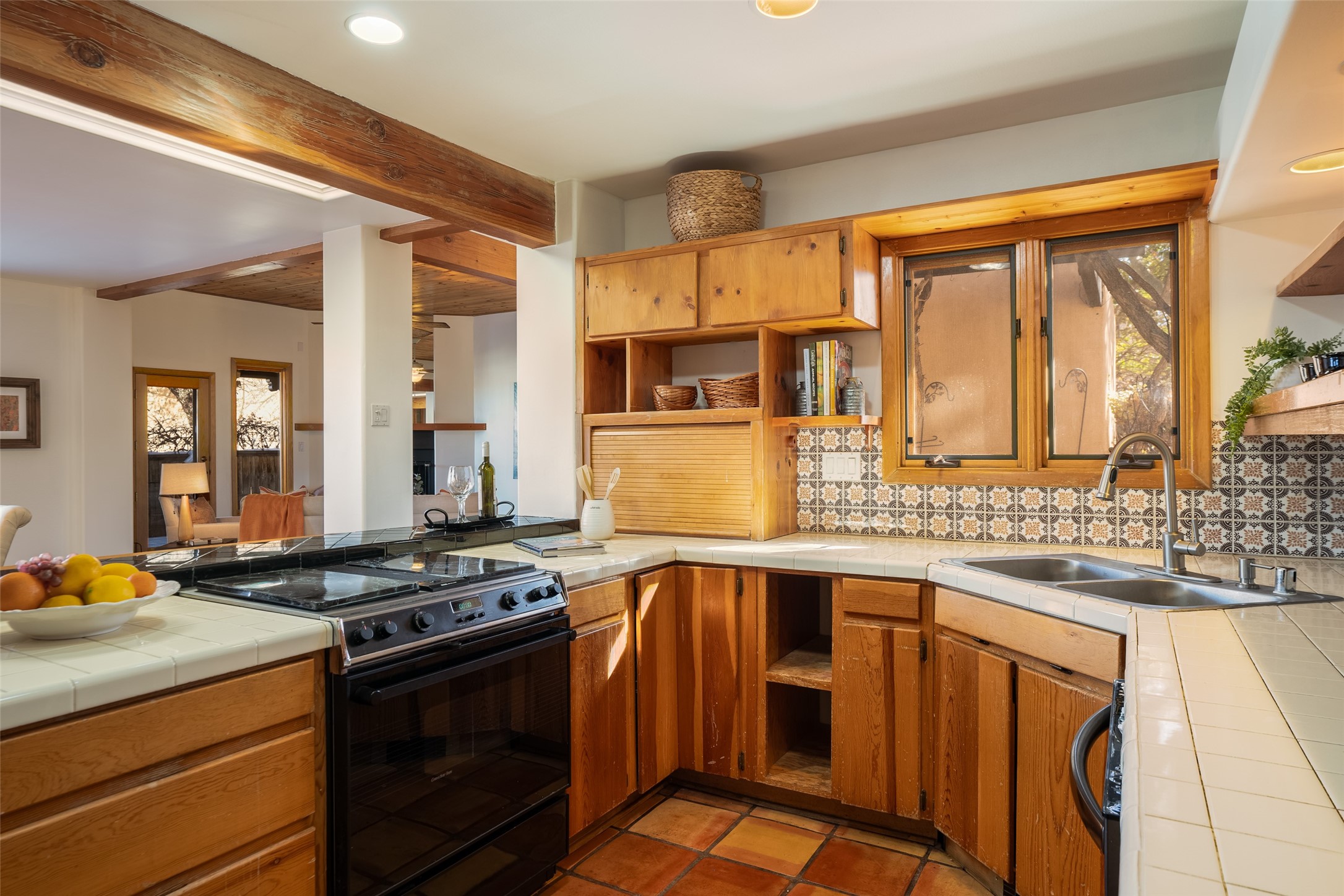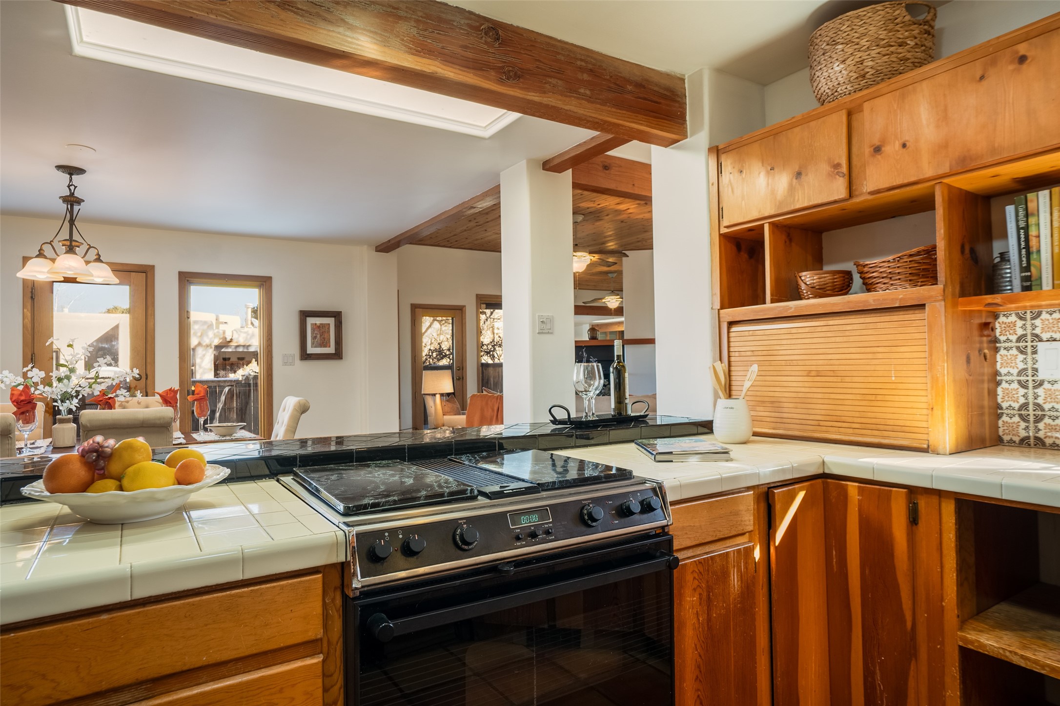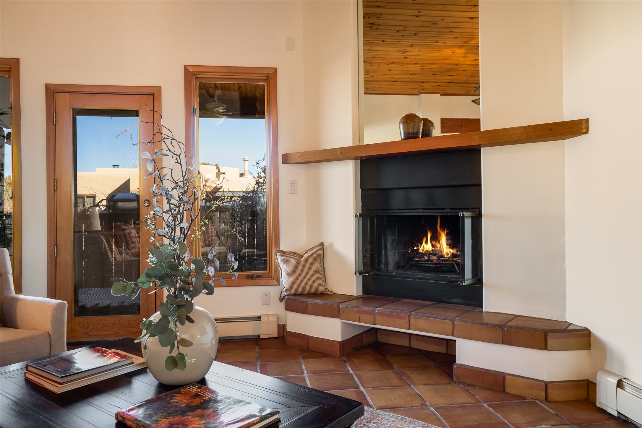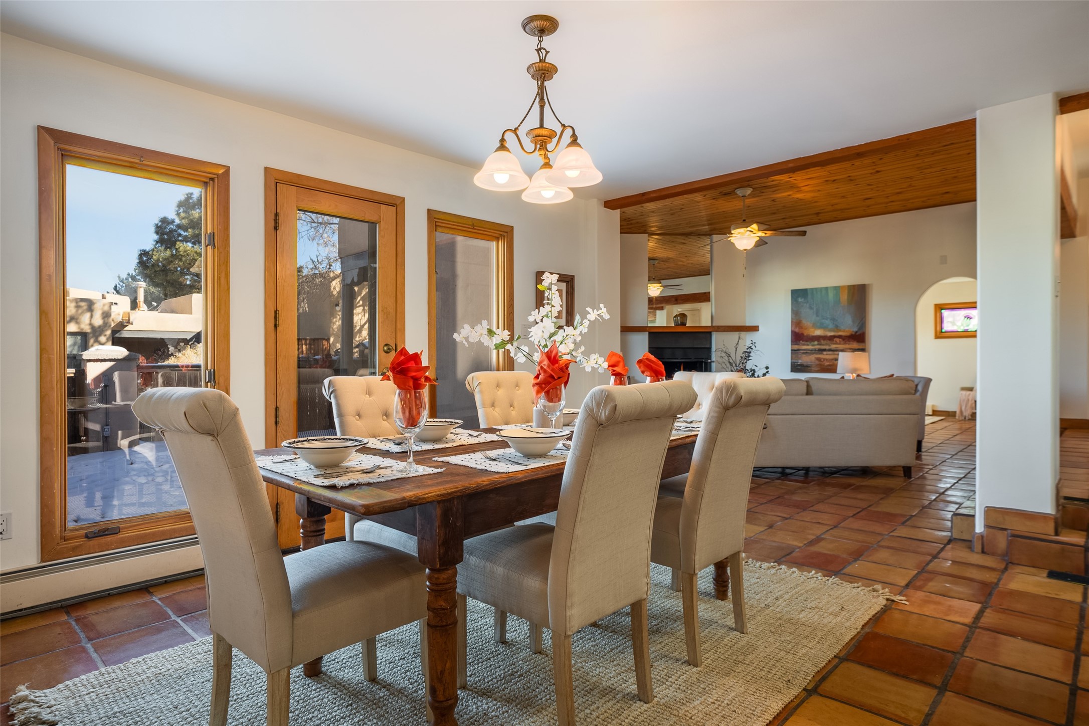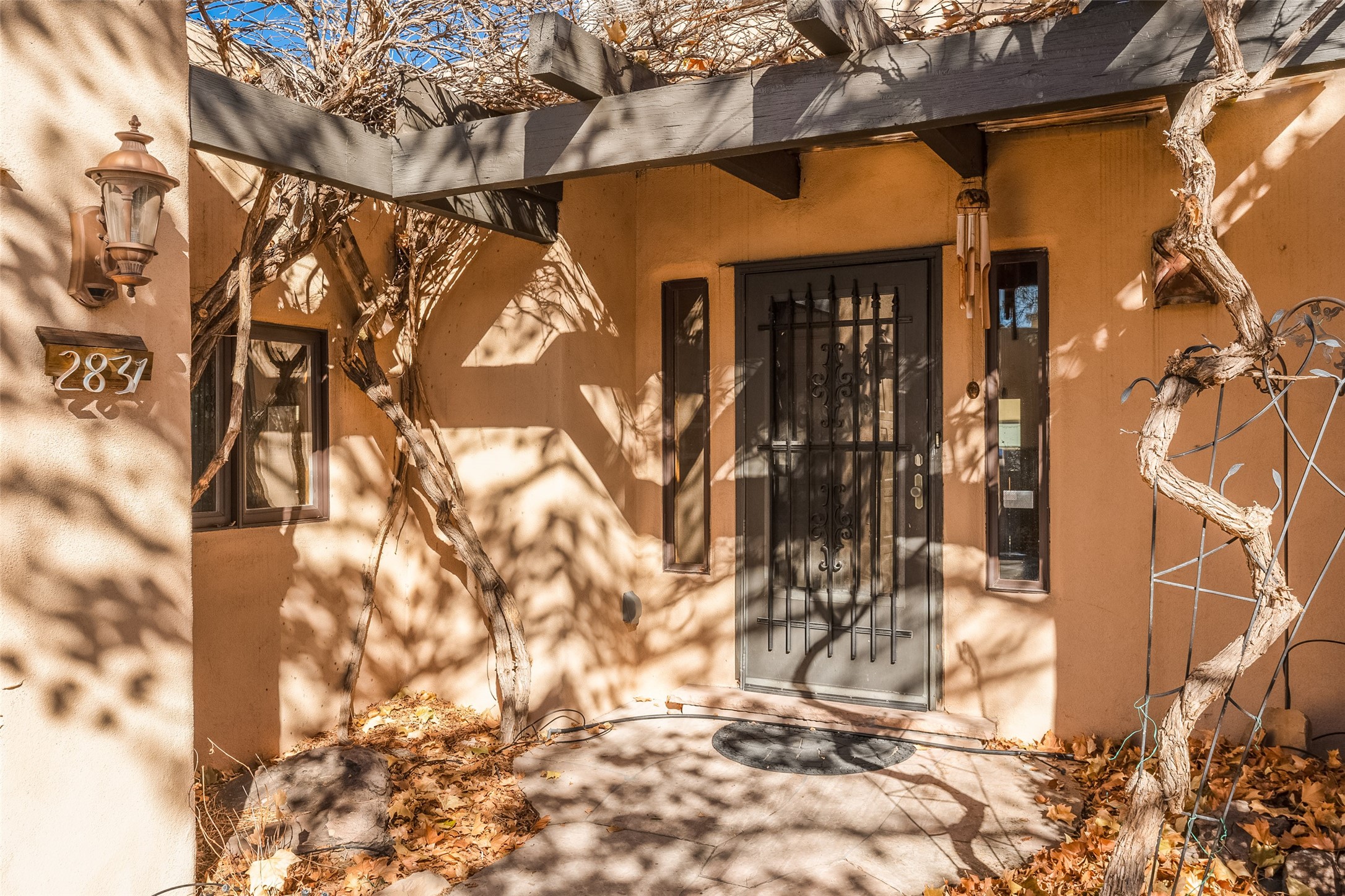 This stand alone home has a lovely floor plan with a bedroom on each side of the spacious Great Room, Dining Room and Kitchen There are only two stairs in the whole house and there is an oversized, attached, two car garage. The floors throughout are Saltillo tile. The Living Room has a tongue-in-groove wood ceiling with beams between the rooms and a corner fireplace for cozy winter evenings. The dining room has a French door leading to a large wrap-around and freshly painted deck, fenced for privacy and lined with abundant grapevines. The kitchen has a bar that separates it from the dining room but is open and could be perfect for entertaining. Sellers recently had the whole house painted.Park Plazas is a unique oasis, centrally located in Santa Fe. With miles of walking trails, an off-leash dog park, tennis and pickleball courts and a community garden this neighborhood is the perfect mix of city and country living. Don't miss this home!