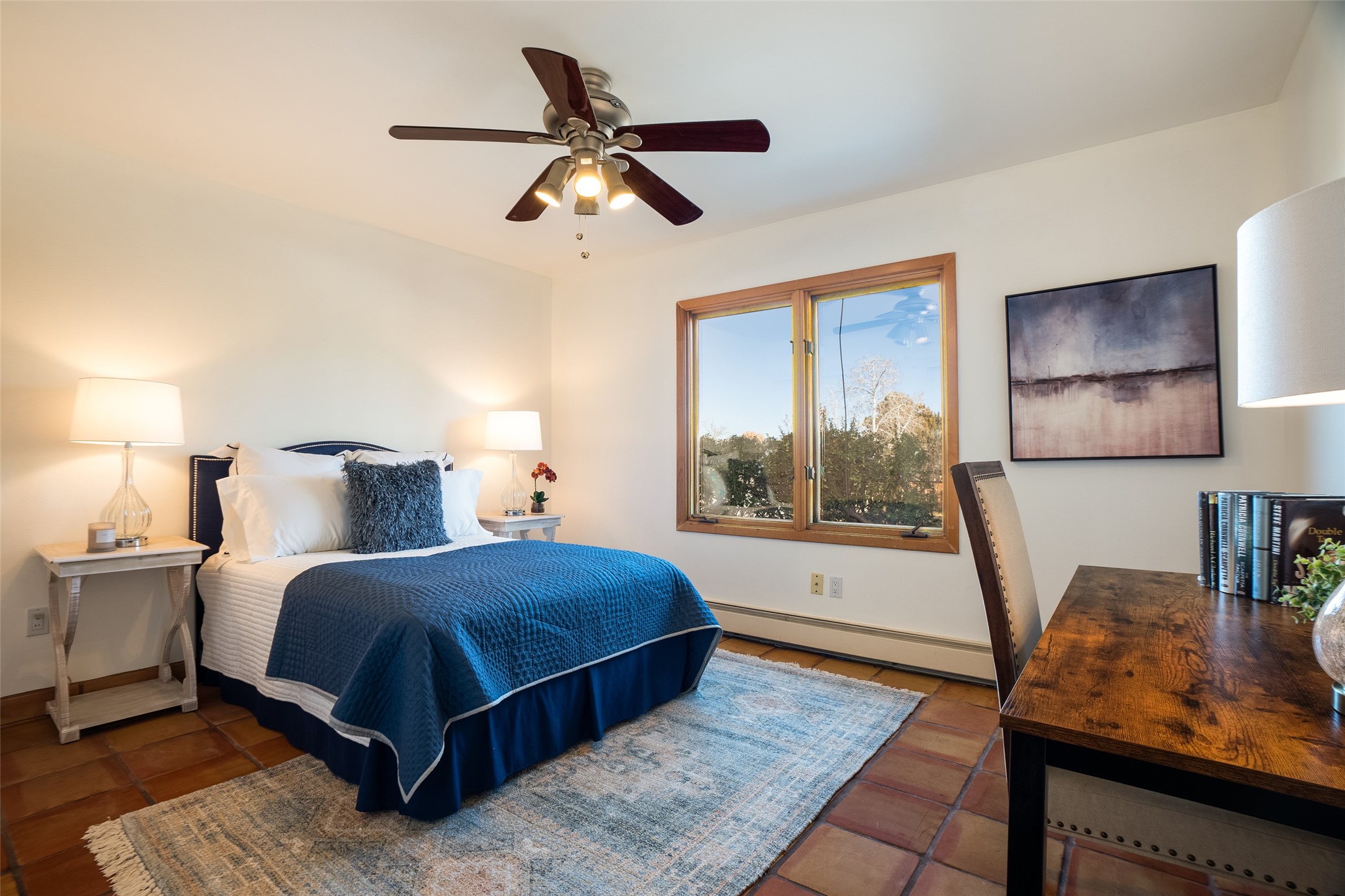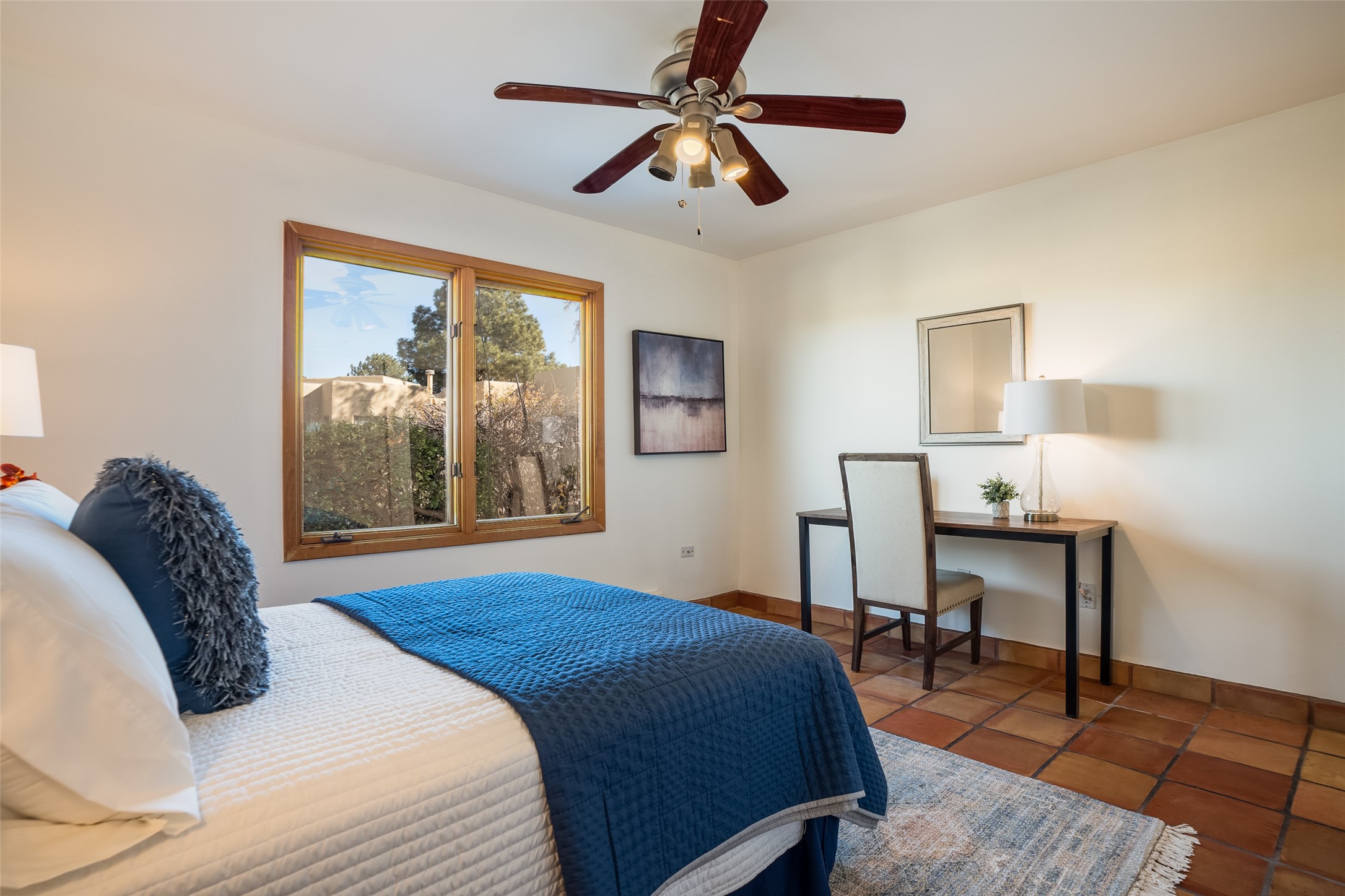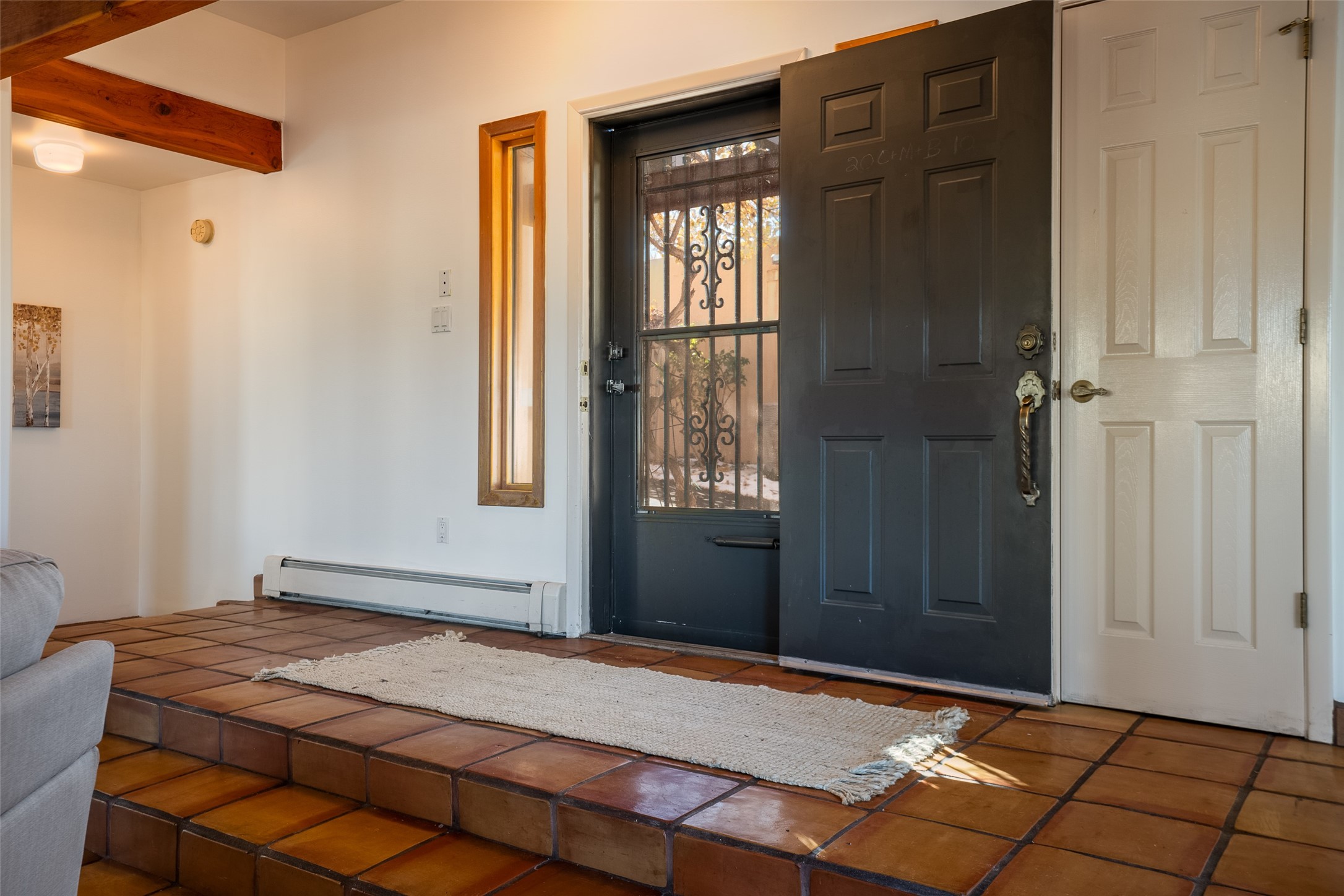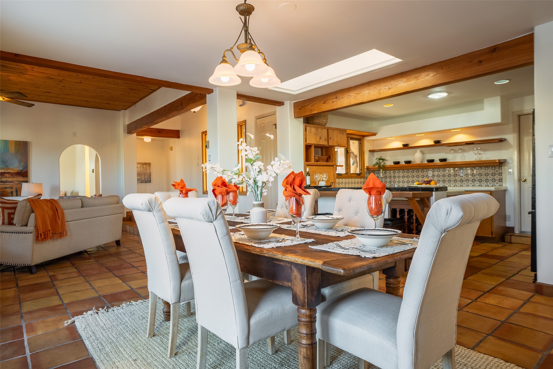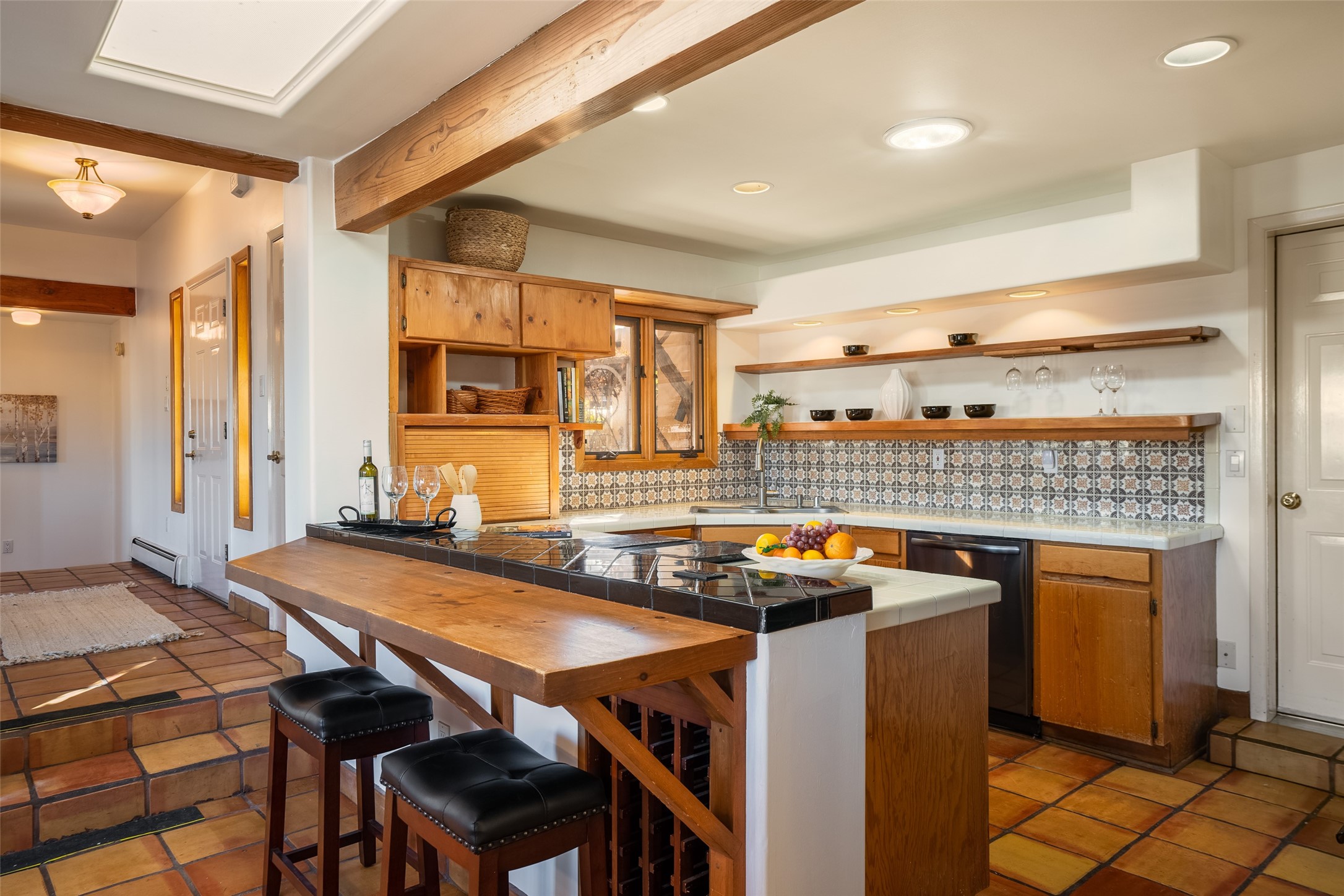 This stand alone home has a lovely floor plan with a bedroom on each side of the spacious Great Room, Dining Room and Kitchen There are only two stairs in the whole house and there is an oversized, attached, two car garage. The floors throughout are Saltillo tile. The Living Room has a tongue-in-groove wood ceiling with beams between the rooms and a corner fireplace for cozy winter evenings. The dining room has a French door leading to a large wrap-around and freshly painted deck, fenced for privacy and lined with abundant grapevines. The kitchen has a bar that separates it from the dining room but is open and could be perfect for entertaining. Sellers recently had the whole house painted.Park Plazas is a unique oasis, centrally located in Santa Fe. With miles of walking trails, an off-leash dog park, tennis and pickleball courts and a community garden this neighborhood is the perfect mix of city and country living. Don't miss this home!