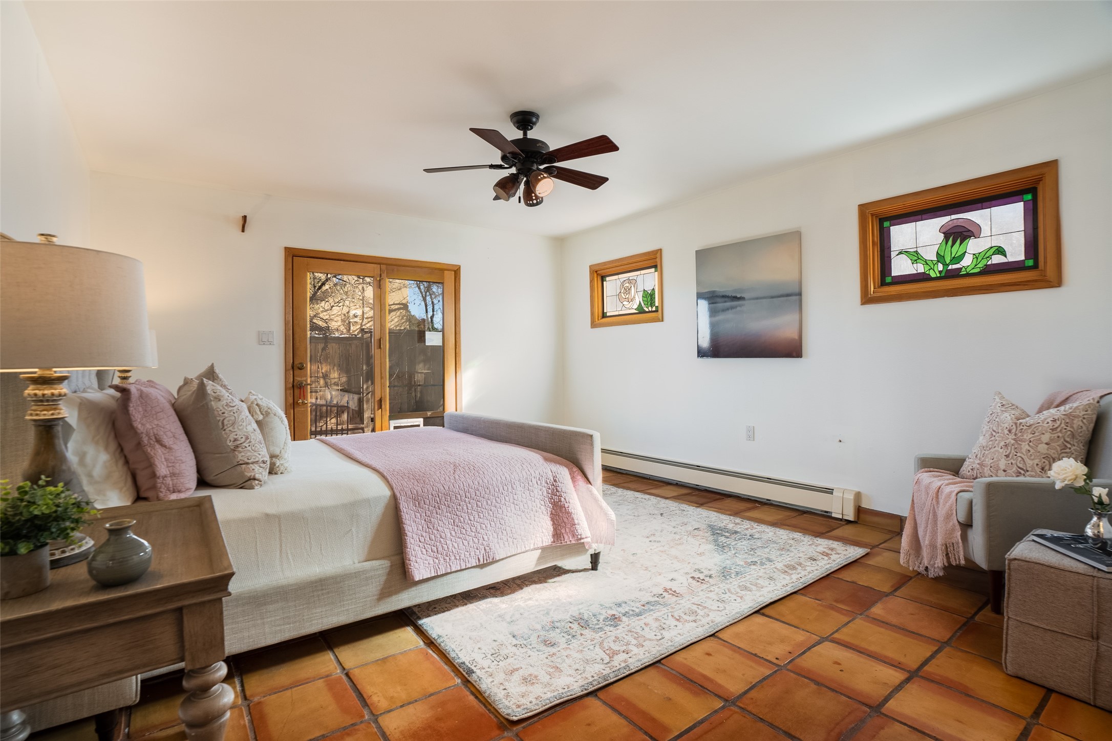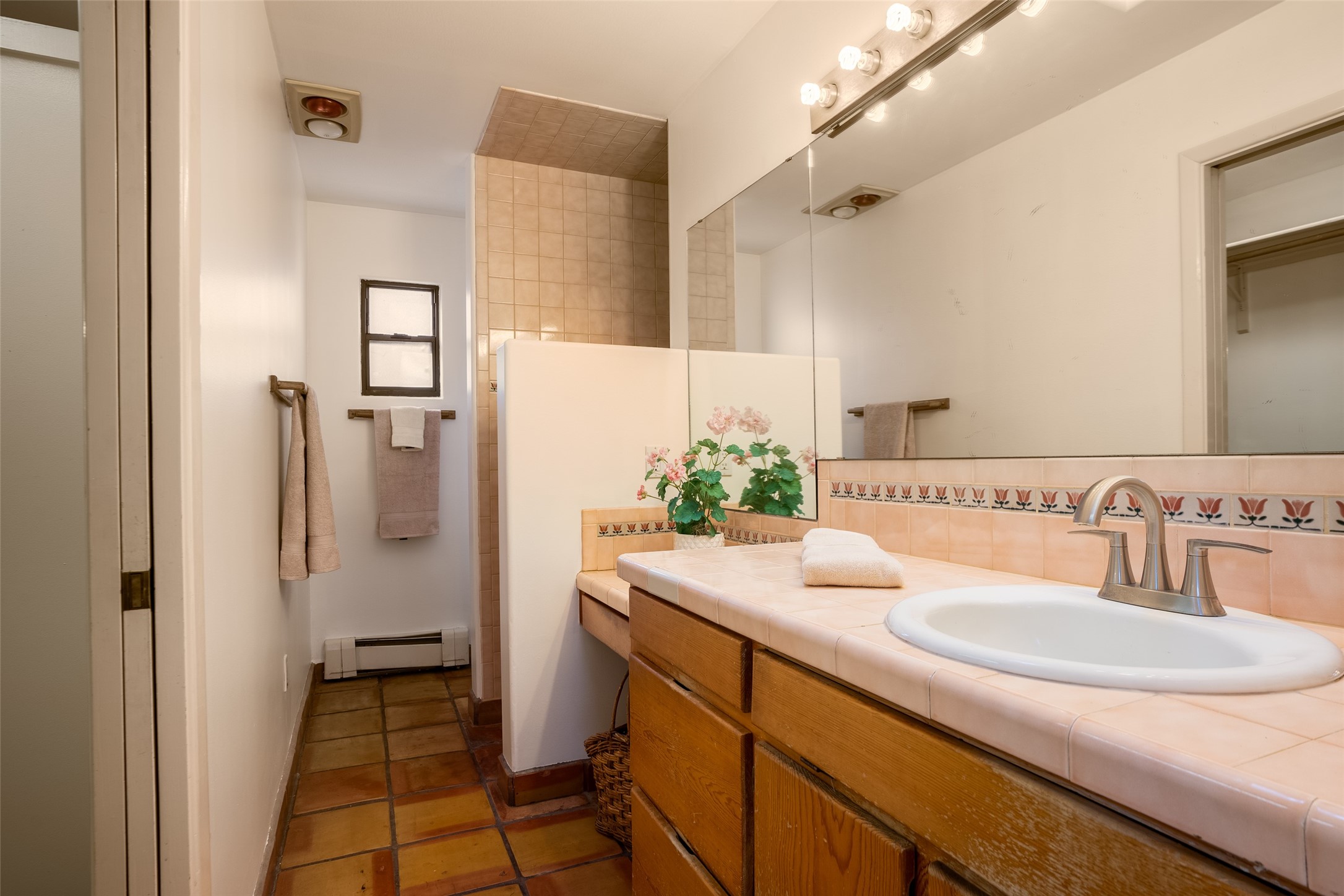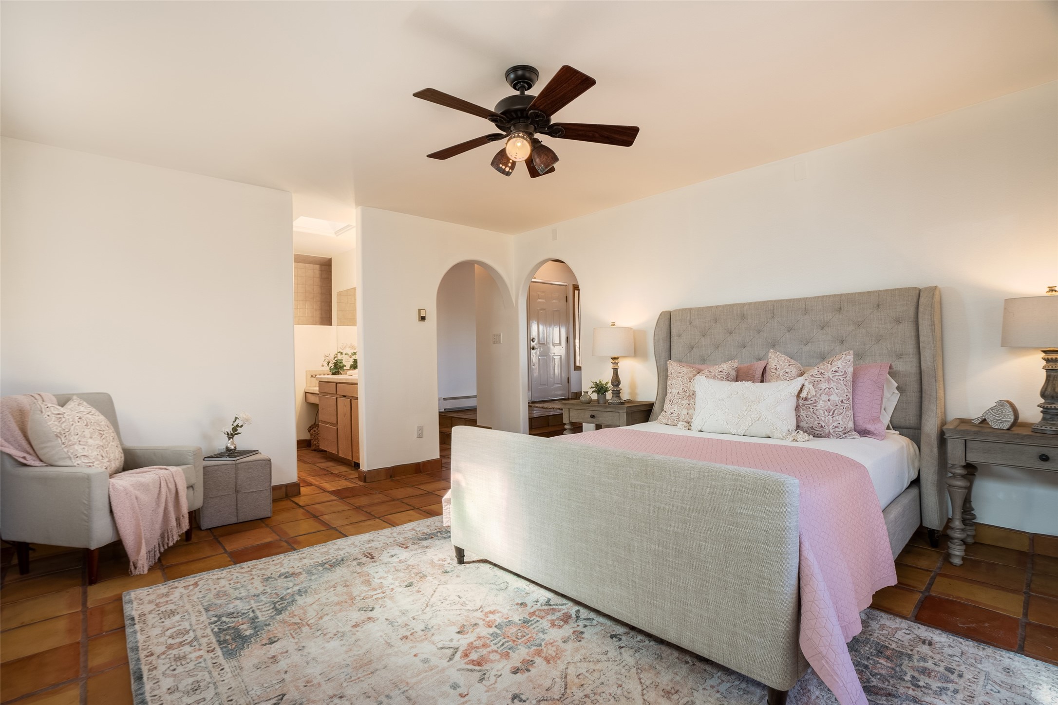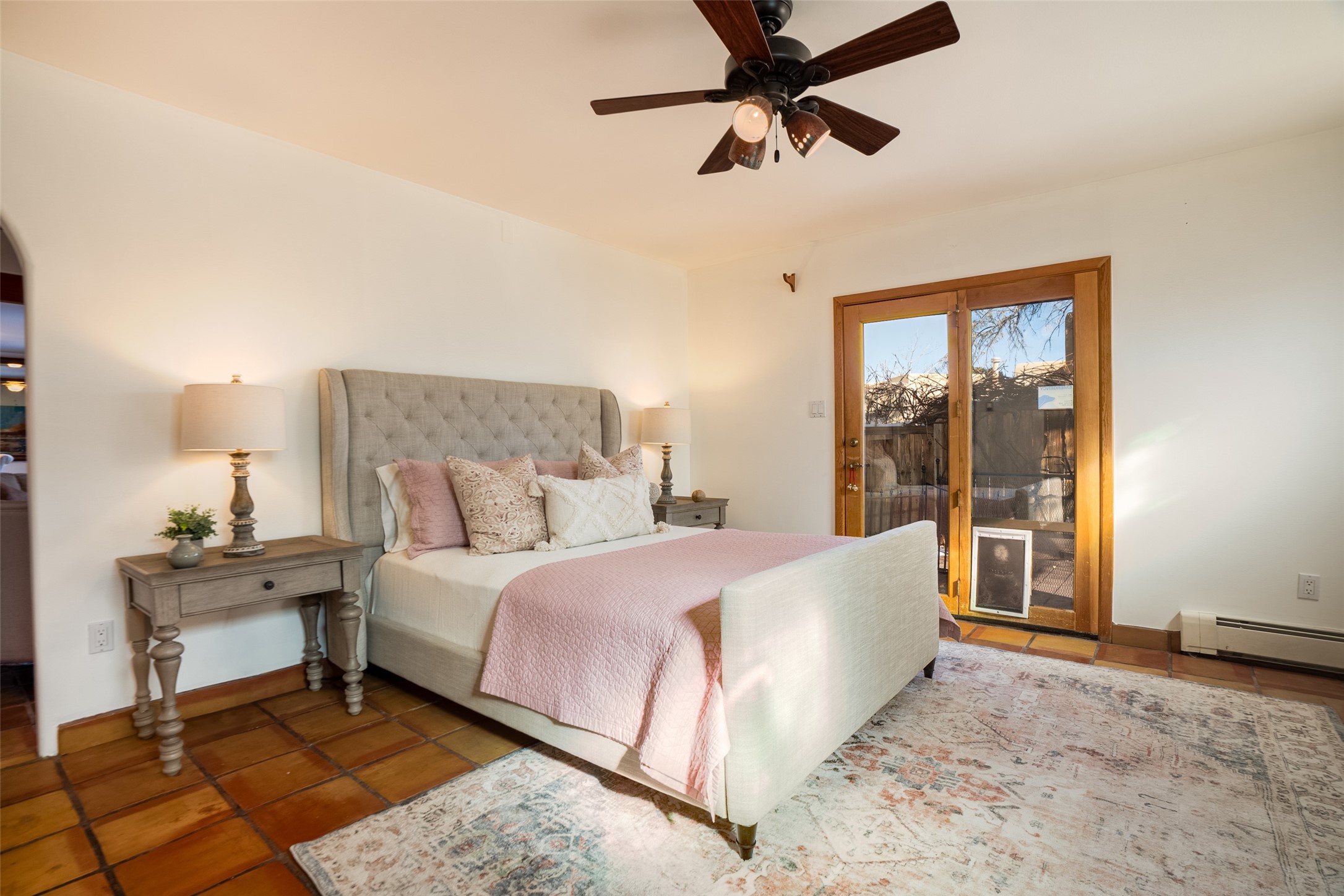 This stand alone home has a lovely floor plan with a bedroom on each side of the spacious Great Room, Dining Room and Kitchen There are only two stairs in the whole house and there is an oversized, attached, two car garage. The floors throughout are Saltillo tile. The Living Room has a tongue-in-groove wood ceiling with beams between the rooms and a corner fireplace for cozy winter evenings. The dining room has a French door leading to a large wrap-around and freshly painted deck, fenced for privacy and lined with abundant grapevines. The kitchen has a bar that separates it from the dining room but is open and could be perfect for entertaining. Sellers recently had the whole house painted.Park Plazas is a unique oasis, centrally located in Santa Fe. With miles of walking trails, an off-leash dog park, tennis and pickleball courts and a community garden this neighborhood is the perfect mix of city and country living. Don't miss this home!