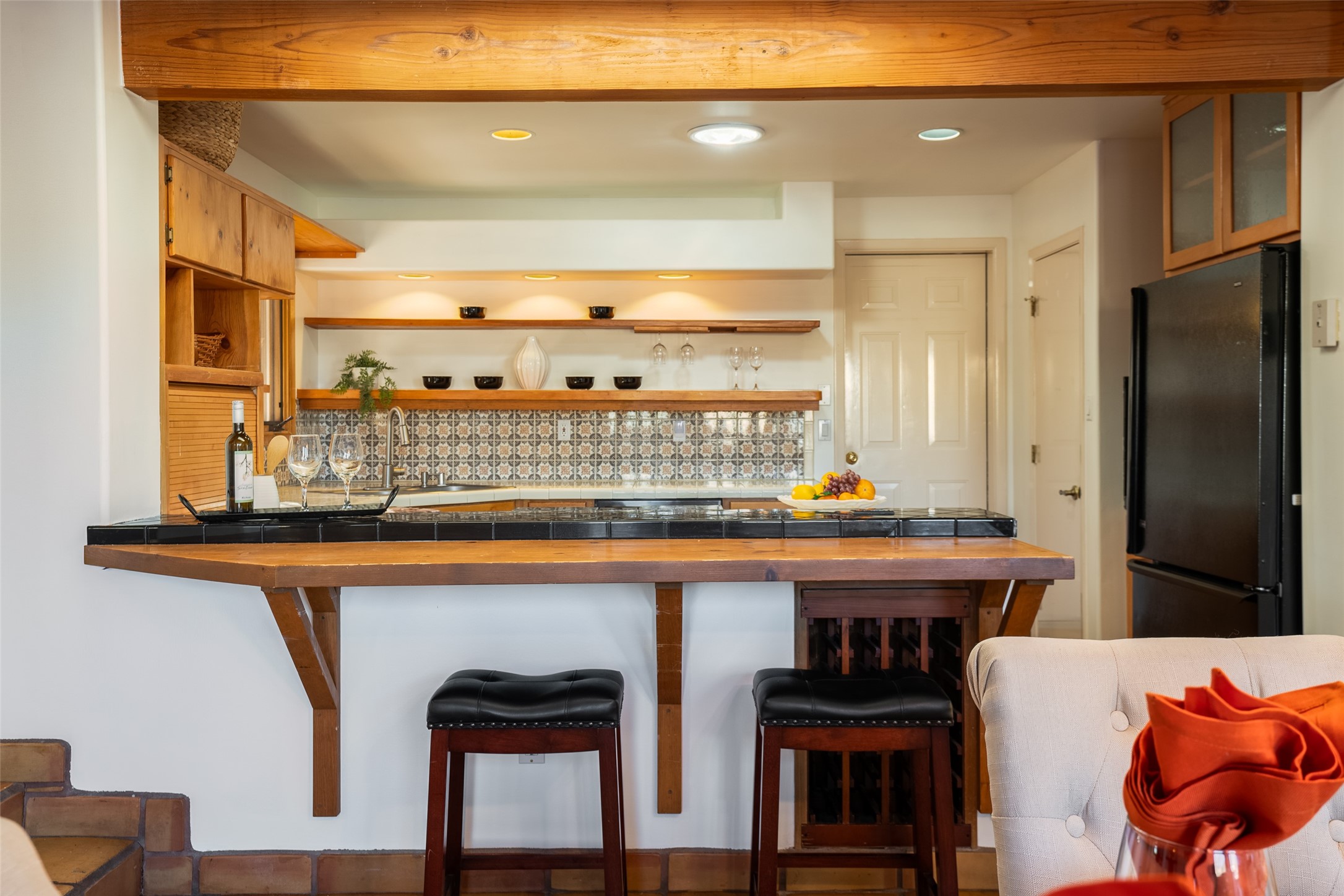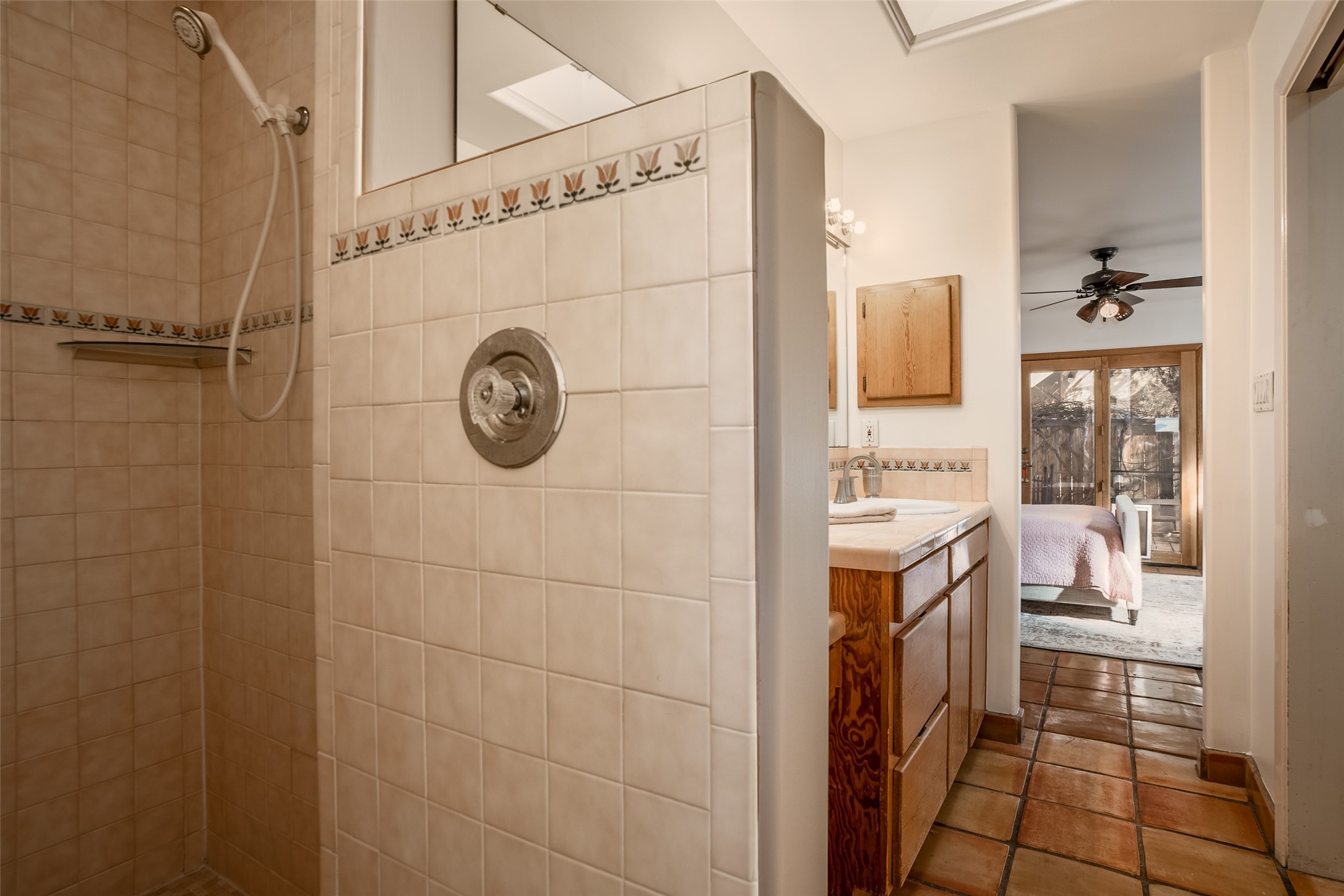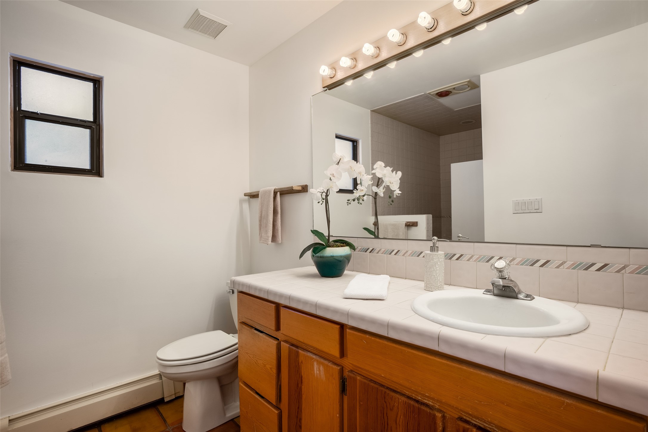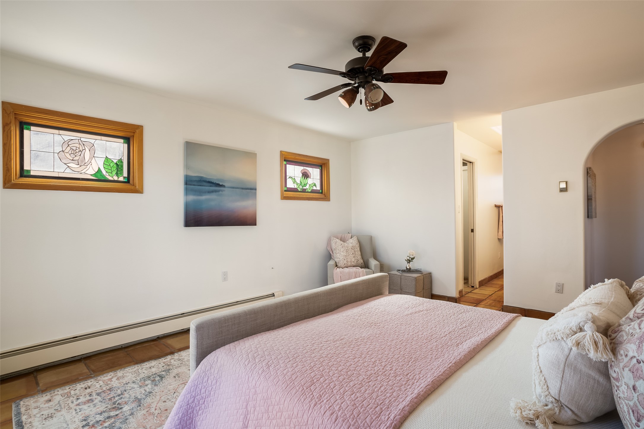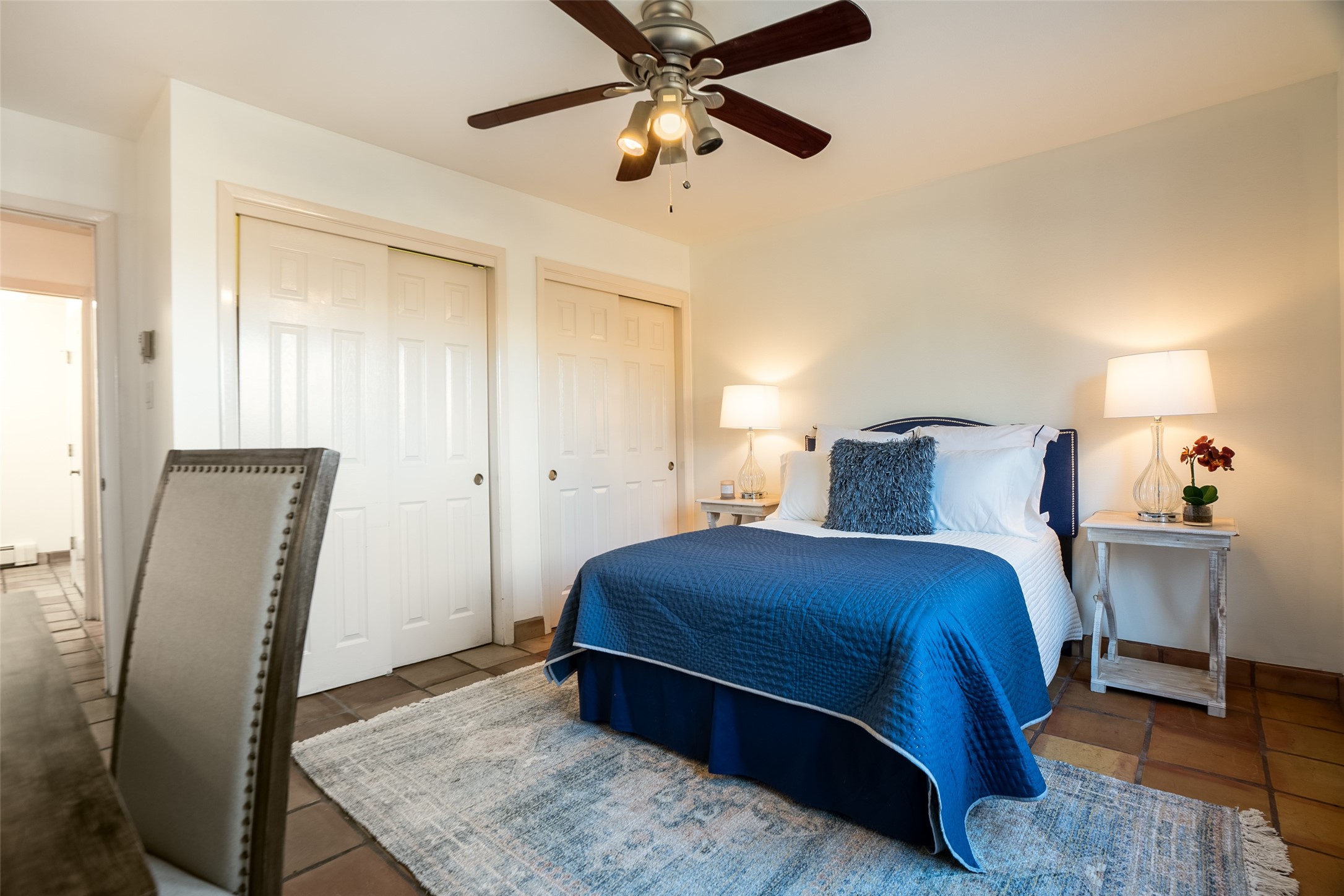 This stand alone home has a lovely floor plan with a bedroom on each side of the spacious Great Room, Dining Room and Kitchen There are only two stairs in the whole house and there is an oversized, attached, two car garage. The floors throughout are Saltillo tile. The Living Room has a tongue-in-groove wood ceiling with beams between the rooms and a corner fireplace for cozy winter evenings. The dining room has a French door leading to a large wrap-around and freshly painted deck, fenced for privacy and lined with abundant grapevines. The kitchen has a bar that separates it from the dining room but is open and could be perfect for entertaining. Sellers recently had the whole house painted.Park Plazas is a unique oasis, centrally located in Santa Fe. With miles of walking trails, an off-leash dog park, tennis and pickleball courts and a community garden this neighborhood is the perfect mix of city and country living. Don't miss this home!