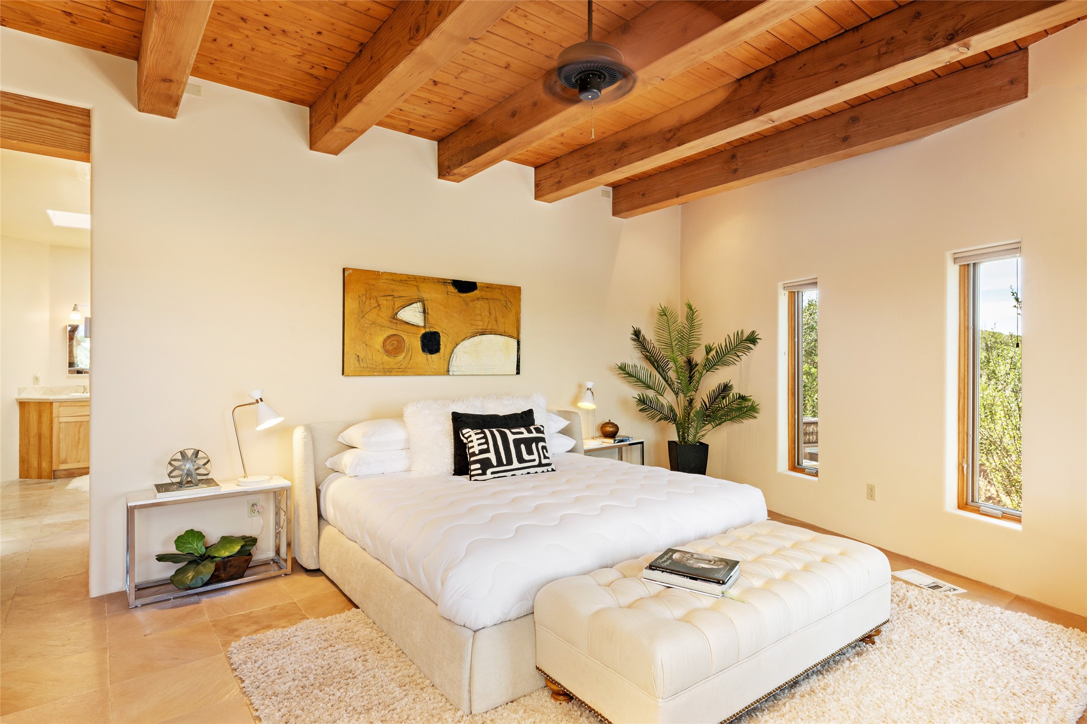 THIS LAS CAMPANAS SINGLE LEVEL HOME OPENS UP TO THE EXPANSIVE JEMEZ VIEWS AND WIDE-OPEN SKY OF SANTA FE! Welcome to the home of sweet dreams in Las Campanas, a prestigious gated community in Santa Fe, New Mexico. This stunning property offers unparalleled views of the Jemez Mountains and the surrounding natural beauty. Situated on a spacious 3-acre lot at the end of a sleepy cul-de-sac, this home is a peaceful oasis that invites you to relax and enjoy the serene lifestyle. This home features 3 bedrooms, a great office and 2.5 bathrooms. The interior design is a perfect blend of contemporary and traditional Santa Fe style, with high ceilings, vigas & beams, plaster walls, stone floors, fireplaces and skylights. The open floor plan allows for easy flow between the living room, dining room, and kitchen, creating a great space for entertaining or family gatherings. The gourmet kitchen is equipped with stainless steel appliances, granite countertops and a walk-in pantry. The master suite is a luxurious retreat with a fireplace, a walk-in closet and a spa-like bathroom with a soaking tub, a separate shower and dual sinks. The other two bedrooms are spacious and share a full bathroom. The outdoor living space is equally impressive, with a covered portal featuring a cozy seating area with a fireplace and an outdoor dining area that provides shade and comfort for the perfect indoor/outdoor lifestyle. The backyard is landscaped with native plants and trees that blend seamlessly with the natural surroundings. Walk for miles on the nearby trail system. From here, you can enjoy the spectacular views of the mountains and sunset. This home is truly a gem in Las Campanas, where members can enjoy the amenities of the private club - arranged separately and by invitation with the club - which offers 2 Jack Nicholus golf courses, the equestrian center, spa and tennis. Don't miss this opportunity to own this exquisite property that combines luxury, comfort and elegance.
