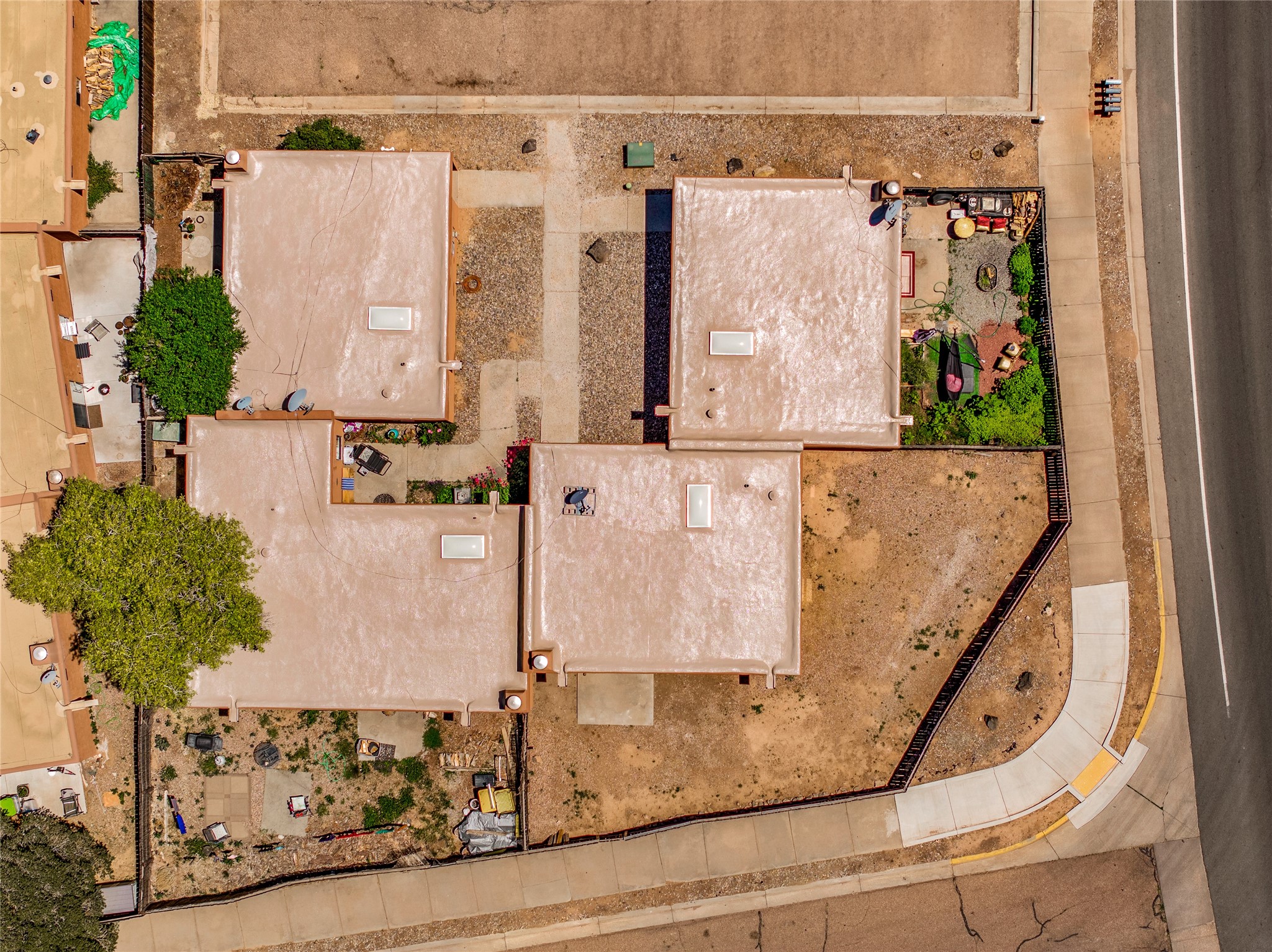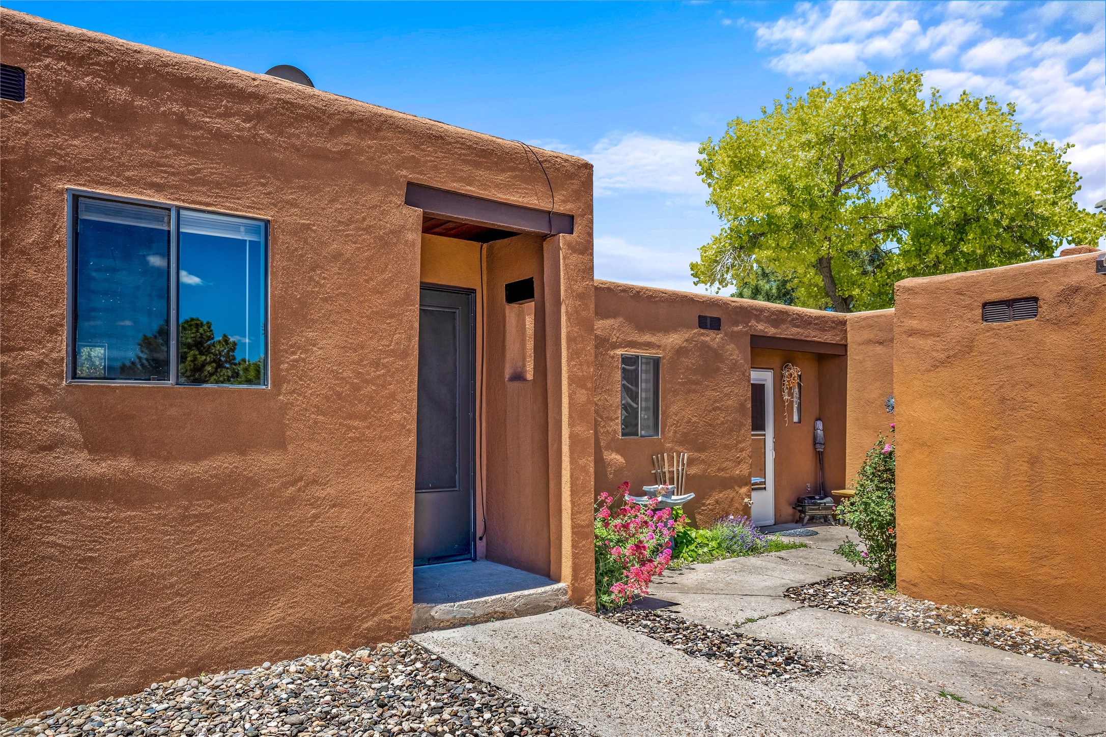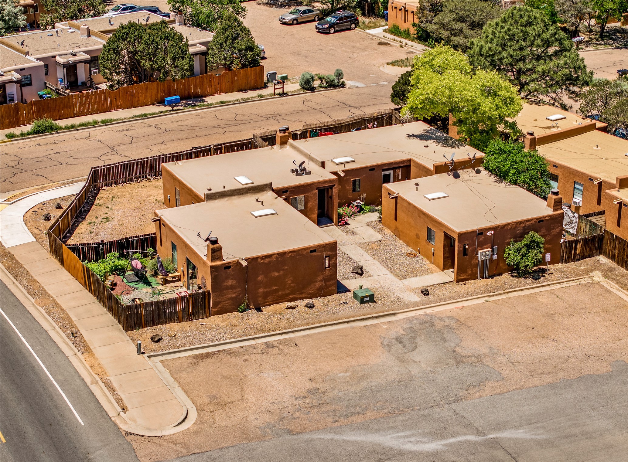 Santa Fe Investors! Fantastic four-plex opportunity with (1) 2 bed/1.75 bath unit and (3) 1 bed/ 1 bath units. Move into the 2 bed/1.75 bath yourself ( vacant as of Dec. 2023) or start a fresh lease with a new tenant. All kitchen counters, tile work and cabinetry have been renovated along with the bathrooms. Each unit has a cosy kiva fireplace, washer/dryer and access to private fenced yards. They're well laid-out, with open living rooms, beamed wooden ceilings and kitchens with skylights and plenty of counter space. Check photo of the roof with the 10 year roof warranty that's transferable to the next owner. Utilities are separately metered, except for water which is billed by the owner. Fabulous central location:12 minutes to the Santa Fe Plaza, supermarket shopping just across St. Francis Drive, and Target andTrader Joe's only 7 min. The Chavez Community Center, with community and fitness programs, pools and ice rink is even closer. Great location for commuters with easy access to St. Francis Drive and I-25.