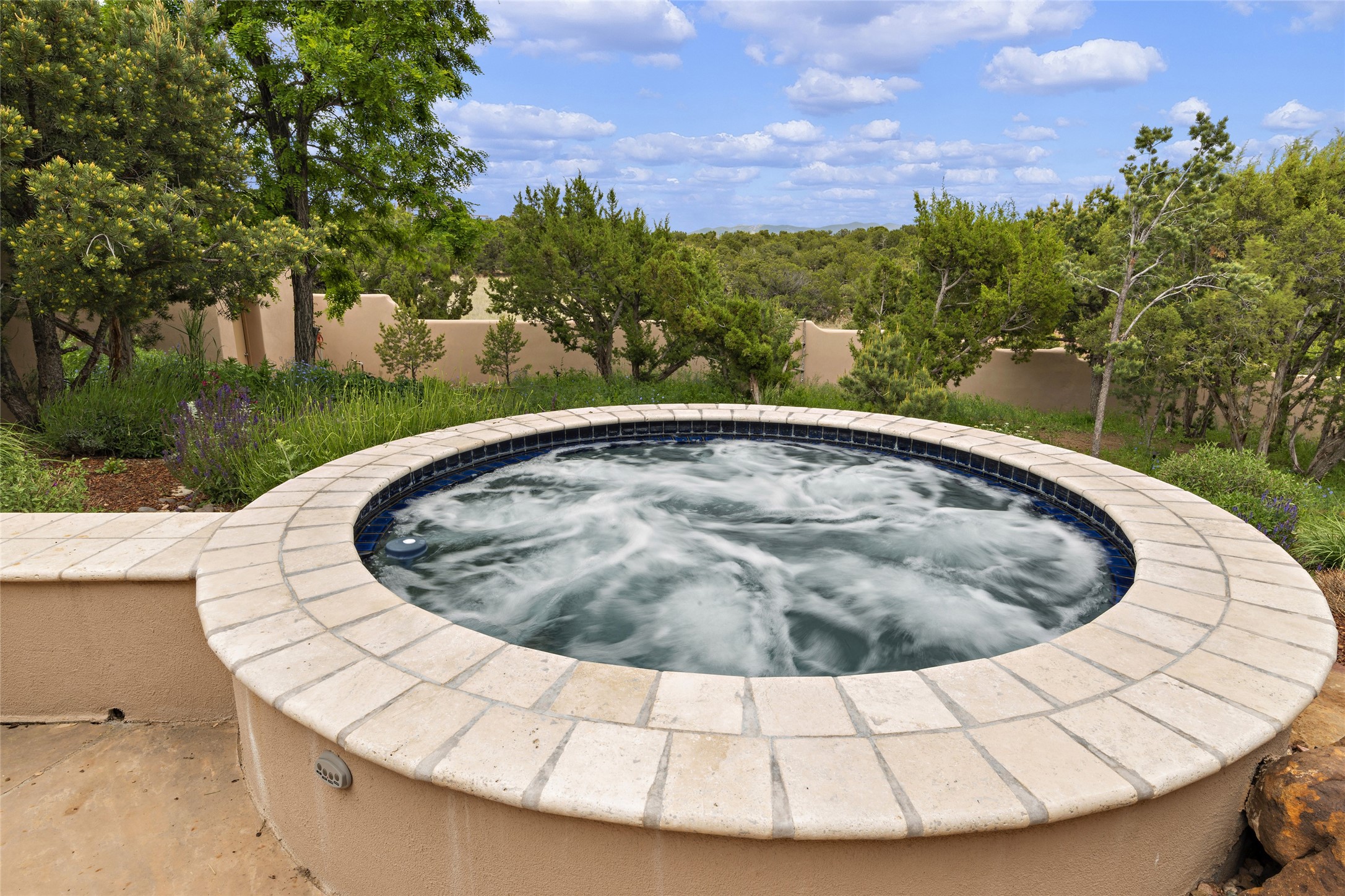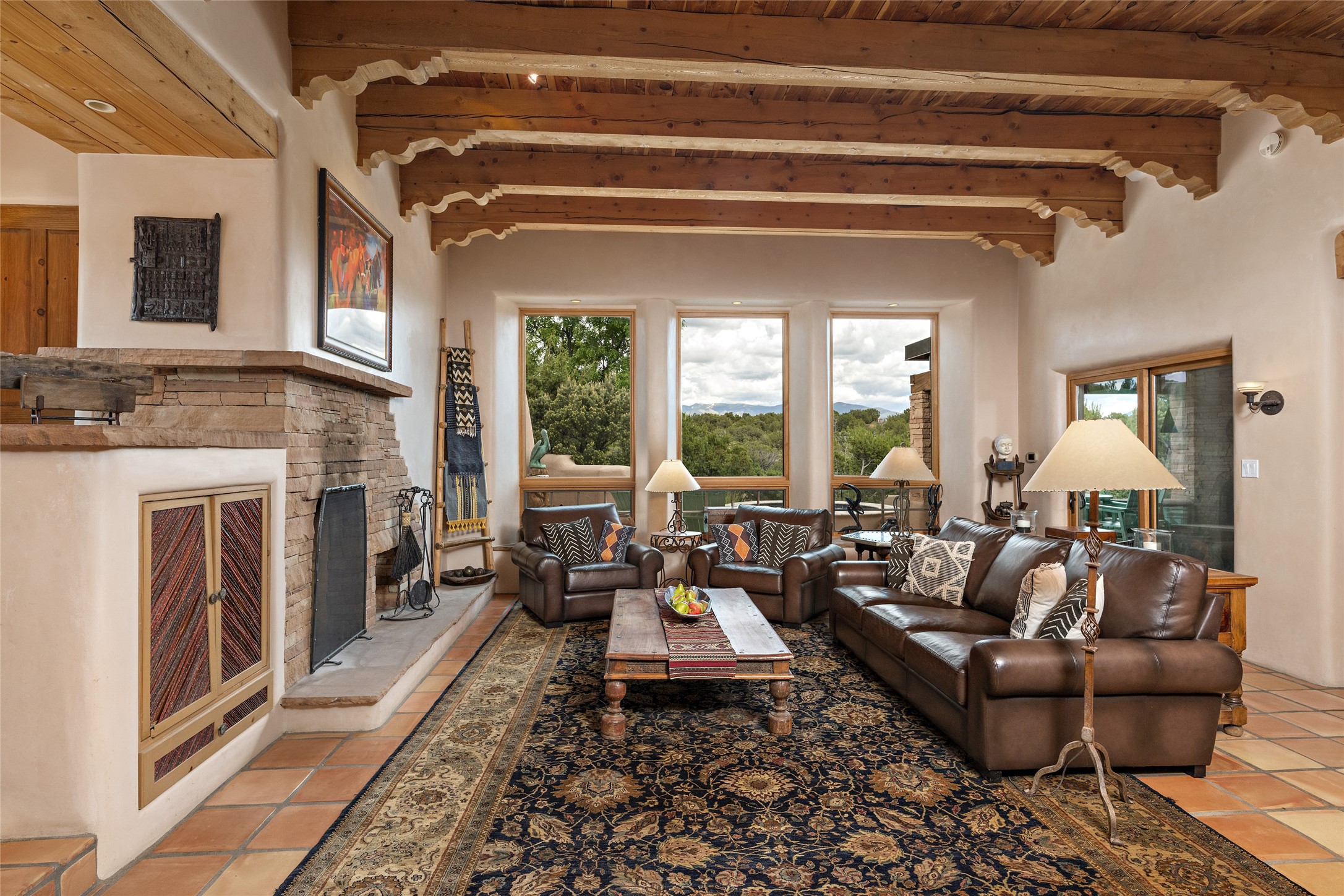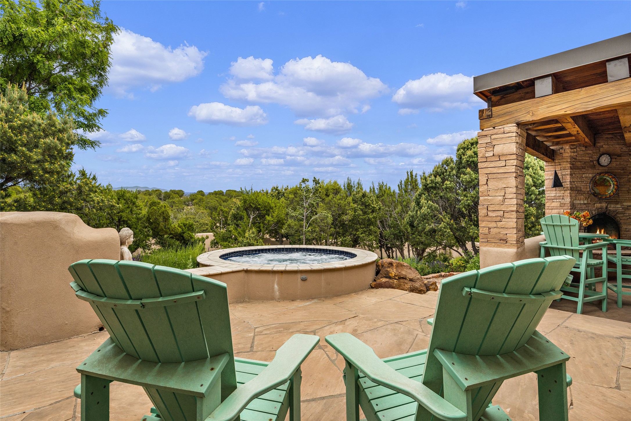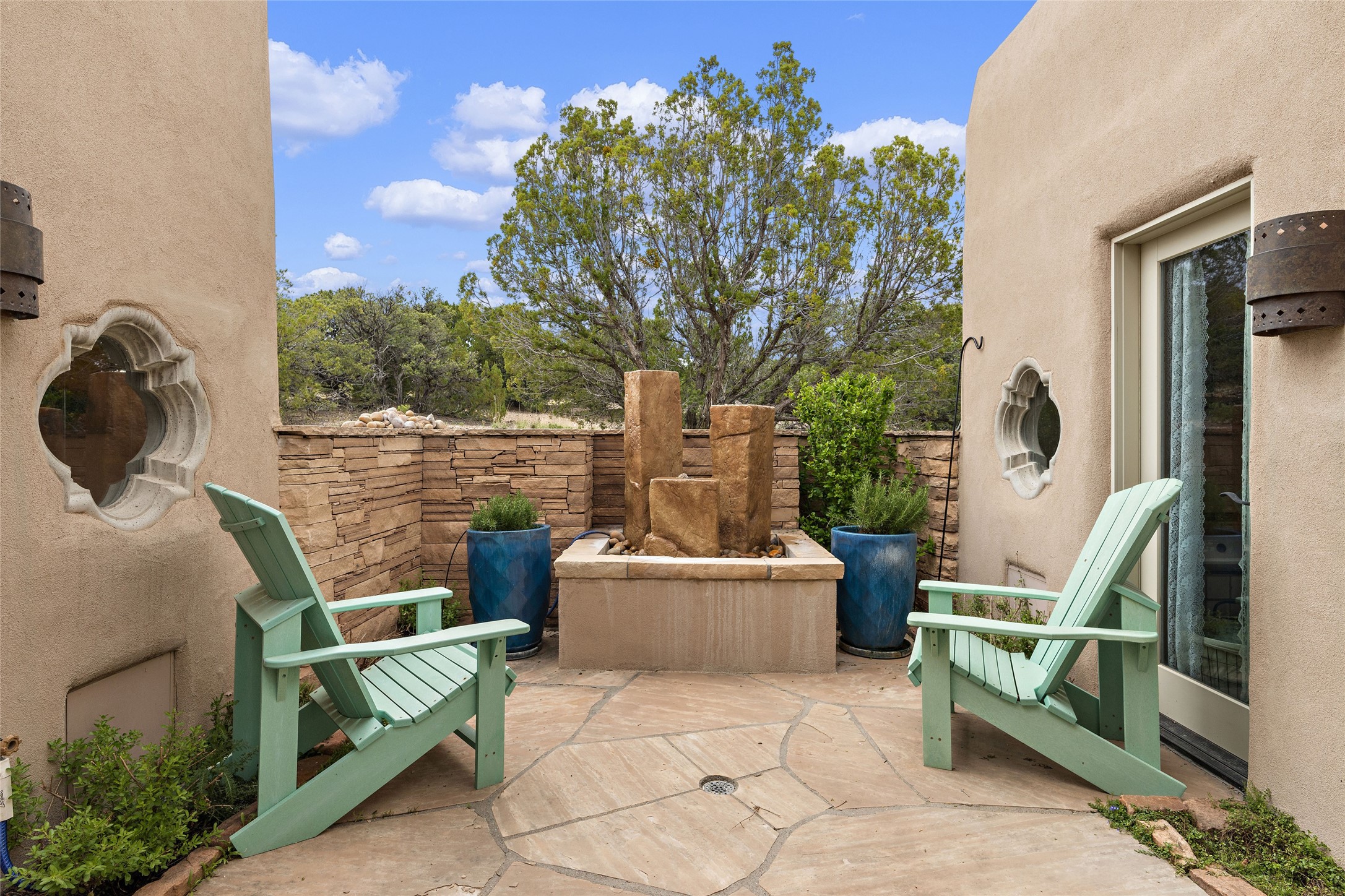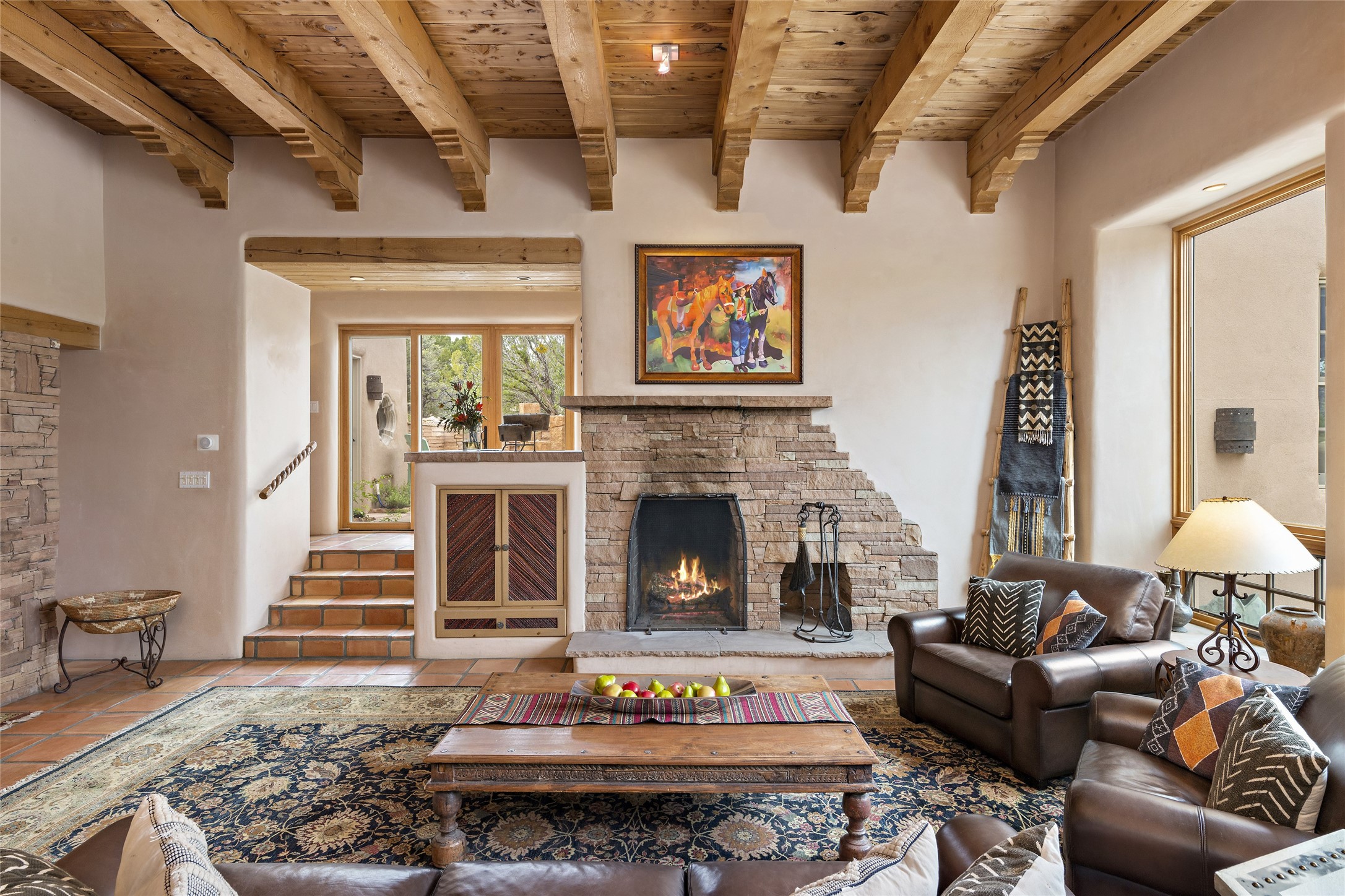 Conveniently located 12 minutes from the heart of Santa Fe in Estates II of Las Campanas. Traditional Northern New Mexico architectural elements abound. A long portal leads to a custom front door opening into a beautiful entry foyer, with glorious views of the Sangre de Cristo Mountains, an Anasazi inspired stacked stone column, latilla ceiling, and access to the great room beyond with beam and corbel ceiling, salt cedar cabinet, and Saltillo tile floors. The great room, with its beautiful stacked stone fireplace, has separate areas for living and dining, and access to the back portal with walled gardens, wood burning fireplace and a relaxing spa. Hand-troweled plaster walls throughout, six raised hearth fireplaces, vigas, coved ceilings, and multiple flagstone patios create a warm and inviting home. The kitchen with its center island and cozy breakfast area with a kiva fireplace, provides lovely views of the garden. There is excellent separation for each of the three bedrooms. Off the great room is a bedroom corridor, opening to an enchanting courtyard with impressive stone water feature, and a primary suite at either end. Each suite has a fireplace, private patio, and bath with separate tub and shower. The third bedroom is en-suite and currently serves as a media room with Ortiz Mountain views. The home is surrounded by beautiful gardens with private patios and boasts a 3-car garage.