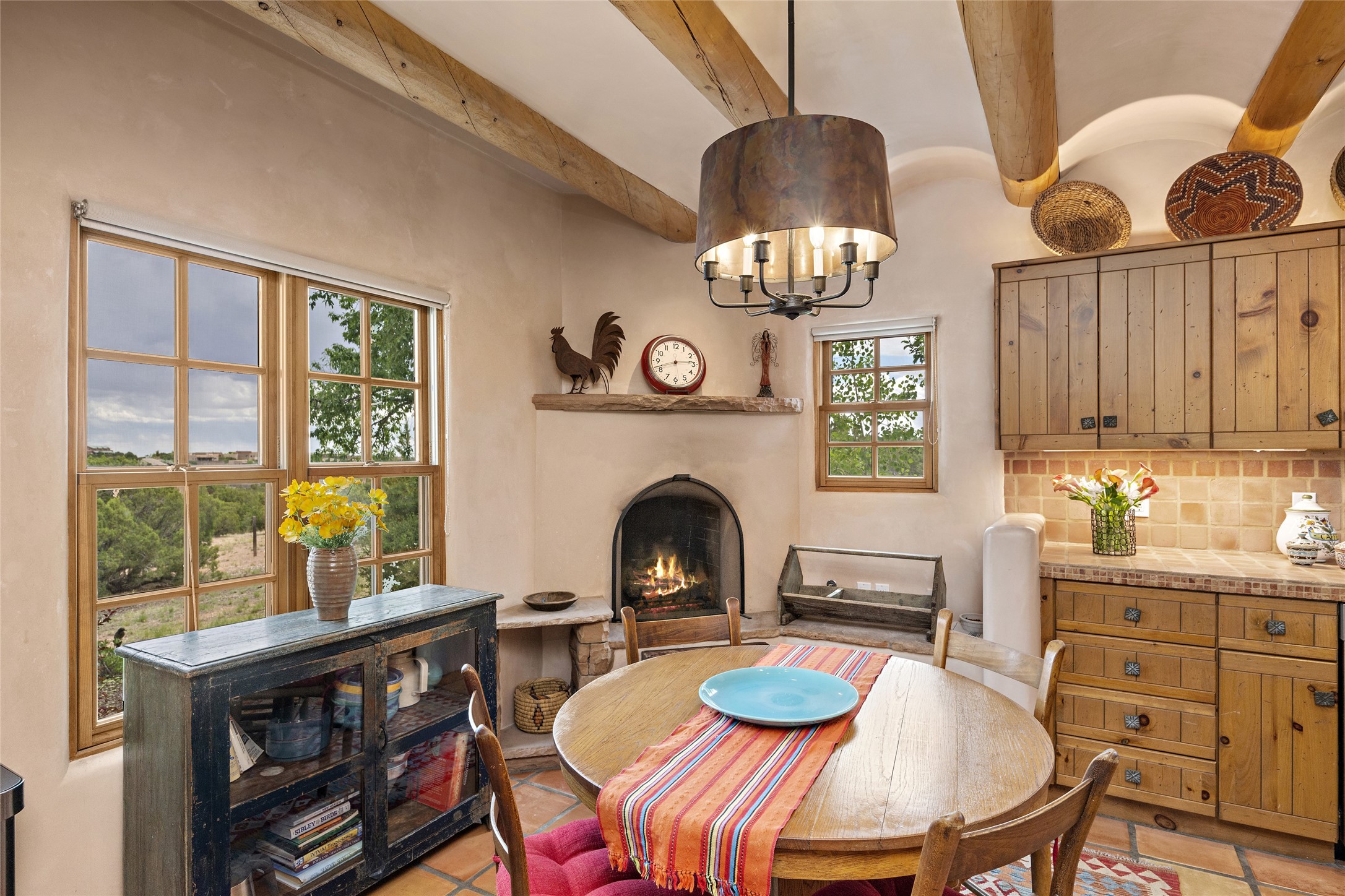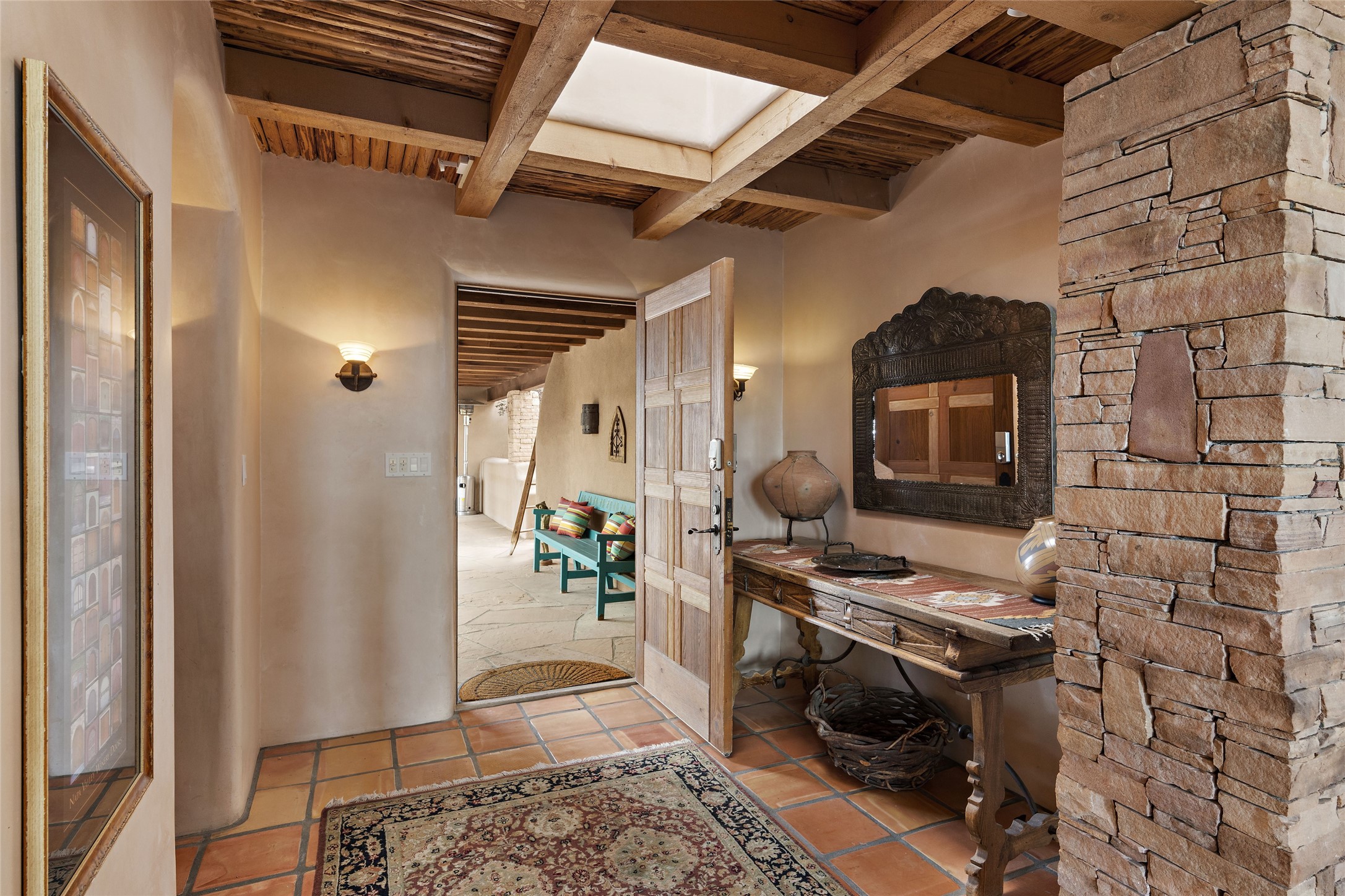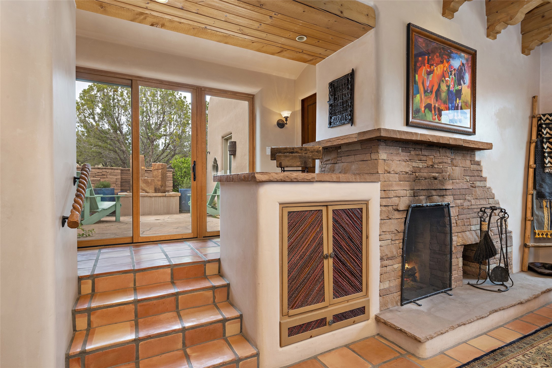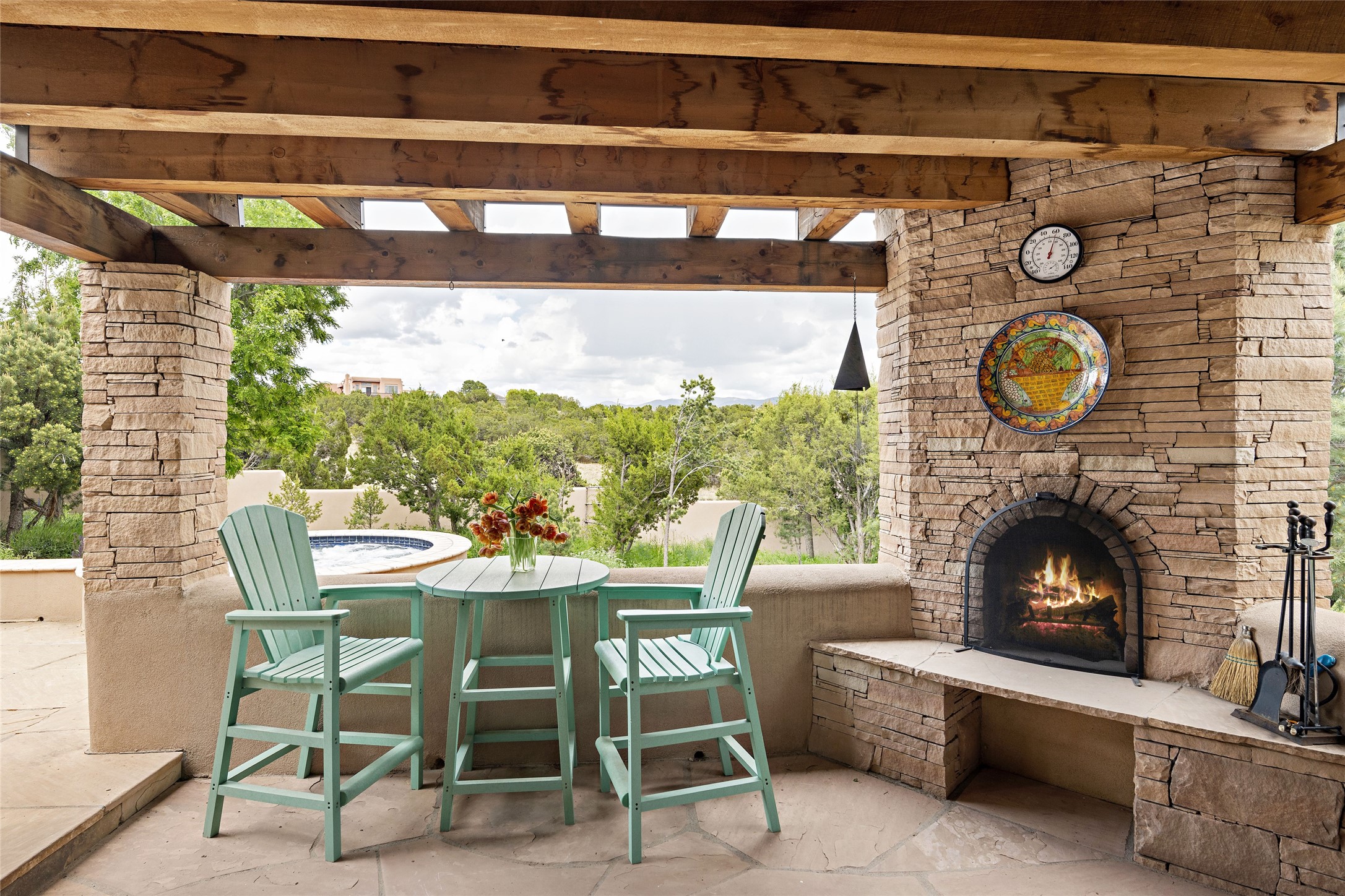 Conveniently located 12 minutes from the heart of Santa Fe in Estates II of Las Campanas. Traditional Northern New Mexico architectural elements abound. A long portal leads to a custom front door opening into a beautiful entry foyer, with glorious views of the Sangre de Cristo Mountains, an Anasazi inspired stacked stone column, latilla ceiling, and access to the great room beyond with beam and corbel ceiling, salt cedar cabinet, and Saltillo tile floors. The great room, with its beautiful stacked stone fireplace, has separate areas for living and dining, and access to the back portal with walled gardens, wood burning fireplace and a relaxing spa. Hand-troweled plaster walls throughout, six raised hearth fireplaces, vigas, coved ceilings, and multiple flagstone patios create a warm and inviting home. The kitchen with its center island and cozy breakfast area with a kiva fireplace, provides lovely views of the garden. There is excellent separation for each of the three bedrooms. Off the great room is a bedroom corridor, opening to an enchanting courtyard with impressive stone water feature, and a primary suite at either end. Each suite has a fireplace, private patio, and bath with separate tub and shower. The third bedroom is en-suite and currently serves as a media room with Ortiz Mountain views. The home is surrounded by beautiful gardens with private patios and boasts a 3-car garage.