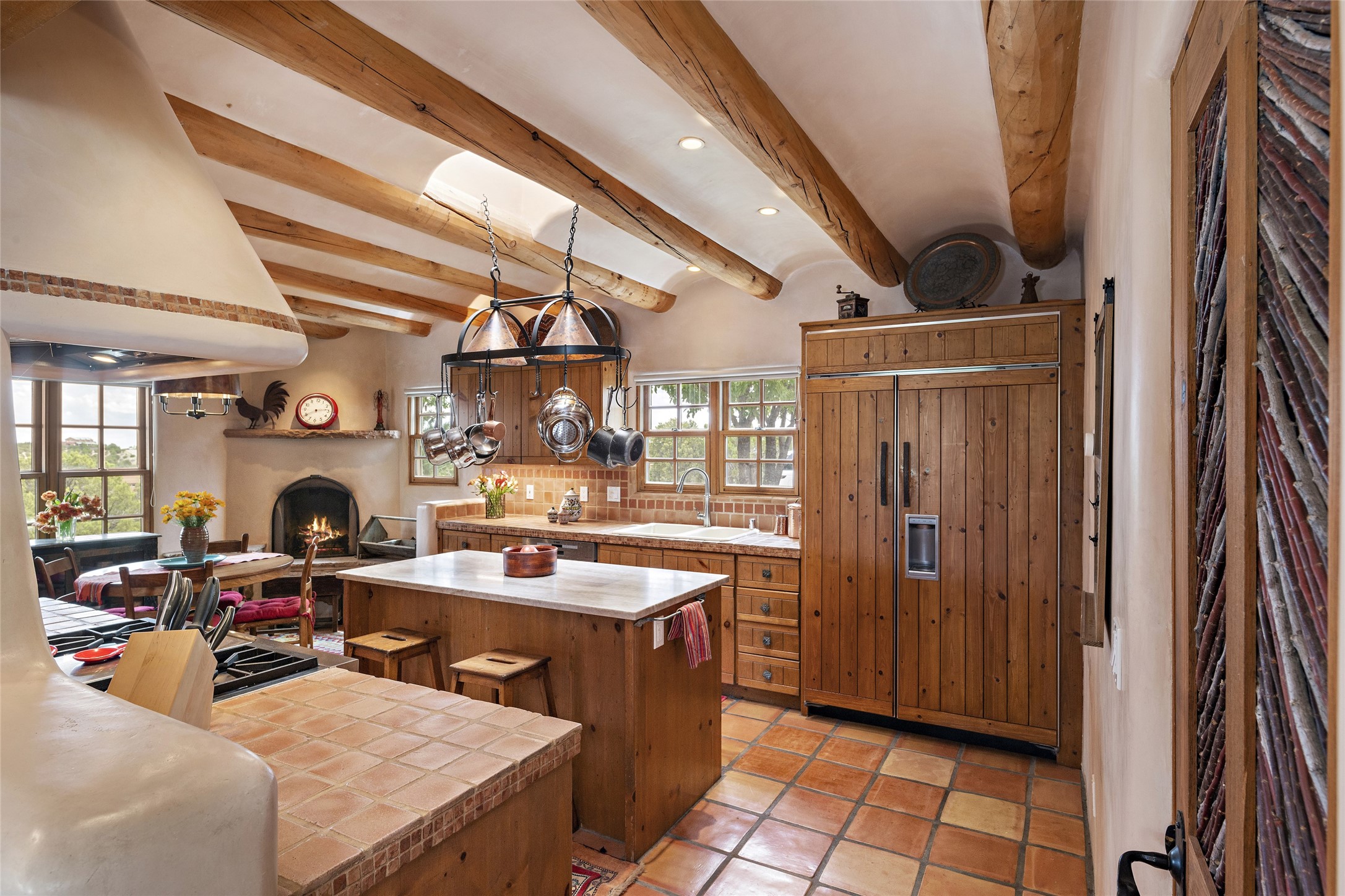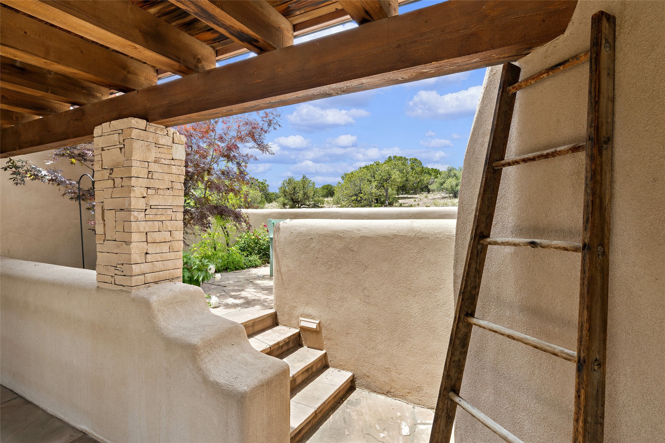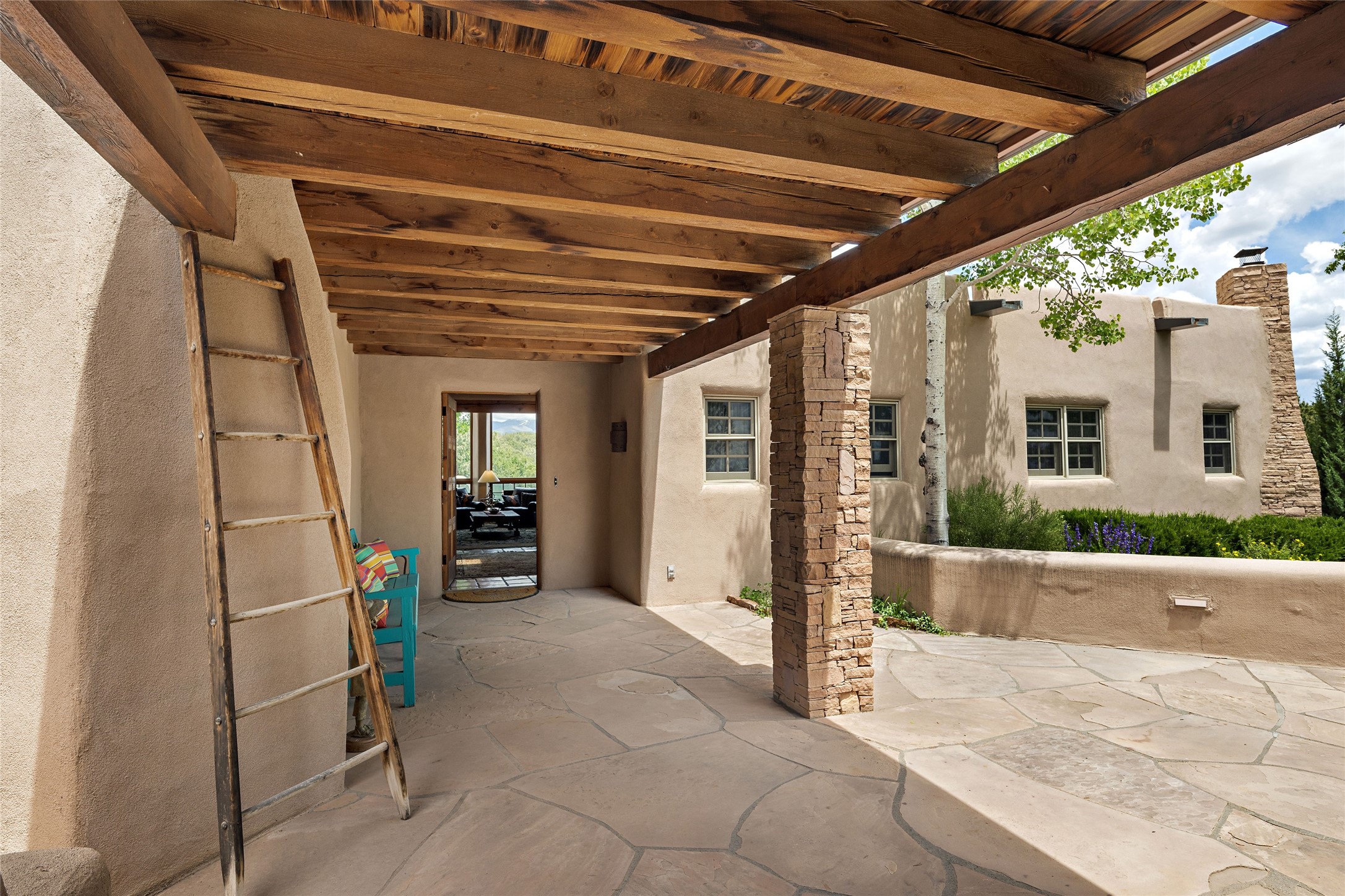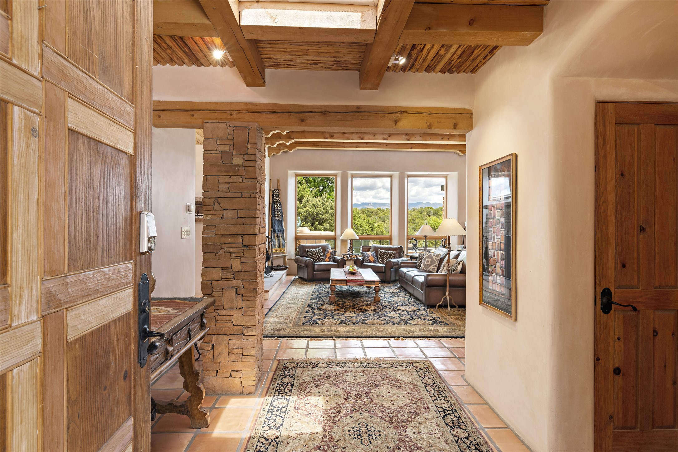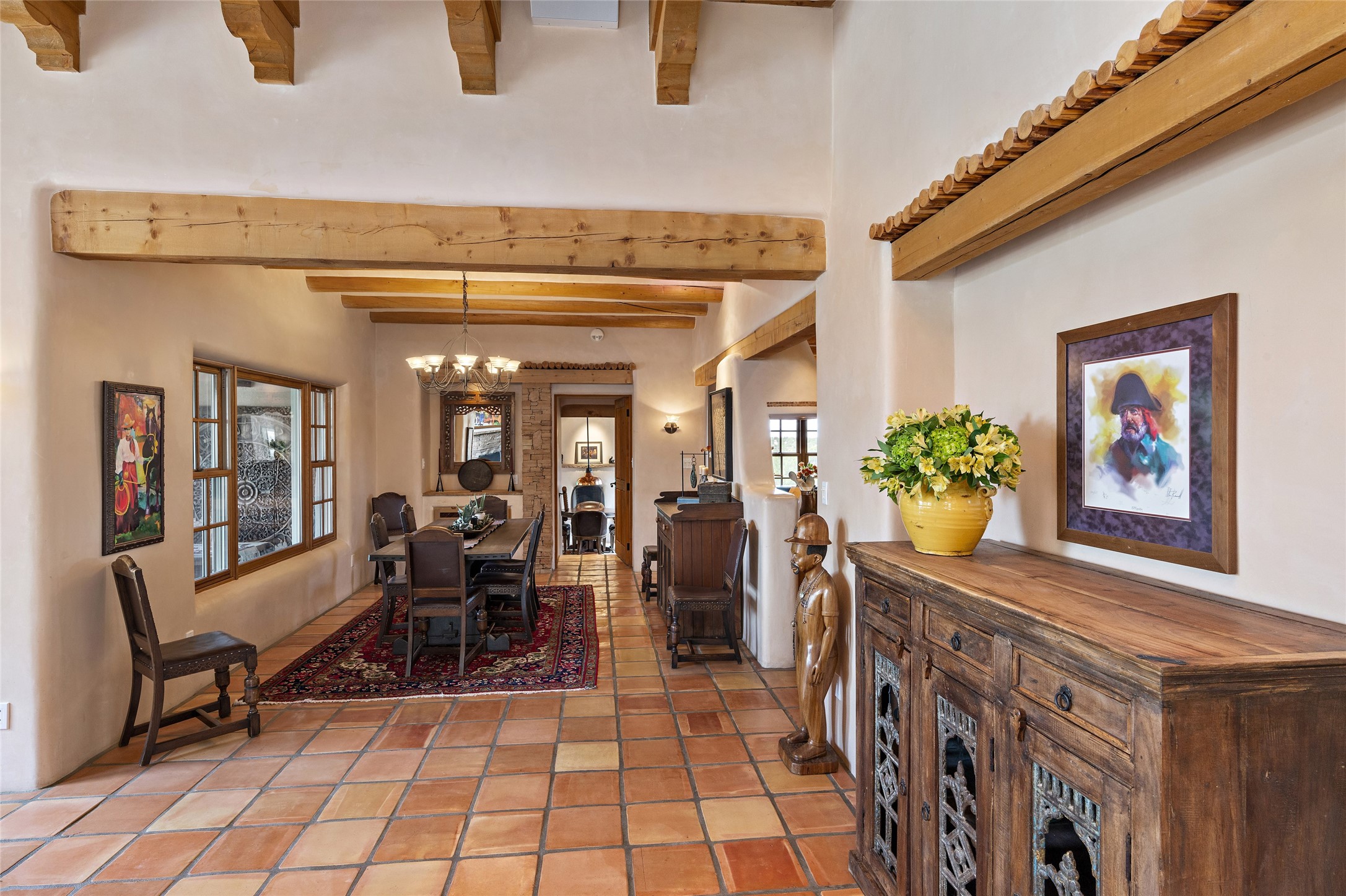 Conveniently located 12 minutes from the heart of Santa Fe in Estates II of Las Campanas. Traditional Northern New Mexico architectural elements abound. A long portal leads to a custom front door opening into a beautiful entry foyer, with glorious views of the Sangre de Cristo Mountains, an Anasazi inspired stacked stone column, latilla ceiling, and access to the great room beyond with beam and corbel ceiling, salt cedar cabinet, and Saltillo tile floors. The great room, with its beautiful stacked stone fireplace, has separate areas for living and dining, and access to the back portal with walled gardens, wood burning fireplace and a relaxing spa. Hand-troweled plaster walls throughout, six raised hearth fireplaces, vigas, coved ceilings, and multiple flagstone patios create a warm and inviting home. The kitchen with its center island and cozy breakfast area with a kiva fireplace, provides lovely views of the garden. There is excellent separation for each of the three bedrooms. Off the great room is a bedroom corridor, opening to an enchanting courtyard with impressive stone water feature, and a primary suite at either end. Each suite has a fireplace, private patio, and bath with separate tub and shower. The third bedroom is en-suite and currently serves as a media room with Ortiz Mountain views. The home is surrounded by beautiful gardens with private patios and boasts a 3-car garage.