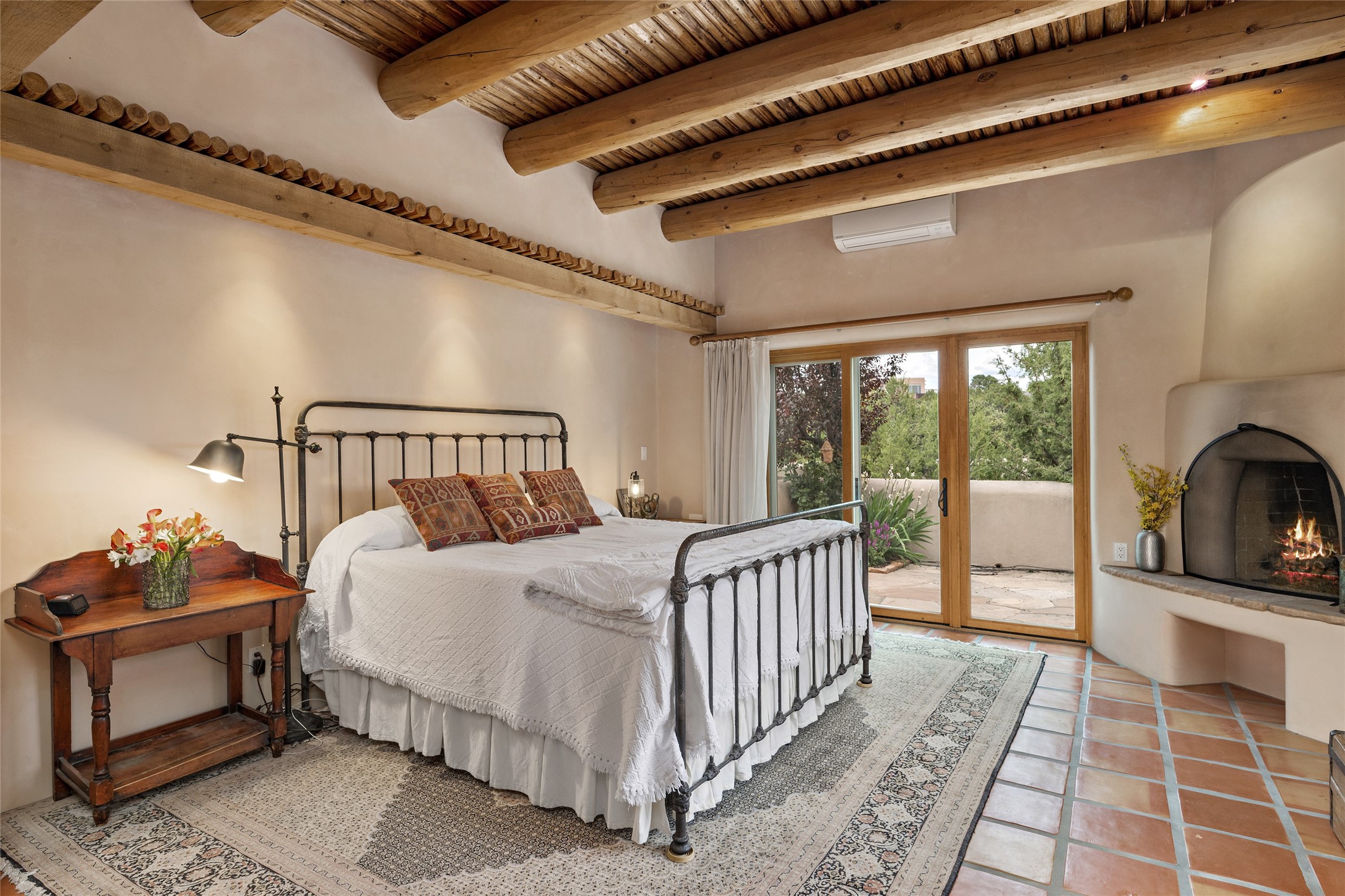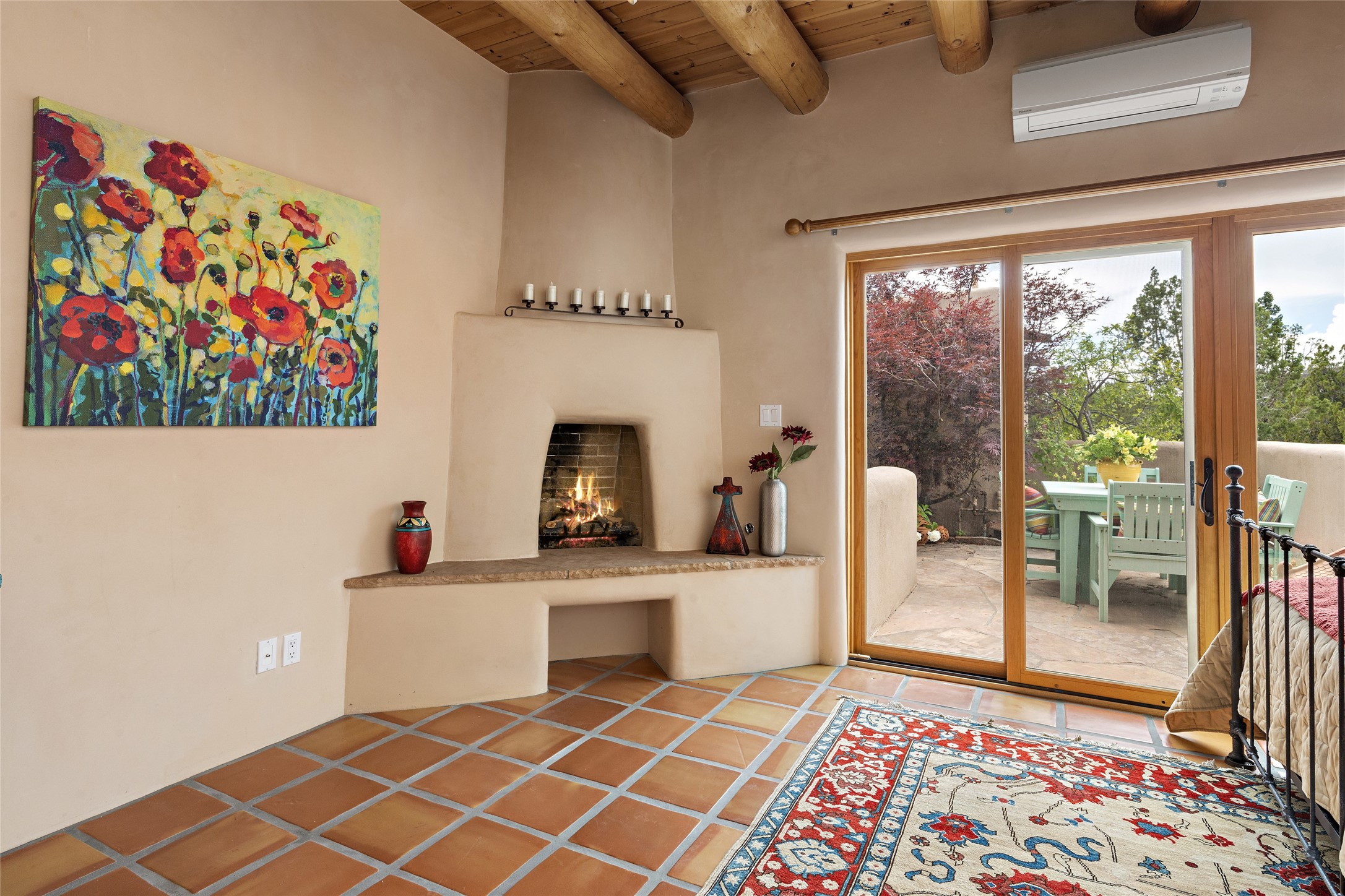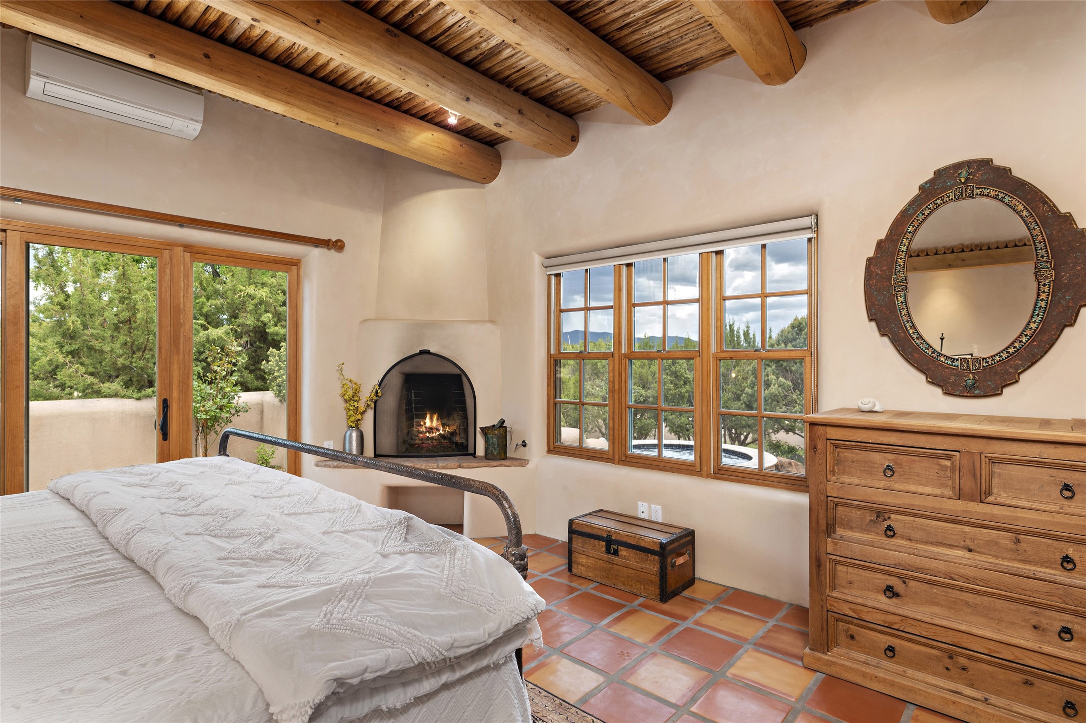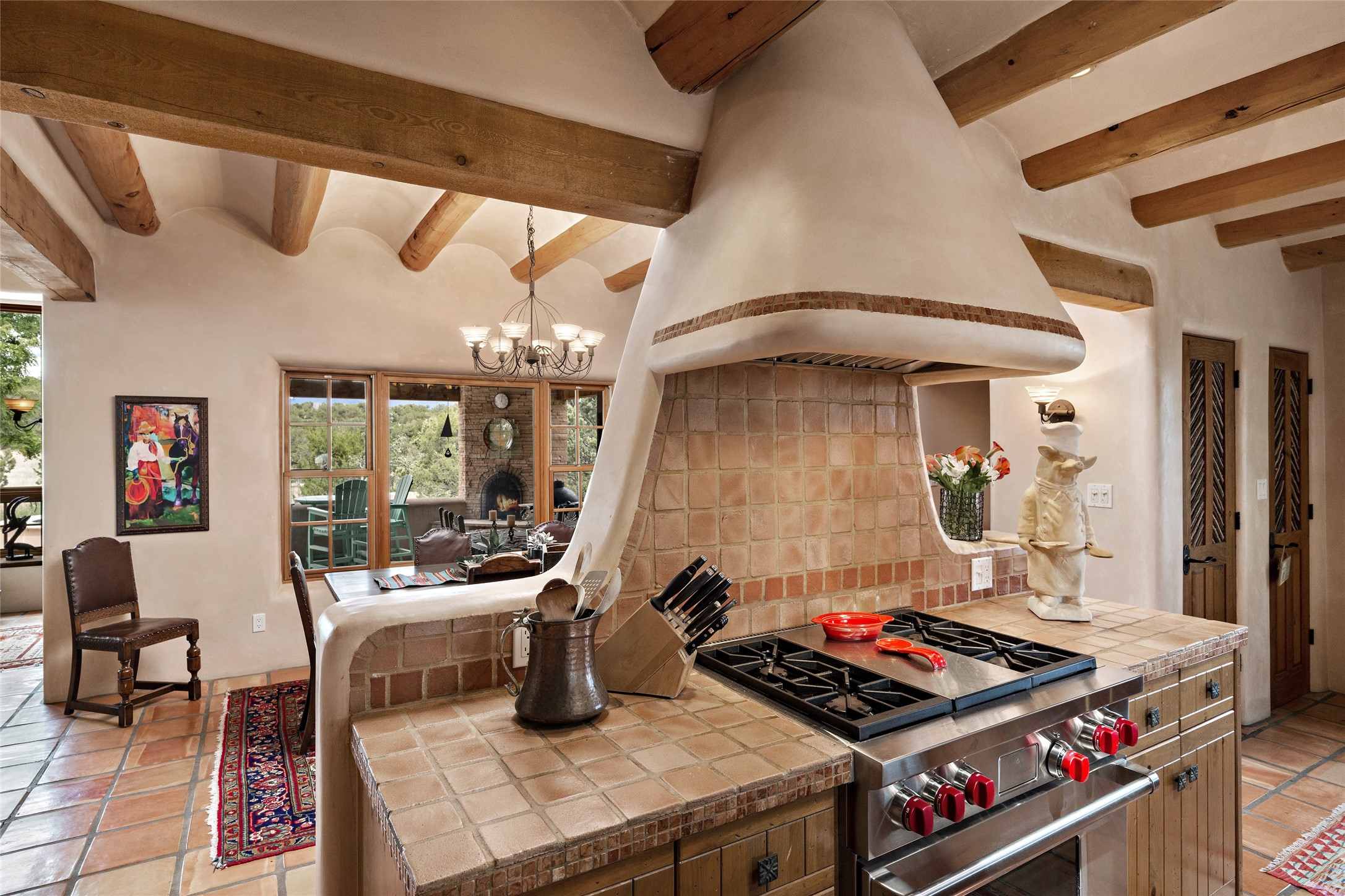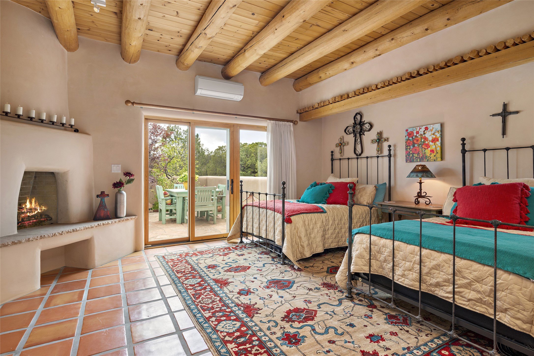 Conveniently located 12 minutes from the heart of Santa Fe in Estates II of Las Campanas. Traditional Northern New Mexico architectural elements abound. A long portal leads to a custom front door opening into a beautiful entry foyer, with glorious views of the Sangre de Cristo Mountains, an Anasazi inspired stacked stone column, latilla ceiling, and access to the great room beyond with beam and corbel ceiling, salt cedar cabinet, and Saltillo tile floors. The great room, with its beautiful stacked stone fireplace, has separate areas for living and dining, and access to the back portal with walled gardens, wood burning fireplace and a relaxing spa. Hand-troweled plaster walls throughout, six raised hearth fireplaces, vigas, coved ceilings, and multiple flagstone patios create a warm and inviting home. The kitchen with its center island and cozy breakfast area with a kiva fireplace, provides lovely views of the garden. There is excellent separation for each of the three bedrooms. Off the great room is a bedroom corridor, opening to an enchanting courtyard with impressive stone water feature, and a primary suite at either end. Each suite has a fireplace, private patio, and bath with separate tub and shower. The third bedroom is en-suite and currently serves as a media room with Ortiz Mountain views. The home is surrounded by beautiful gardens with private patios and boasts a 3-car garage.