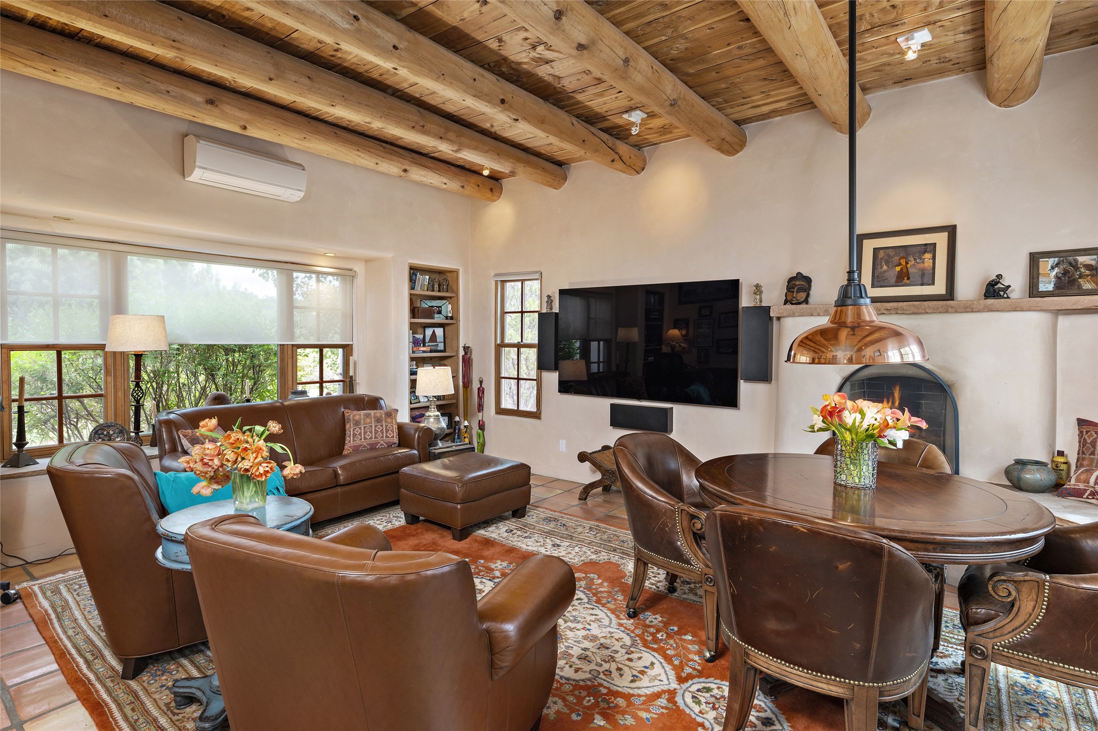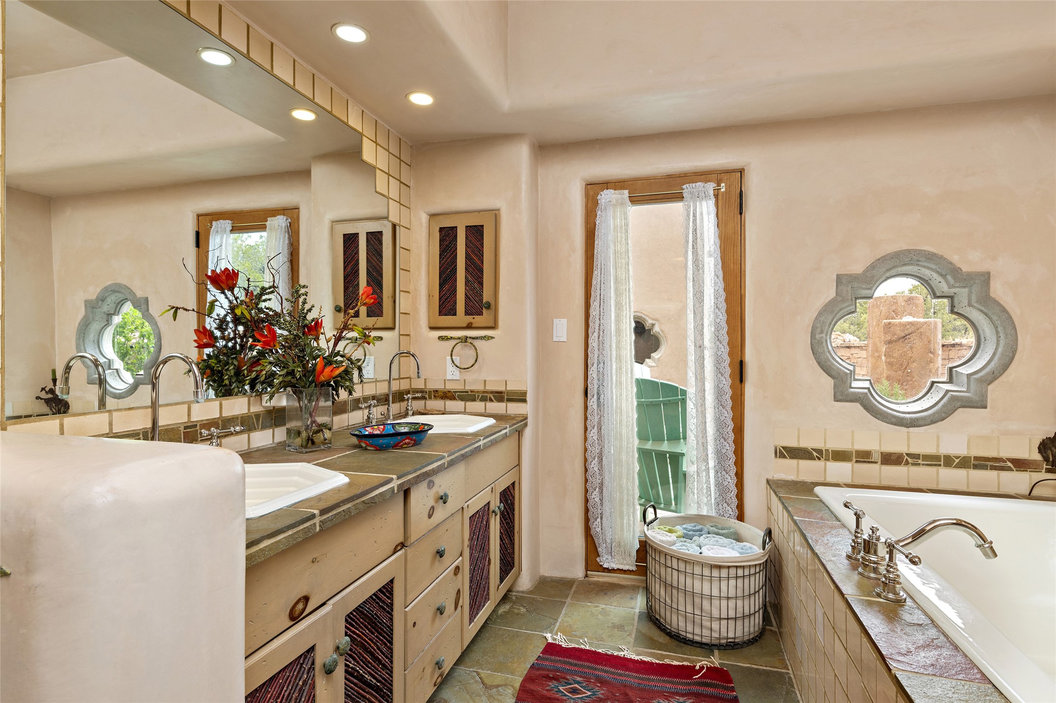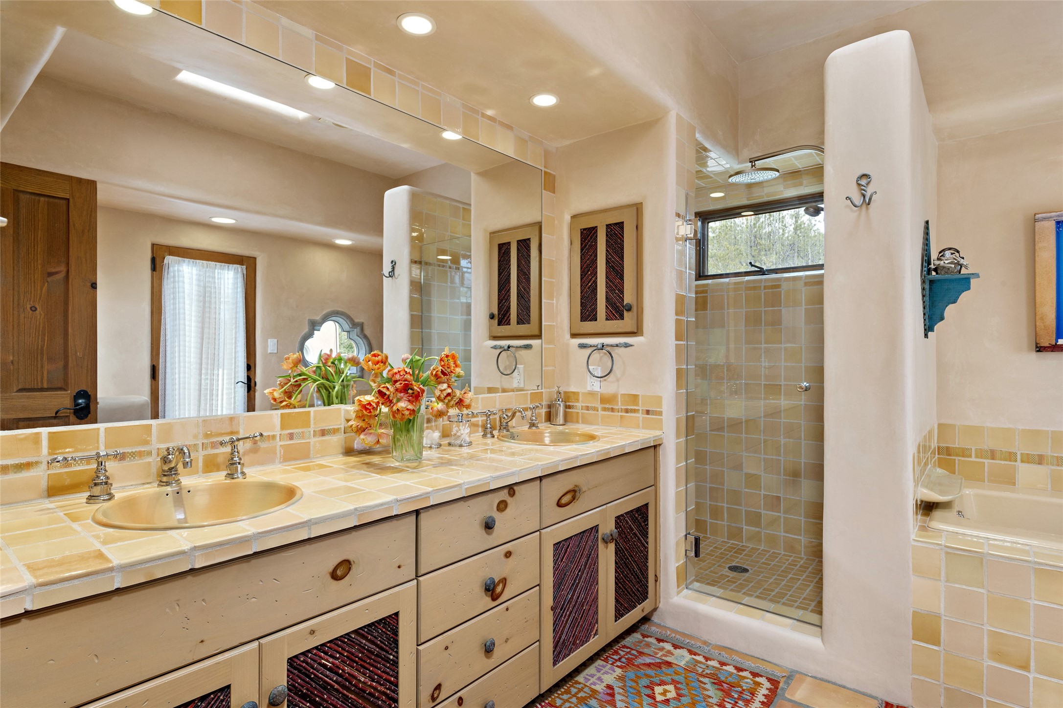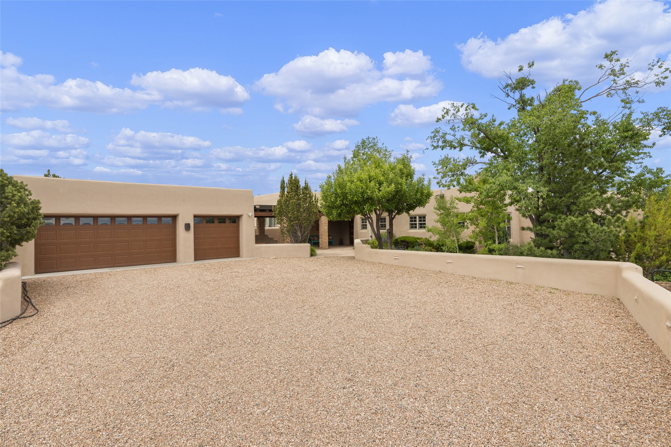 Conveniently located 12 minutes from the heart of Santa Fe in Estates II of Las Campanas. Traditional Northern New Mexico architectural elements abound. A long portal leads to a custom front door opening into a beautiful entry foyer, with glorious views of the Sangre de Cristo Mountains, an Anasazi inspired stacked stone column, latilla ceiling, and access to the great room beyond with beam and corbel ceiling, salt cedar cabinet, and Saltillo tile floors. The great room, with its beautiful stacked stone fireplace, has separate areas for living and dining, and access to the back portal with walled gardens, wood burning fireplace and a relaxing spa. Hand-troweled plaster walls throughout, six raised hearth fireplaces, vigas, coved ceilings, and multiple flagstone patios create a warm and inviting home. The kitchen with its center island and cozy breakfast area with a kiva fireplace, provides lovely views of the garden. There is excellent separation for each of the three bedrooms. Off the great room is a bedroom corridor, opening to an enchanting courtyard with impressive stone water feature, and a primary suite at either end. Each suite has a fireplace, private patio, and bath with separate tub and shower. The third bedroom is en-suite and currently serves as a media room with Ortiz Mountain views. The home is surrounded by beautiful gardens with private patios and boasts a 3-car garage.