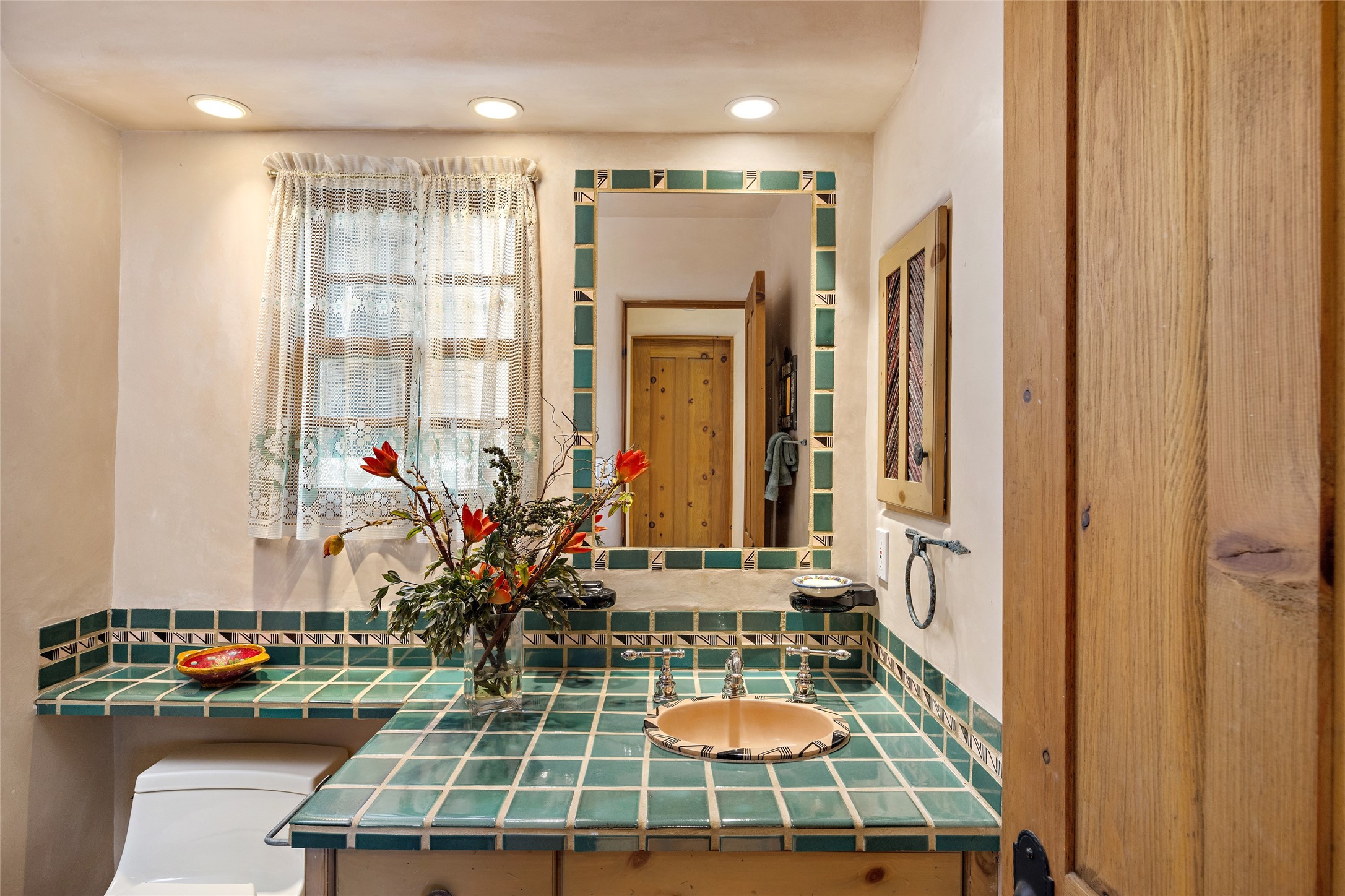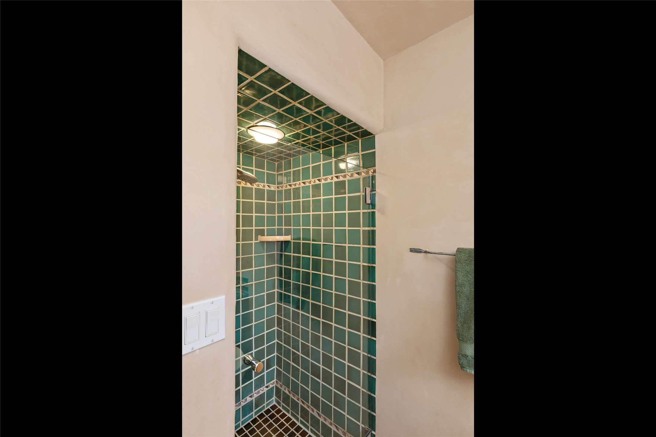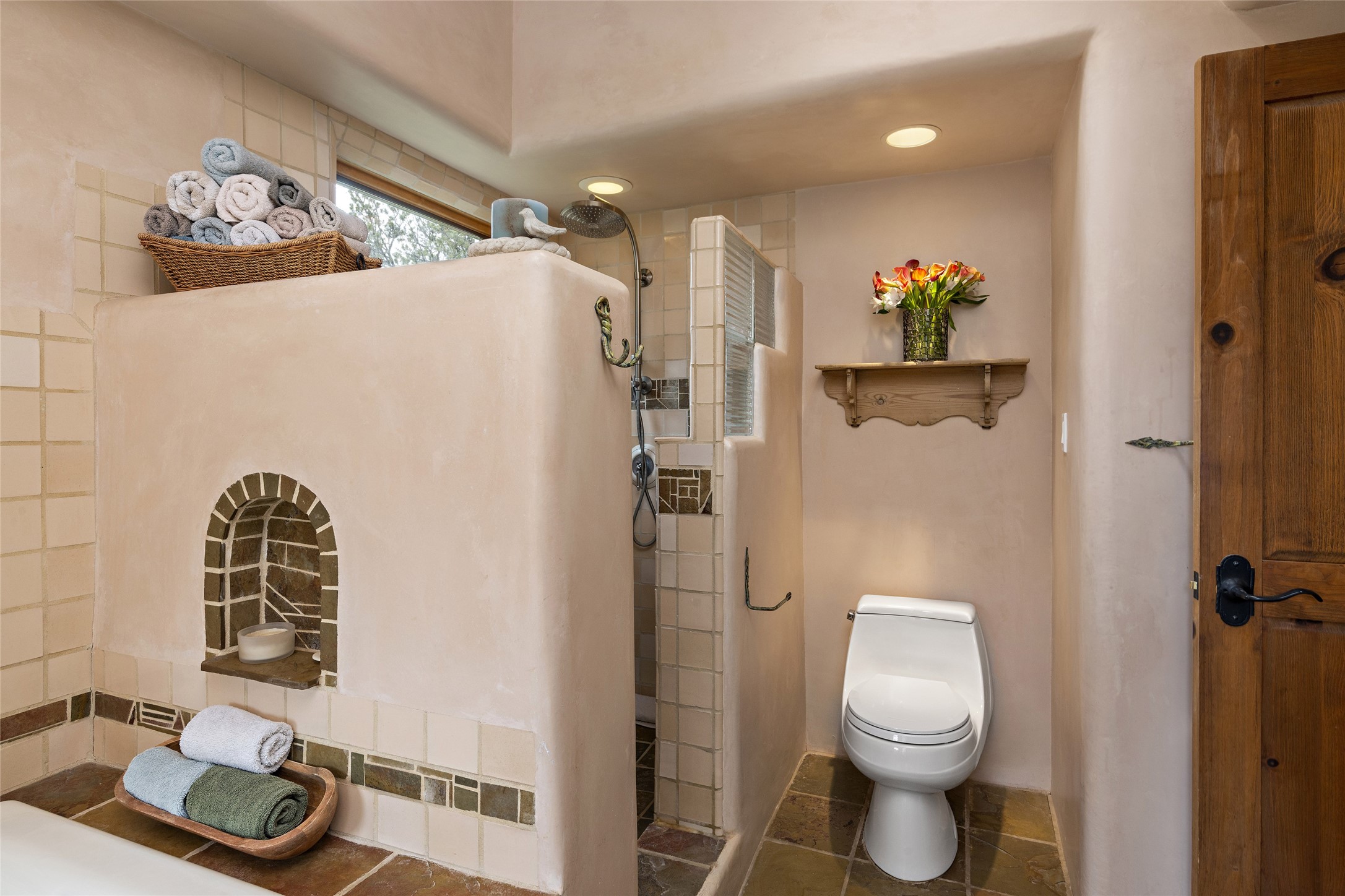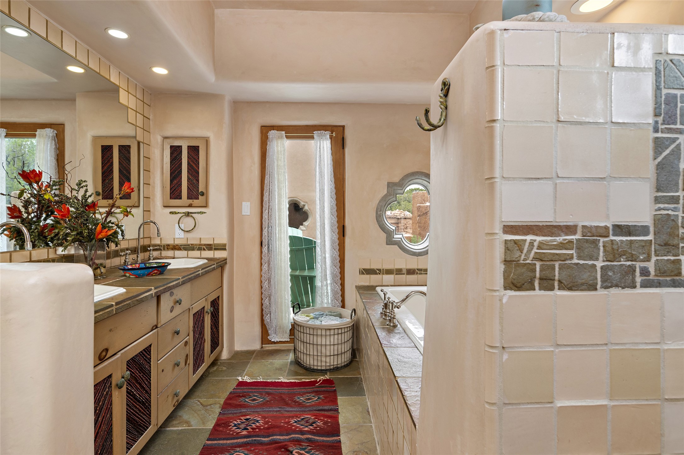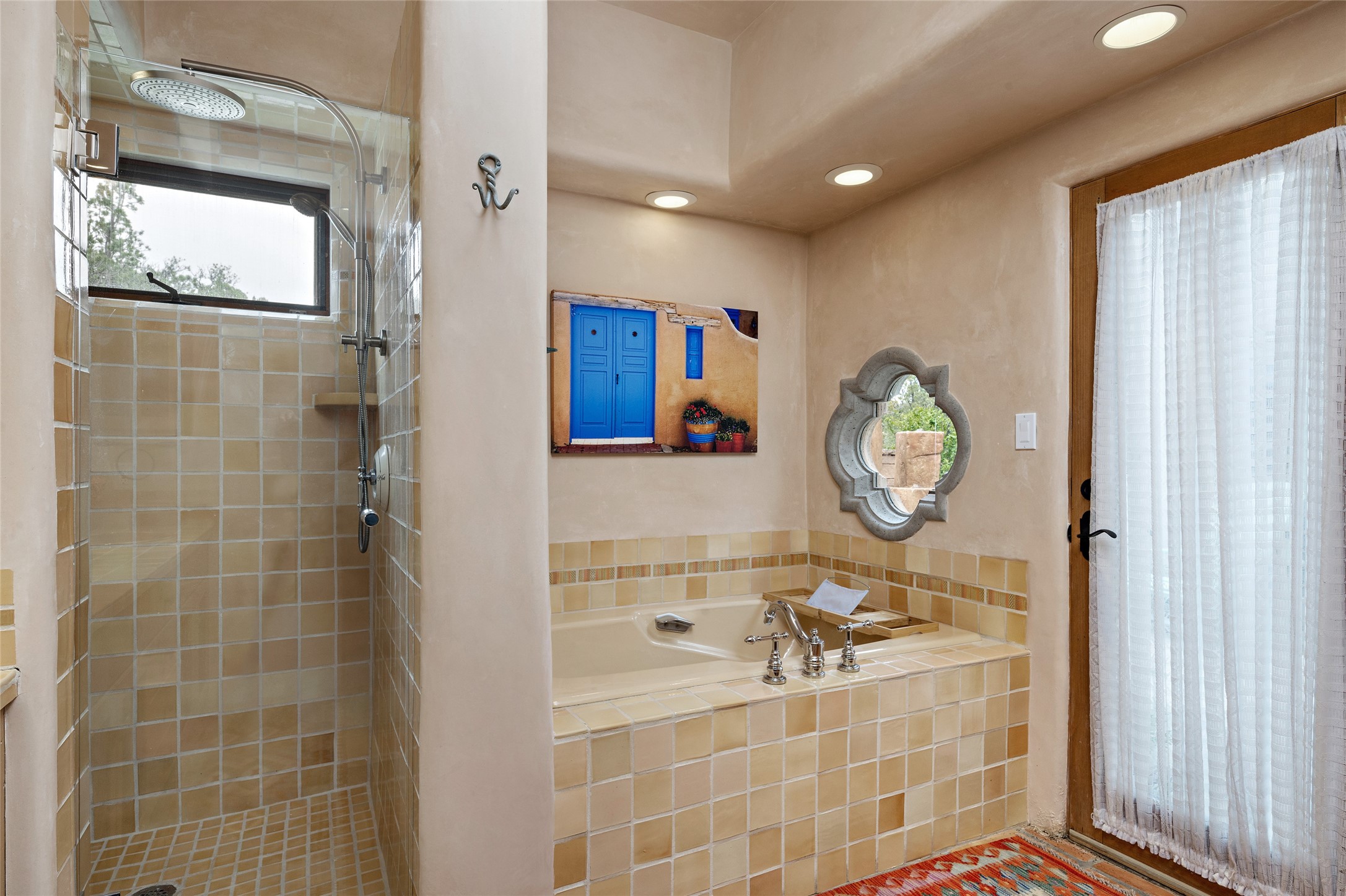 Conveniently located 12 minutes from the heart of Santa Fe in Estates II of Las Campanas. Traditional Northern New Mexico architectural elements abound. A long portal leads to a custom front door opening into a beautiful entry foyer, with glorious views of the Sangre de Cristo Mountains, an Anasazi inspired stacked stone column, latilla ceiling, and access to the great room beyond with beam and corbel ceiling, salt cedar cabinet, and Saltillo tile floors. The great room, with its beautiful stacked stone fireplace, has separate areas for living and dining, and access to the back portal with walled gardens, wood burning fireplace and a relaxing spa. Hand-troweled plaster walls throughout, six raised hearth fireplaces, vigas, coved ceilings, and multiple flagstone patios create a warm and inviting home. The kitchen with its center island and cozy breakfast area with a kiva fireplace, provides lovely views of the garden. There is excellent separation for each of the three bedrooms. Off the great room is a bedroom corridor, opening to an enchanting courtyard with impressive stone water feature, and a primary suite at either end. Each suite has a fireplace, private patio, and bath with separate tub and shower. The third bedroom is en-suite and currently serves as a media room with Ortiz Mountain views. The home is surrounded by beautiful gardens with private patios and boasts a 3-car garage.