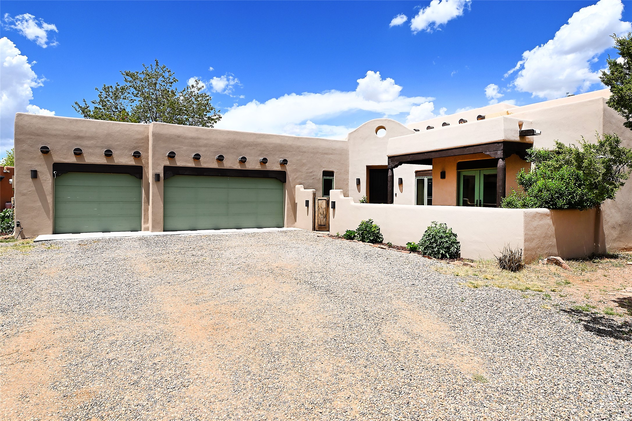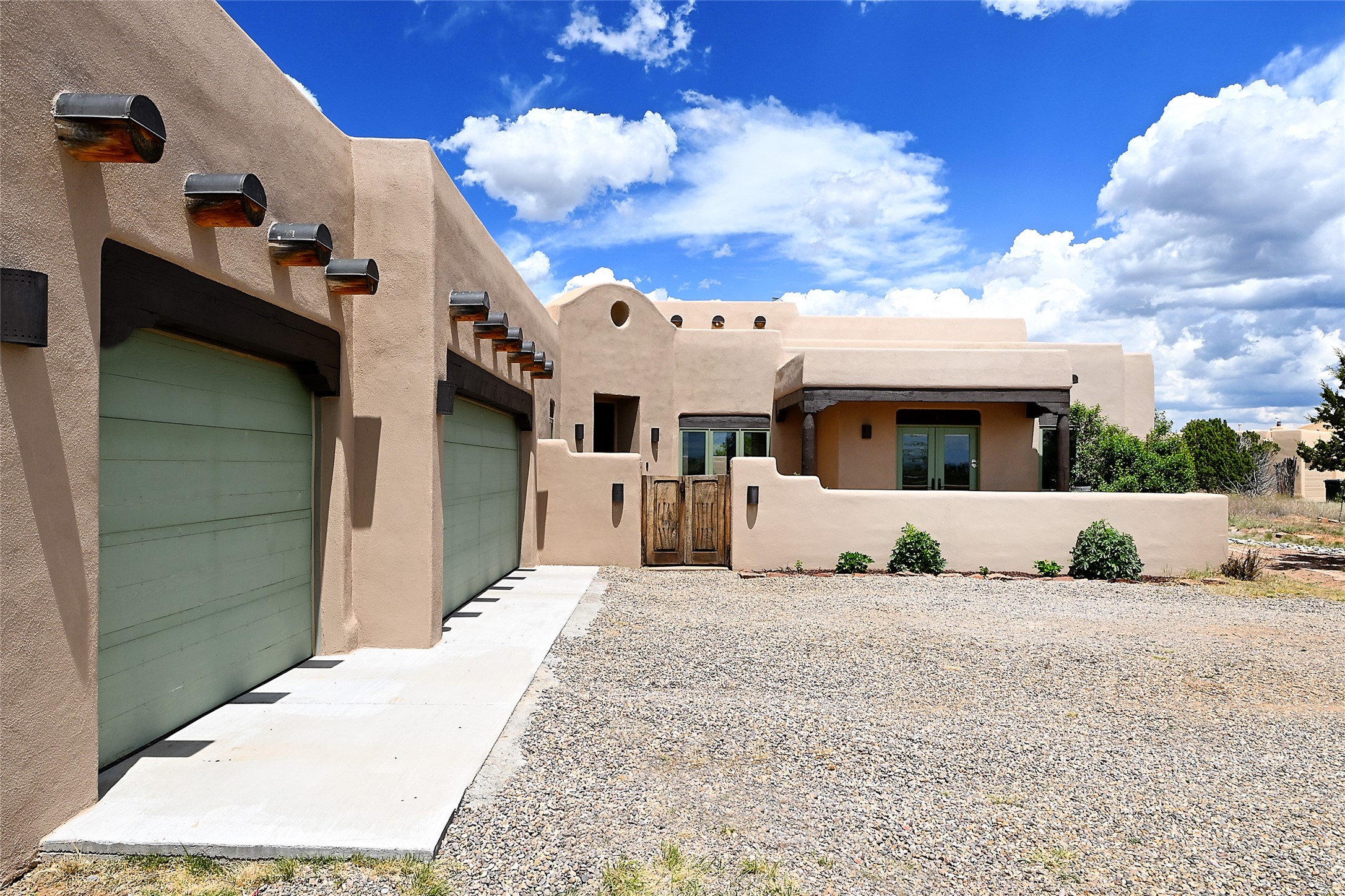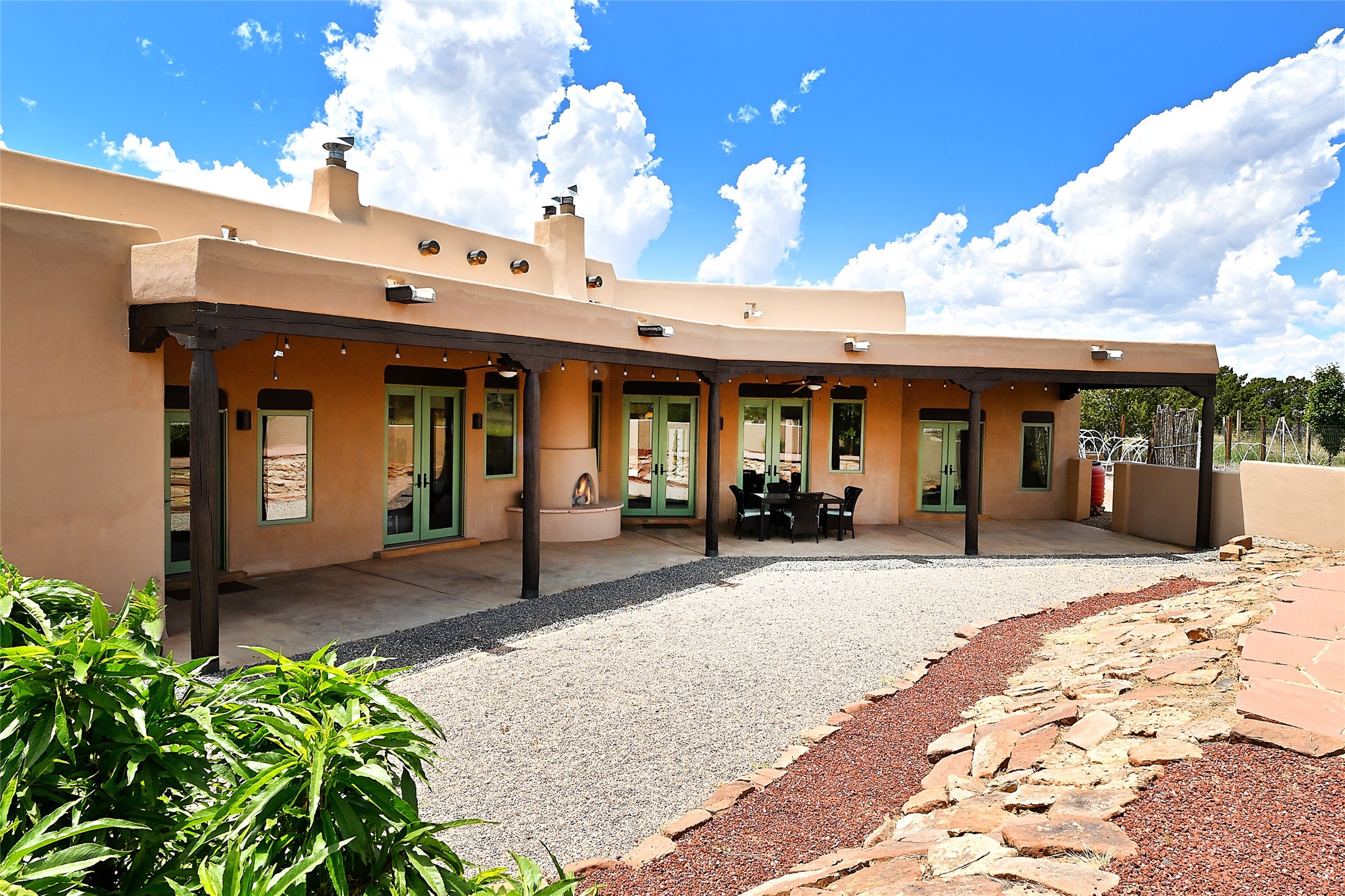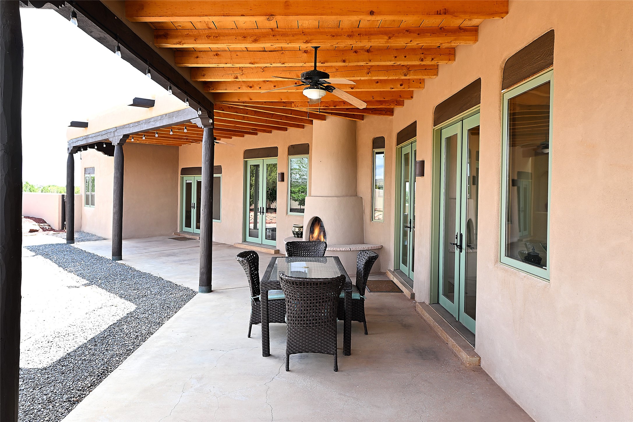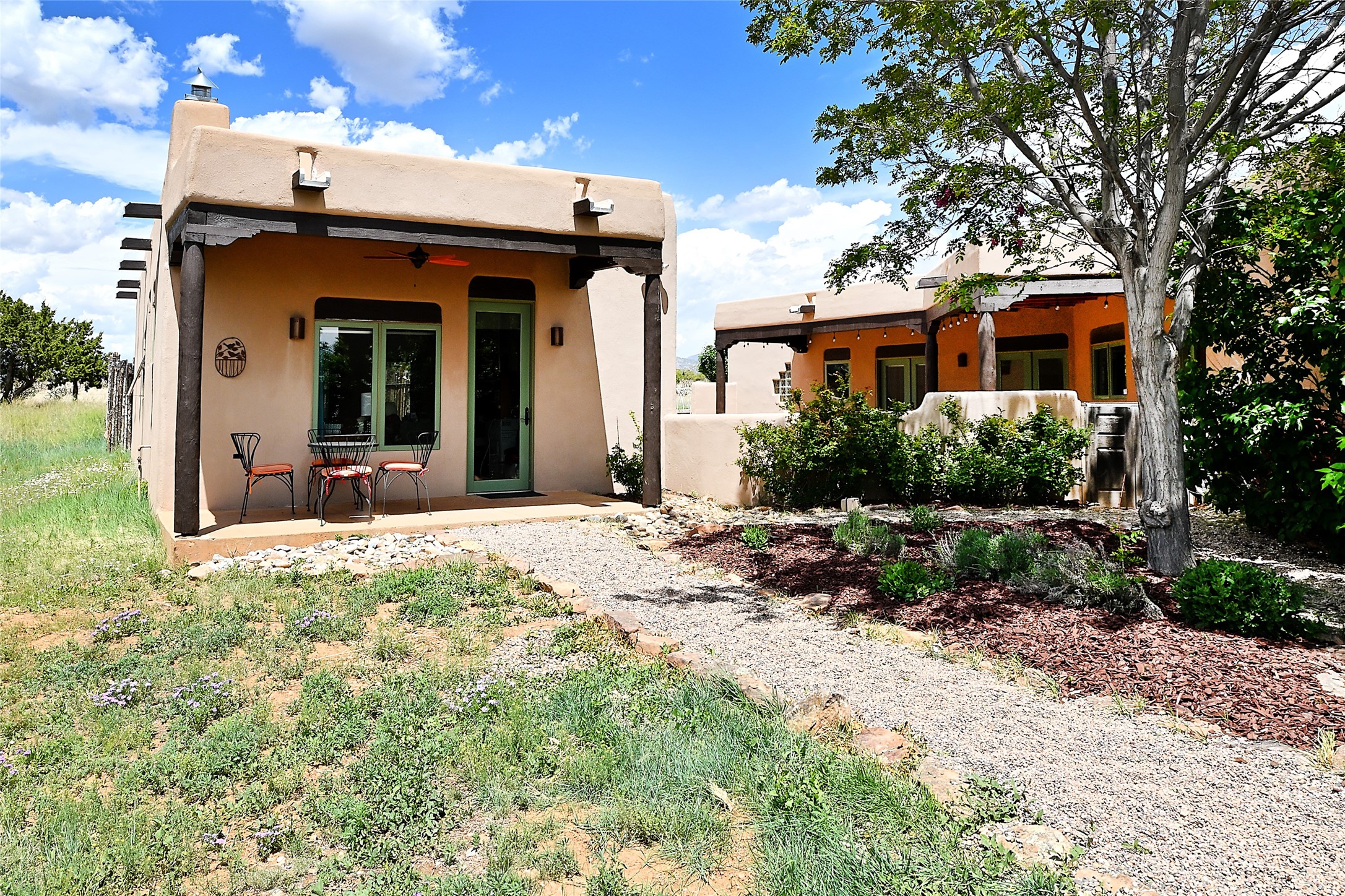 3 bedroom 2.5 bath open concept home plus detached studio on 1.3 acres in the community of Eldorado. Sweeping mountain and ranchland views. Iconic Santa Fe design features such as plaster walls, niches, and kiva fireplaces inside and out. Spacious living room with 14-foot-tall ceilings, Southwestern style vigas with tongue and groove woodwork, ceiling fans and recessed lighting. Adjacent to the living area is a private dining room. Newer, remodeled chef's kitchen is appointed with Silestone countertops, a generous island with a built-in induction cooktop, plentiful cabinets, a double oven, double sink with a kitchen nook and views of the courtyard with gas BBQ hookups. Primary bedroom has a corner kiva fireplace for those cool winter nights, a large walk-in closet with built ins and an updated ensuite bathroom with custom made vanity with Silestone counters, a jetted tub and double headed shower. Split bedroom plan with two guest bedrooms in the other wing of the home for maximum privacy. In addition, there is an office/study. The backyard features a completely covered portal with an outdoor kiva fireplace, a stucco wall and majestic views of the mountains. Ideal for alfresco dining and entertaining. Expansive garden area with several raised planting beds. In addition, the property is populated with numerous fruit trees including pear, peach nectarine, apple and cherry. 3-car garage. Privately located on the northern boundary of Eldorado adjoining Rancho Viejo.