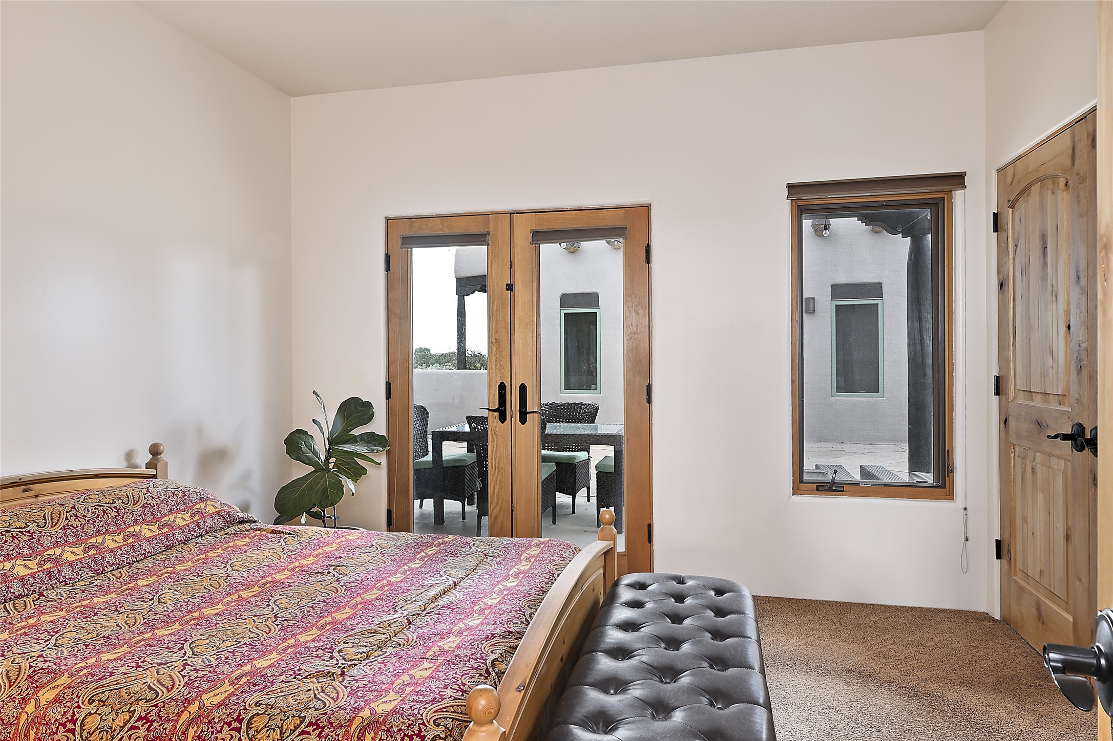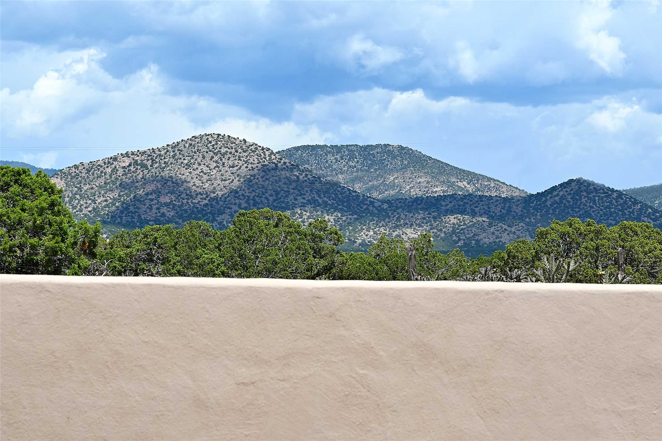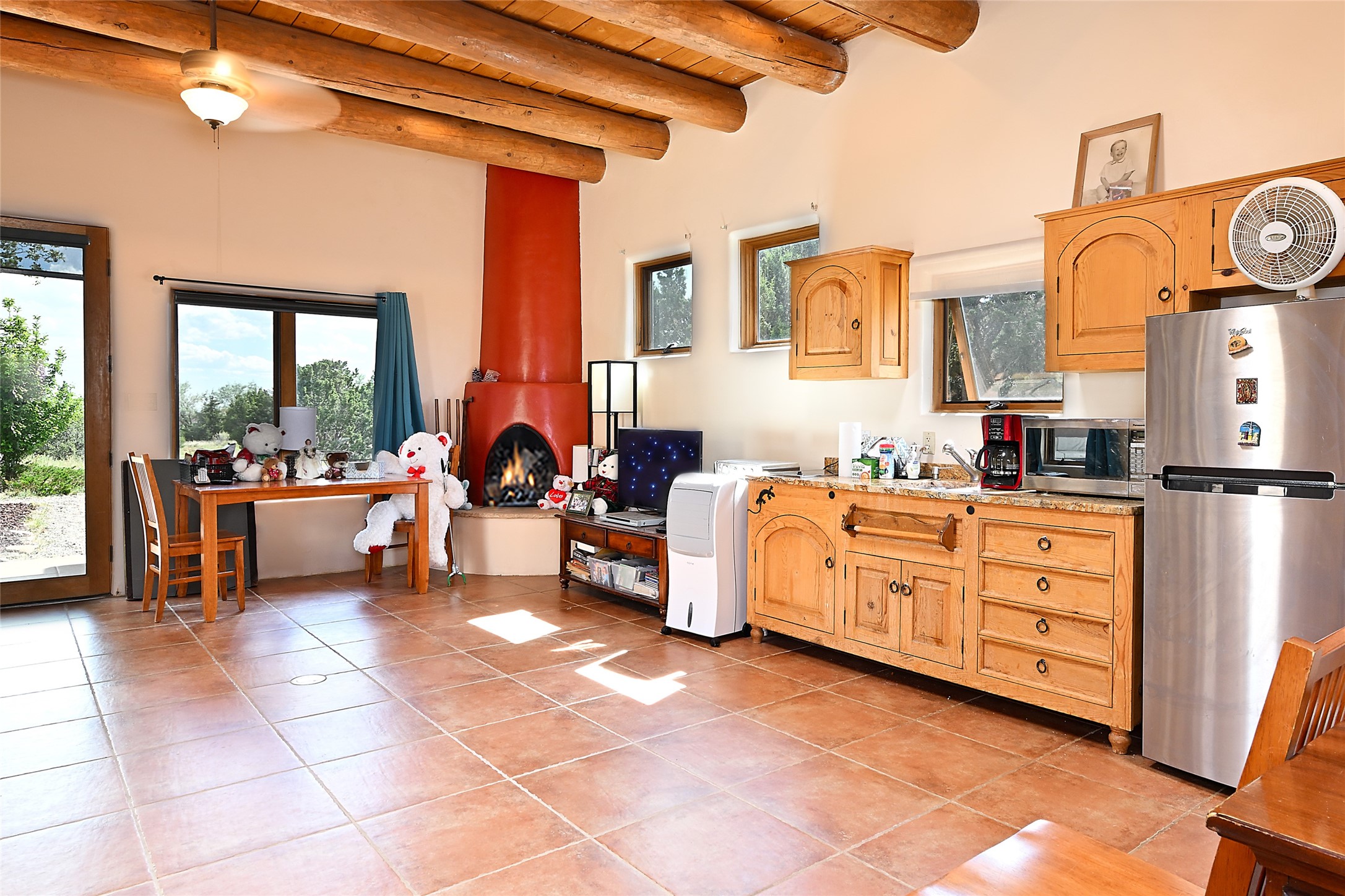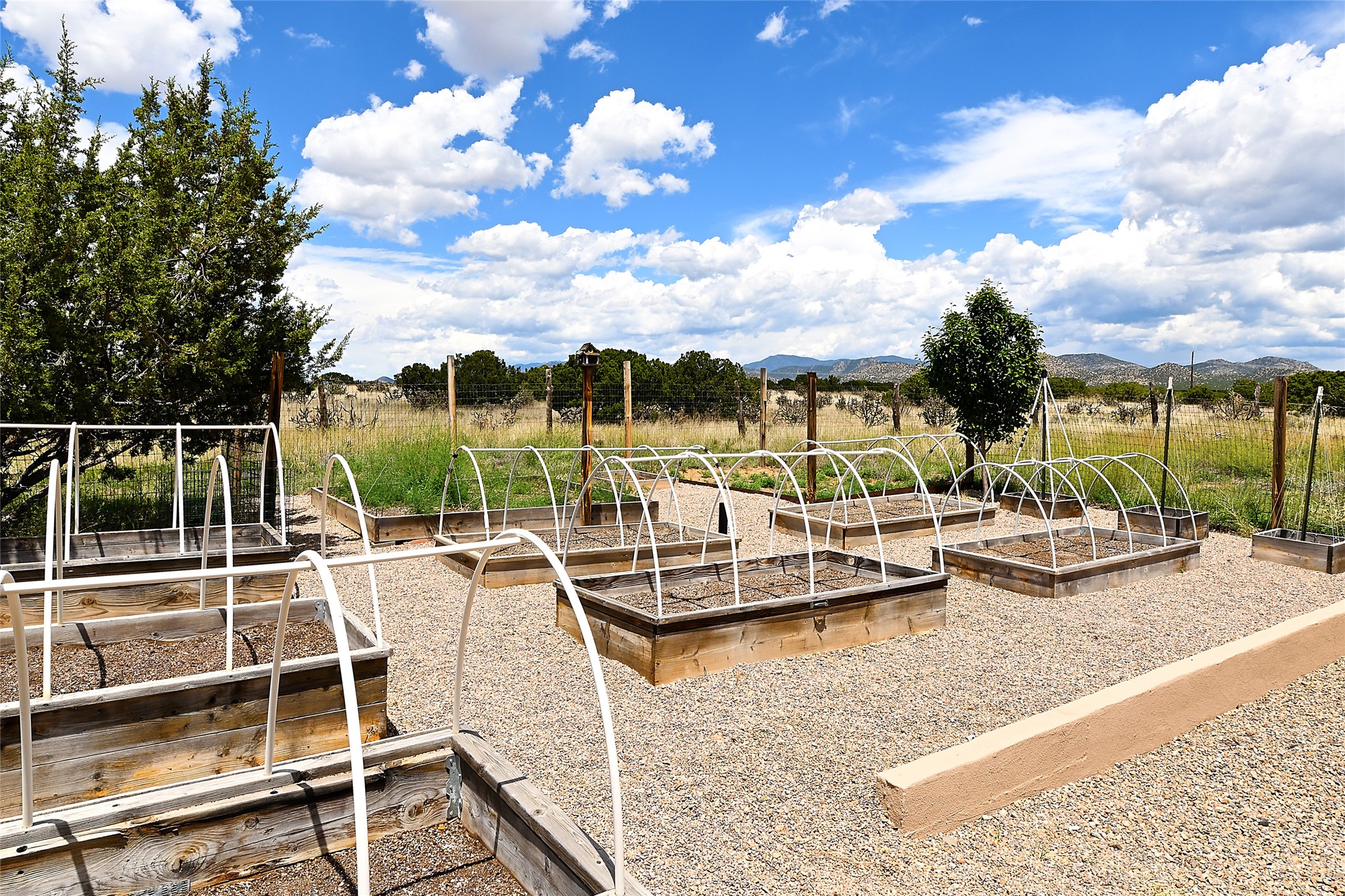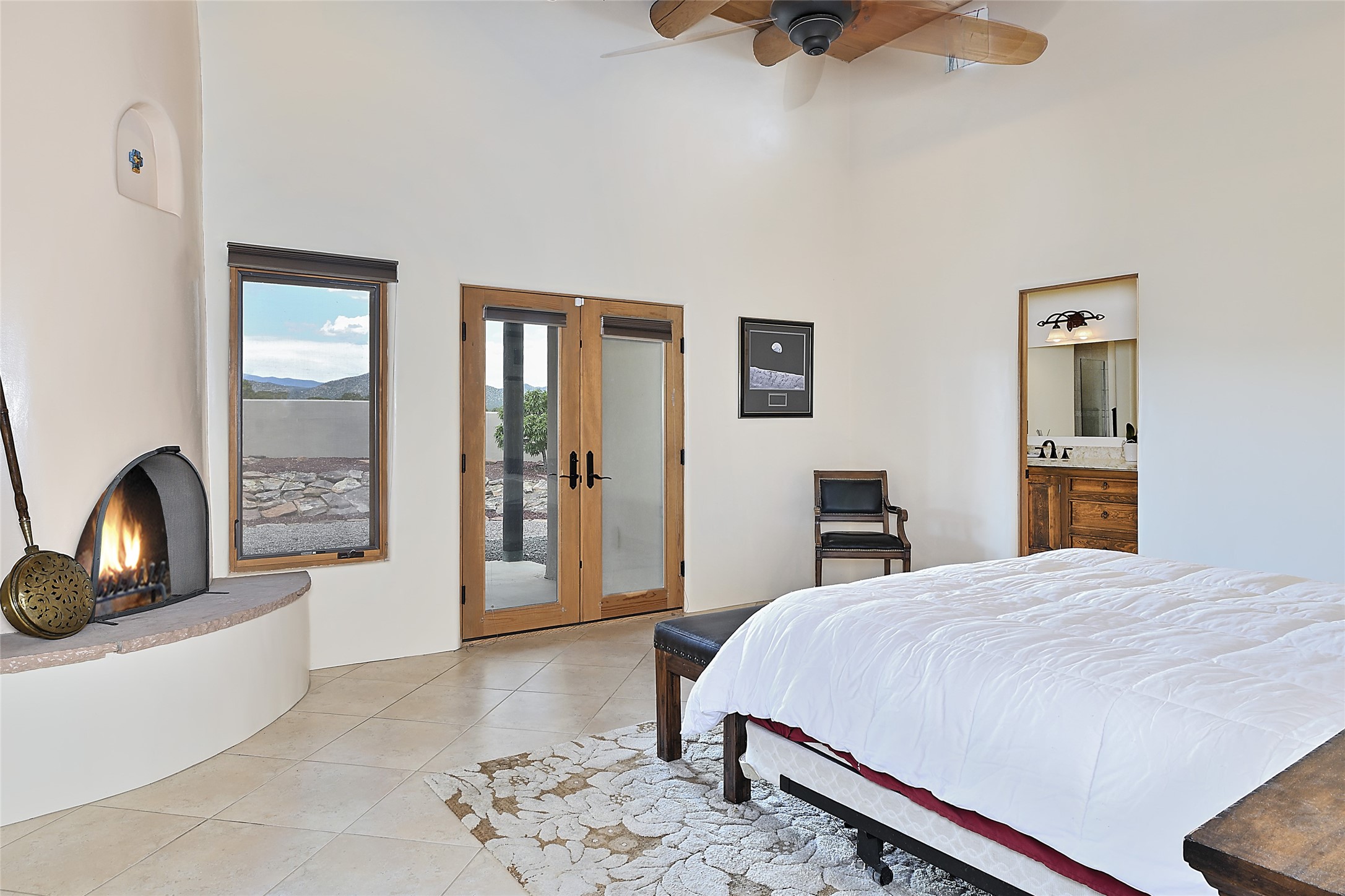 3 bedroom 2.5 bath open concept home plus detached studio on 1.3 acres in the community of Eldorado. Sweeping mountain and ranchland views. Iconic Santa Fe design features such as plaster walls, niches, and kiva fireplaces inside and out. Spacious living room with 14-foot-tall ceilings, Southwestern style vigas with tongue and groove woodwork, ceiling fans and recessed lighting. Adjacent to the living area is a private dining room. Newer, remodeled chef's kitchen is appointed with Silestone countertops, a generous island with a built-in induction cooktop, plentiful cabinets, a double oven, double sink with a kitchen nook and views of the courtyard with gas BBQ hookups. Primary bedroom has a corner kiva fireplace for those cool winter nights, a large walk-in closet with built ins and an updated ensuite bathroom with custom made vanity with Silestone counters, a jetted tub and double headed shower. Split bedroom plan with two guest bedrooms in the other wing of the home for maximum privacy. In addition, there is an office/study. The backyard features a completely covered portal with an outdoor kiva fireplace, a stucco wall and majestic views of the mountains. Ideal for alfresco dining and entertaining. Expansive garden area with several raised planting beds. In addition, the property is populated with numerous fruit trees including pear, peach nectarine, apple and cherry. 3-car garage. Privately located on the northern boundary of Eldorado adjoining Rancho Viejo.