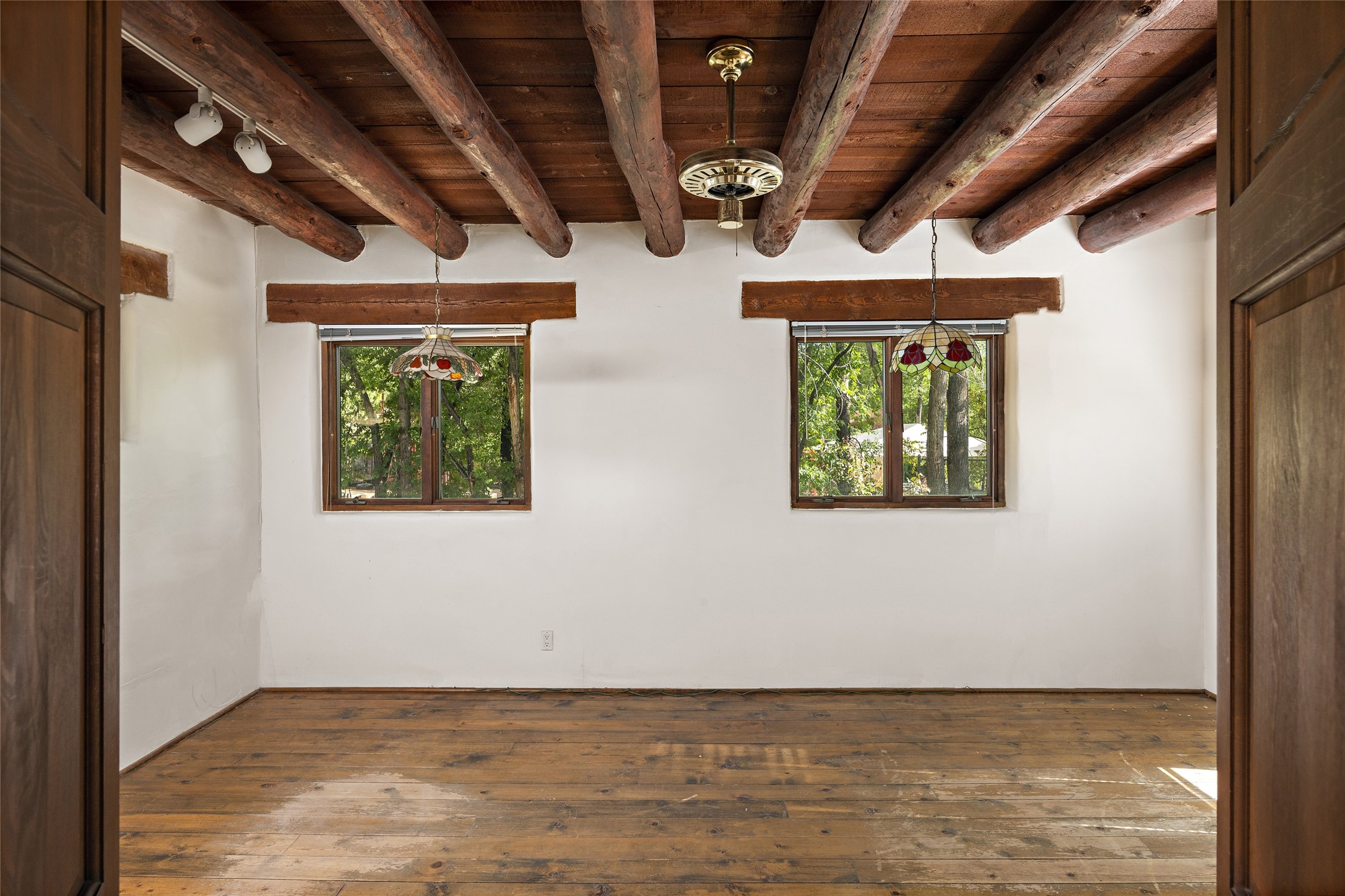 This Pueblo Revival home is located on one of the most desirable private lanes in the Historic Eastside one block from Downtown Subscription and an easy walking distance to Canyon Road. It has three bedrooms and two baths one up and two downstairs. Walk into the light filled living room with high vaulted viga ceilings and a traditional kiva fireplace. The living room is spacious and overlooks the terraced back yard. It has a two car garage which is a real advantage on this lane. An amazingly private home that needs a facelift. A pre-inspection report is available for serious buyers' inquiries.