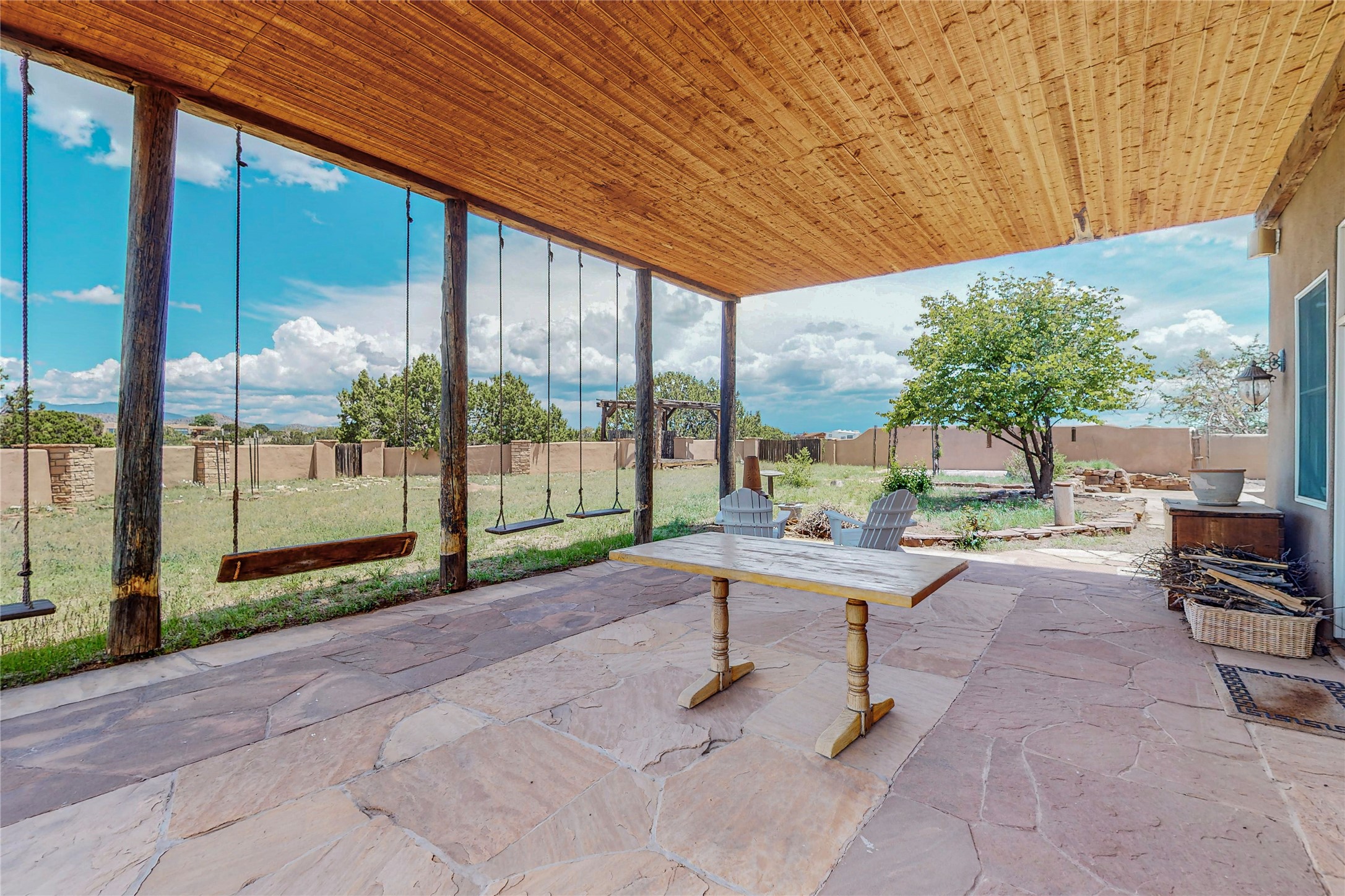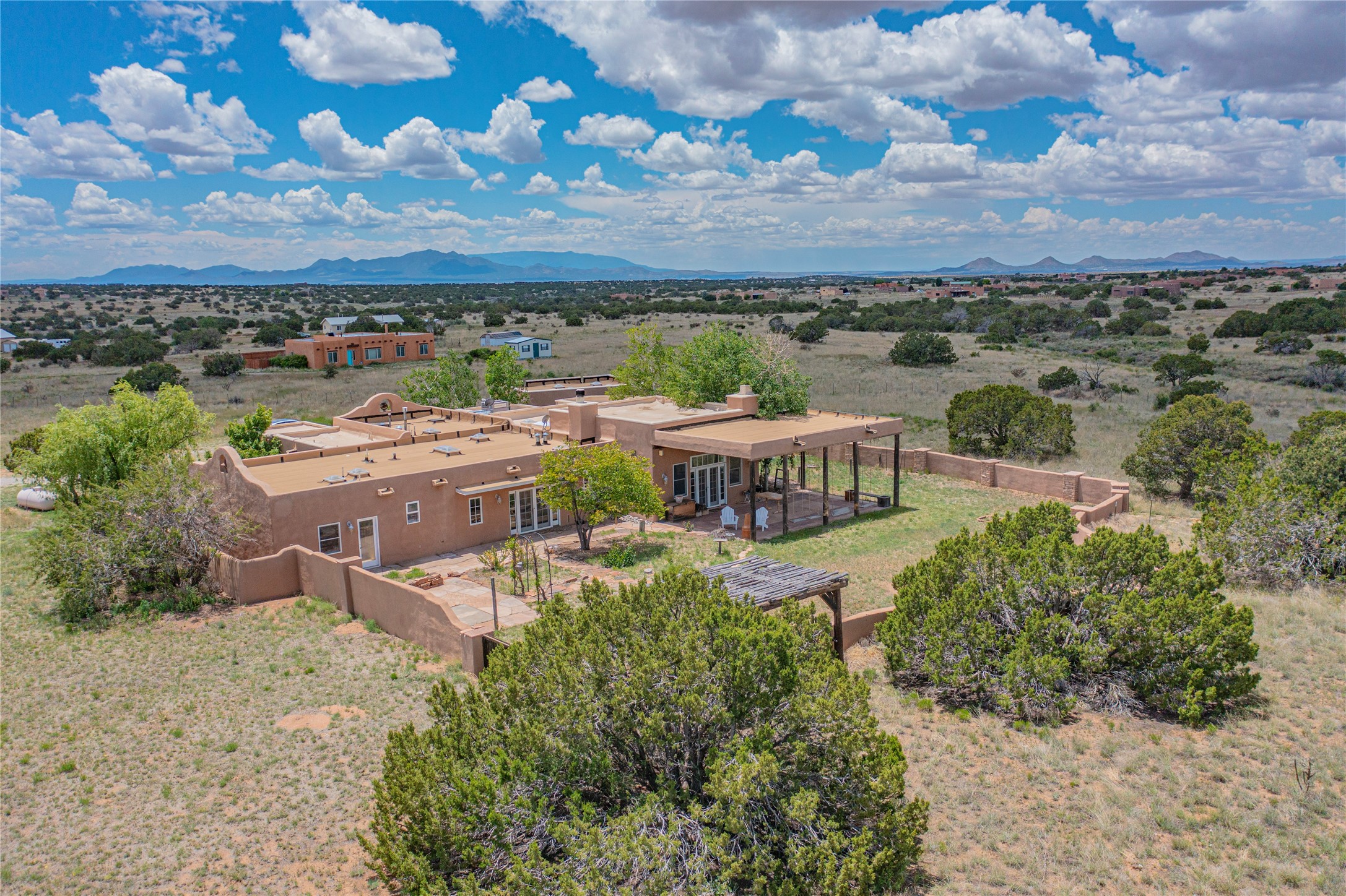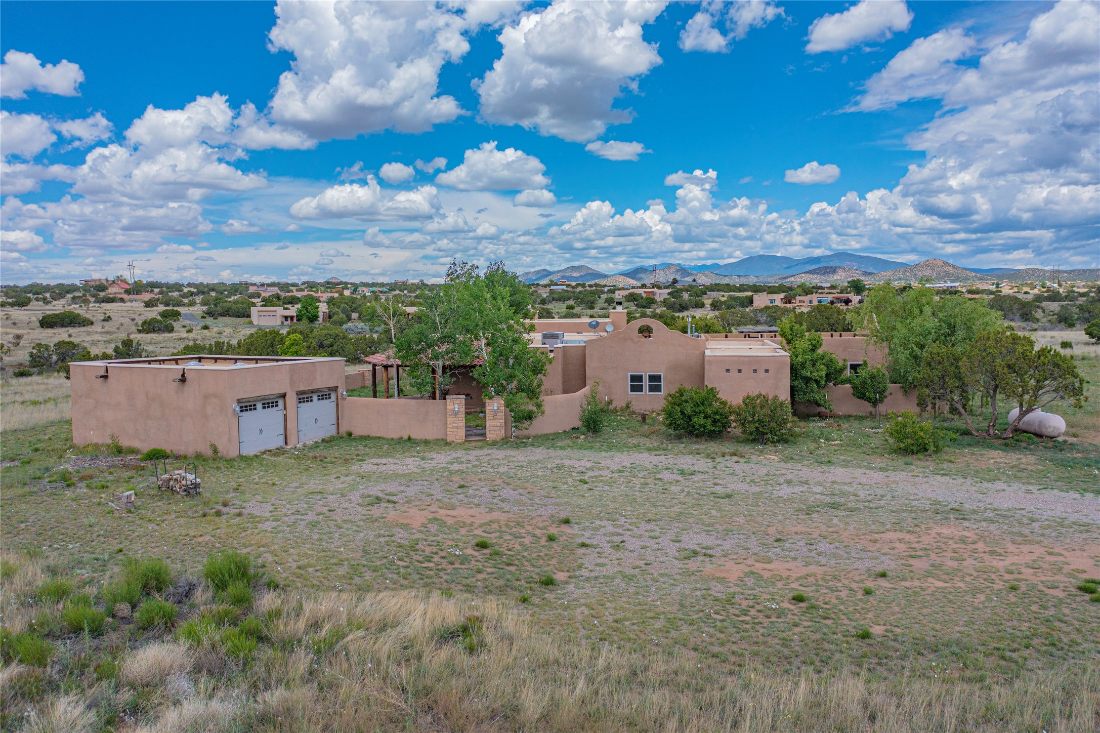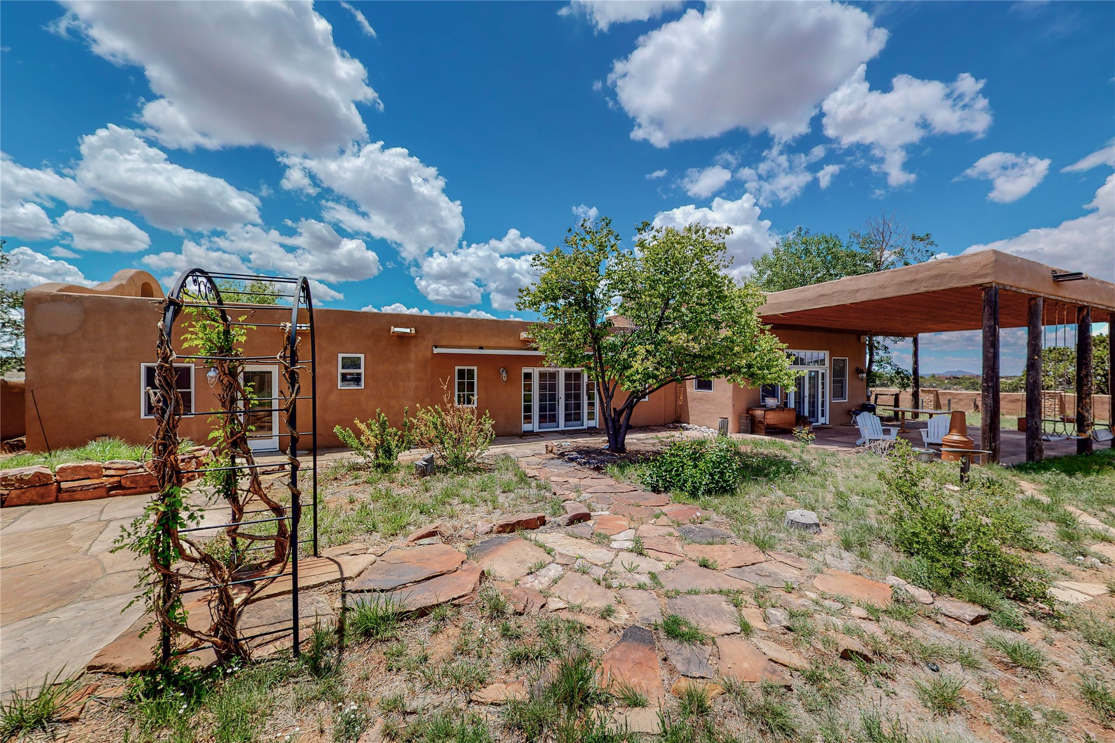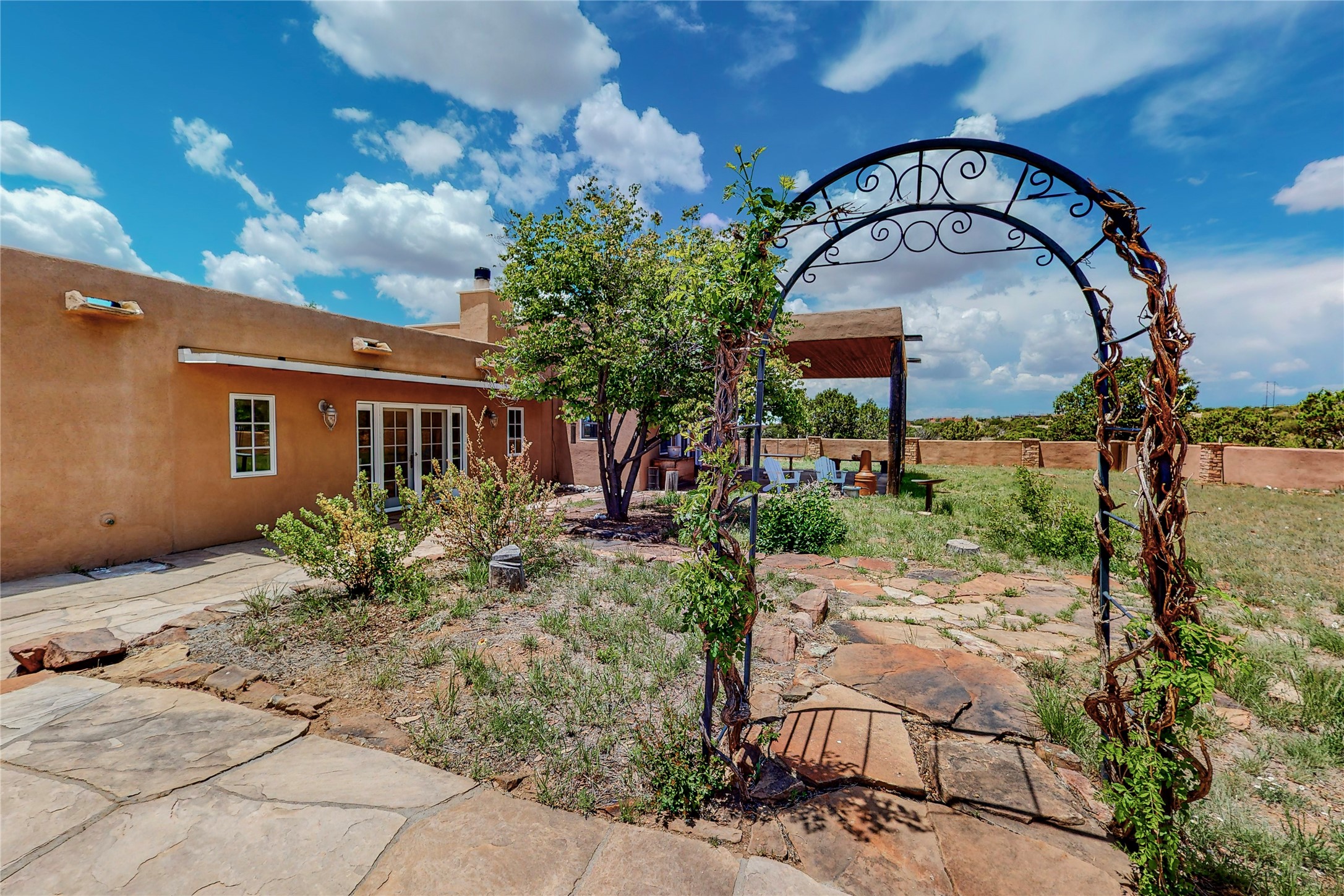 Welcome to an extraordinary slice of Southwestern serenity. This skillfully crafted ranch property is an impressive blend of rustic charm and modern amenities spread across over 4000 sq. ft. With three bedrooms and three bathrooms, this home is nestled on five private acres, rich in views, and boasts an additional room that makes a perfect office or flex room with a private entry. The home's distinctive character is marked by accents of 150-year-old reclaimed lumber and honed flagstone floors with tile inlay. Curved archways, charming details, and exquisite built-ins add to the home's unique aesthetic. Thirteen skylights throughout the house create a light-filled environment, while two fireplaces add warmth and ambiance.Cater to your culinary ambitions in the gourmet kitchen, featuring granite countertops, a spacious island, two refrigerators/freezers, a 6-burner Garland stove, and a large walk-in pantry. Entertain effortlessly indoors and out with two spacious portals equipped with a sound system, lushly landscaped gardens, and multiple flagstone patios offering panoramic mountain views. French Pella double doors lead from the dining room and family room to the great outdoors, facilitating a seamless indoor-outdoor lifestyle. The home's flexible floor plan accommodates both formal and casual living spaces. A formal dining room with limestone accents and an informal dining room with built-in shelves and counter complement the great room, replete with a kiva fireplace and 14-foot beamed ceilings. The primary suite, a true sanctuary, features a romantic bath with a vintage claw foot tub and travertine tile overlooking a private courtyard. The generously designed California Closet is not to be forgotten and is perfect for your wardrobe. Additional amenities include A/C, forced air heating, an oversized 2-car garage with four skylights and built-in storage, and a spacious laundry room equipped with a washer and dryer.