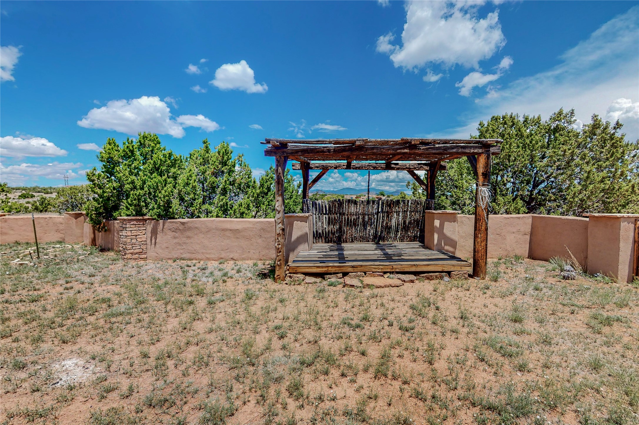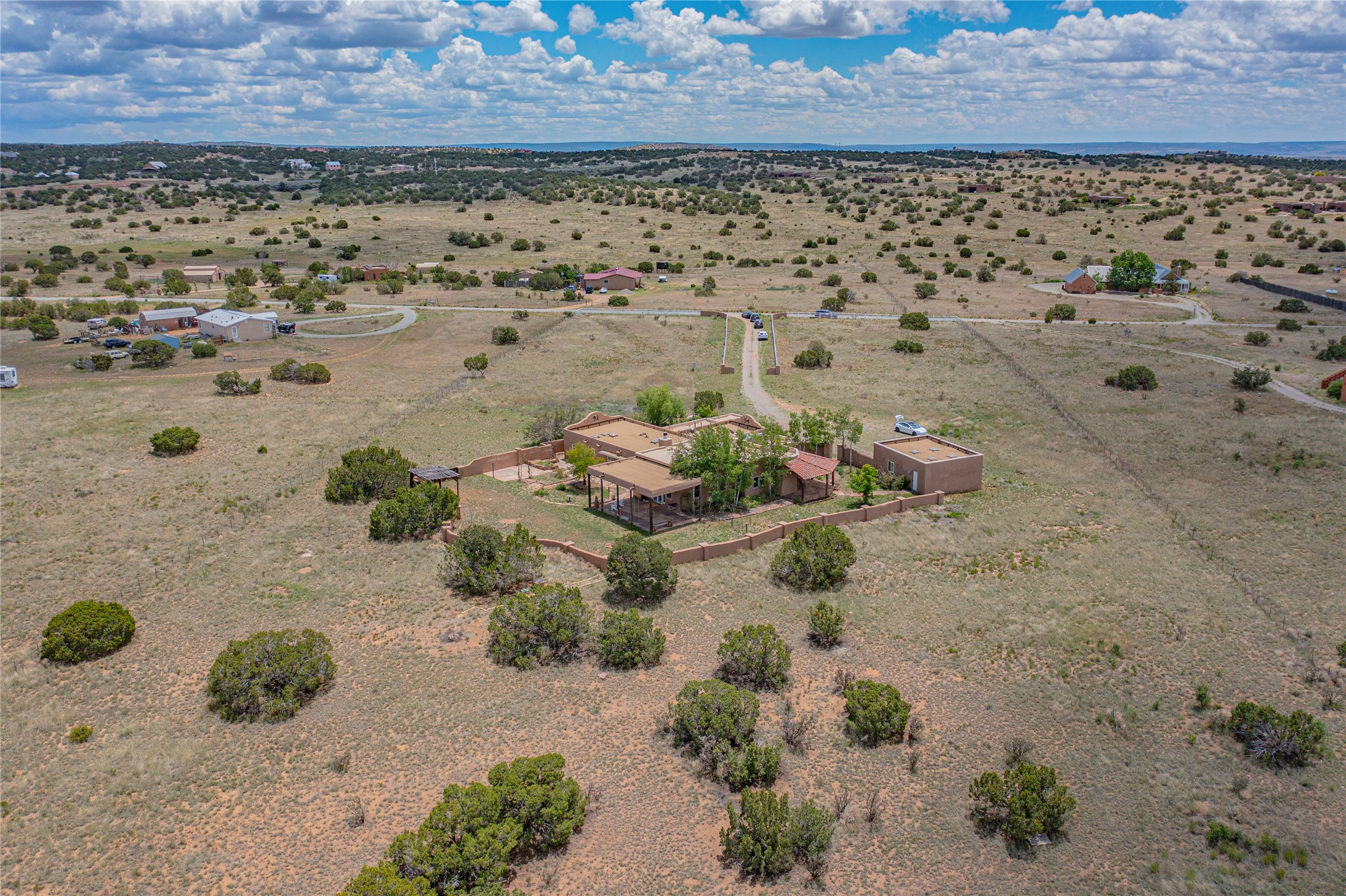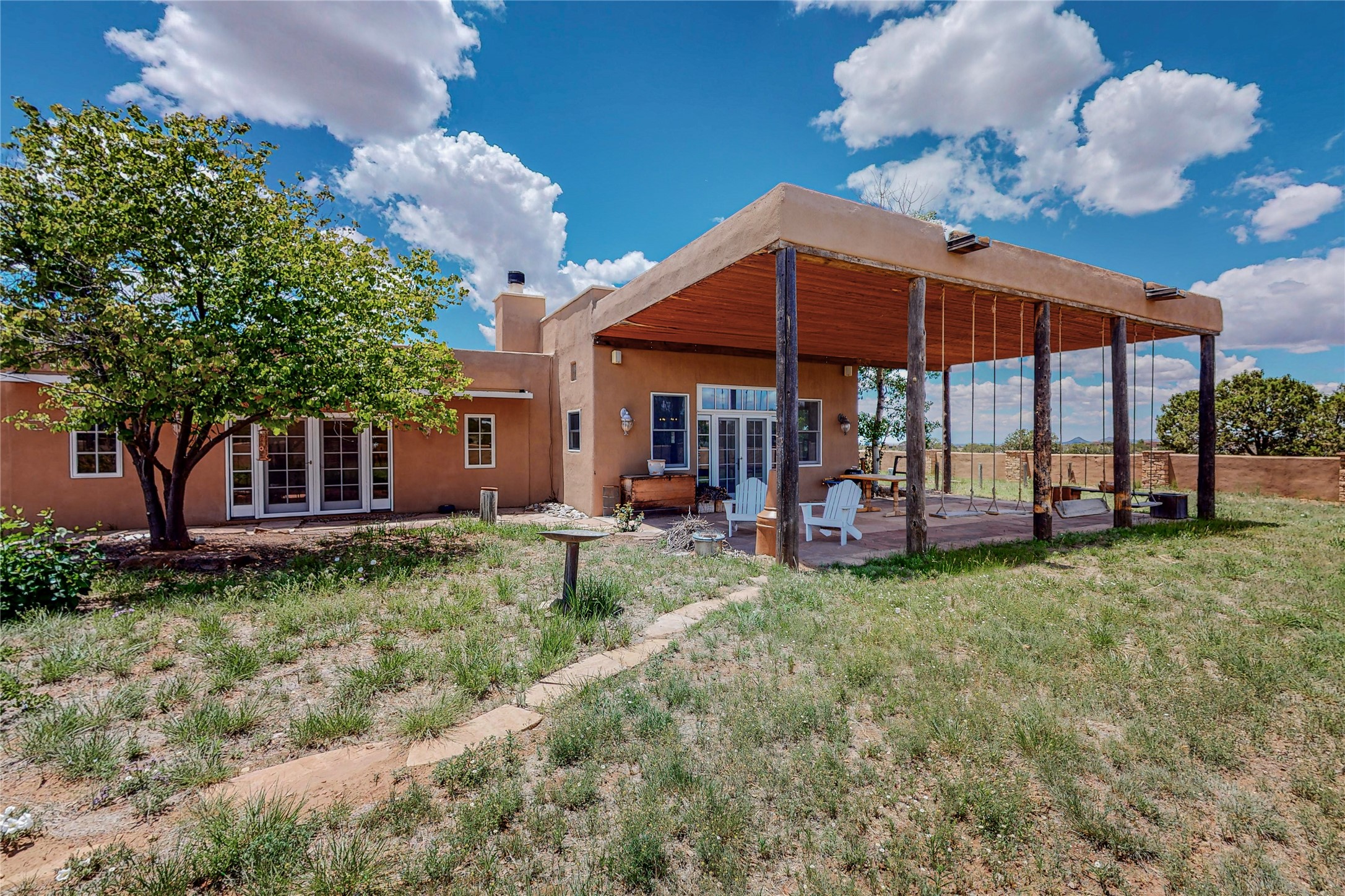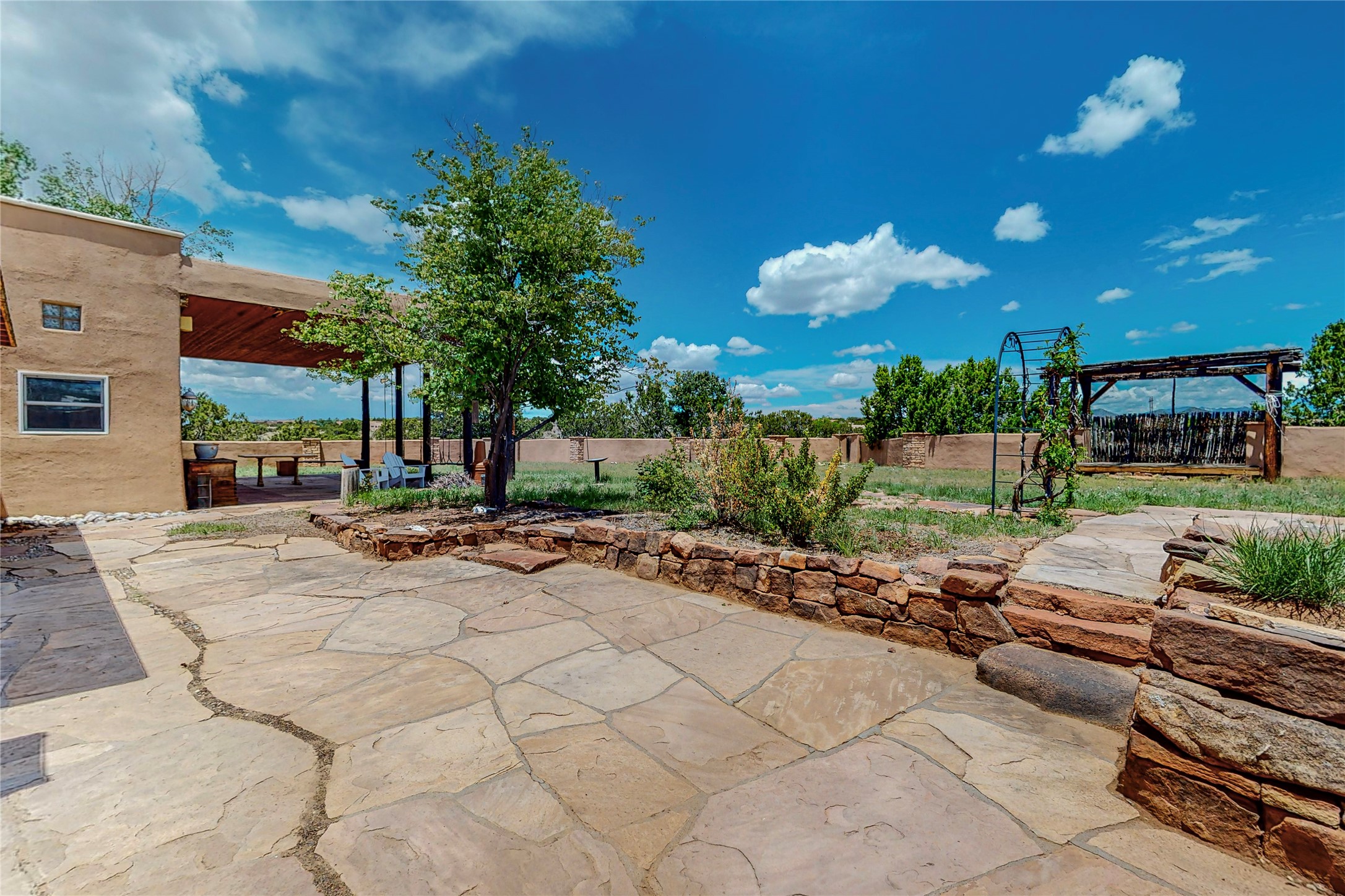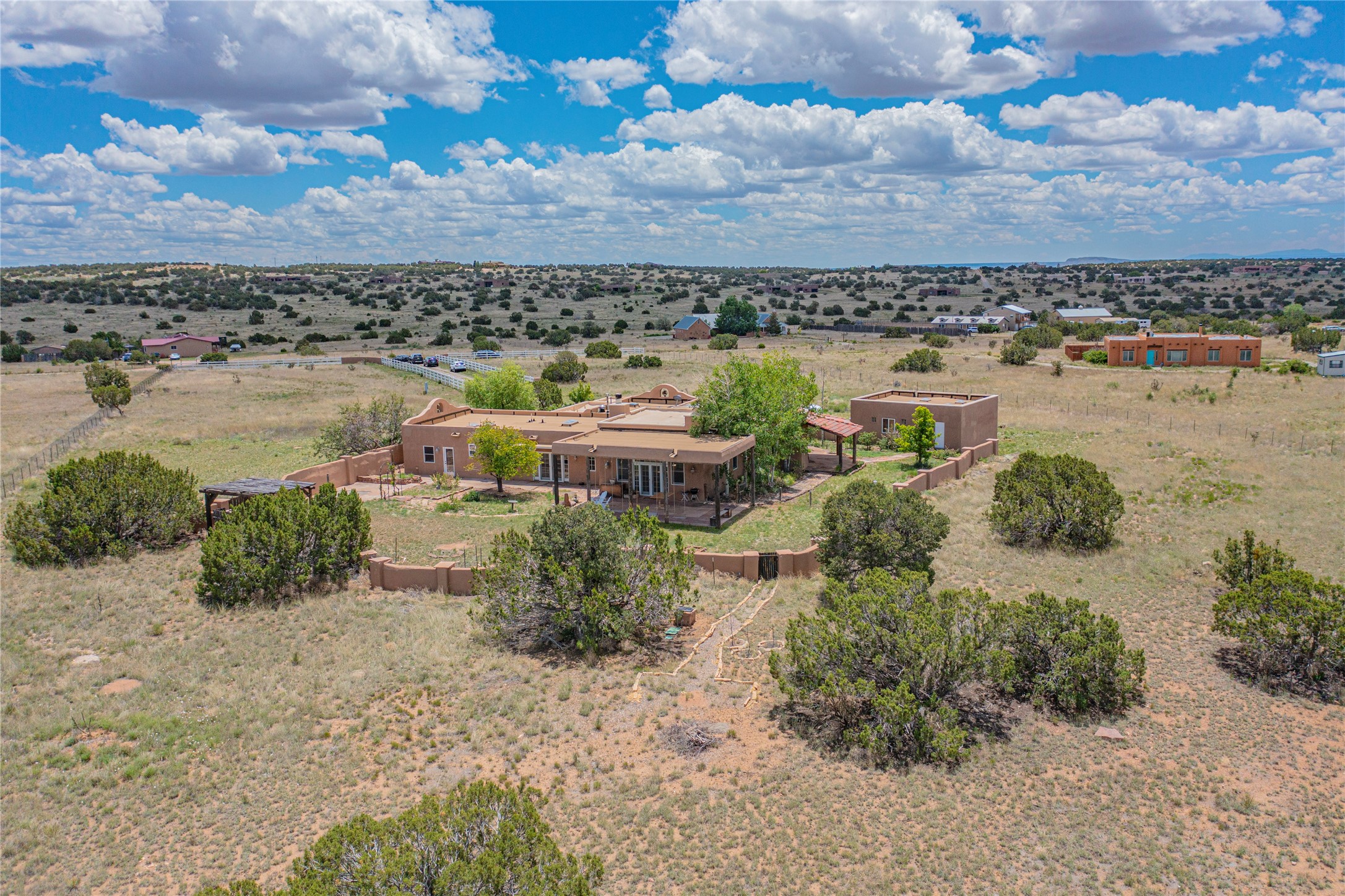 Welcome to an extraordinary slice of Southwestern serenity. This skillfully crafted ranch property is an impressive blend of rustic charm and modern amenities spread across over 4000 sq. ft. With three bedrooms and three bathrooms, this home is nestled on five private acres, rich in views, and boasts an additional room that makes a perfect office or flex room with a private entry. The home's distinctive character is marked by accents of 150-year-old reclaimed lumber and honed flagstone floors with tile inlay. Curved archways, charming details, and exquisite built-ins add to the home's unique aesthetic. Thirteen skylights throughout the house create a light-filled environment, while two fireplaces add warmth and ambiance.Cater to your culinary ambitions in the gourmet kitchen, featuring granite countertops, a spacious island, two refrigerators/freezers, a 6-burner Garland stove, and a large walk-in pantry. Entertain effortlessly indoors and out with two spacious portals equipped with a sound system, lushly landscaped gardens, and multiple flagstone patios offering panoramic mountain views. French Pella double doors lead from the dining room and family room to the great outdoors, facilitating a seamless indoor-outdoor lifestyle. The home's flexible floor plan accommodates both formal and casual living spaces. A formal dining room with limestone accents and an informal dining room with built-in shelves and counter complement the great room, replete with a kiva fireplace and 14-foot beamed ceilings. The primary suite, a true sanctuary, features a romantic bath with a vintage claw foot tub and travertine tile overlooking a private courtyard. The generously designed California Closet is not to be forgotten and is perfect for your wardrobe. Additional amenities include A/C, forced air heating, an oversized 2-car garage with four skylights and built-in storage, and a spacious laundry room equipped with a washer and dryer.