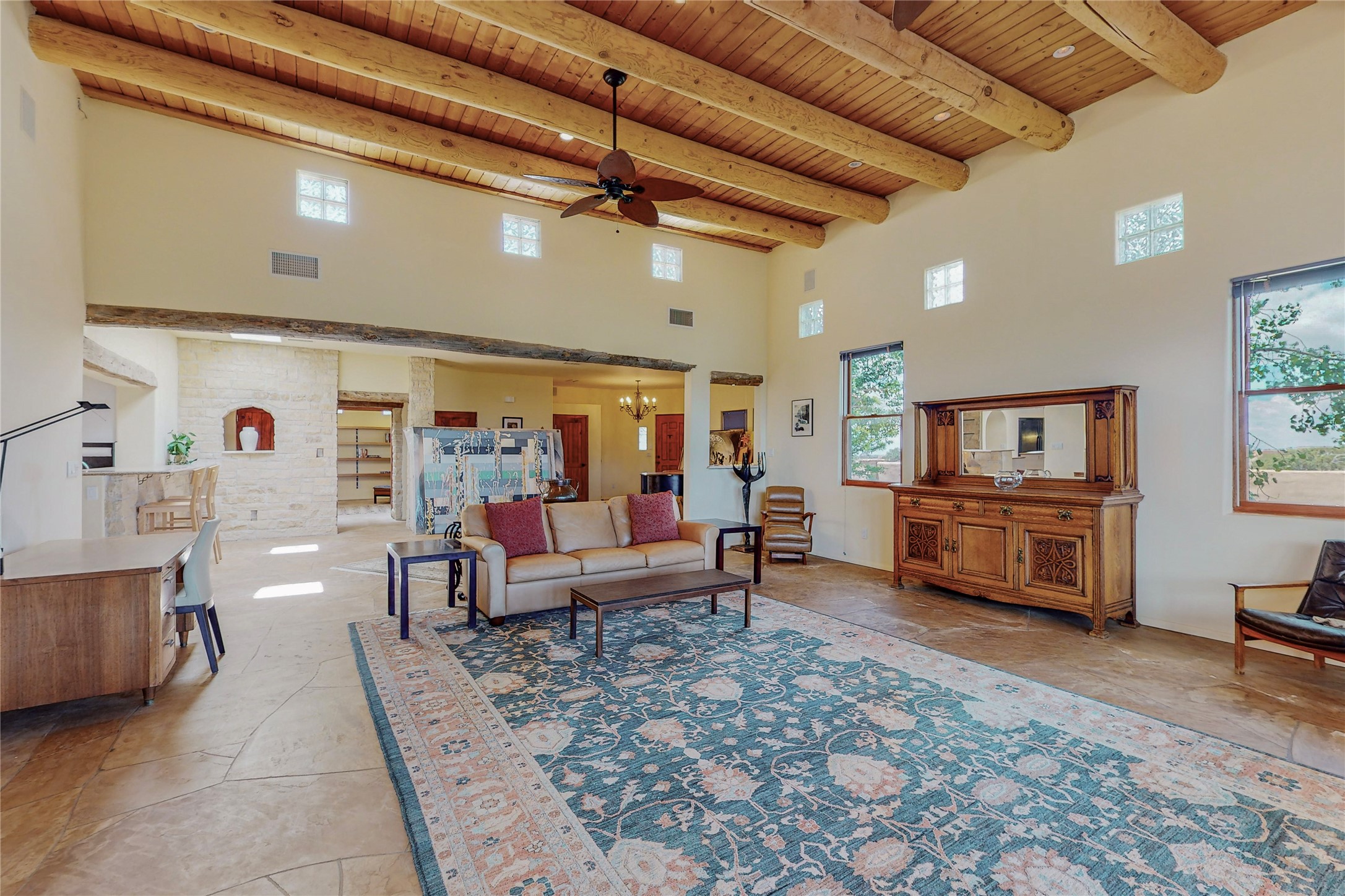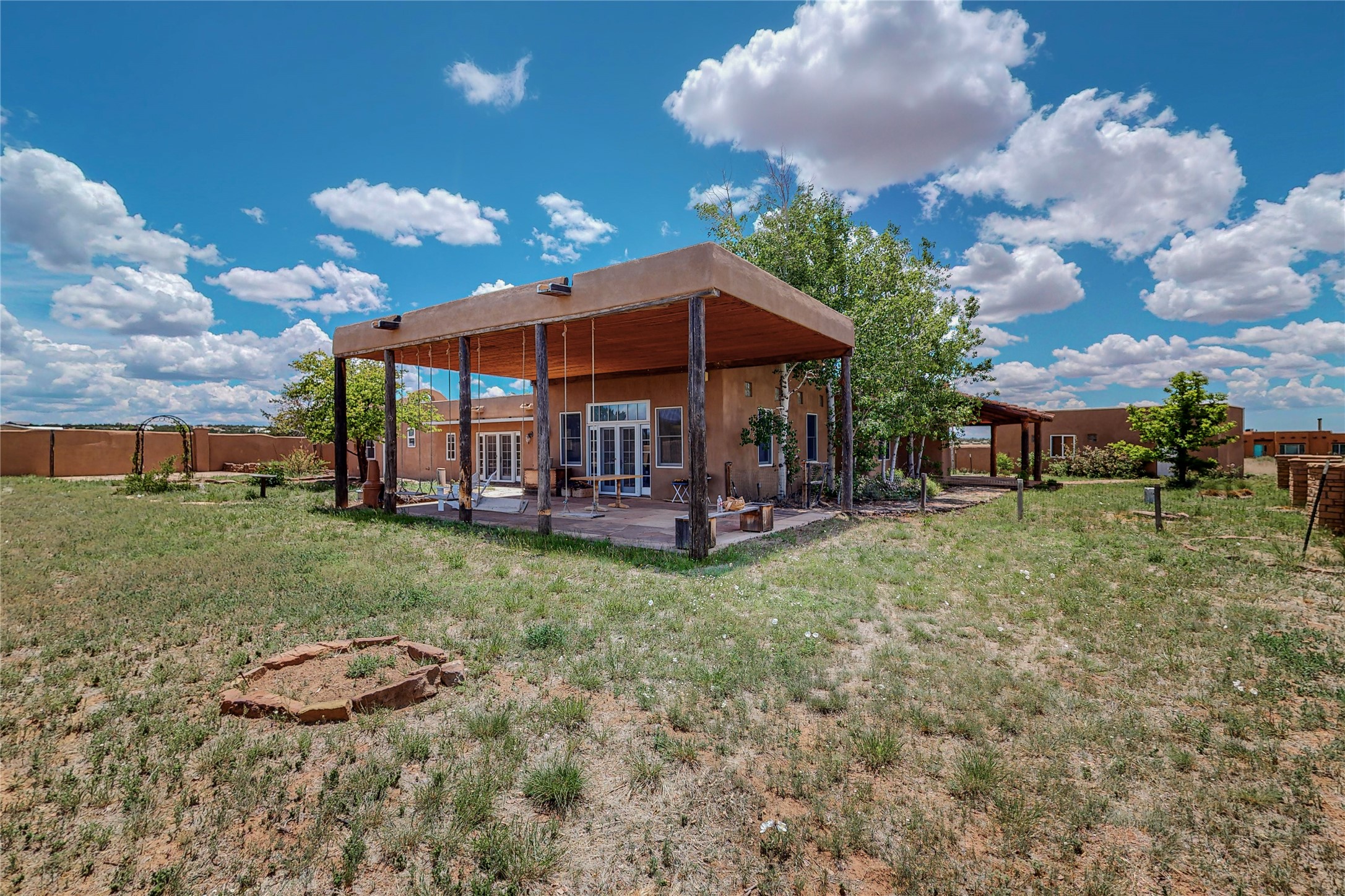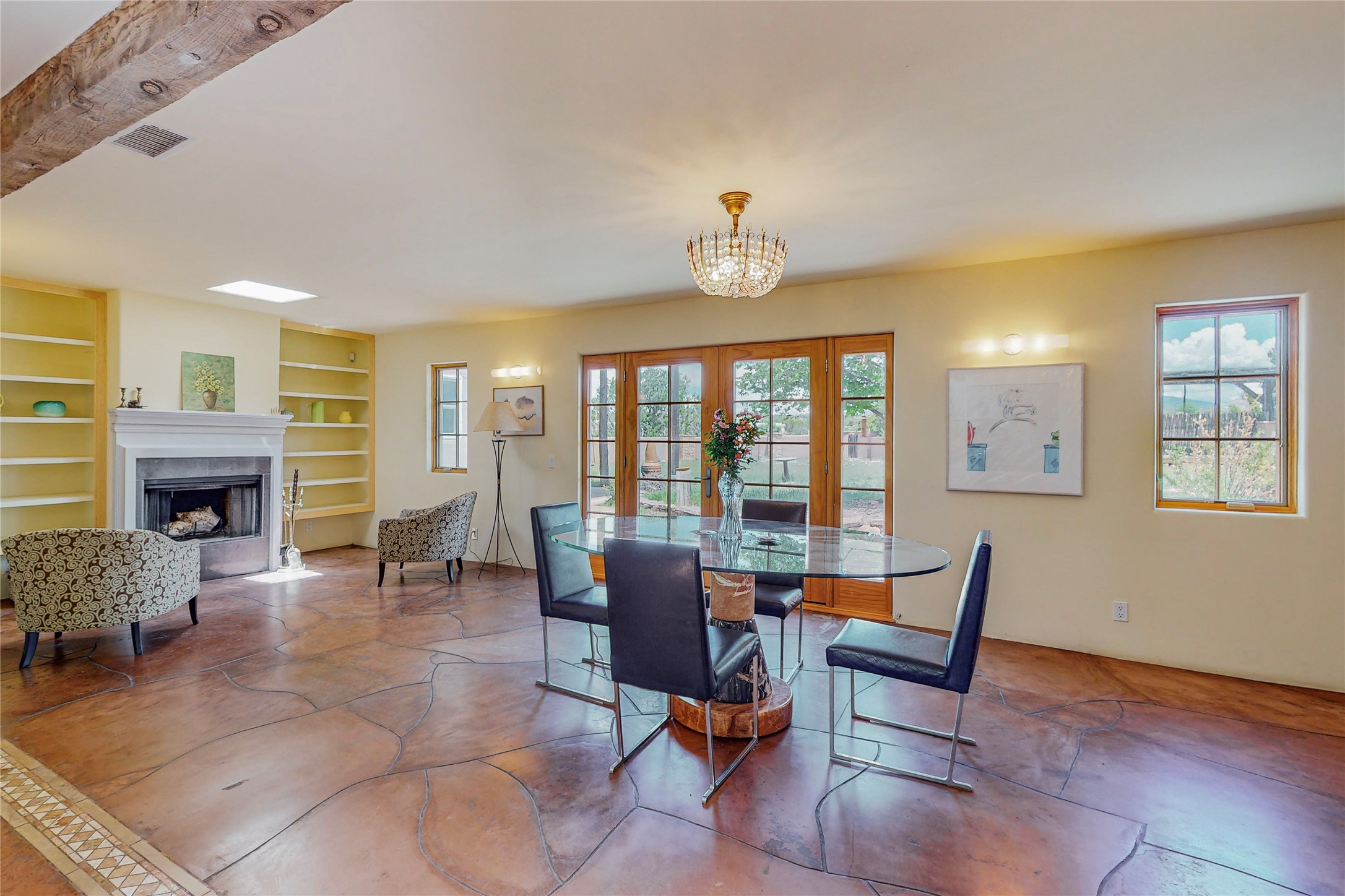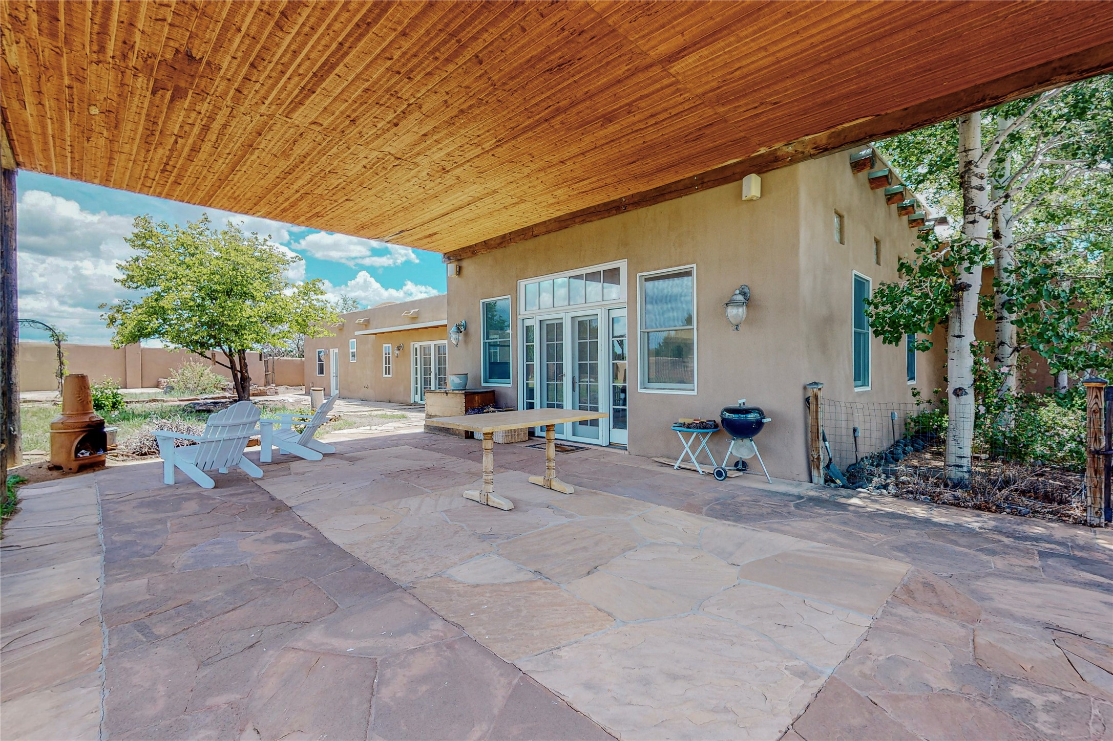 Welcome to an extraordinary slice of Southwestern serenity. This skillfully crafted ranch property is an impressive blend of rustic charm and modern amenities spread across over 4000 sq. ft. With three bedrooms and three bathrooms, this home is nestled on five private acres, rich in views, and boasts an additional room that makes a perfect office or flex room with a private entry. The home's distinctive character is marked by accents of 150-year-old reclaimed lumber and honed flagstone floors with tile inlay. Curved archways, charming details, and exquisite built-ins add to the home's unique aesthetic. Thirteen skylights throughout the house create a light-filled environment, while two fireplaces add warmth and ambiance.Cater to your culinary ambitions in the gourmet kitchen, featuring granite countertops, a spacious island, two refrigerators/freezers, a 6-burner Garland stove, and a large walk-in pantry. Entertain effortlessly indoors and out with two spacious portals equipped with a sound system, lushly landscaped gardens, and multiple flagstone patios offering panoramic mountain views. French Pella double doors lead from the dining room and family room to the great outdoors, facilitating a seamless indoor-outdoor lifestyle. The home's flexible floor plan accommodates both formal and casual living spaces. A formal dining room with limestone accents and an informal dining room with built-in shelves and counter complement the great room, replete with a kiva fireplace and 14-foot beamed ceilings. The primary suite, a true sanctuary, features a romantic bath with a vintage claw foot tub and travertine tile overlooking a private courtyard. The generously designed California Closet is not to be forgotten and is perfect for your wardrobe. Additional amenities include A/C, forced air heating, an oversized 2-car garage with four skylights and built-in storage, and a spacious laundry room equipped with a washer and dryer.