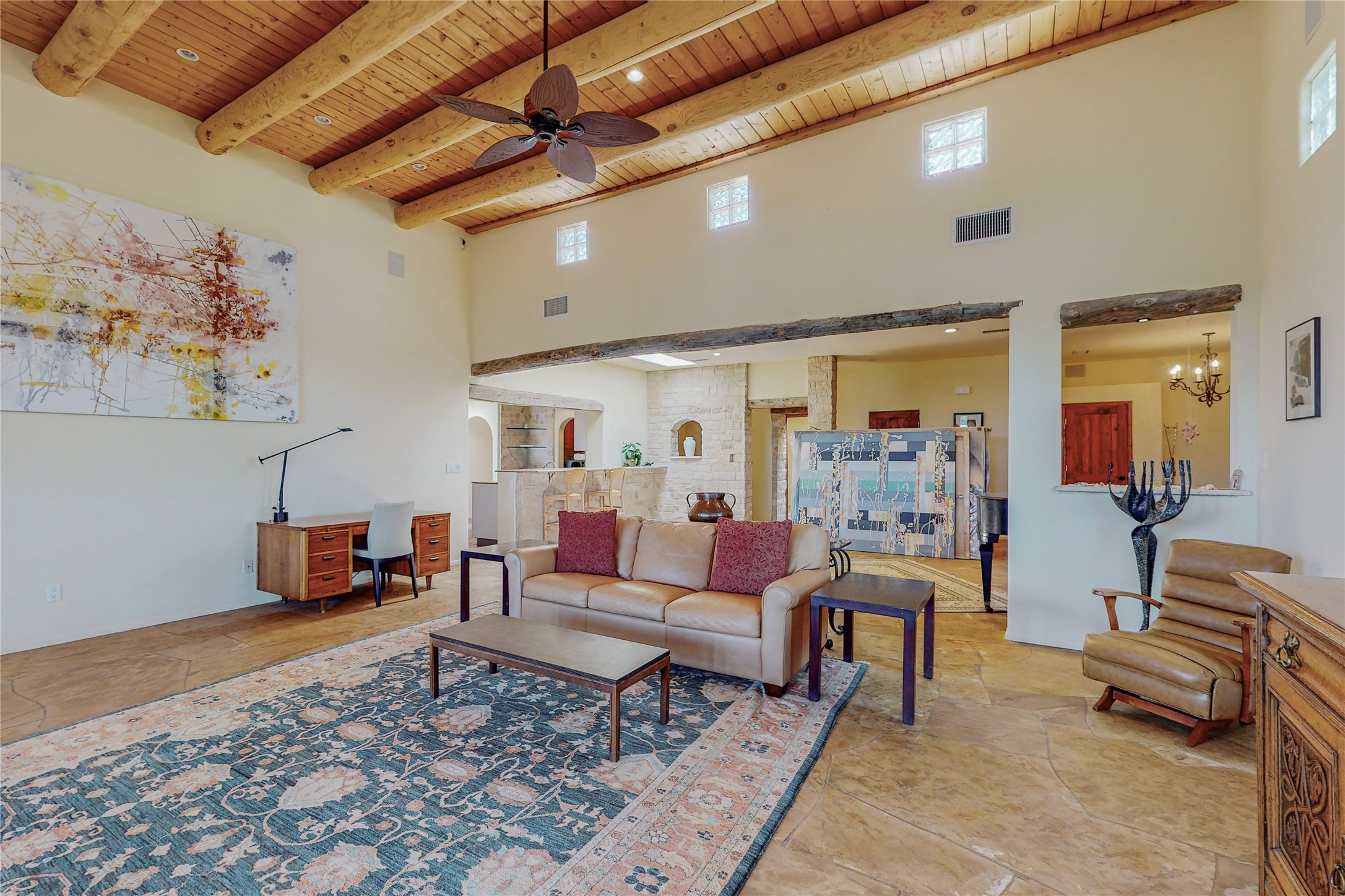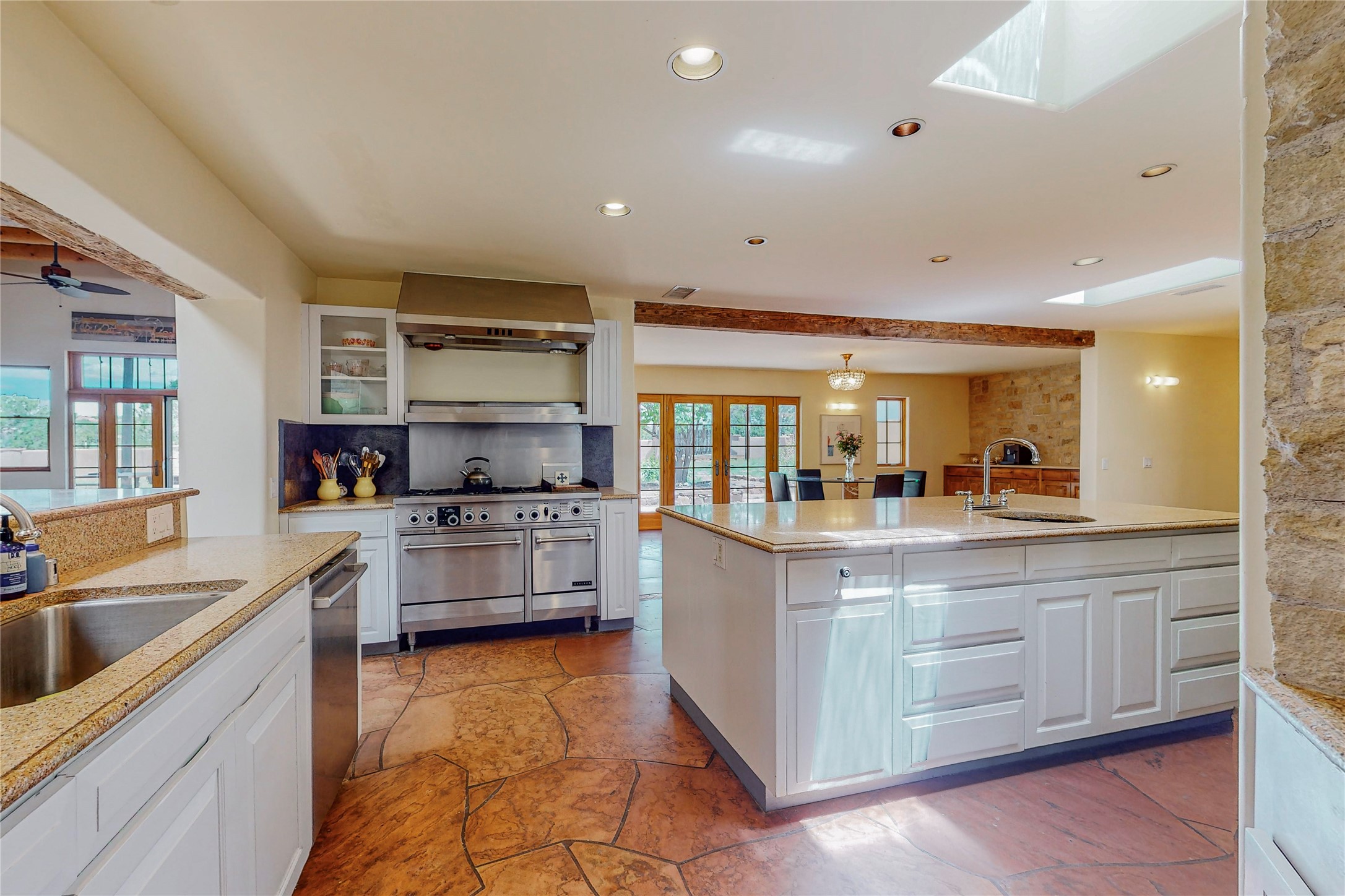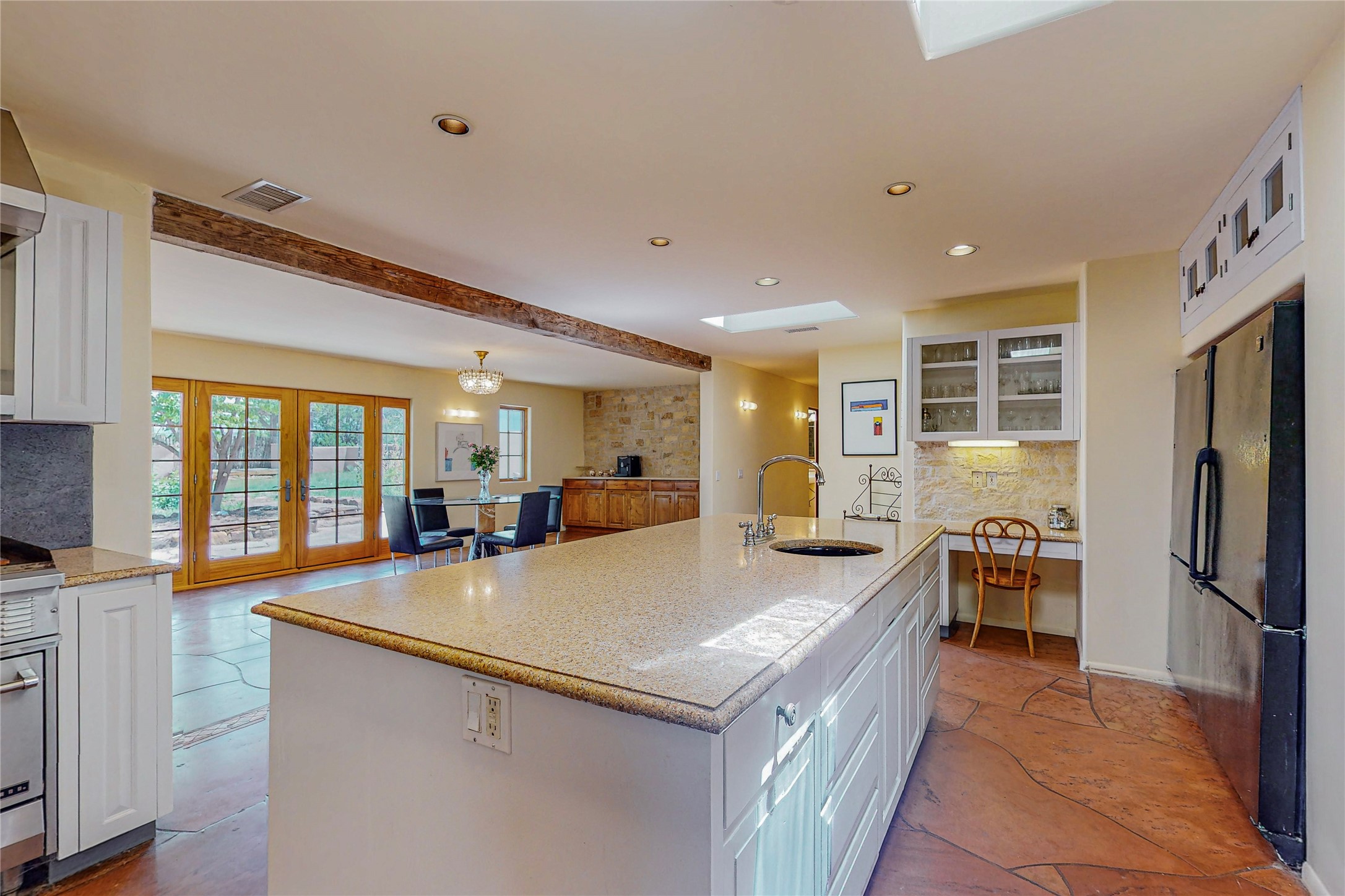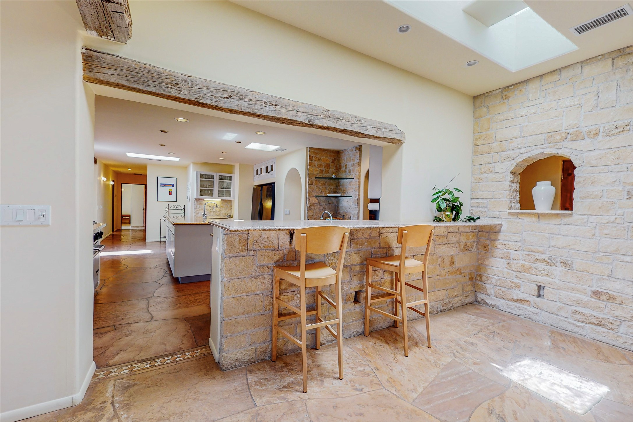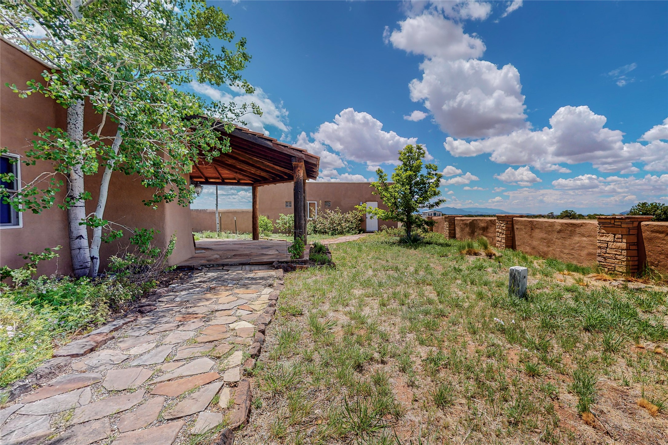 Welcome to an extraordinary slice of Southwestern serenity. This skillfully crafted ranch property is an impressive blend of rustic charm and modern amenities spread across over 4000 sq. ft. With three bedrooms and three bathrooms, this home is nestled on five private acres, rich in views, and boasts an additional room that makes a perfect office or flex room with a private entry. The home's distinctive character is marked by accents of 150-year-old reclaimed lumber and honed flagstone floors with tile inlay. Curved archways, charming details, and exquisite built-ins add to the home's unique aesthetic. Thirteen skylights throughout the house create a light-filled environment, while two fireplaces add warmth and ambiance.Cater to your culinary ambitions in the gourmet kitchen, featuring granite countertops, a spacious island, two refrigerators/freezers, a 6-burner Garland stove, and a large walk-in pantry. Entertain effortlessly indoors and out with two spacious portals equipped with a sound system, lushly landscaped gardens, and multiple flagstone patios offering panoramic mountain views. French Pella double doors lead from the dining room and family room to the great outdoors, facilitating a seamless indoor-outdoor lifestyle. The home's flexible floor plan accommodates both formal and casual living spaces. A formal dining room with limestone accents and an informal dining room with built-in shelves and counter complement the great room, replete with a kiva fireplace and 14-foot beamed ceilings. The primary suite, a true sanctuary, features a romantic bath with a vintage claw foot tub and travertine tile overlooking a private courtyard. The generously designed California Closet is not to be forgotten and is perfect for your wardrobe. Additional amenities include A/C, forced air heating, an oversized 2-car garage with four skylights and built-in storage, and a spacious laundry room equipped with a washer and dryer.