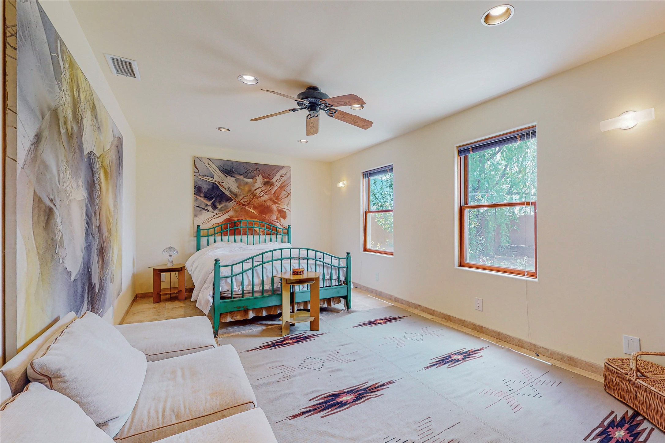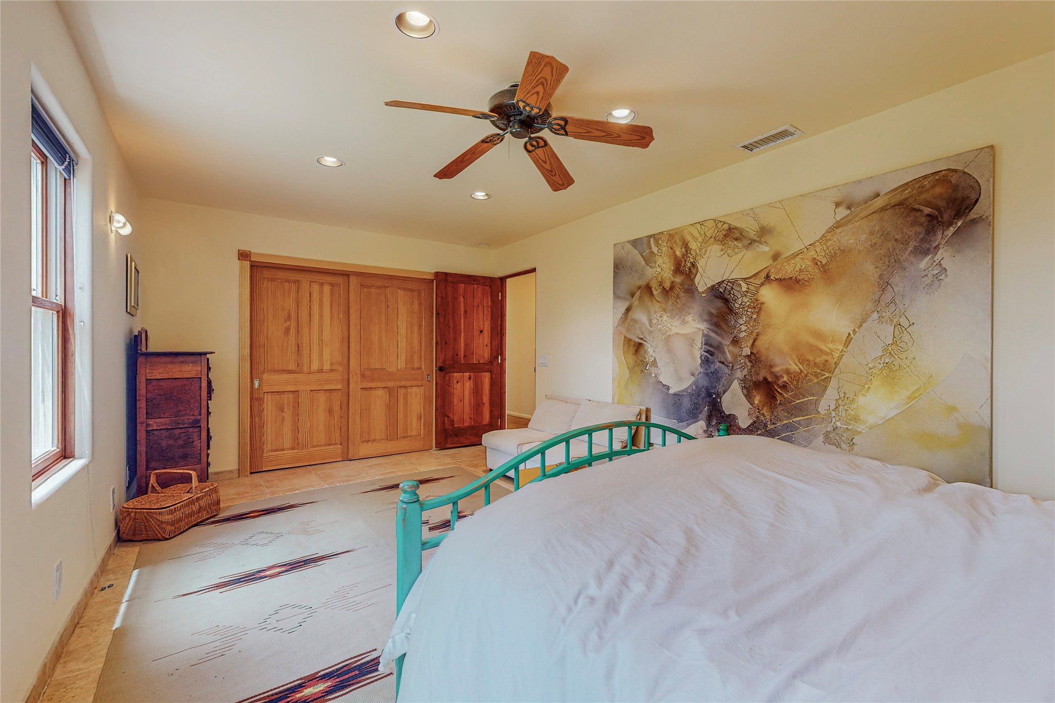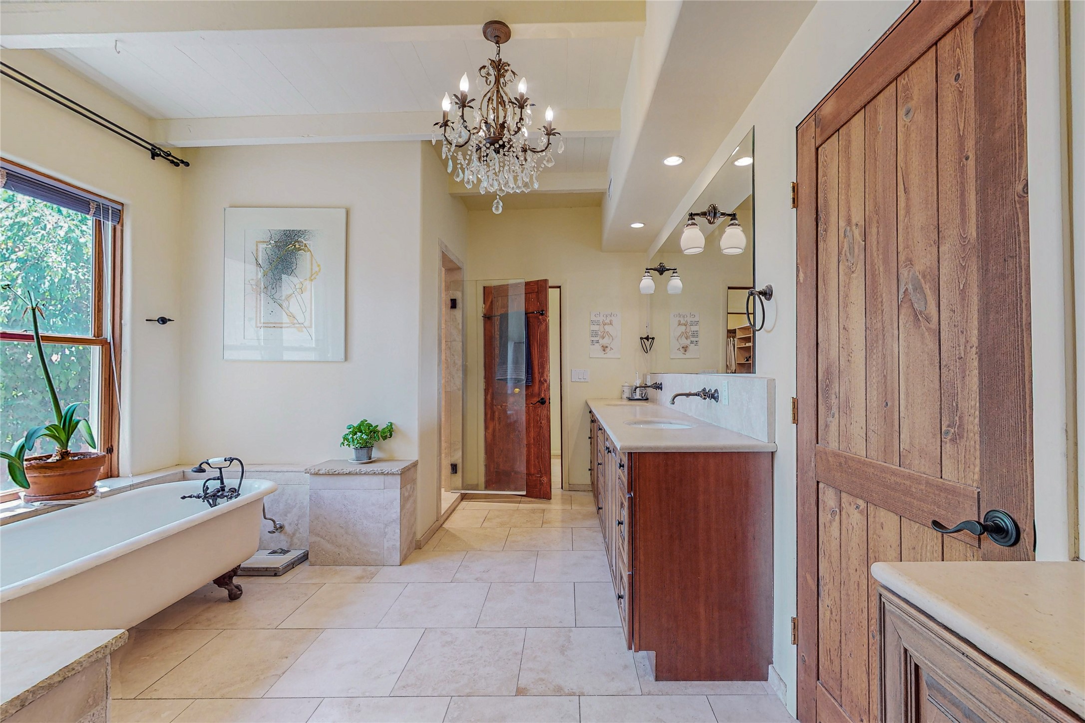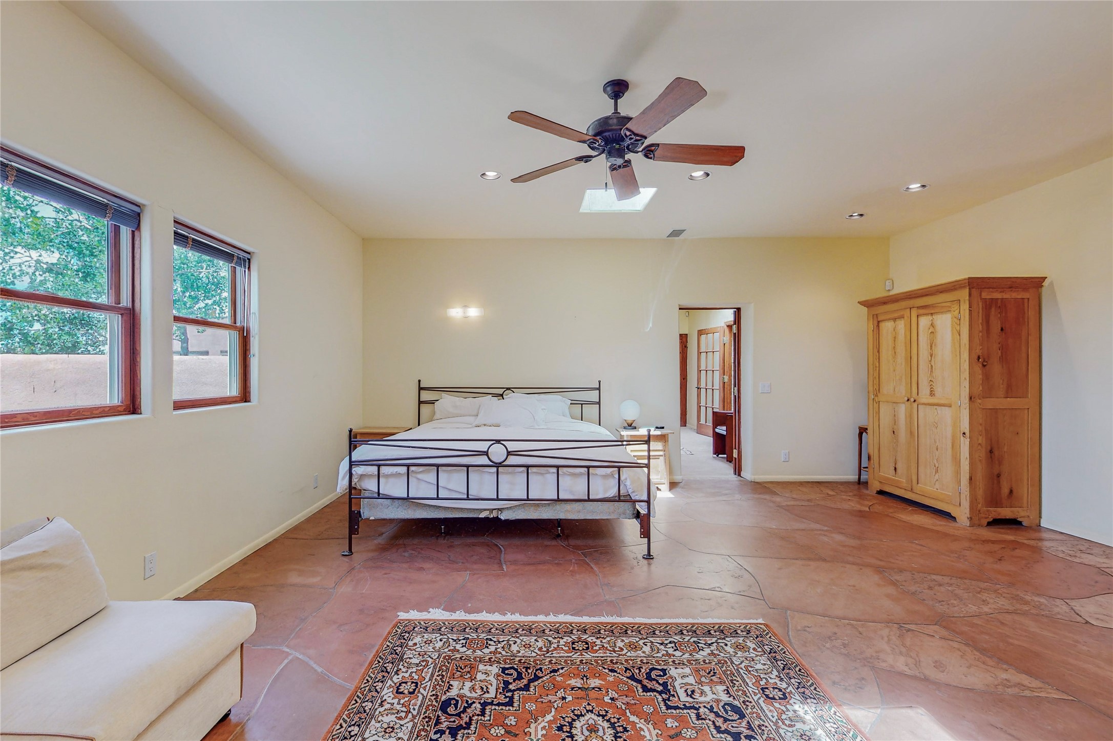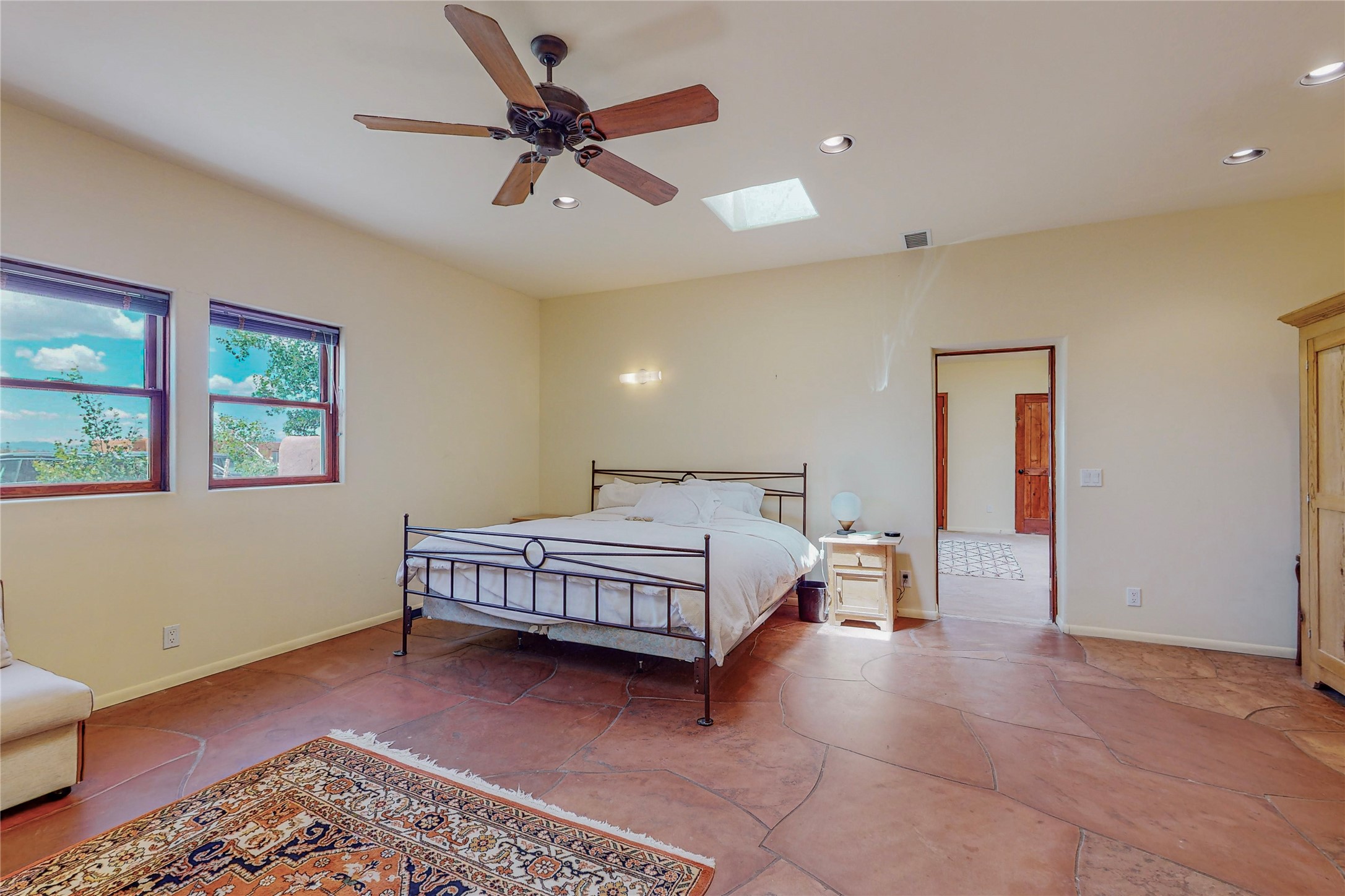 Welcome to an extraordinary slice of Southwestern serenity. This skillfully crafted ranch property is an impressive blend of rustic charm and modern amenities spread across over 4000 sq. ft. With three bedrooms and three bathrooms, this home is nestled on five private acres, rich in views, and boasts an additional room that makes a perfect office or flex room with a private entry. The home's distinctive character is marked by accents of 150-year-old reclaimed lumber and honed flagstone floors with tile inlay. Curved archways, charming details, and exquisite built-ins add to the home's unique aesthetic. Thirteen skylights throughout the house create a light-filled environment, while two fireplaces add warmth and ambiance.Cater to your culinary ambitions in the gourmet kitchen, featuring granite countertops, a spacious island, two refrigerators/freezers, a 6-burner Garland stove, and a large walk-in pantry. Entertain effortlessly indoors and out with two spacious portals equipped with a sound system, lushly landscaped gardens, and multiple flagstone patios offering panoramic mountain views. French Pella double doors lead from the dining room and family room to the great outdoors, facilitating a seamless indoor-outdoor lifestyle. The home's flexible floor plan accommodates both formal and casual living spaces. A formal dining room with limestone accents and an informal dining room with built-in shelves and counter complement the great room, replete with a kiva fireplace and 14-foot beamed ceilings. The primary suite, a true sanctuary, features a romantic bath with a vintage claw foot tub and travertine tile overlooking a private courtyard. The generously designed California Closet is not to be forgotten and is perfect for your wardrobe. Additional amenities include A/C, forced air heating, an oversized 2-car garage with four skylights and built-in storage, and a spacious laundry room equipped with a washer and dryer.