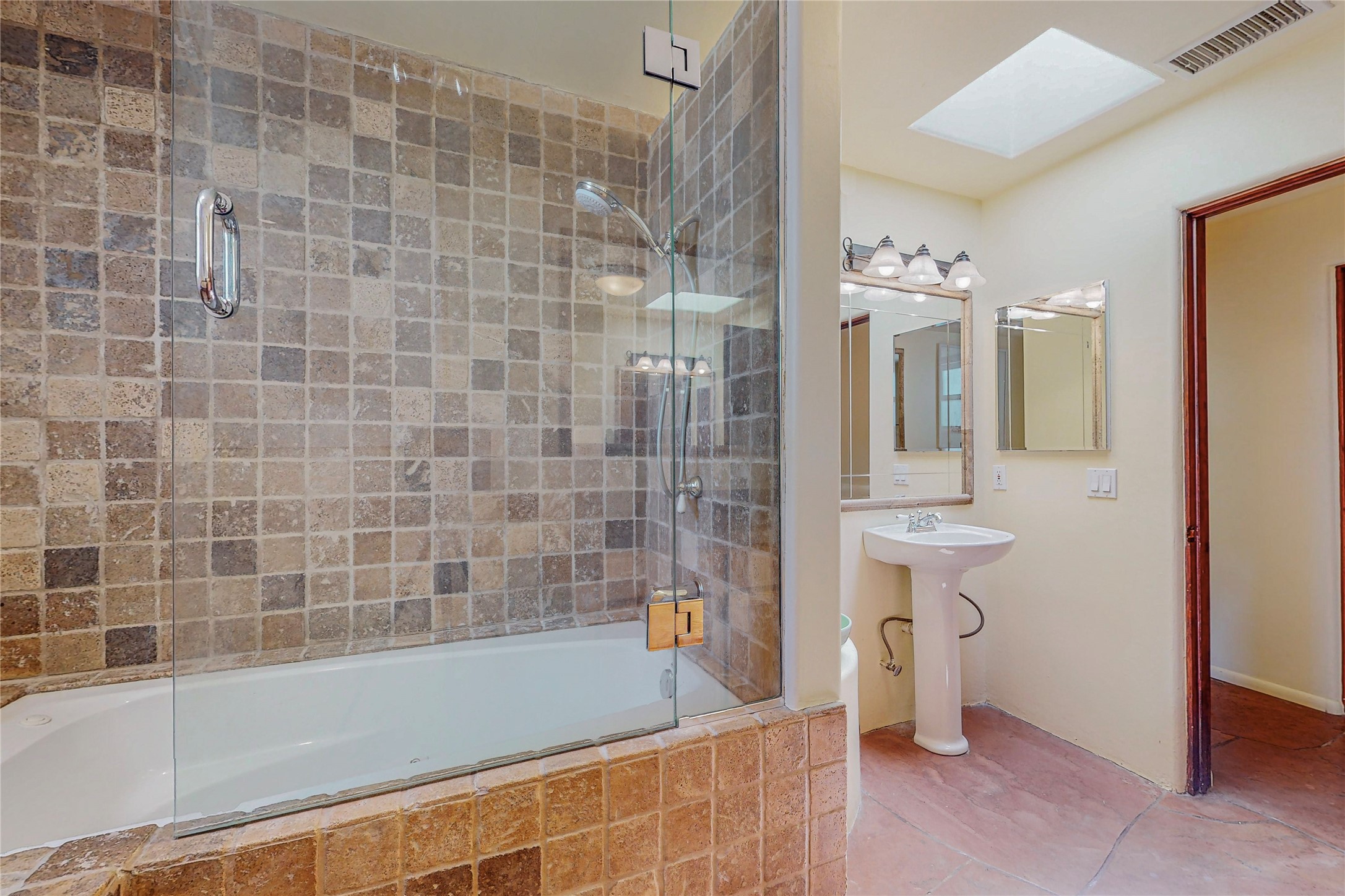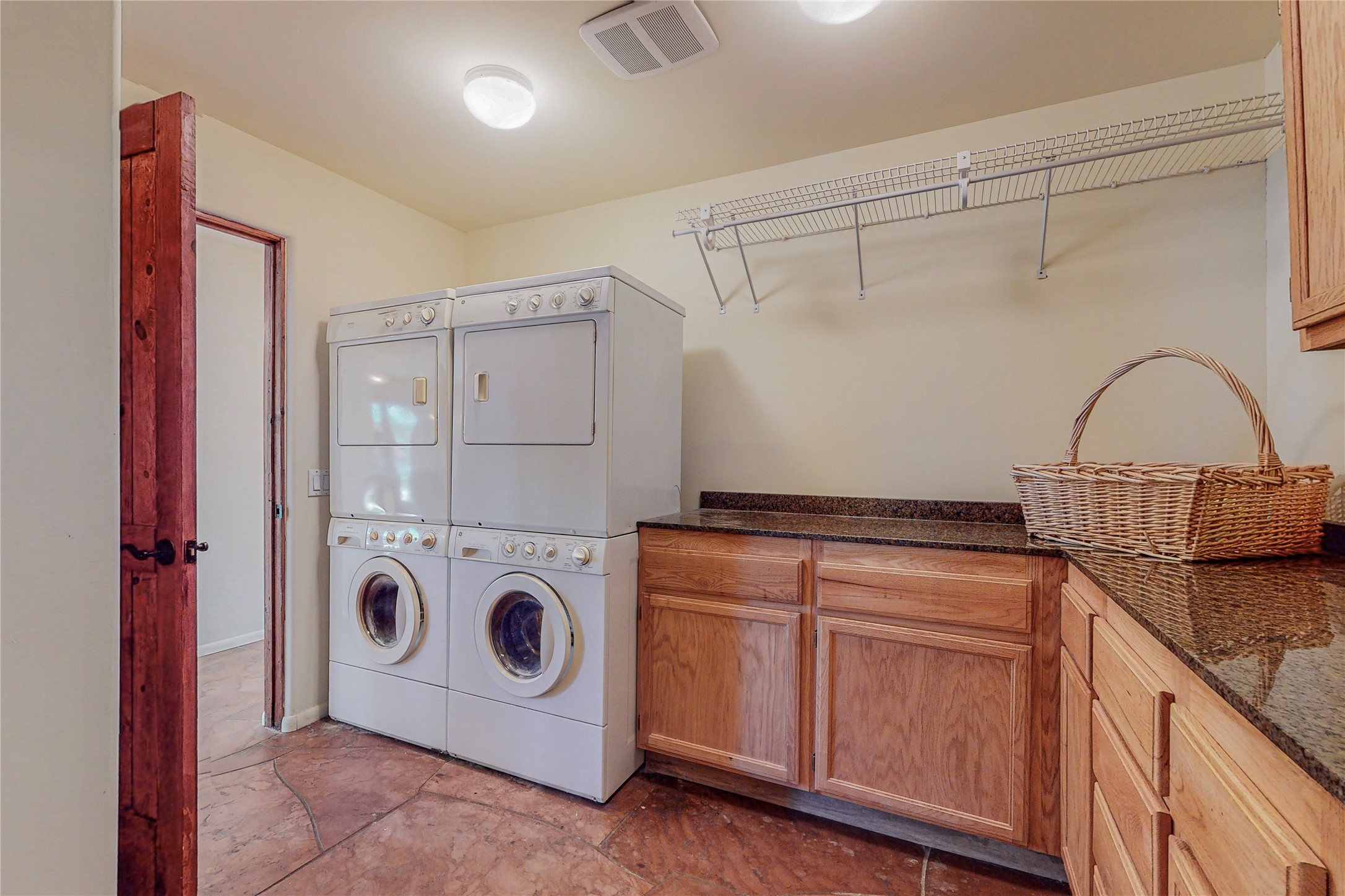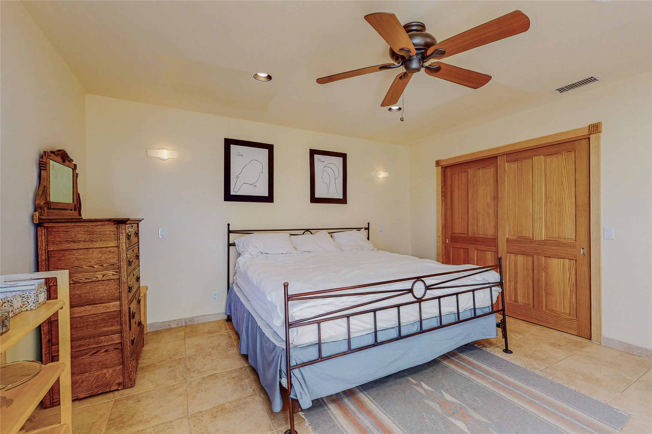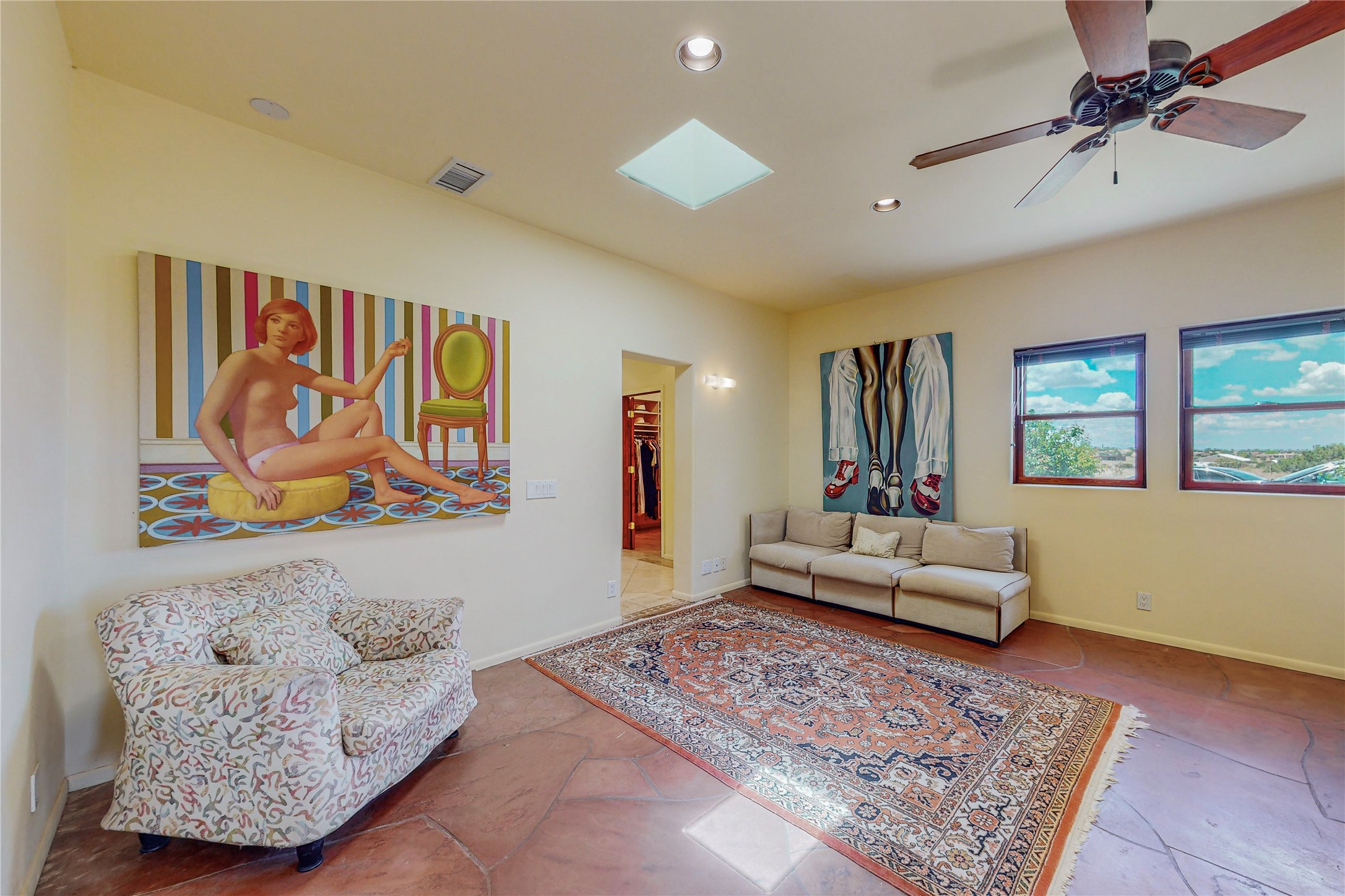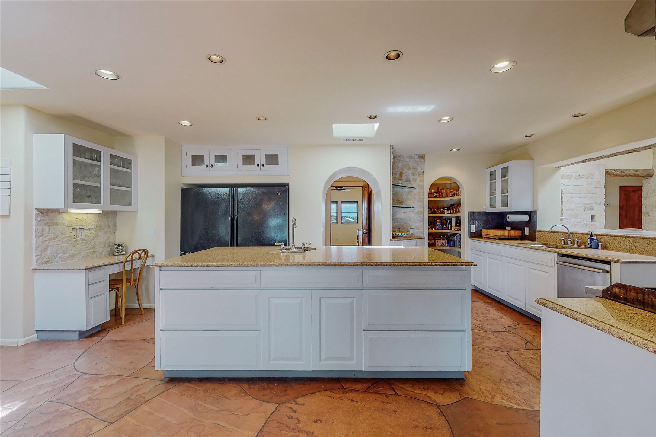 Welcome to an extraordinary slice of Southwestern serenity. This skillfully crafted ranch property is an impressive blend of rustic charm and modern amenities spread across over 4000 sq. ft. With three bedrooms and three bathrooms, this home is nestled on five private acres, rich in views, and boasts an additional room that makes a perfect office or flex room with a private entry. The home's distinctive character is marked by accents of 150-year-old reclaimed lumber and honed flagstone floors with tile inlay. Curved archways, charming details, and exquisite built-ins add to the home's unique aesthetic. Thirteen skylights throughout the house create a light-filled environment, while two fireplaces add warmth and ambiance.Cater to your culinary ambitions in the gourmet kitchen, featuring granite countertops, a spacious island, two refrigerators/freezers, a 6-burner Garland stove, and a large walk-in pantry. Entertain effortlessly indoors and out with two spacious portals equipped with a sound system, lushly landscaped gardens, and multiple flagstone patios offering panoramic mountain views. French Pella double doors lead from the dining room and family room to the great outdoors, facilitating a seamless indoor-outdoor lifestyle. The home's flexible floor plan accommodates both formal and casual living spaces. A formal dining room with limestone accents and an informal dining room with built-in shelves and counter complement the great room, replete with a kiva fireplace and 14-foot beamed ceilings. The primary suite, a true sanctuary, features a romantic bath with a vintage claw foot tub and travertine tile overlooking a private courtyard. The generously designed California Closet is not to be forgotten and is perfect for your wardrobe. Additional amenities include A/C, forced air heating, an oversized 2-car garage with four skylights and built-in storage, and a spacious laundry room equipped with a washer and dryer.