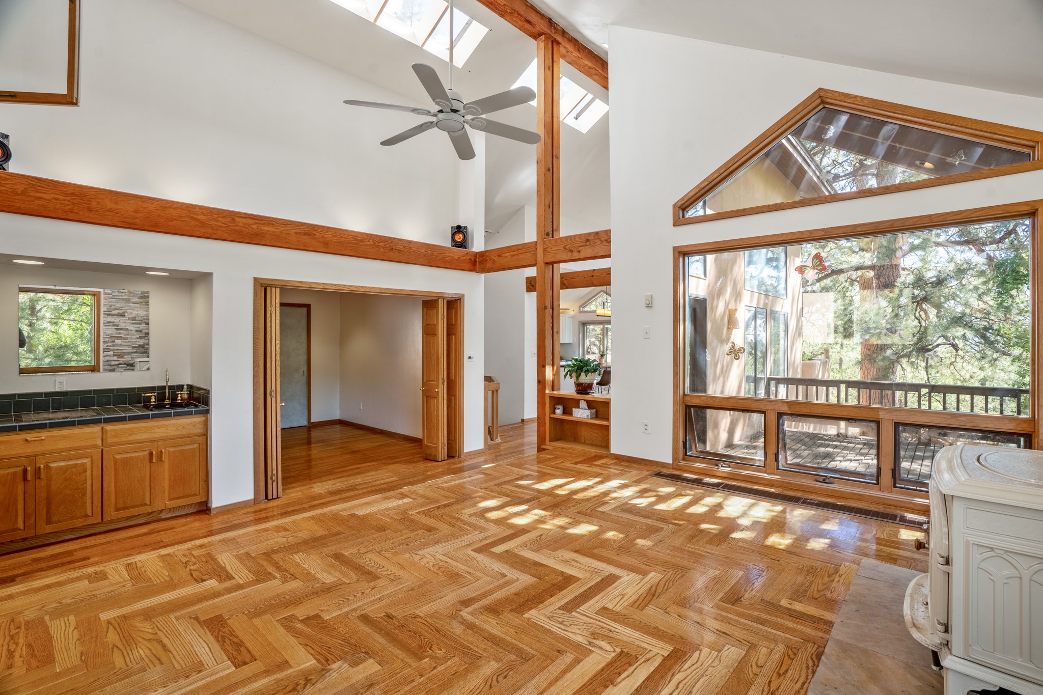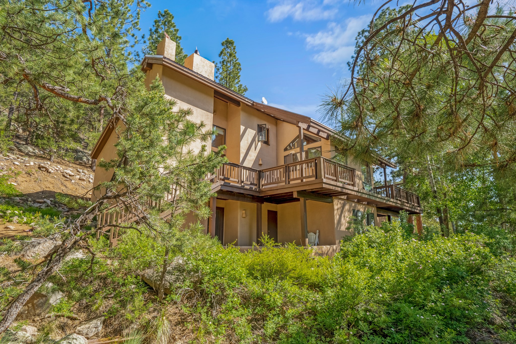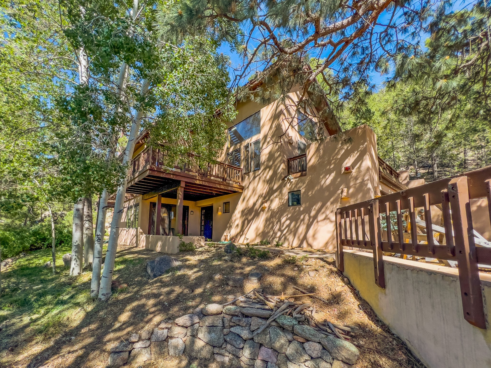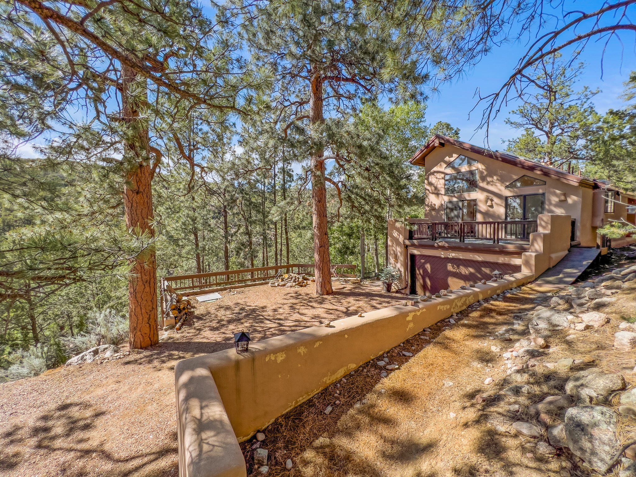Privacy and serenity set on 10+ acres, just minutes from town! This light & bright residence is about 12 minutes drive to Antalya. Rio Grande, SF Prep & Thrive schools. What an wonderful opportunity for ski and mountain enthusiasts! A truly magical setting, nestled in the trees w/ dramatic rock outcroppings: a nature lover's dream. This home has numerous , wonderful outdoor living areas (3 decks & 3 patios). Thoughtfully designed home w/ a versatile floor plant to accommodate many lifestyles (home office, kids & grandkids, guests or a separate apartment) The public areas are comfortable and functional; consisting of a recently remodeled kitchen, formal dining room, living room w/ fireplace, & a study/media room (can be an additional bedroom), all with beautiful oak floors. The dining room opens to 2 outdoor decks and the kitchen also has access to one of the decks. The charming master suite features a kiva fireplace, well appointed bath, dual closets, library/loft, that leads outside to another deck. The 2nd bedroom is large w/a big storage closet, kiva fireplace; accesses another lively outdoor living area; designed as a den/family room or a guest apartment (a bathroom & pantry/kitchen adjoin it) so it can easily be a self-contained studio apt. The 11 acre site offers privacy and great hiking. No steep mountainous roads & mainly paved; this gated neighborhood off Old Santa Fe Trail is just minutes to the Plaza