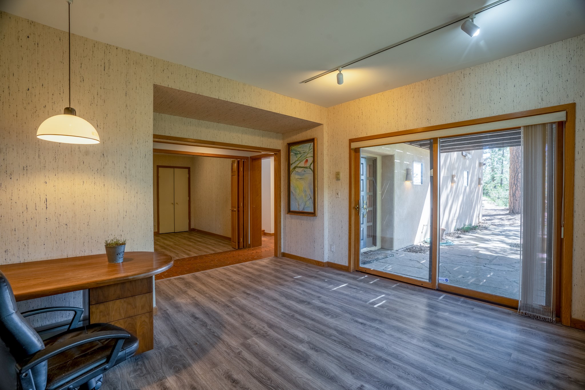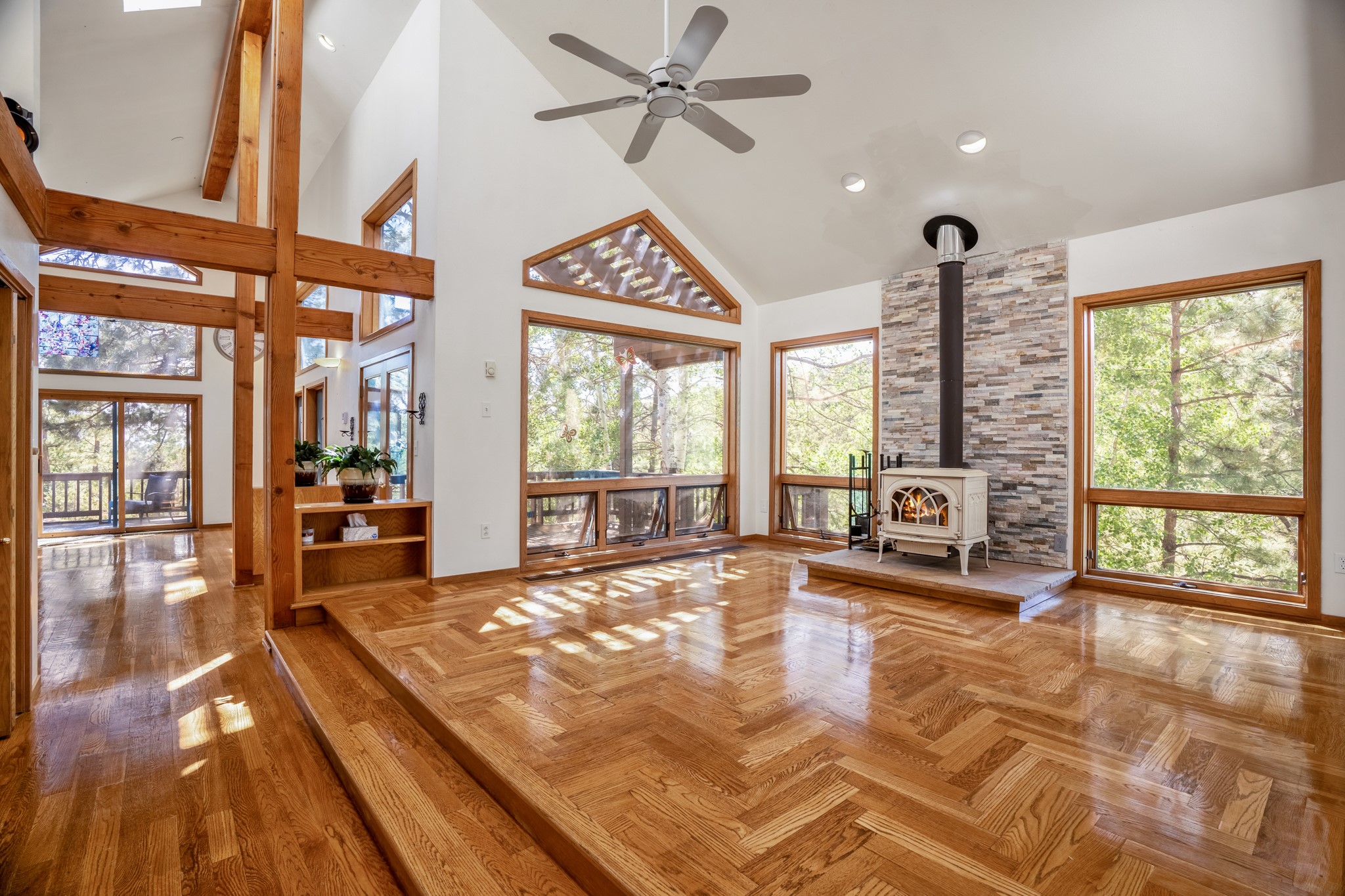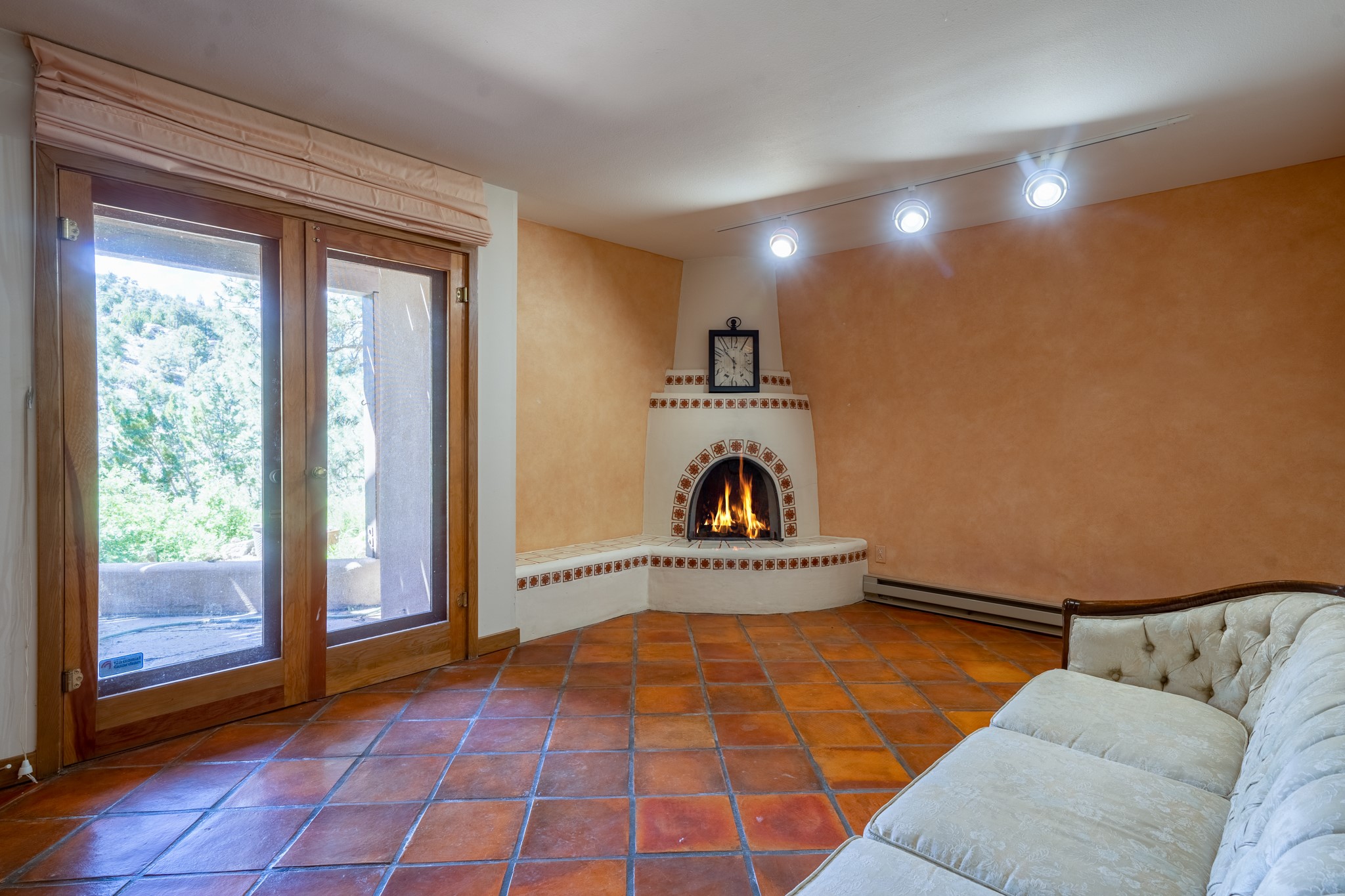 Privacy and serenity set on 10+ acres, just minutes from town! This light & bright residence is about 12 minutes drive to Antalya. Rio Grande, SF Prep & Thrive schools. What an wonderful opportunity for ski and mountain enthusiasts! A truly magical setting, nestled in the trees w/ dramatic rock outcroppings: a nature lover's dream. This home has numerous , wonderful outdoor living areas (3 decks & 3 patios). Thoughtfully designed home w/ a versatile floor plant to accommodate many lifestyles (home office, kids & grandkids, guests or a separate apartment) The public areas are comfortable and functional; consisting of a recently remodeled kitchen, formal dining room, living room w/ fireplace, & a study/media room (can be an additional bedroom), all with beautiful oak floors. The dining room opens to 2 outdoor decks and the kitchen also has access to one of the decks. The charming master suite features a kiva fireplace, well appointed bath, dual closets, library/loft, that leads outside to another deck. The 2nd bedroom is large w/a big storage closet, kiva fireplace; accesses another lively outdoor living area; designed as a den/family room or a guest apartment (a bathroom & pantry/kitchen adjoin it) so it can easily be a self-contained studio apt. The 11 acre site offers privacy and great hiking. No steep mountainous roads & mainly paved; this gated neighborhood off Old Santa Fe Trail is just minutes to the Plaza