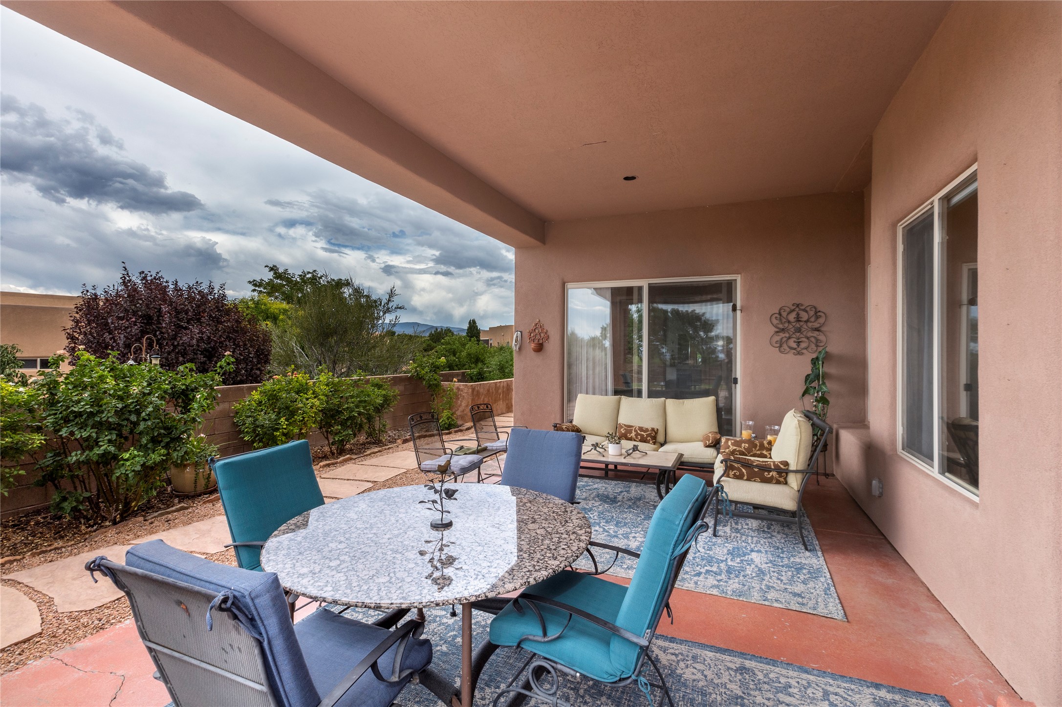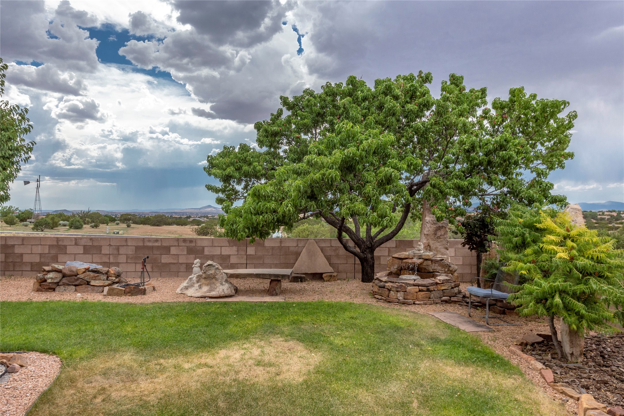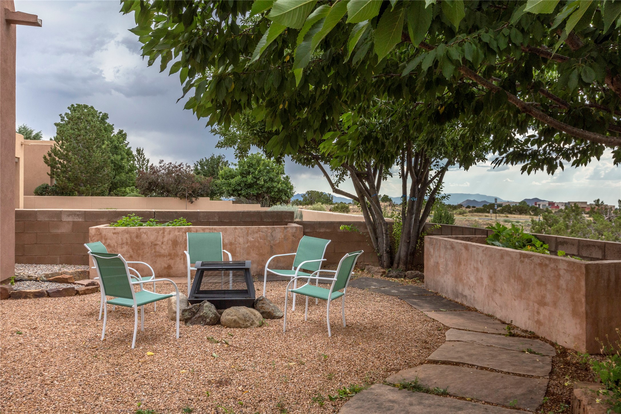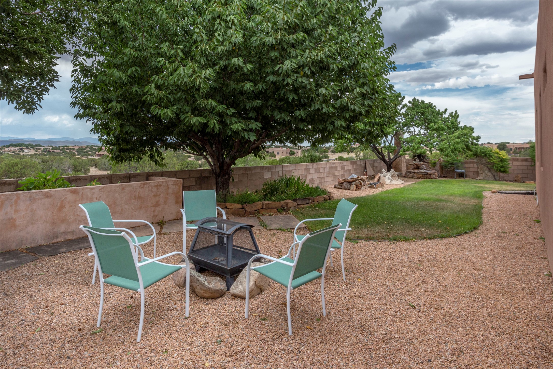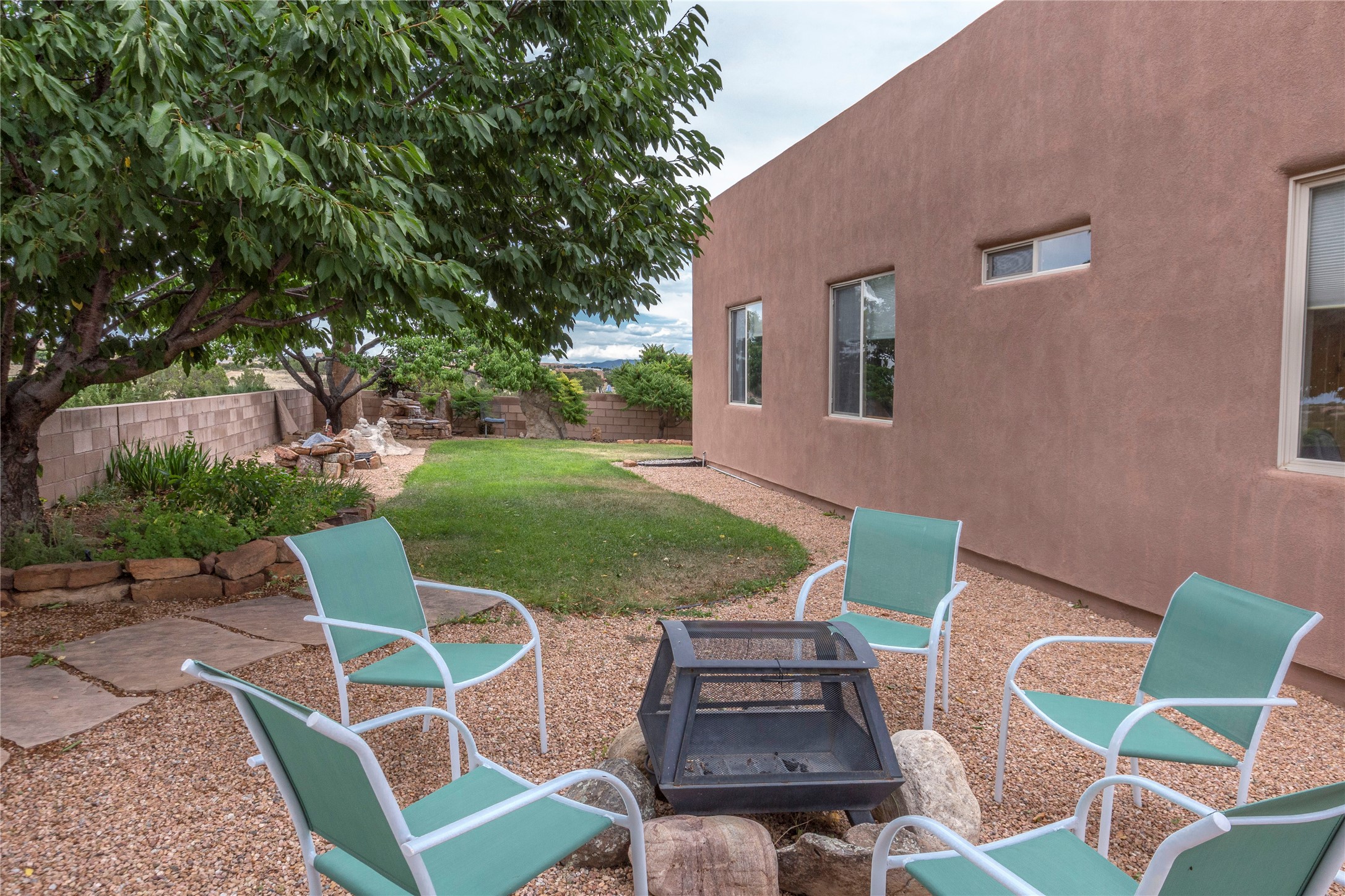 MOTIVATED SELLER! This beautifully appointed Rancho Viejo home has pueblo touches such as plaster, vigas and a kiva fireplace. The floorplan is excellent with the ensuite primary bedroom on one end and the guest rooms on the other end of the common areas of dining, living and kitchen. With 5 bedrooms, 2 bathrooms and a powder room and outdoor portal there is room for company. The open living concept has a breakfast bar and is part of the kitchen/living. The kitchen has been upgraded with granite countertops, 4 burner gas range, double hung ovens, and built in wine rack. Formal dining is bright with natural light. Unobstructed mountain and sunset views are enjoyed in the nicely landscaped back yard with nectarine, peach, apple and cherry trees, all with irrigation, water capture system and a fountain. There are 3 large raised garden beds with a drip system. This great property borders the common area greenbelt and is steps away from the neighborhood park. A two- car garage has direct access to this residence. 5 year roof warranty.