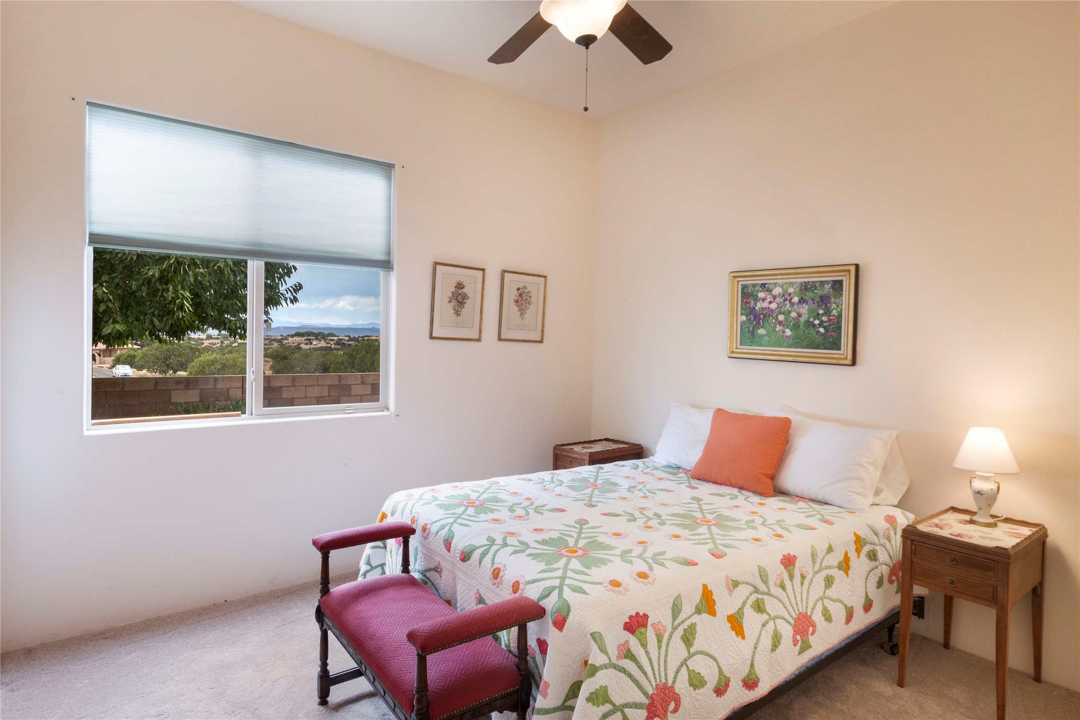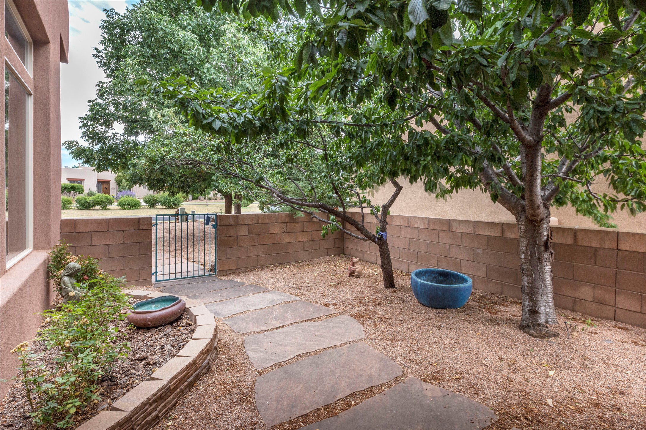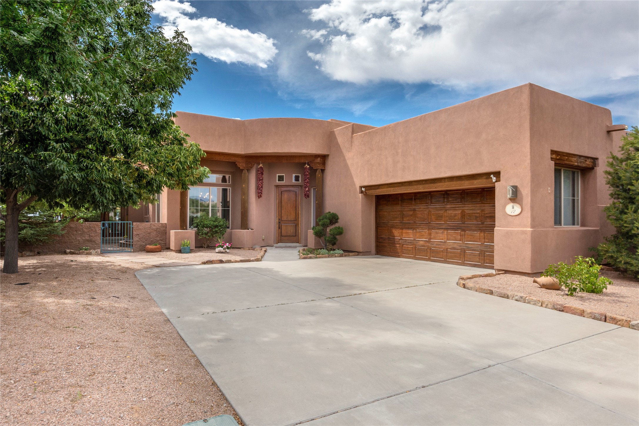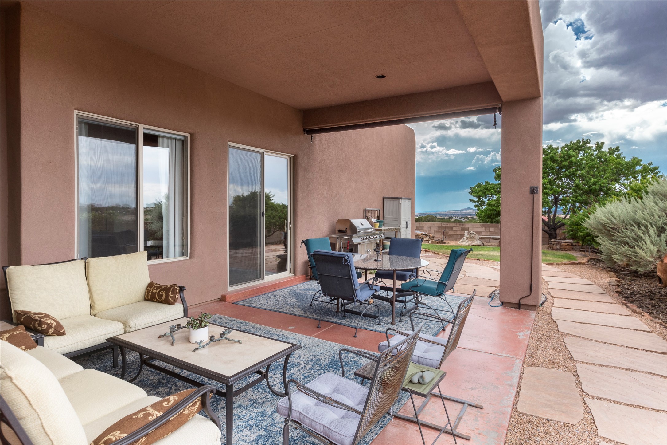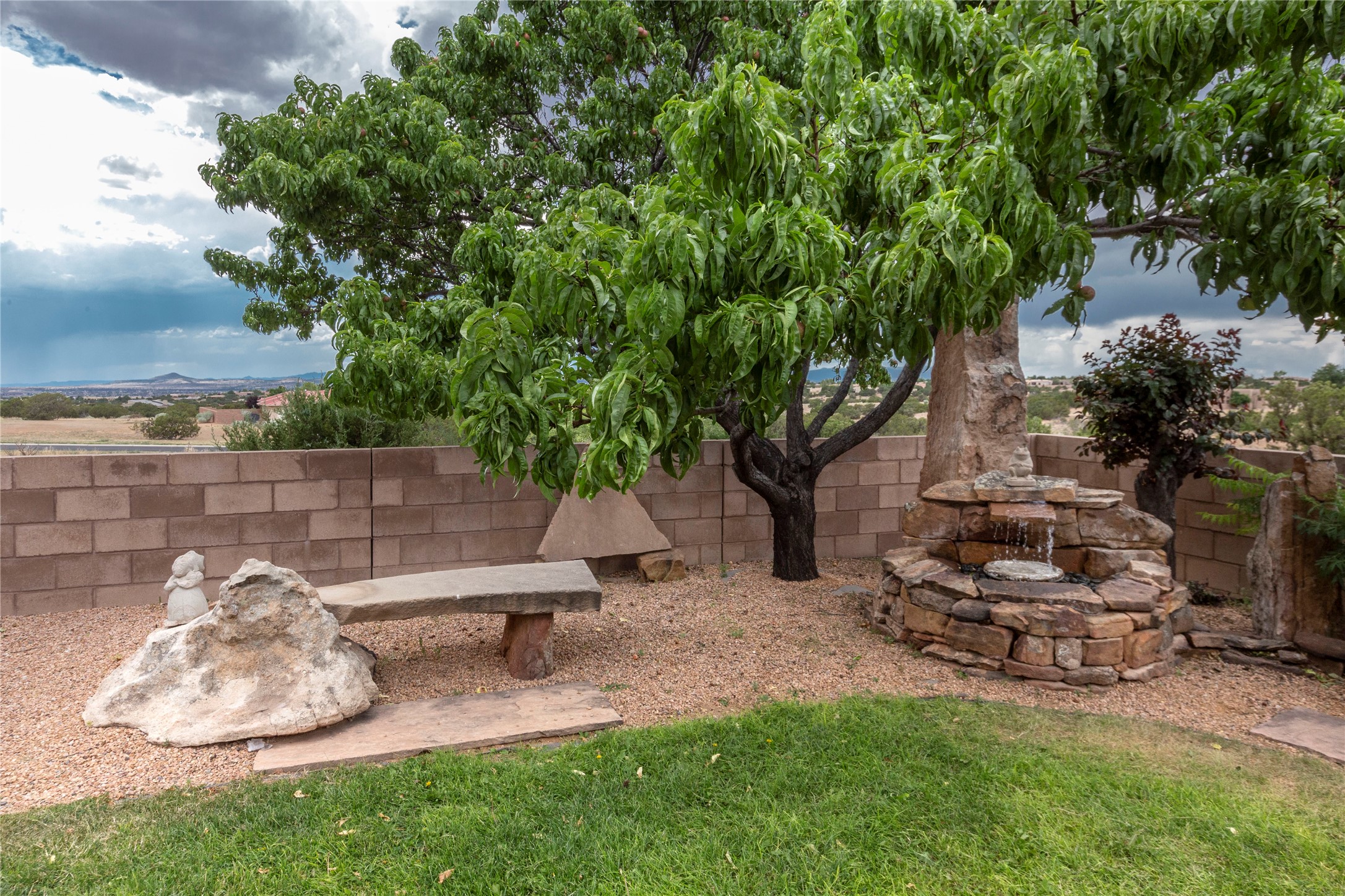 MOTIVATED SELLER! This beautifully appointed Rancho Viejo home has pueblo touches such as plaster, vigas and a kiva fireplace. The floorplan is excellent with the ensuite primary bedroom on one end and the guest rooms on the other end of the common areas of dining, living and kitchen. With 5 bedrooms, 2 bathrooms and a powder room and outdoor portal there is room for company. The open living concept has a breakfast bar and is part of the kitchen/living. The kitchen has been upgraded with granite countertops, 4 burner gas range, double hung ovens, and built in wine rack. Formal dining is bright with natural light. Unobstructed mountain and sunset views are enjoyed in the nicely landscaped back yard with nectarine, peach, apple and cherry trees, all with irrigation, water capture system and a fountain. There are 3 large raised garden beds with a drip system. This great property borders the common area greenbelt and is steps away from the neighborhood park. A two- car garage has direct access to this residence. 5 year roof warranty.