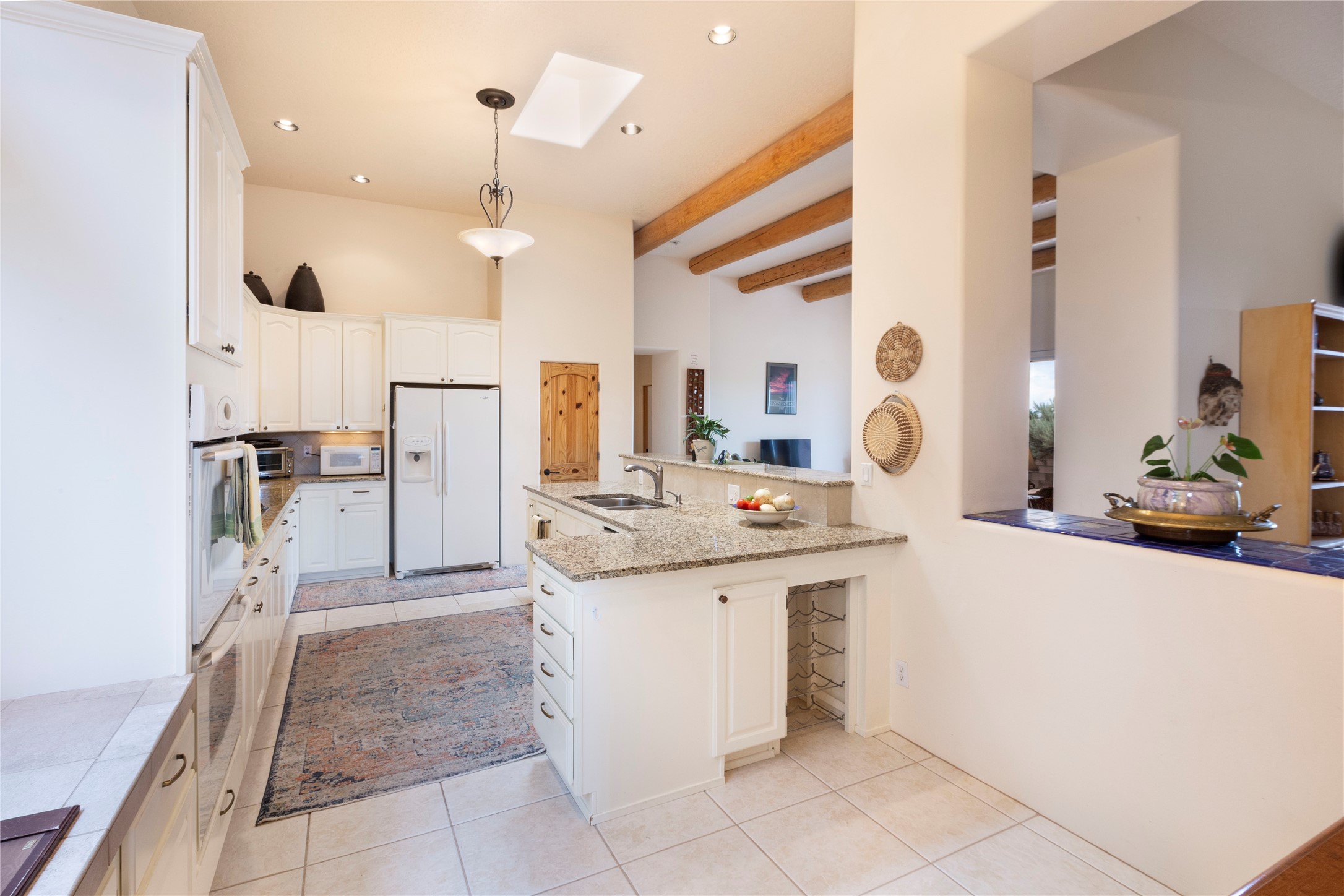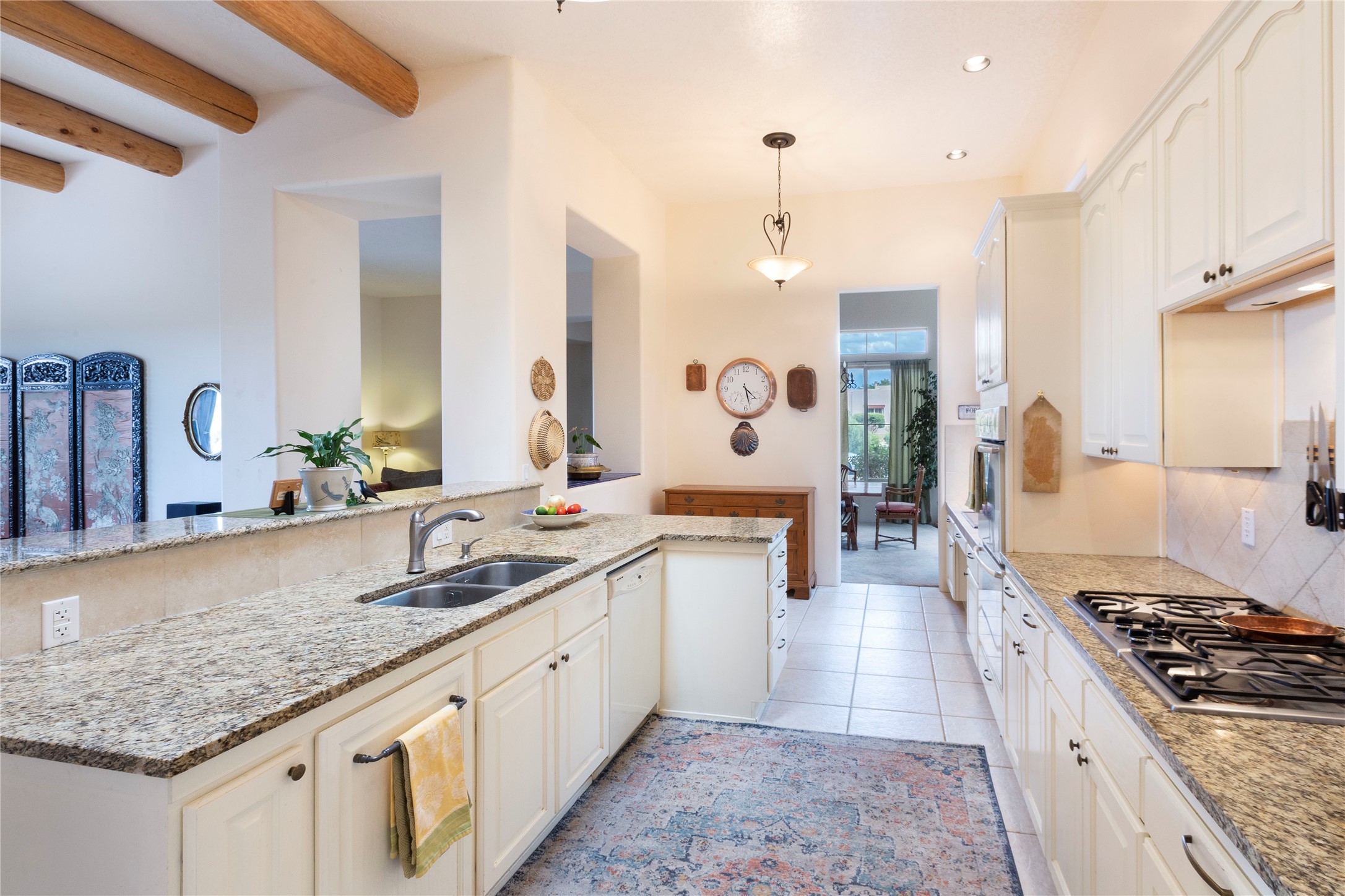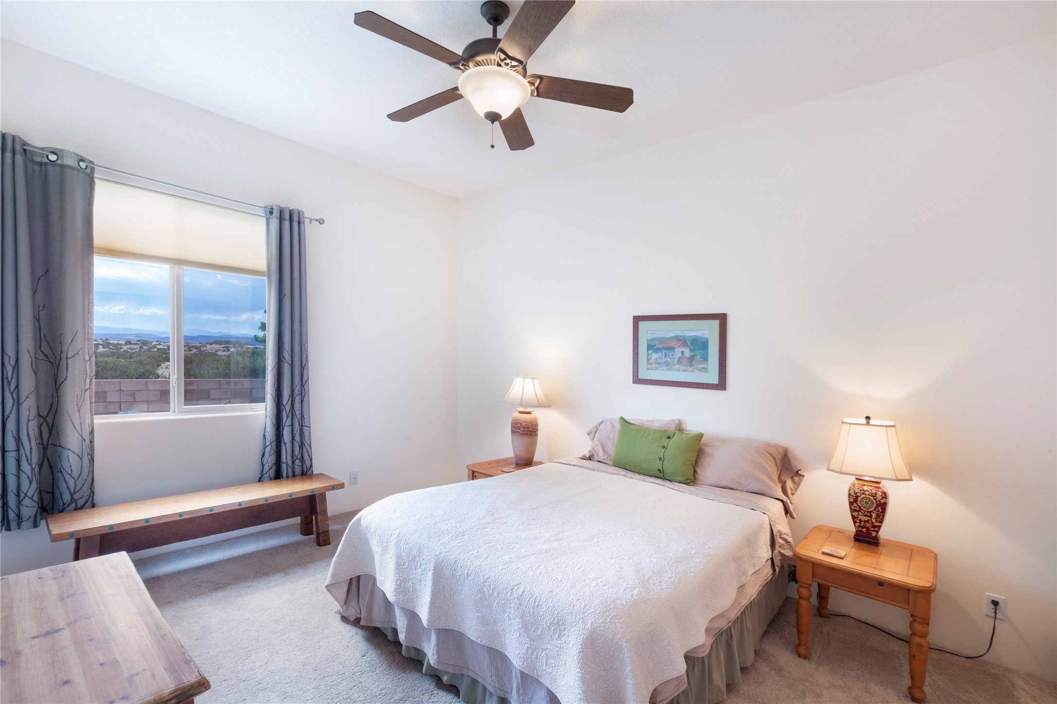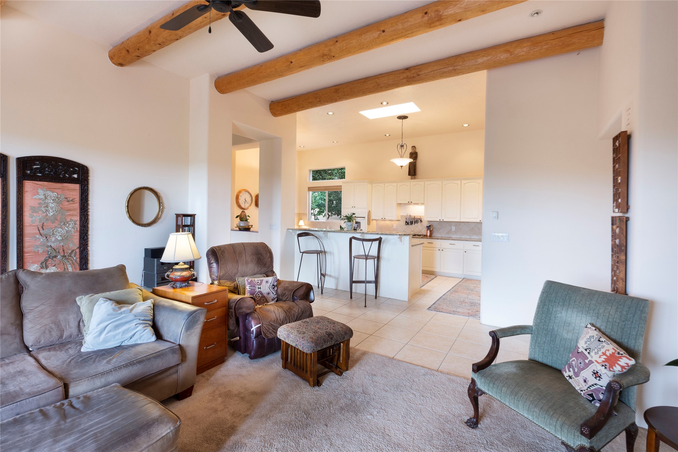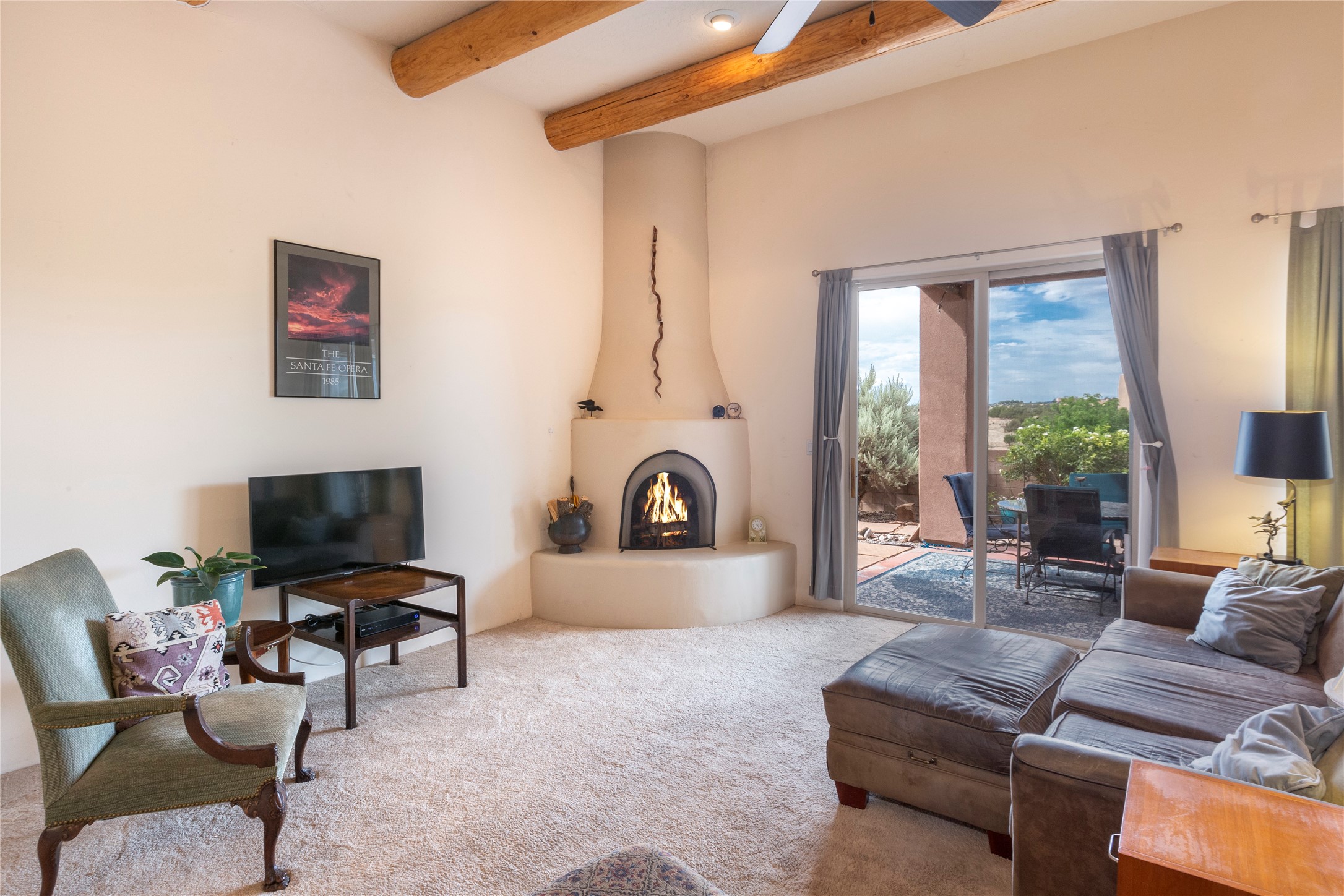 MOTIVATED SELLER! This beautifully appointed Rancho Viejo home has pueblo touches such as plaster, vigas and a kiva fireplace. The floorplan is excellent with the ensuite primary bedroom on one end and the guest rooms on the other end of the common areas of dining, living and kitchen. With 5 bedrooms, 2 bathrooms and a powder room and outdoor portal there is room for company. The open living concept has a breakfast bar and is part of the kitchen/living. The kitchen has been upgraded with granite countertops, 4 burner gas range, double hung ovens, and built in wine rack. Formal dining is bright with natural light. Unobstructed mountain and sunset views are enjoyed in the nicely landscaped back yard with nectarine, peach, apple and cherry trees, all with irrigation, water capture system and a fountain. There are 3 large raised garden beds with a drip system. This great property borders the common area greenbelt and is steps away from the neighborhood park. A two- car garage has direct access to this residence. 5 year roof warranty.