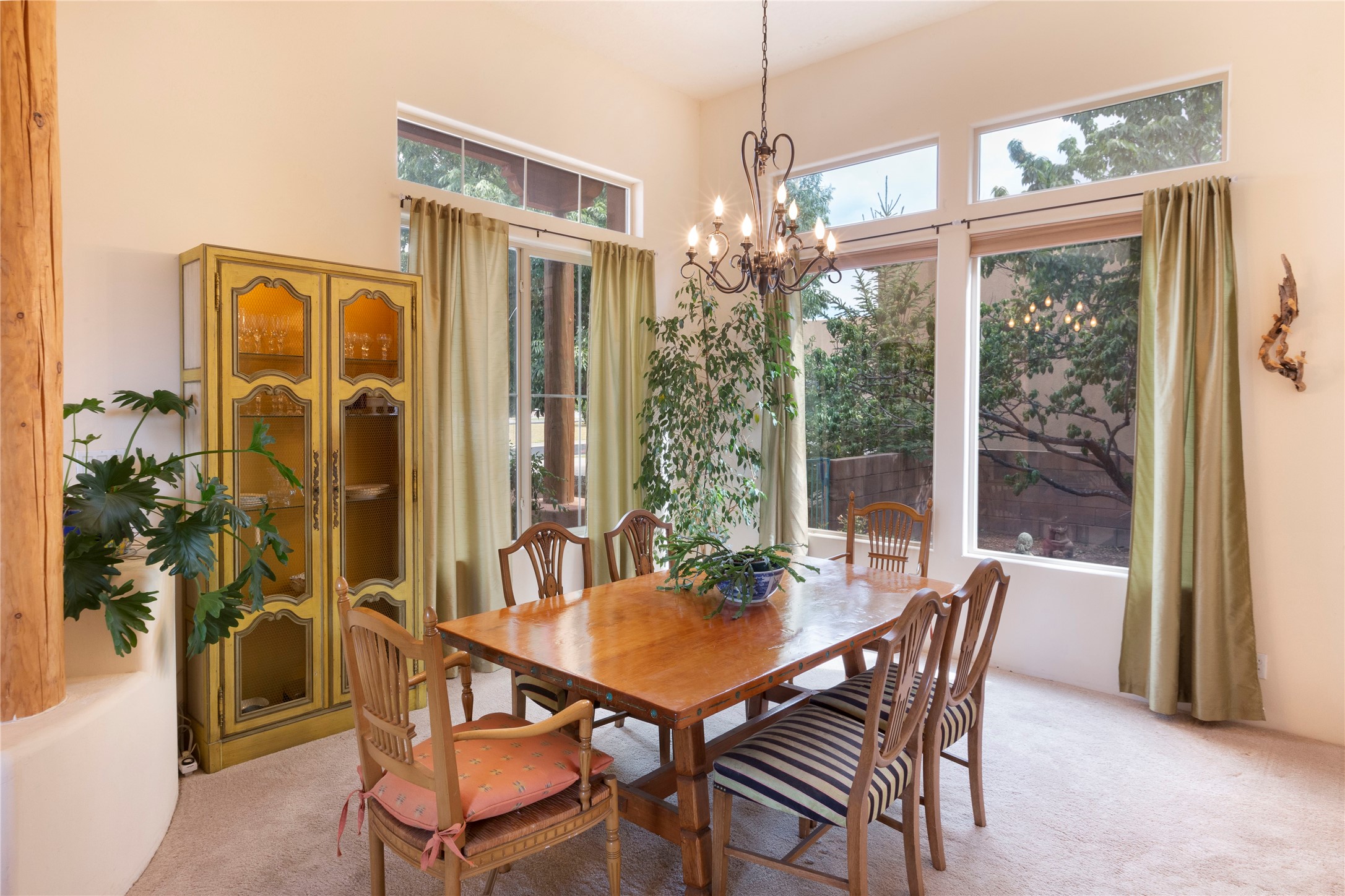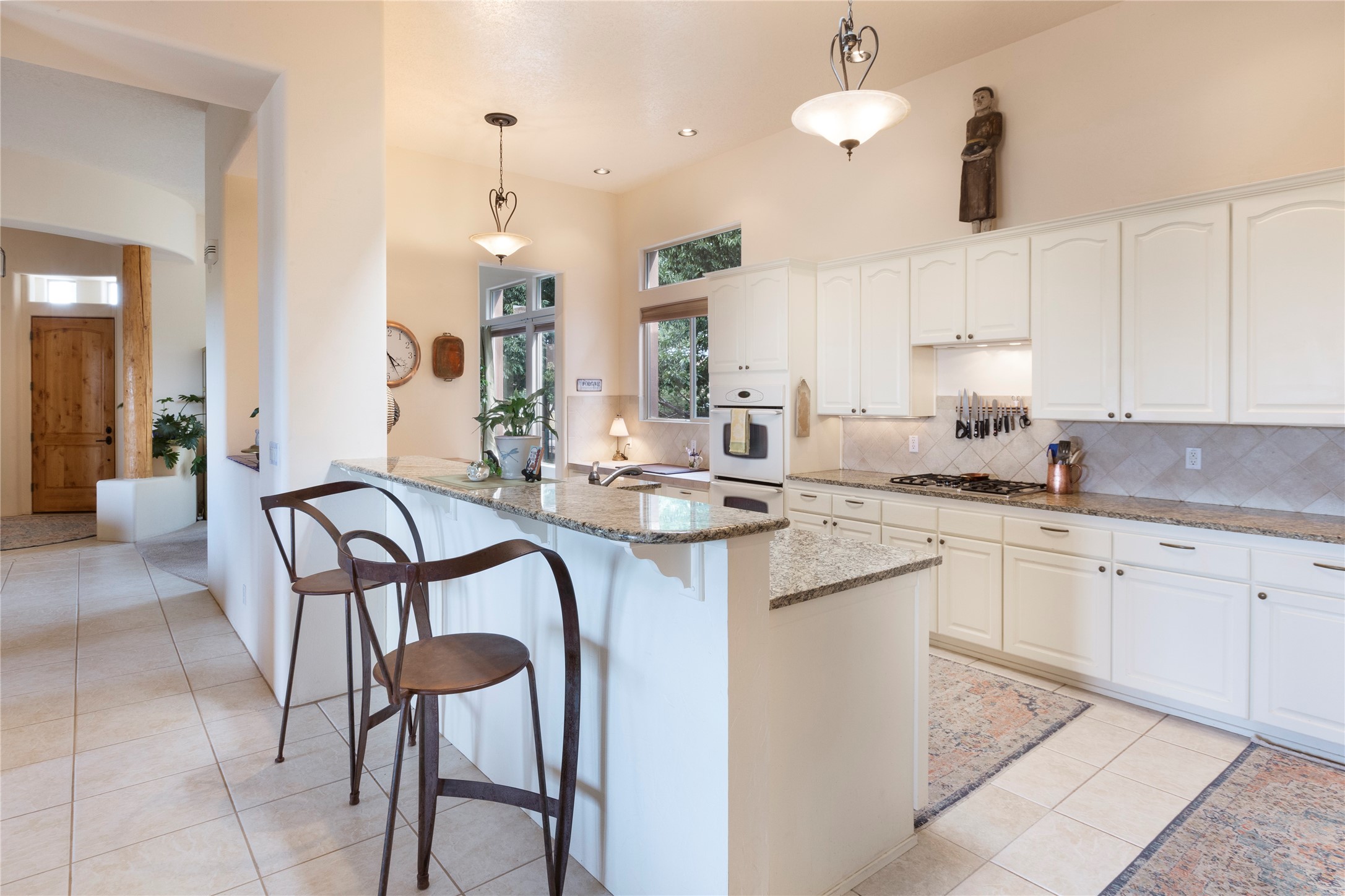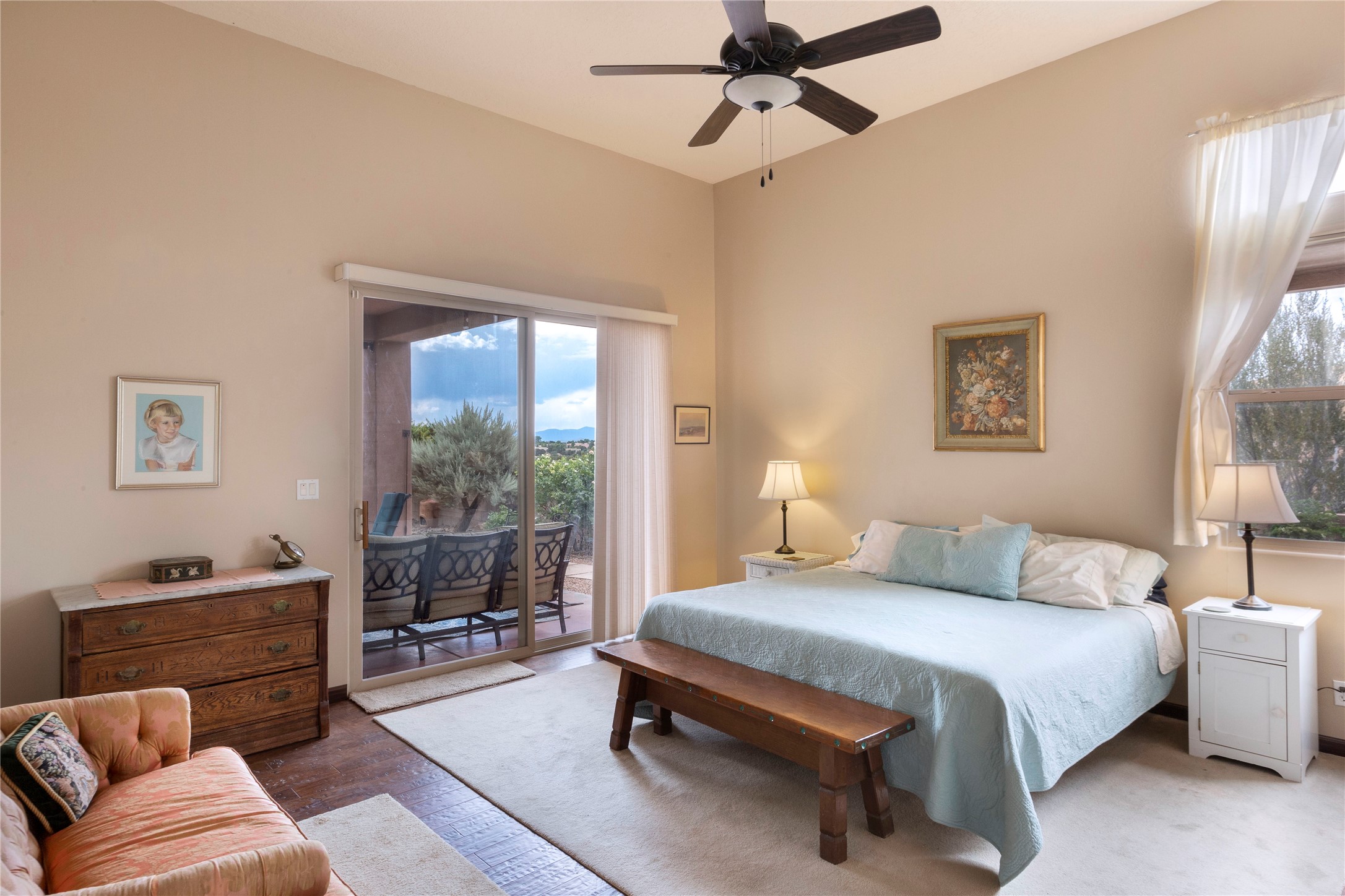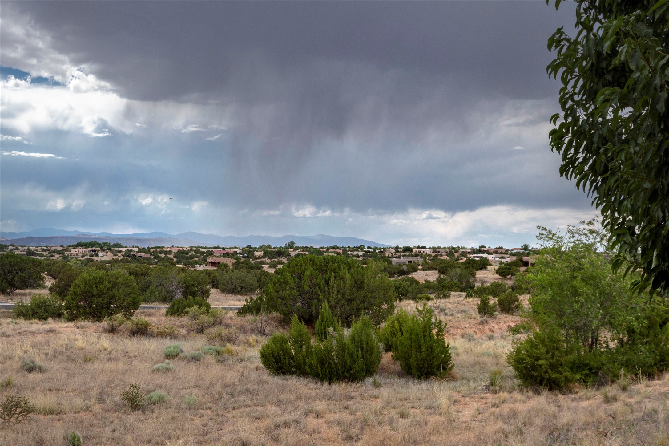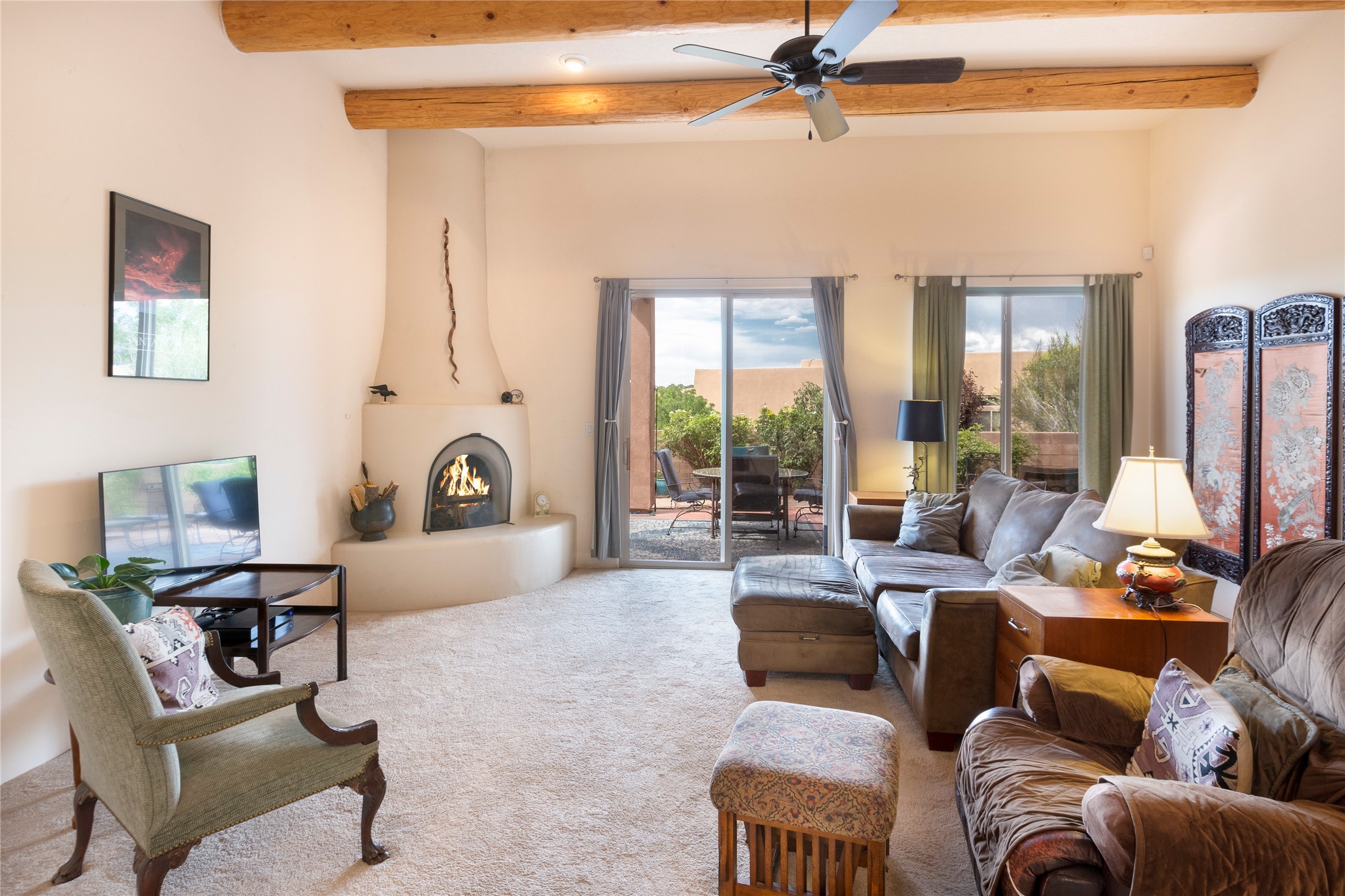 MOTIVATED SELLER! This beautifully appointed Rancho Viejo home has pueblo touches such as plaster, vigas and a kiva fireplace. The floorplan is excellent with the ensuite primary bedroom on one end and the guest rooms on the other end of the common areas of dining, living and kitchen. With 5 bedrooms, 2 bathrooms and a powder room and outdoor portal there is room for company. The open living concept has a breakfast bar and is part of the kitchen/living. The kitchen has been upgraded with granite countertops, 4 burner gas range, double hung ovens, and built in wine rack. Formal dining is bright with natural light. Unobstructed mountain and sunset views are enjoyed in the nicely landscaped back yard with nectarine, peach, apple and cherry trees, all with irrigation, water capture system and a fountain. There are 3 large raised garden beds with a drip system. This great property borders the common area greenbelt and is steps away from the neighborhood park. A two- car garage has direct access to this residence. 5 year roof warranty.