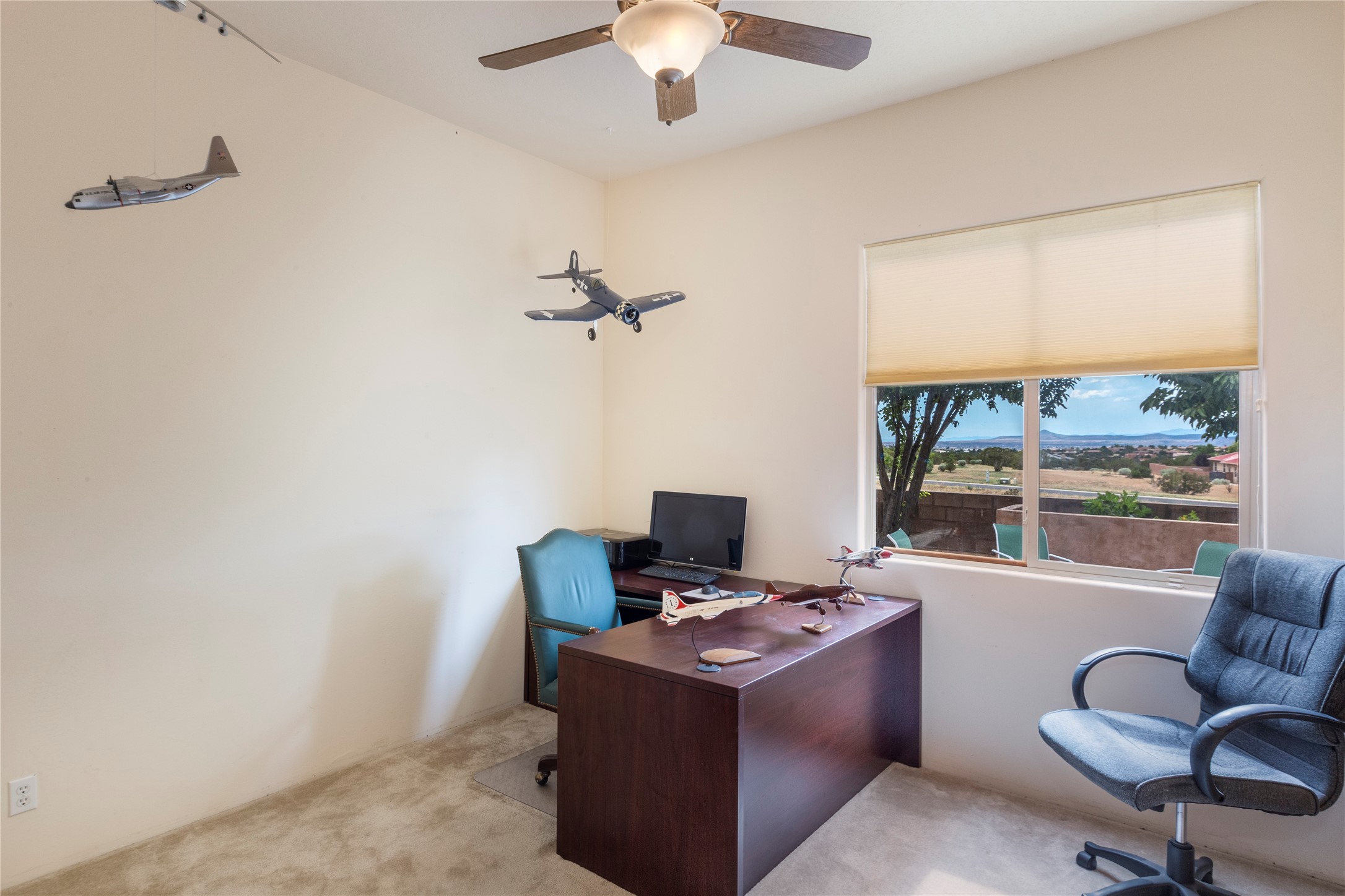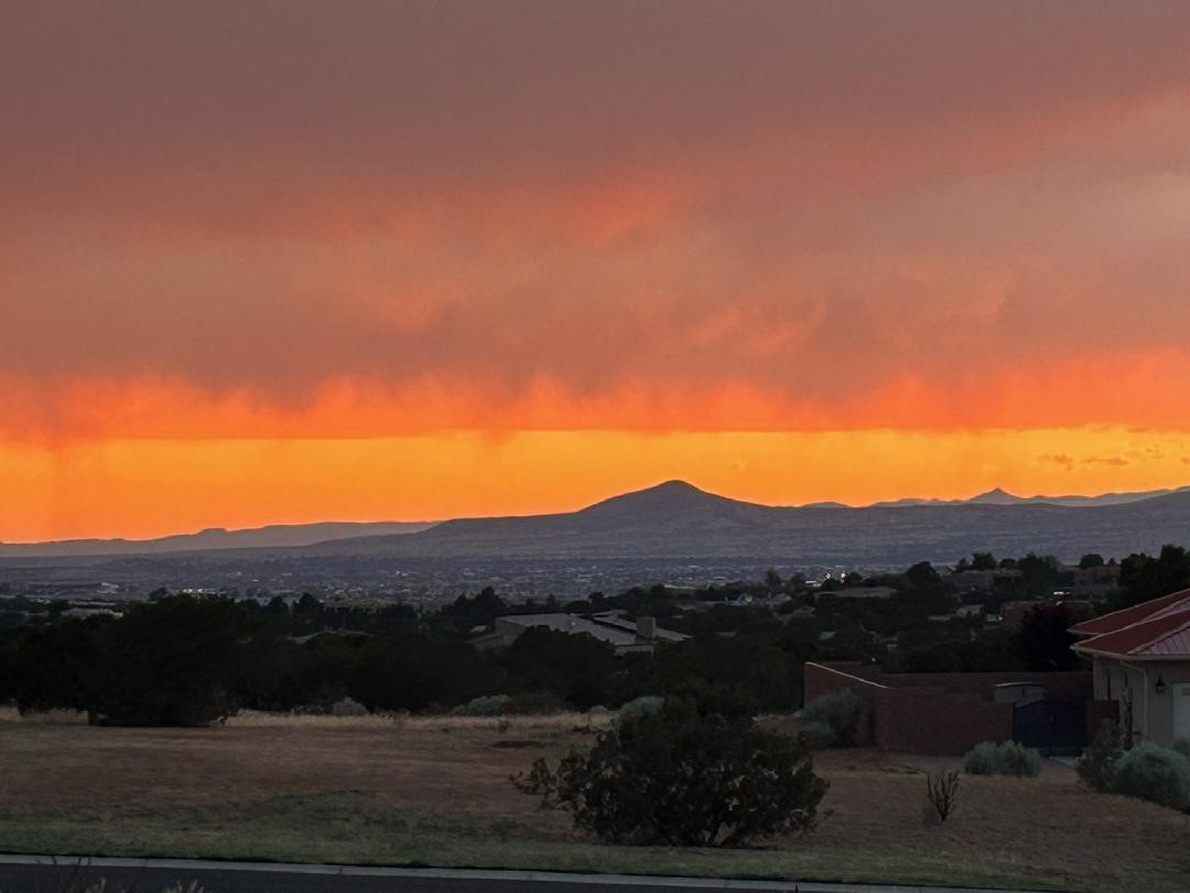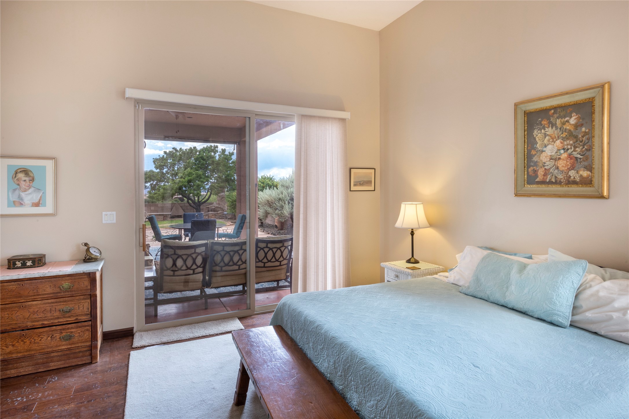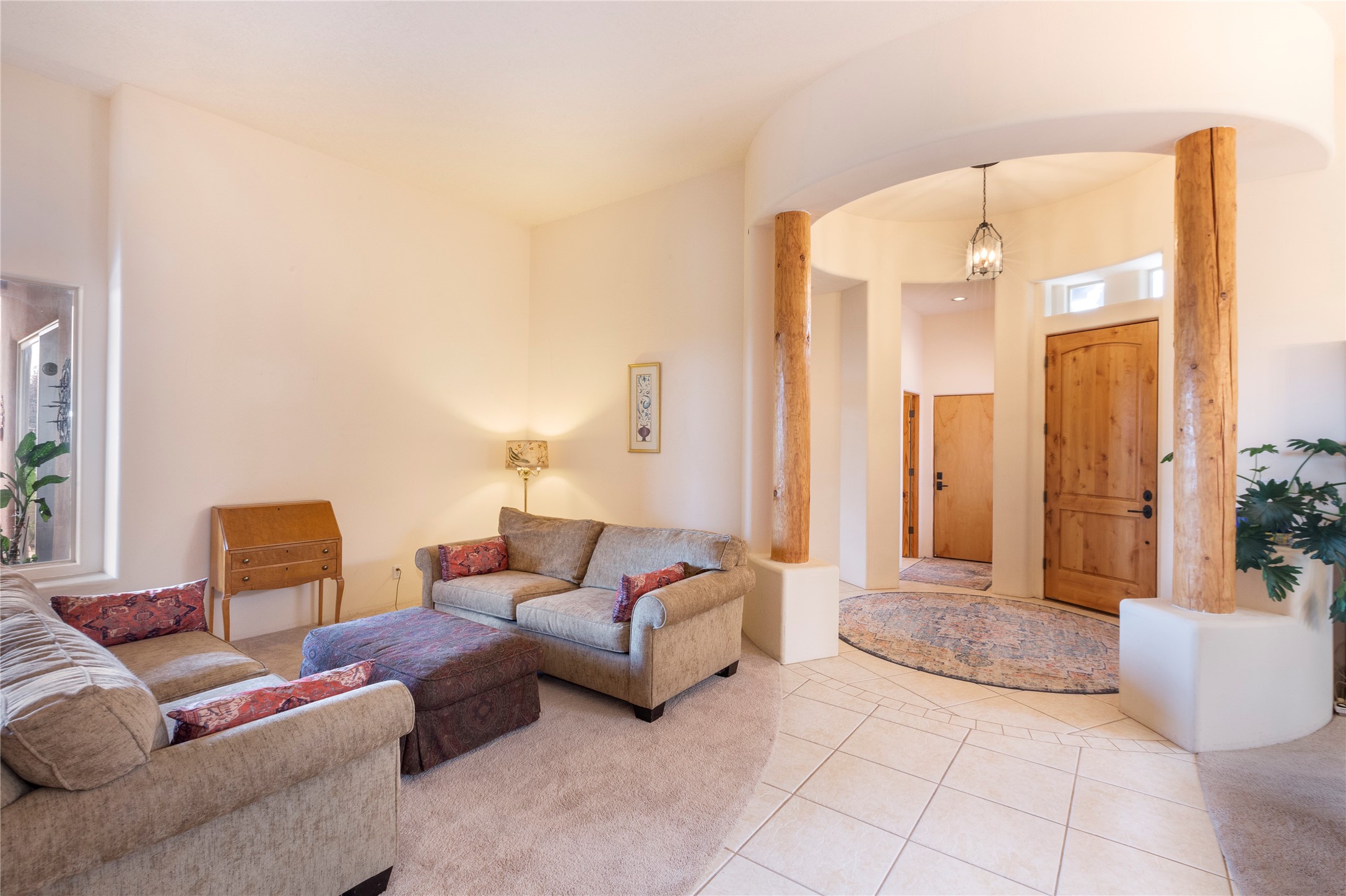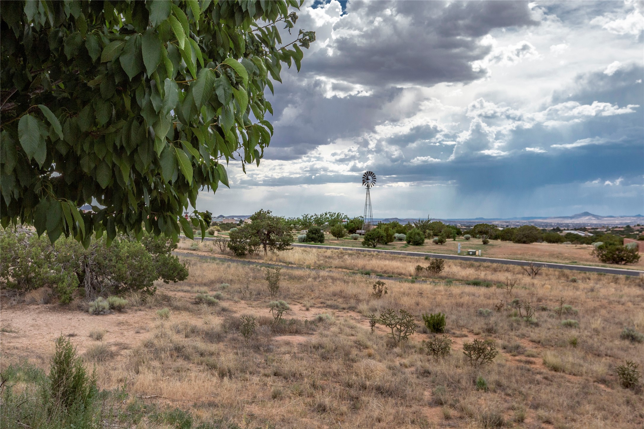 MOTIVATED SELLER! This beautifully appointed Rancho Viejo home has pueblo touches such as plaster, vigas and a kiva fireplace. The floorplan is excellent with the ensuite primary bedroom on one end and the guest rooms on the other end of the common areas of dining, living and kitchen. With 5 bedrooms, 2 bathrooms and a powder room and outdoor portal there is room for company. The open living concept has a breakfast bar and is part of the kitchen/living. The kitchen has been upgraded with granite countertops, 4 burner gas range, double hung ovens, and built in wine rack. Formal dining is bright with natural light. Unobstructed mountain and sunset views are enjoyed in the nicely landscaped back yard with nectarine, peach, apple and cherry trees, all with irrigation, water capture system and a fountain. There are 3 large raised garden beds with a drip system. This great property borders the common area greenbelt and is steps away from the neighborhood park. A two- car garage has direct access to this residence. 5 year roof warranty.